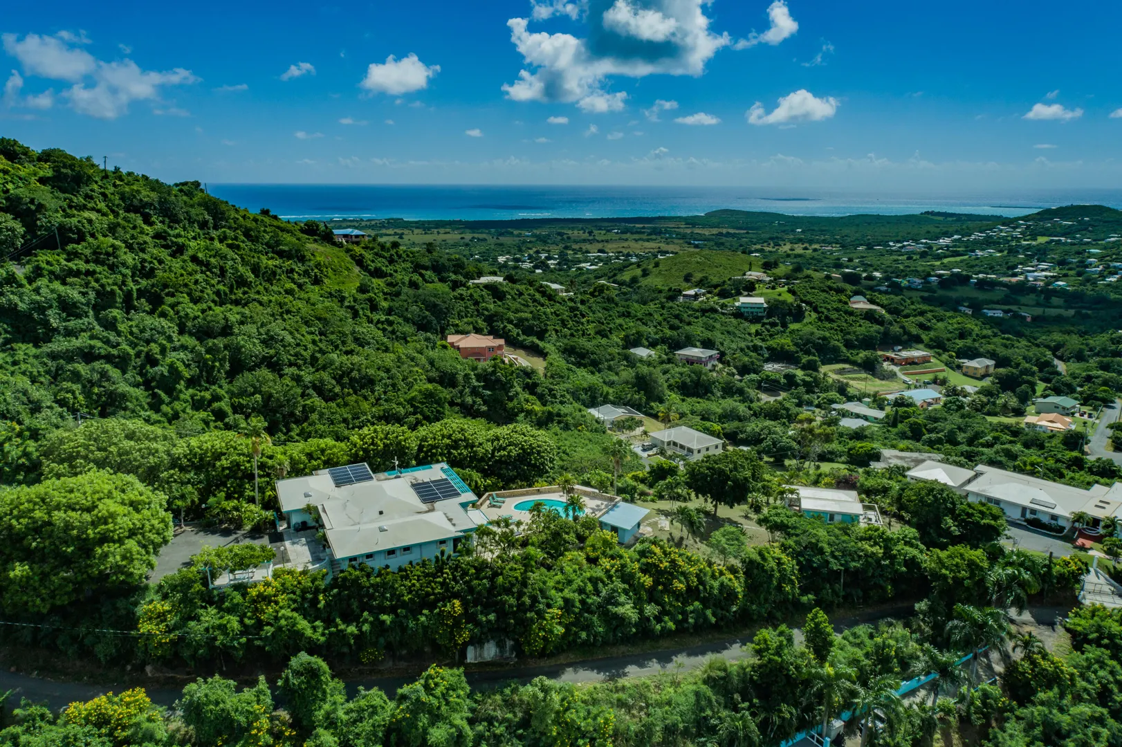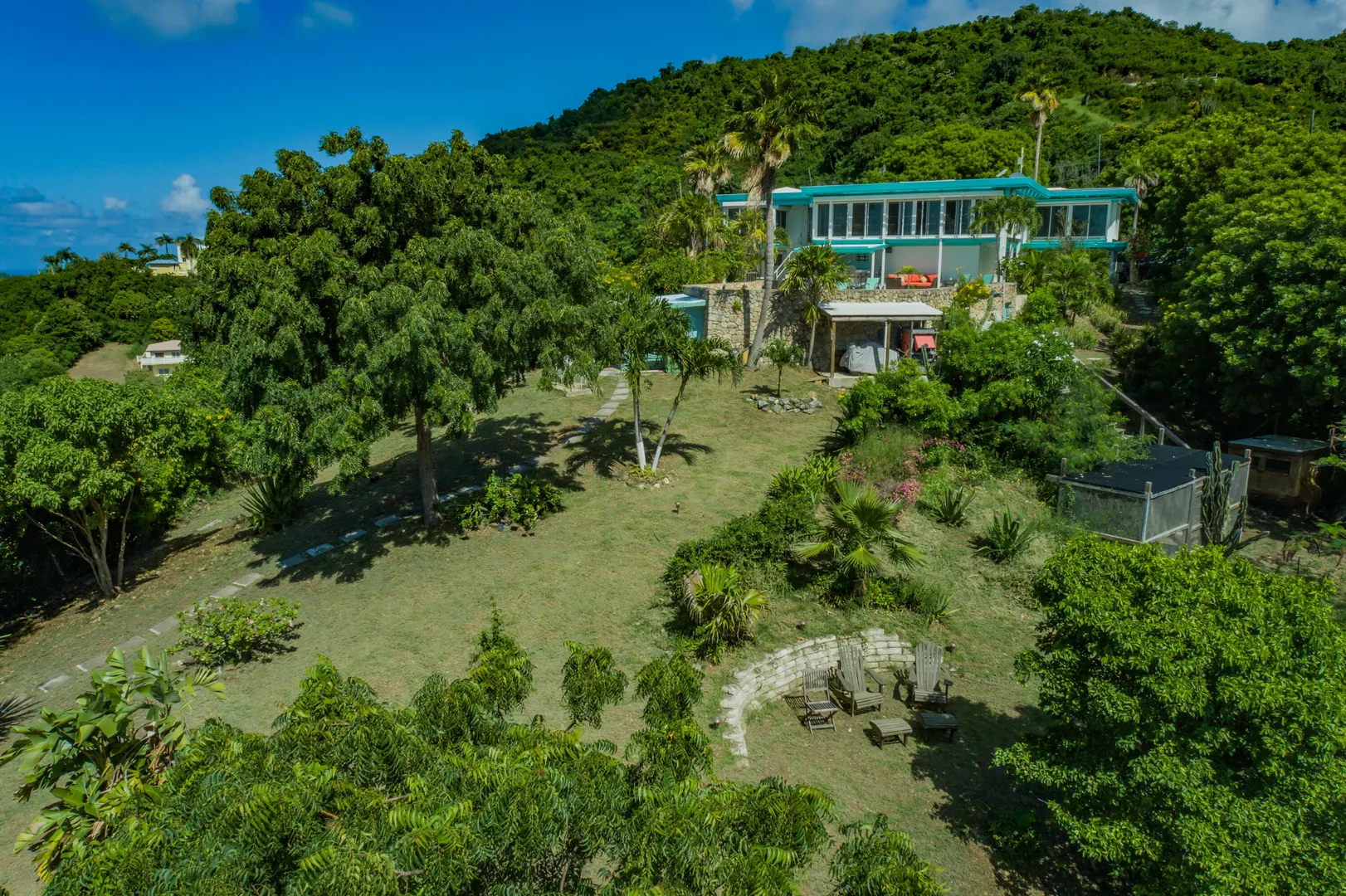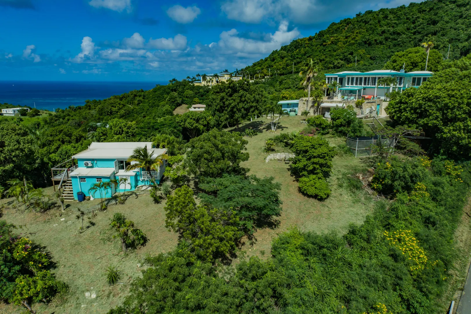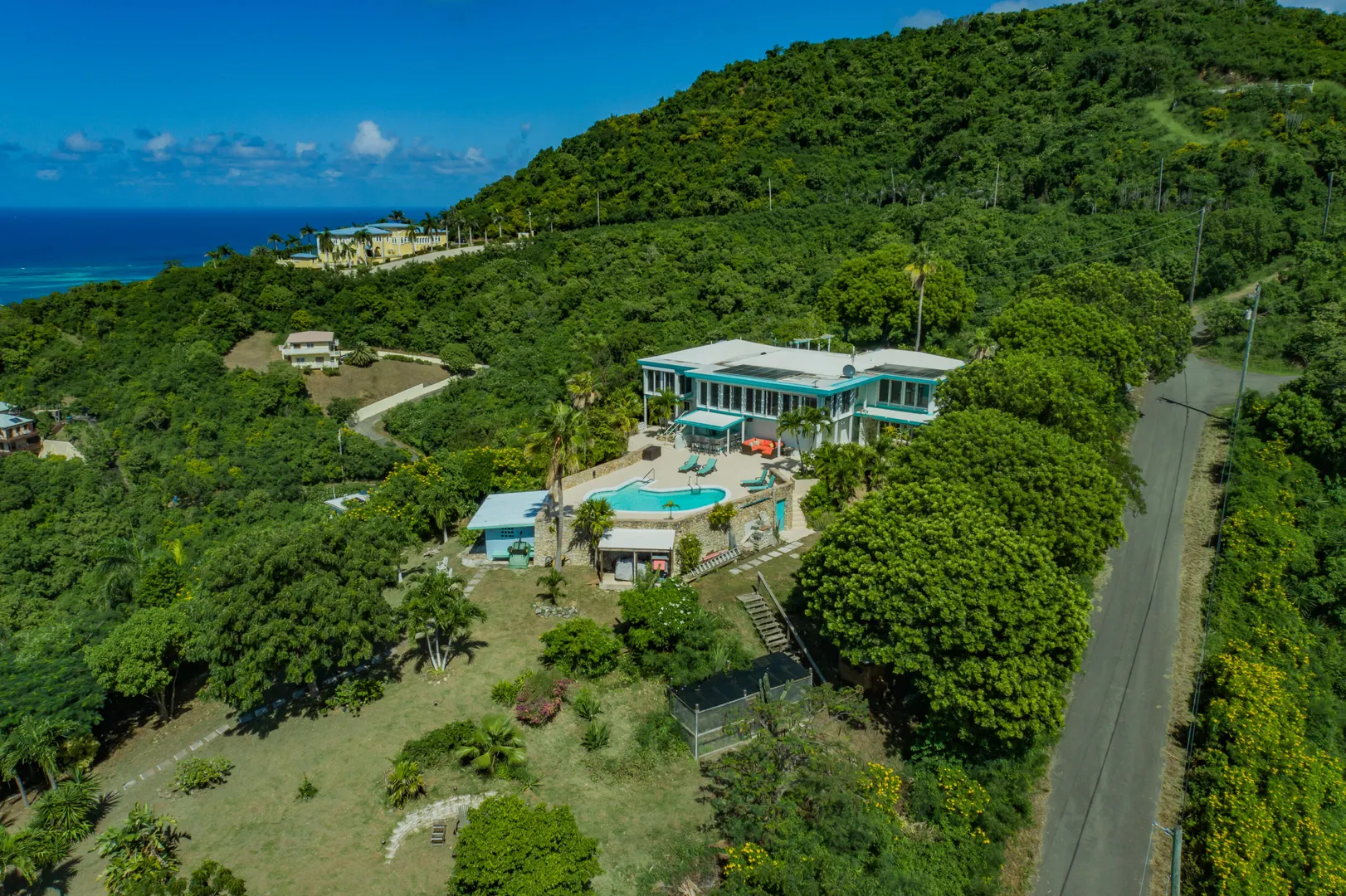 Escape to St. Croix and live in this magnificent 5200 square foot hilltop estate with 5-bedrooms & 6.5-baths. With dual shore views, a 2BR main house, 2 apartments, a caretaker's cottage, pool & solar panels w/ 2 Tesla batteries, it's a move-in-ready oasis! The main house features 2 primary bedrooms w/ sea views, open concept living spaces with abundant natural light, impact glass and automatic roll down shutters, expansive sundeck & poolside wet bar w/ 2 self-contained apartments located poolside, ideal for guests or rental income w/ separate parking & entrance! Also featured: aviary & greenhouse, 2 cisterns, 500 gallon propane tank, workshop, storage/tool room, outdoor shower and salt chlorinator for pool. Caretaker's cottage even has a private deck & laundry.