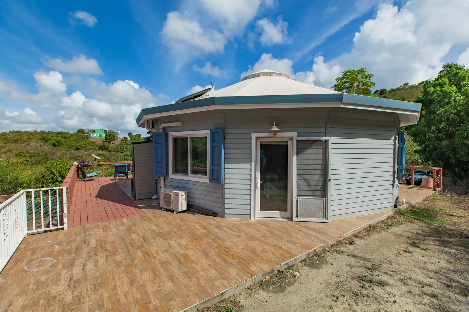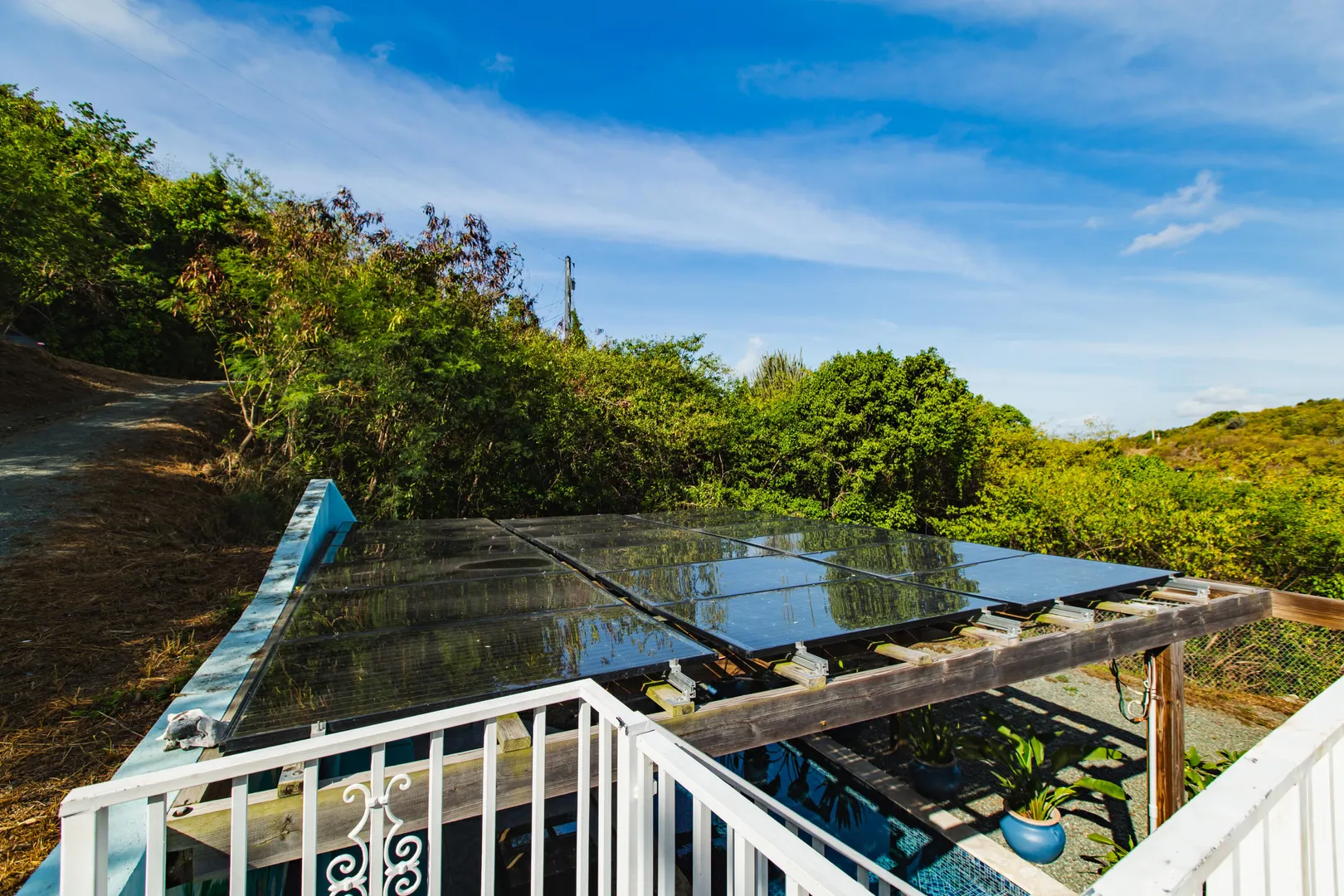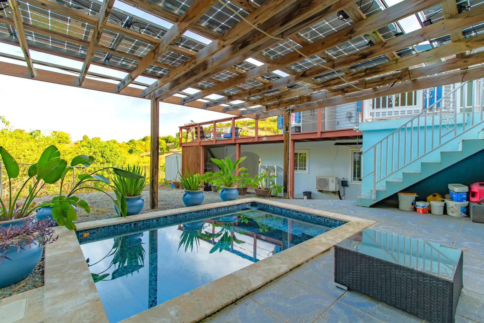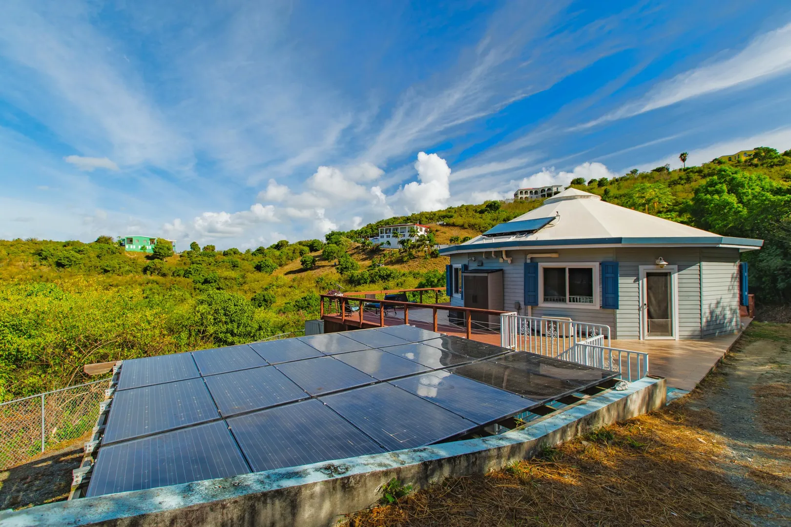 Where durability meets tranquility! 61 Grange Stock, a Caribbean custom-built ''Deltec home'' located on 0.93 acres along the south shore of St. Croix offers peaceful island living and sustainability. This private 2-bedroom 1.5 bath main home is equipped with a 5.4KW solar system and Tesla Powerwall. Don't stress over a WAPA power outage. The backup battery source is not only a relief but a wonderful convenience! The expansive deck is perfect for star gazing or enjoying the morning skies. The dipping pool can be found below the solar panels and pergola. Upon entering the home you will notice the high ceilings, an abundance of windows and lovely natural light. The kitchen offers plenty of cabinet space and a gas stove for cooking. Split AC's are also found in each bedroom.