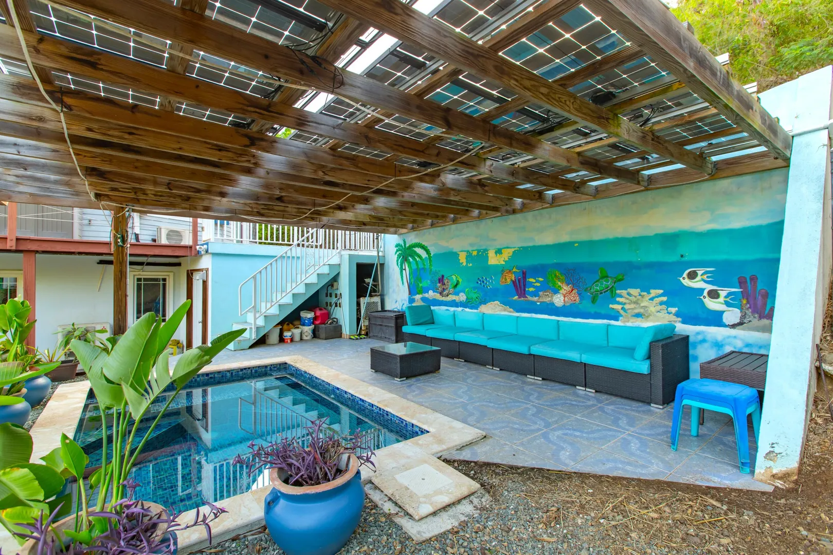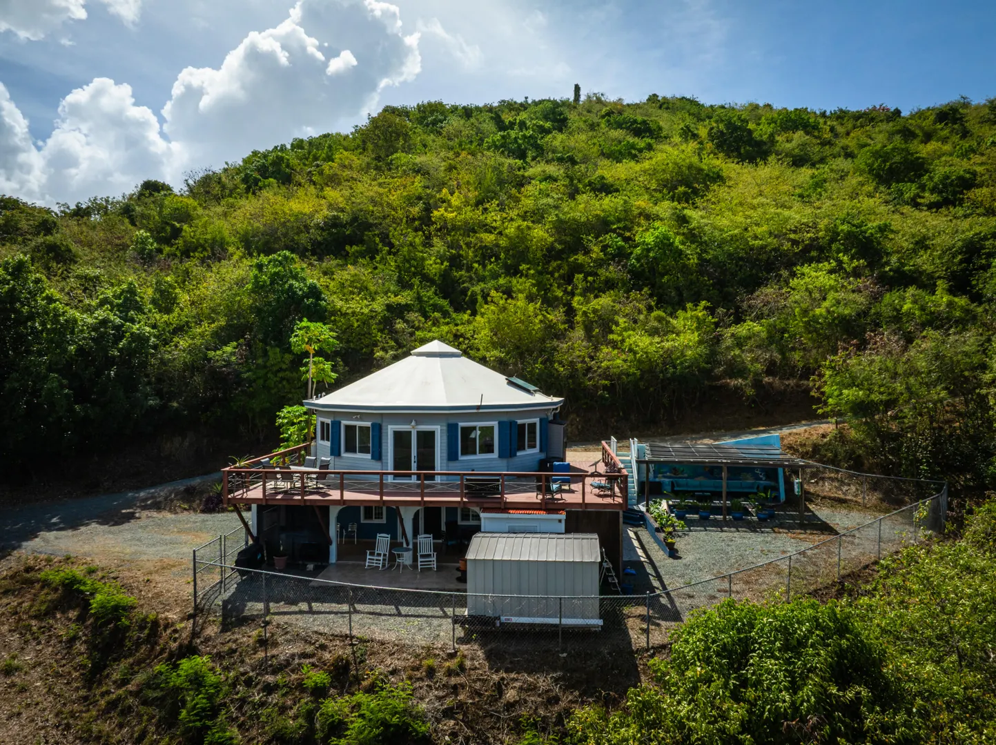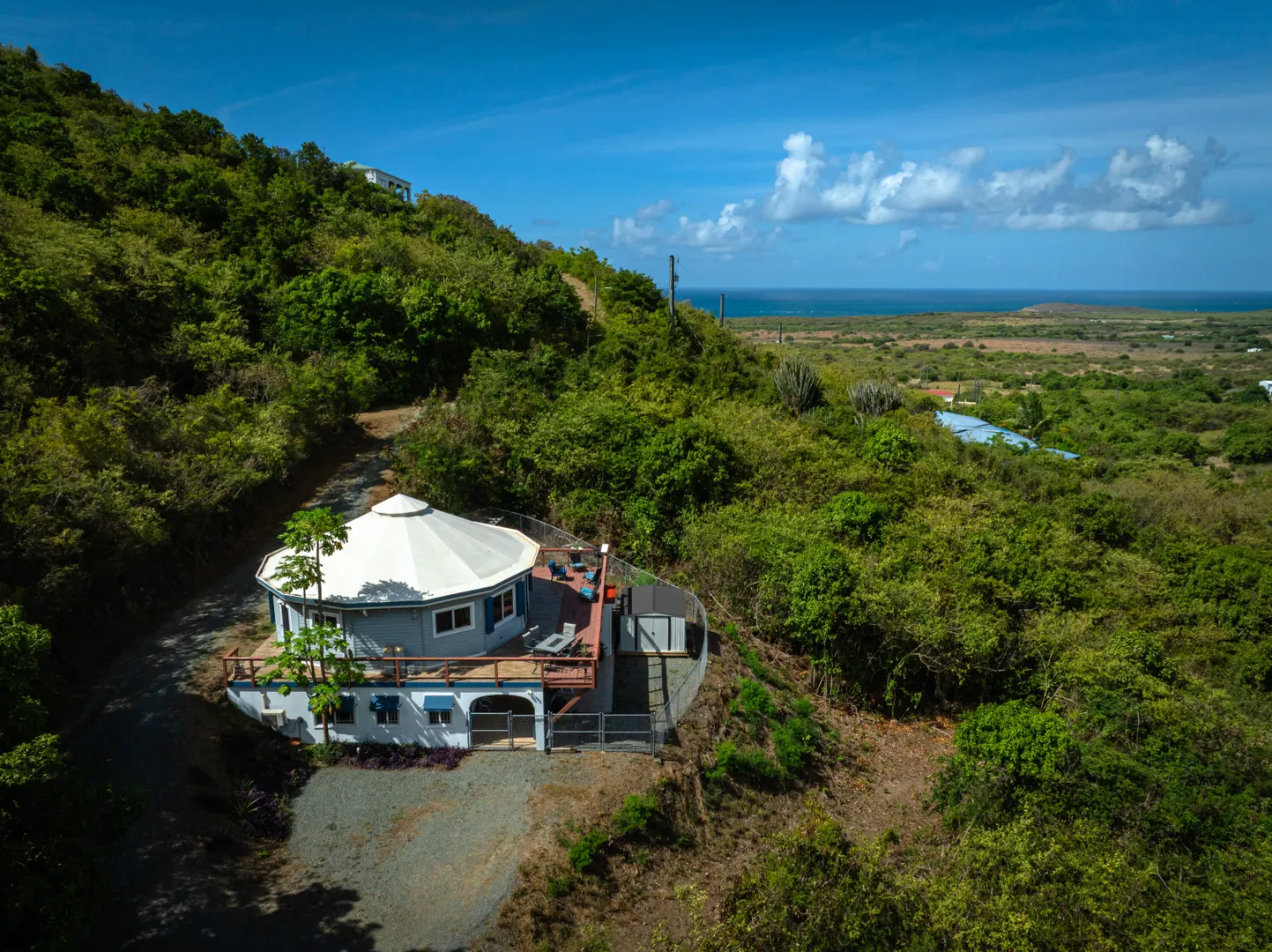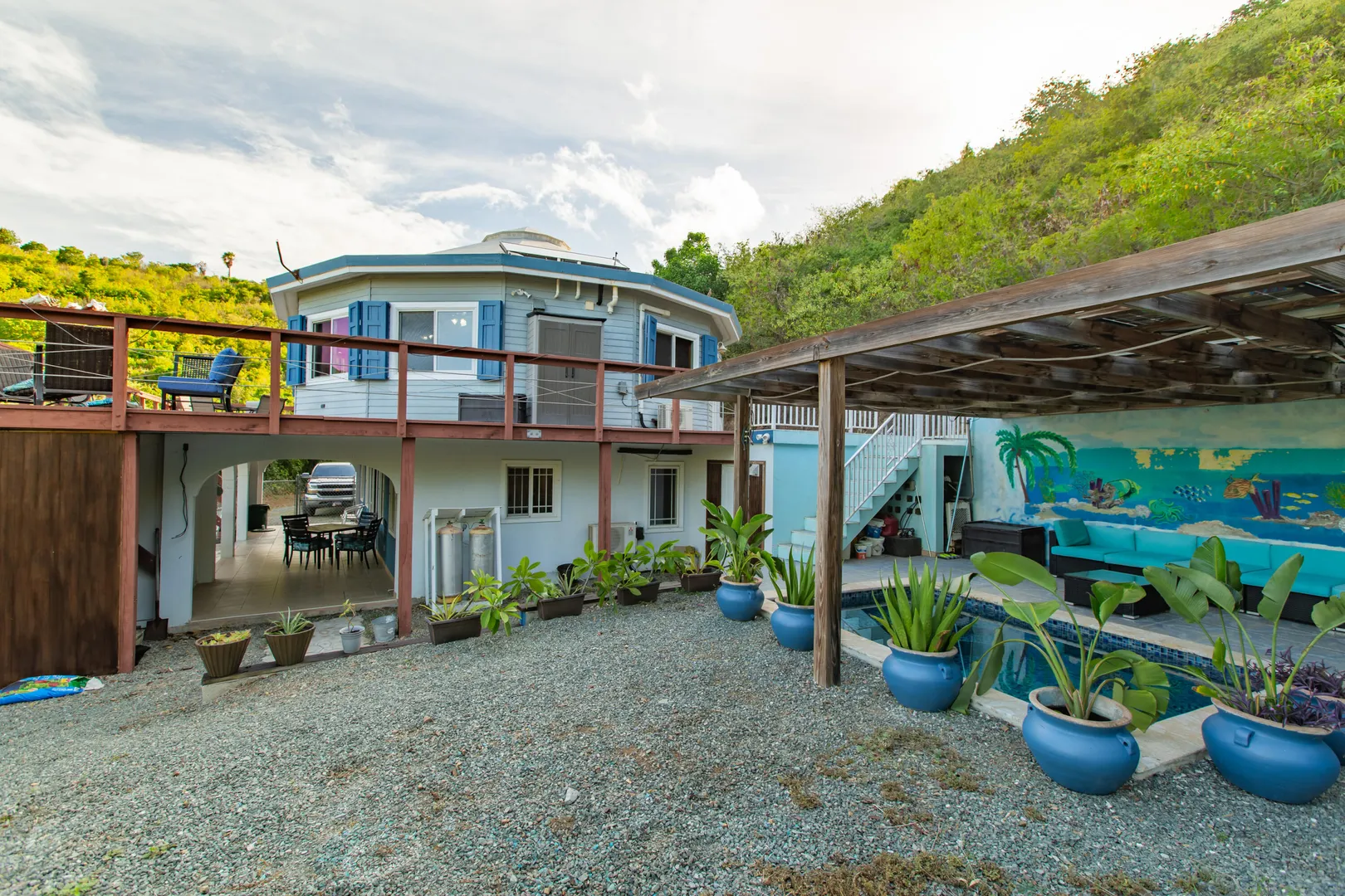 Where durability meets tranquility! 61 Grange Stock, a Caribbean custom-built ''Deltec home'' located on 0.93 acres along the south shore of St. Croix offers peaceful island living and sustainability. This private 2-bedroom 1.5 bath main home is equipped with a 5.4KW solar system and Tesla Powerwall. Don't stress over a WAPA power outage. The backup battery source is not only a relief but a wonderful convenience! The expansive deck is perfect for star gazing or enjoying the morning skies. The dipping pool can be found below the solar panels and pergola. Upon entering the home you will notice the high ceilings, an abundance of windows and lovely natural light. The kitchen offers plenty of cabinet space and a gas stove for cooking. Split AC's are also found in each bedroom.