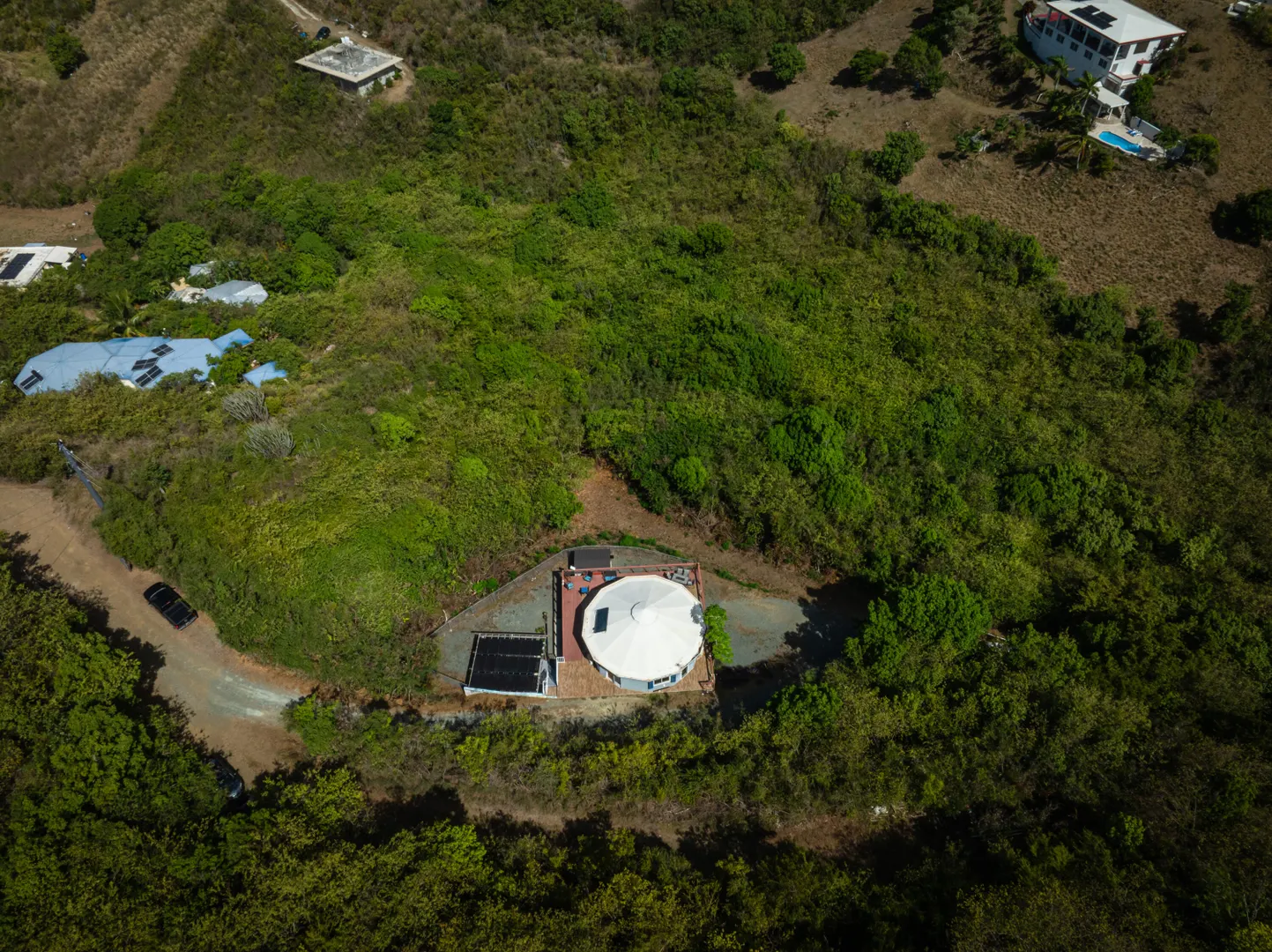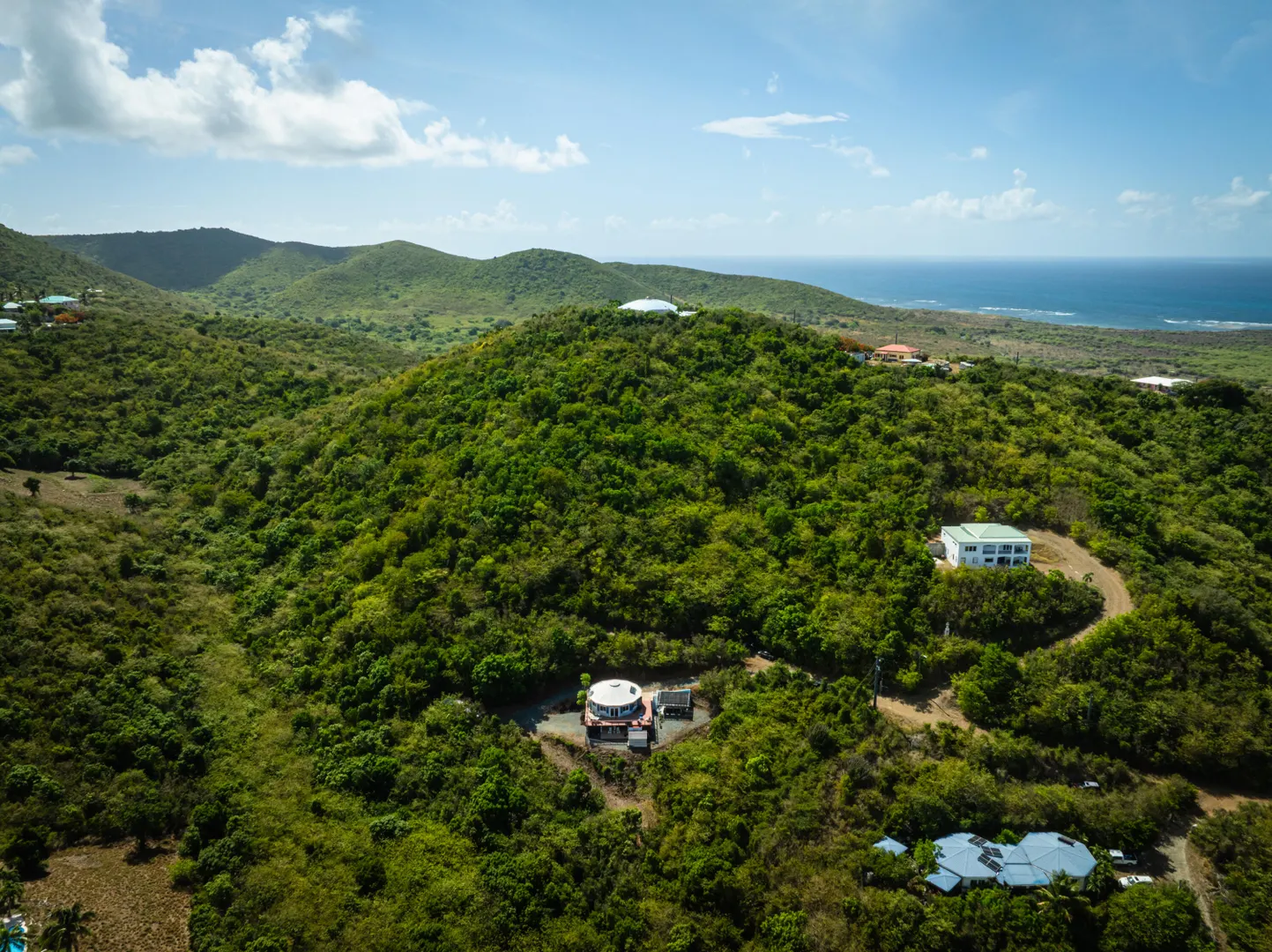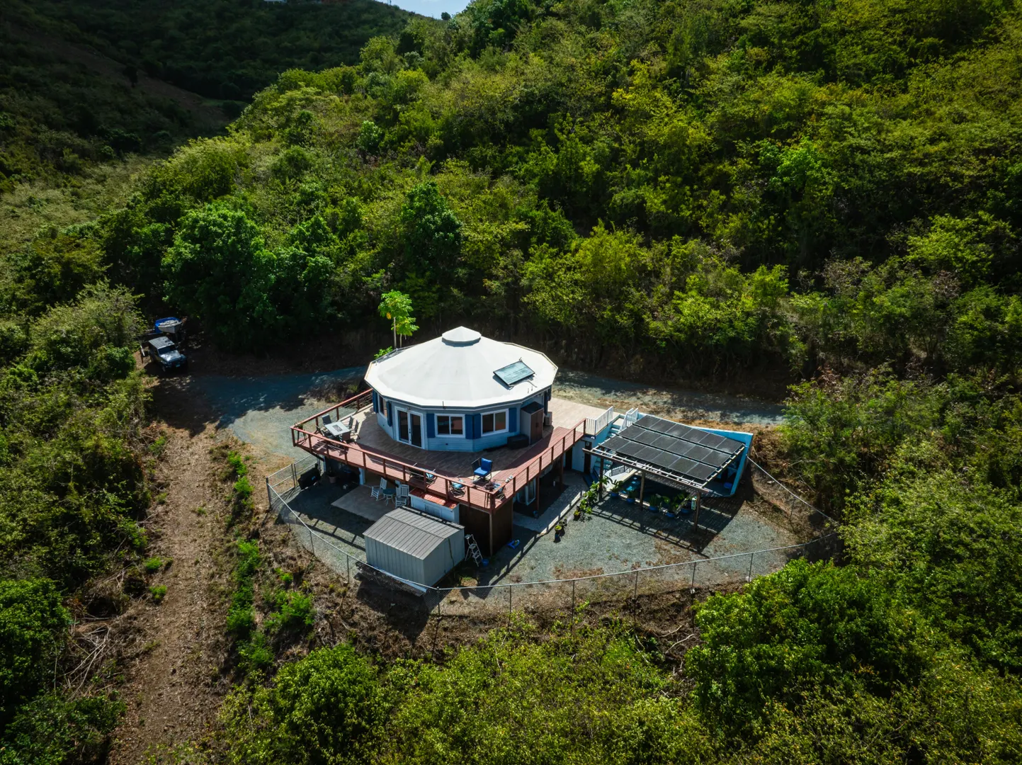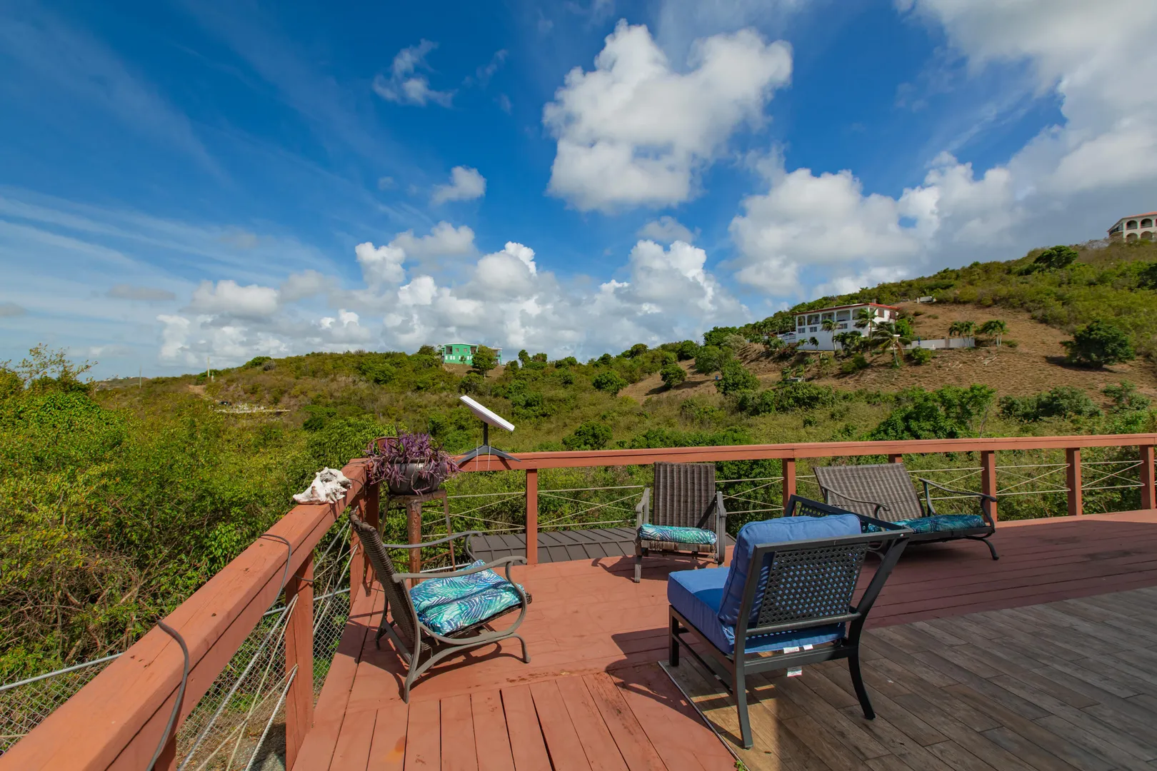 Where durability meets tranquility! 61 Grange Stock, a Caribbean custom-built ''Deltec home'' located on 0.93 acres along the south shore of St. Croix offers peaceful island living and sustainability. This private 2-bedroom 1.5 bath main home is equipped with a 5.4KW solar system and Tesla Powerwall. Don't stress over a WAPA power outage. The backup battery source is not only a relief but a wonderful convenience! The expansive deck is perfect for star gazing or enjoying the morning skies. The dipping pool can be found below the solar panels and pergola. Upon entering the home you will notice the high ceilings, an abundance of windows and lovely natural light. The kitchen offers plenty of cabinet space and a gas stove for cooking. Split AC's are also found in each bedroom.