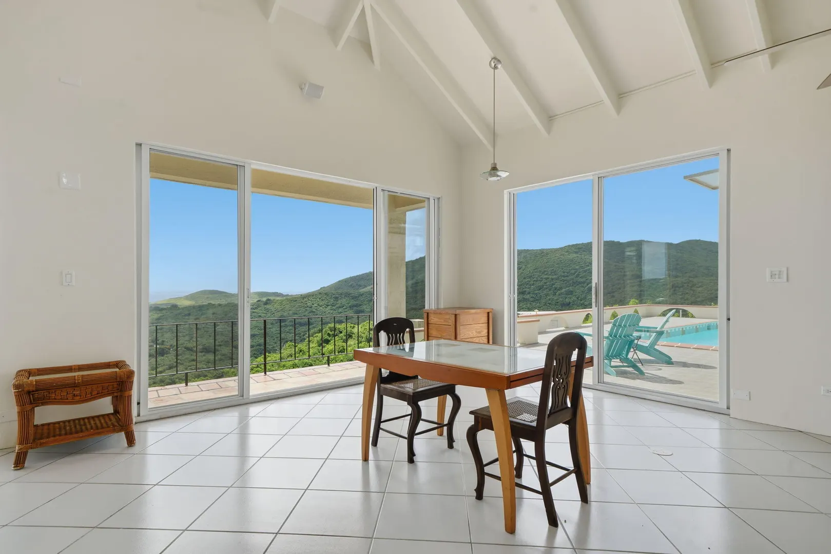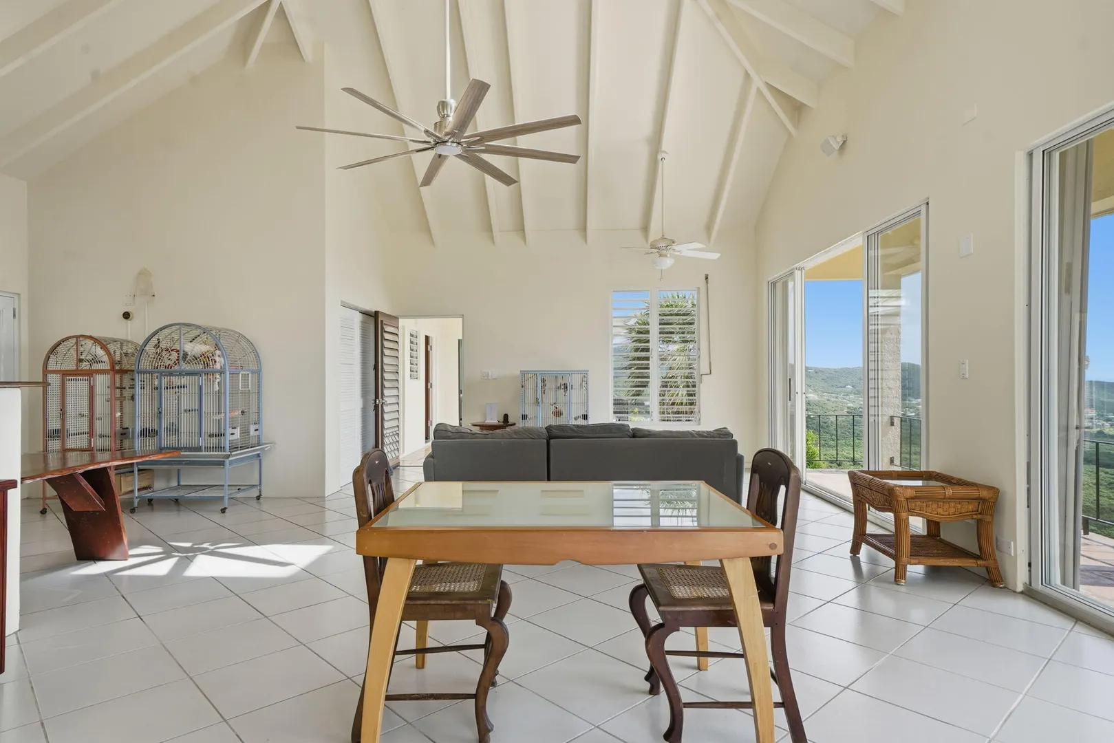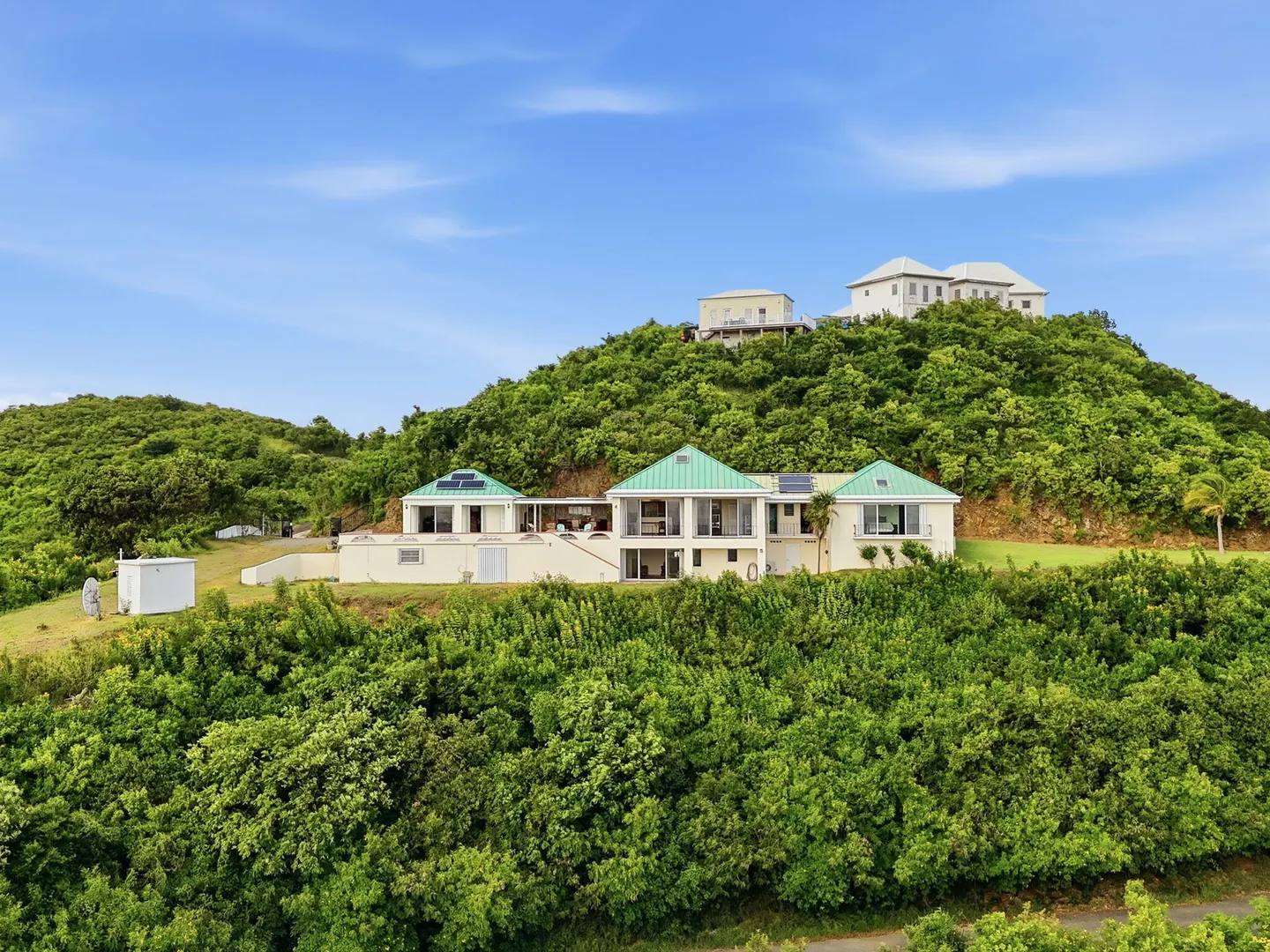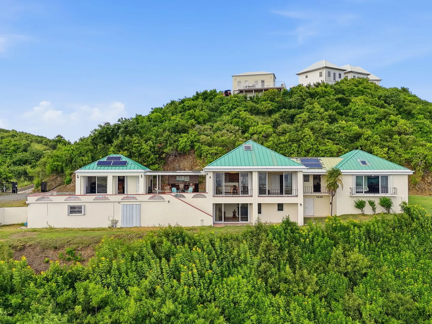 Sustainable, expansive views, and serene--this beautifully designed pod-style home offers the best of island living. Equipped with SOLAR power and net metering, a backup generator, solar hot water, UV water filtration, and storm shutters. Inside, you'll find a thoughtfully laid-out floor plan that combines function and the best of Caribbean living. The kitchen features granite countertops and plenty of workspace, situated parallel to the living and dining areas which are framed by large sliding glass doors that take full advantage of the 180 degree view. Just steps away, the inviting pool and patio create the perfect setting for entertaining, lounging, or enjoying the island breeze with panoramic south shore views. The main home includes a dedicated office area, ideal for working remotelyor managing day-to-day tasks, and a separate downstairs apartment that provides excellent options for guest accommodations, rental income, or an in-law suite with its full kitchen and AC. Comfort and efficiency is at the forefront with split A/C units in the bedrooms, a spacious utility room, and multiple storage areas throughout.