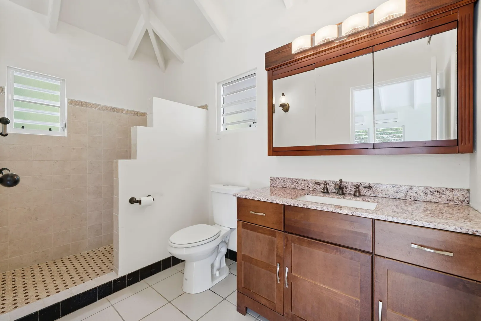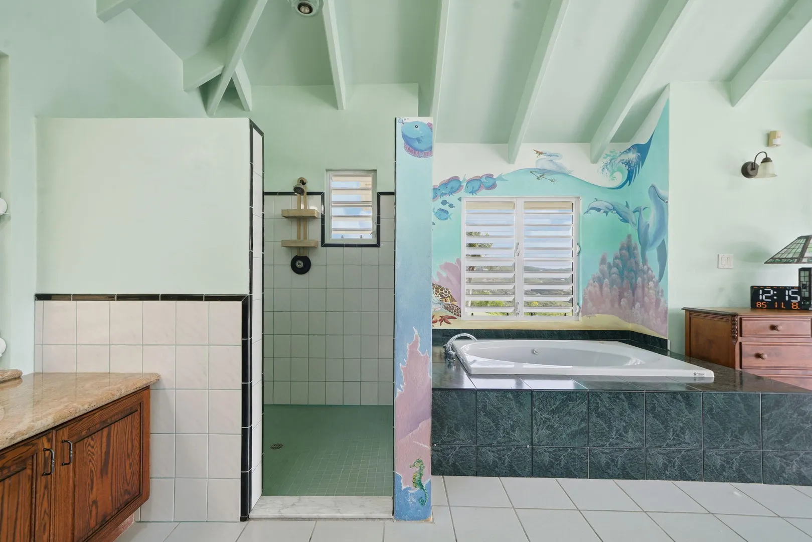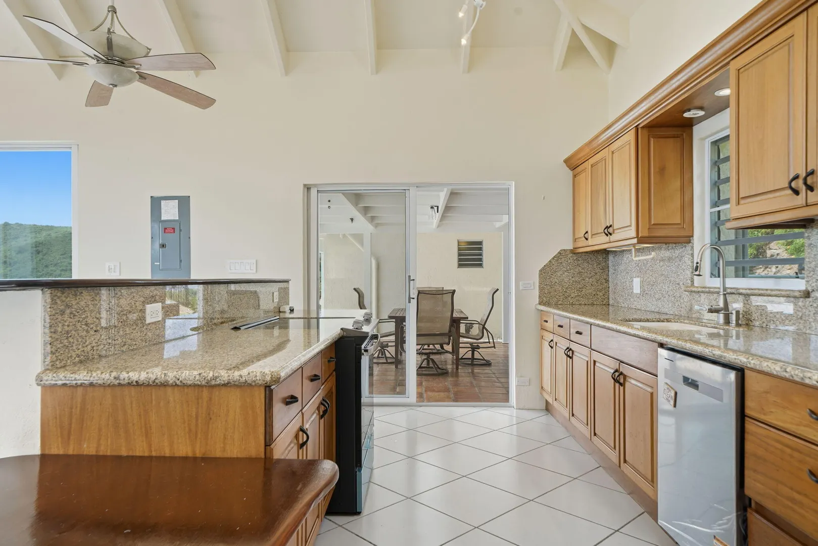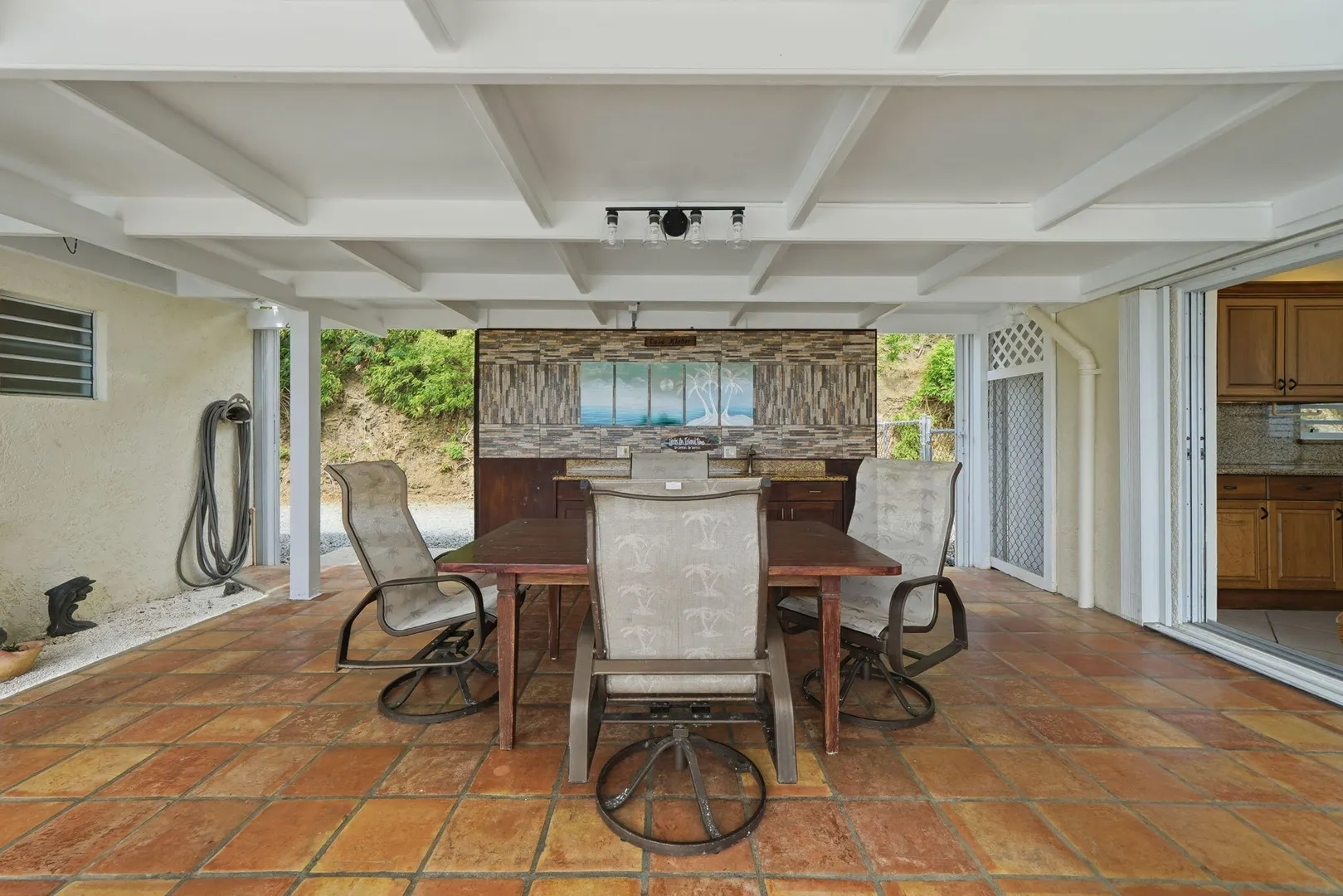Sustainable, expansive views, and serene--this beautifully designed pod-style home offers the best of island living. Equipped with SOLAR power and net metering, a backup generator, solar hot water, UV water filtration, and storm shutters. Inside, you'll find a thoughtfully laid-out floor plan that combines function and the best of Caribbean living. The kitchen features granite countertops and plenty of workspace, situated parallel to the living and dining areas which are framed by large sliding glass doors that take full advantage of the 180 degree view. Just steps away, the inviting pool and patio create the perfect setting for entertaining, lounging, or enjoying the island breeze with panoramic south shore views. The main home includes a dedicated office area, ideal for working remotelyor managing day-to-day tasks, and a separate downstairs apartment that provides excellent options for guest accommodations, rental income, or an in-law suite with its full kitchen and AC. Comfort and efficiency is at the forefront with split A/C units in the bedrooms, a spacious utility room, and multiple storage areas throughout.