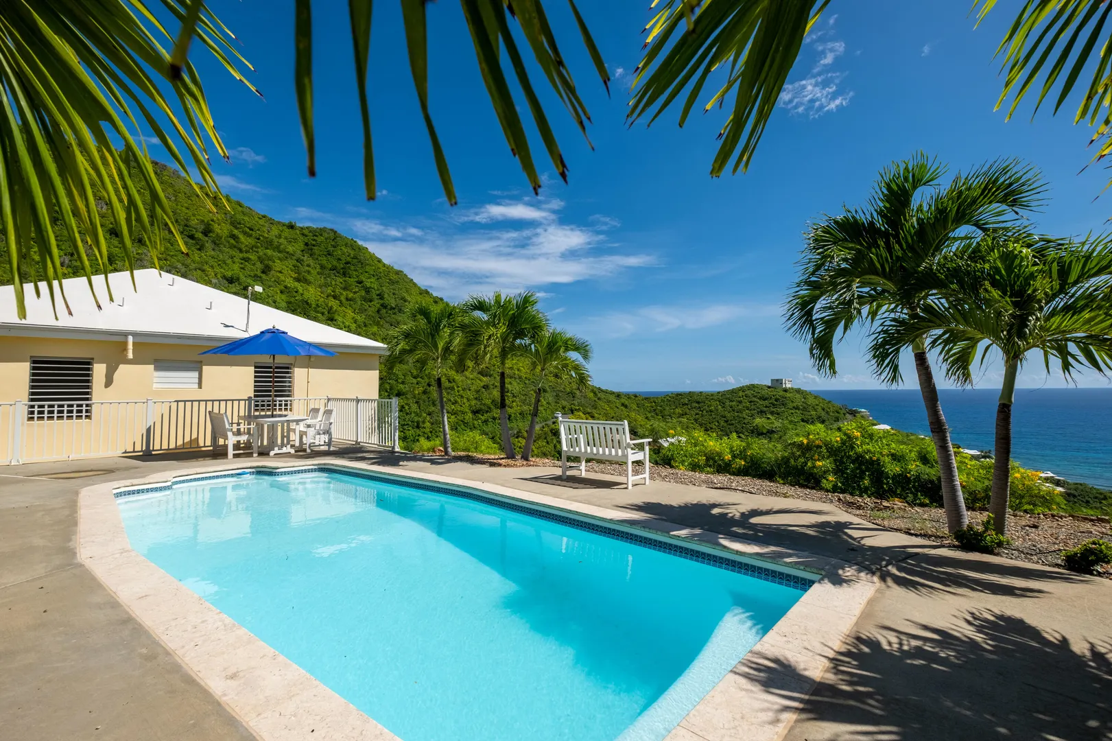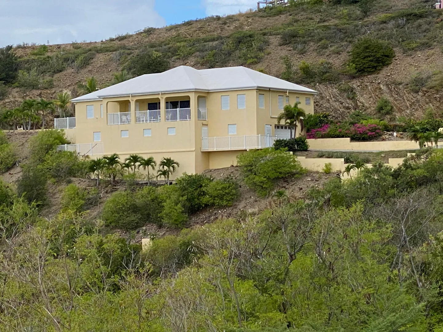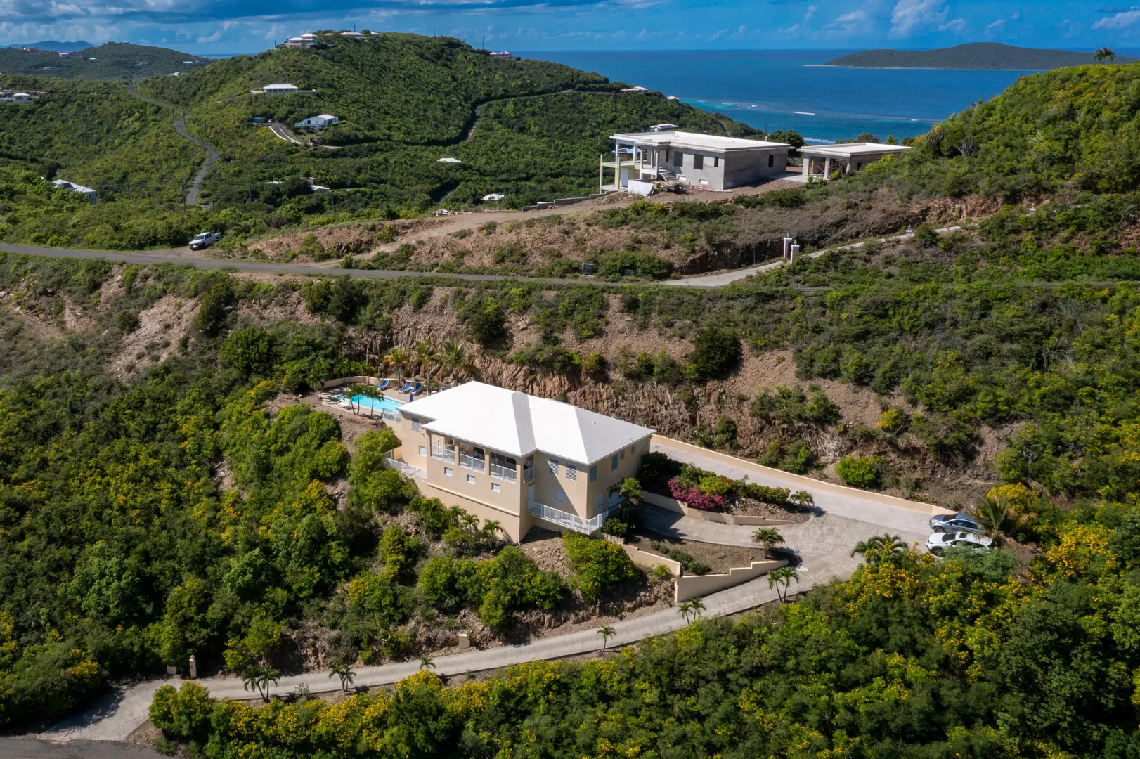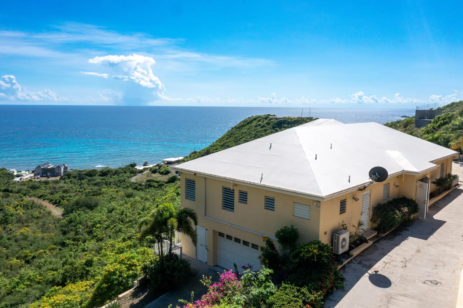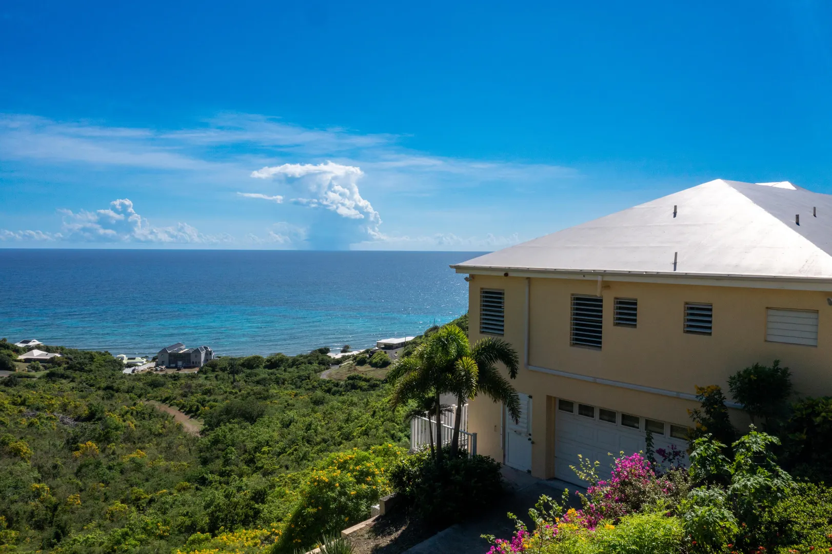 101 South Grapetree is a breezy home boasting 3 bedrooms, 2.5 baths, and pool with outstanding Caribbean Sea views. It is perfectly positioned facing east over Grapetree bay and out to St Croix's eastern most point. A solidly built home with an open-concept main room and kitchen, all rooms have high cathedral ceilings. The main room opens out onto the wonderful 9.5 X 28-foot gallery, for enhanced island living! You will also love the private pool and ample patio area for relaxing and entertaining. The garage is a convenient luxury with its big workroom and storage space. Situated on almost 1 acre of land, this solid home features a paved driveway on a quiet dead-end street that leads to Jack's and Issac's Bay. The serenity is unmatched, yet it is convenient to beaches, and restaurants.