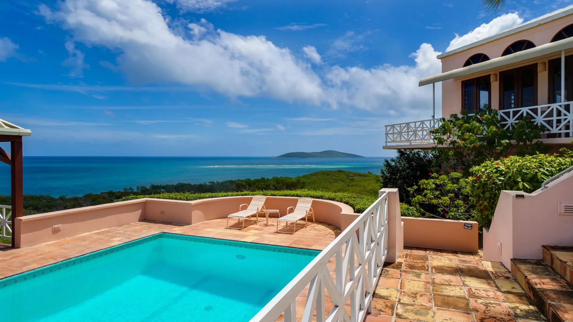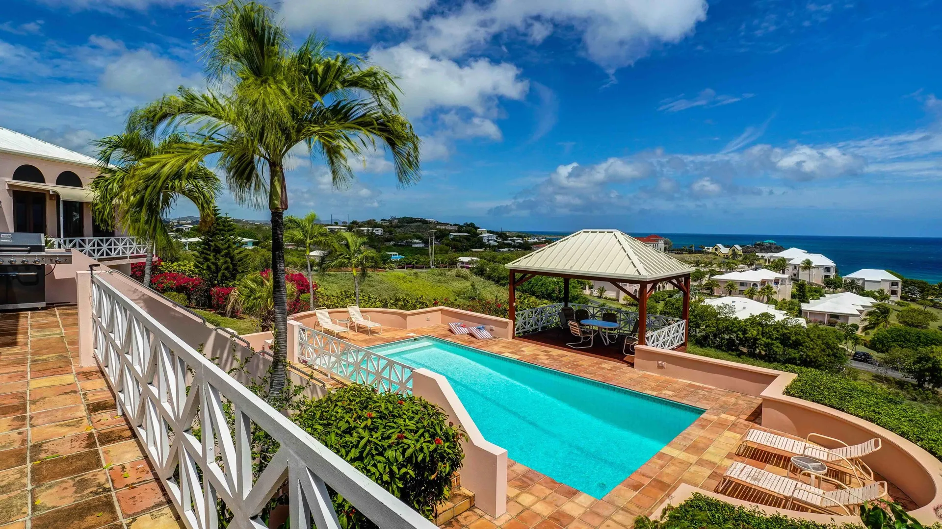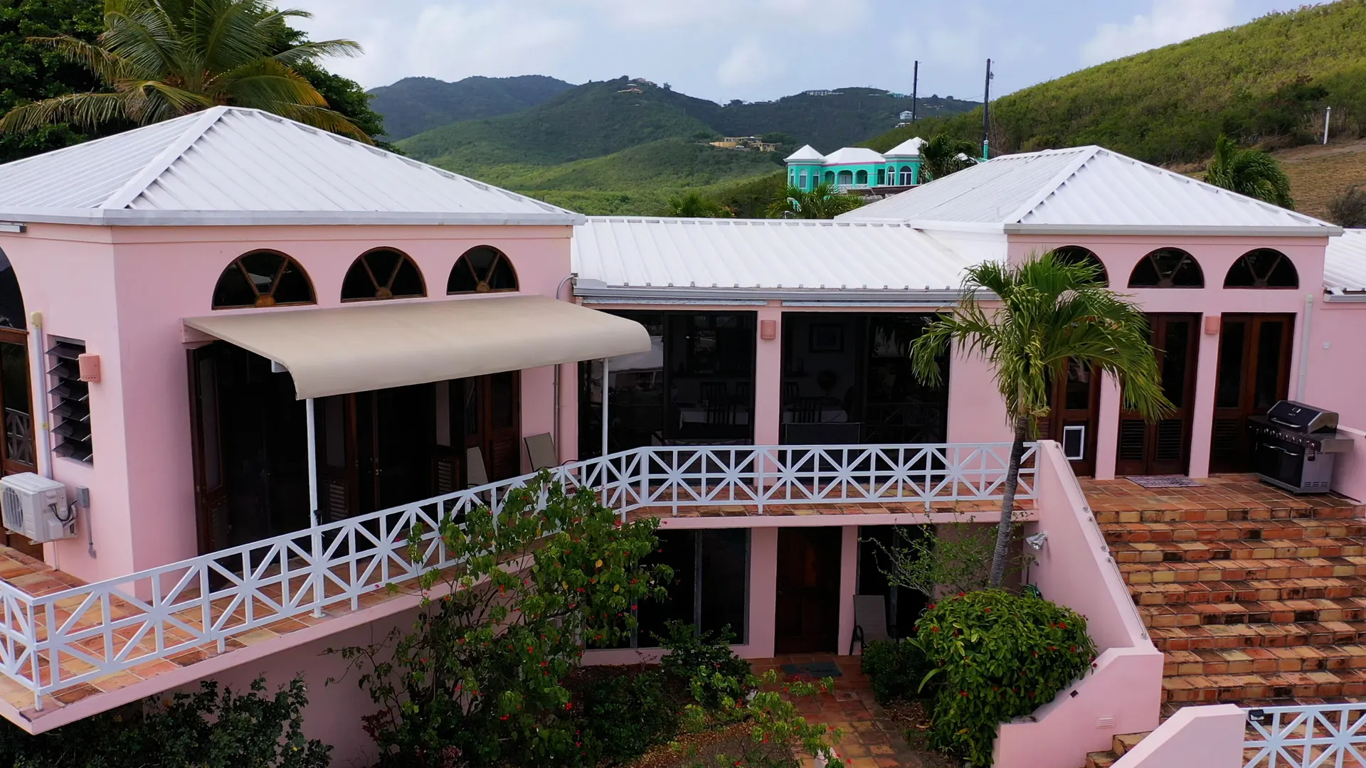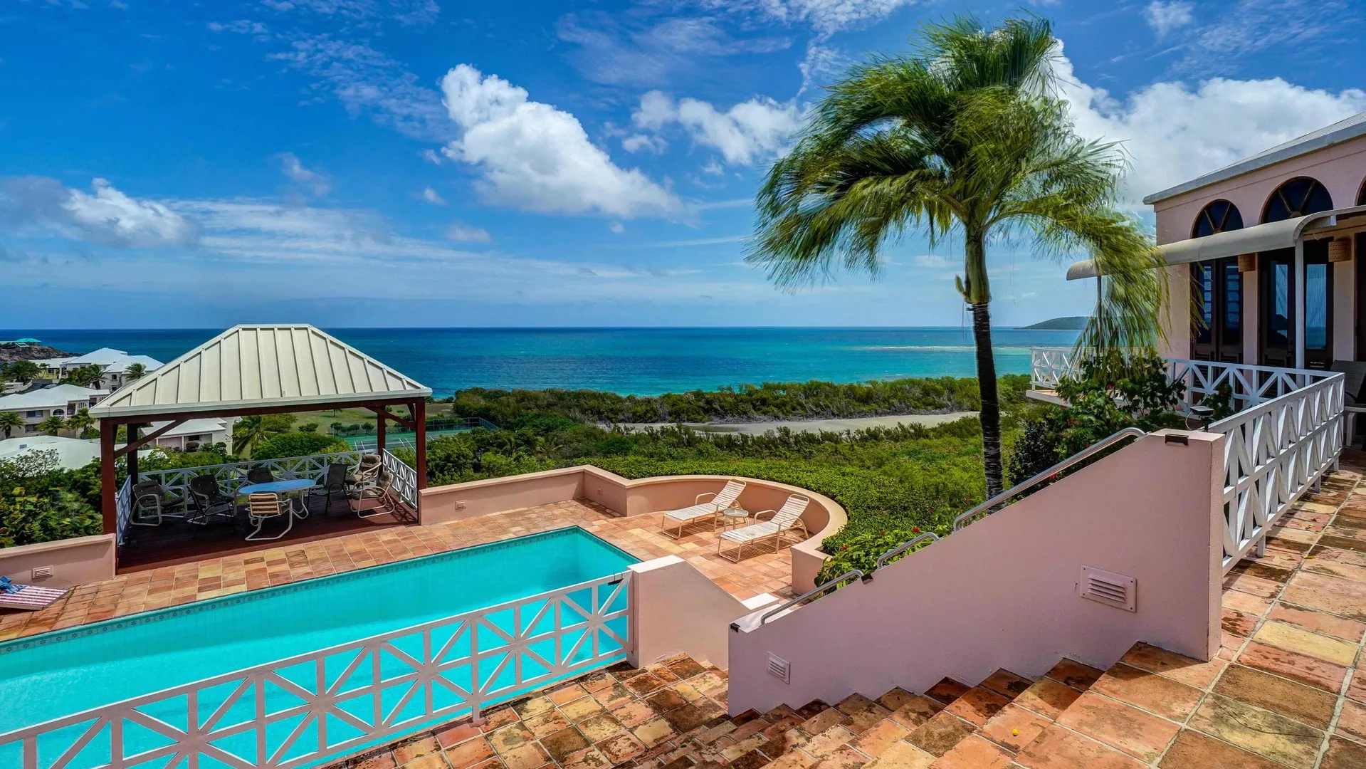 This magnificent home overlooking the Caribbean features cypress wood ceilings and 40 beautiful mahogany doors, and is perfect for entertaining! Four bedrooms (one currently used as an office) on the main level, and two en-suite bedrooms on the lower, pool level. Current owner rents each of lower bedrooms for $100 -$120/ night with eighty 5 star reviews and very few unoccupied nights. The kitchen has recently been remodeled, and solar and all new ACs have been added. The large pool with inviting adjacent shaded cabana has also been redone and converted to saline. It's a classic beauty ready for you to make it your own!