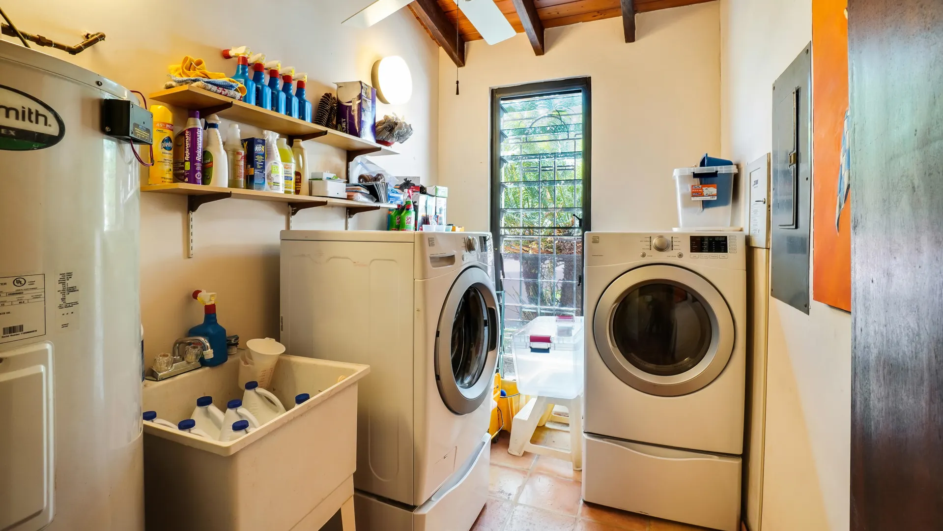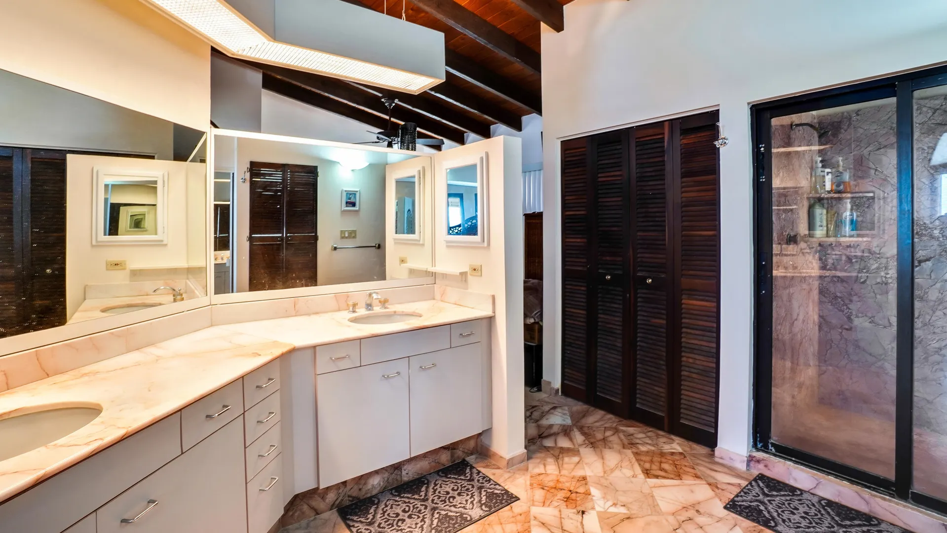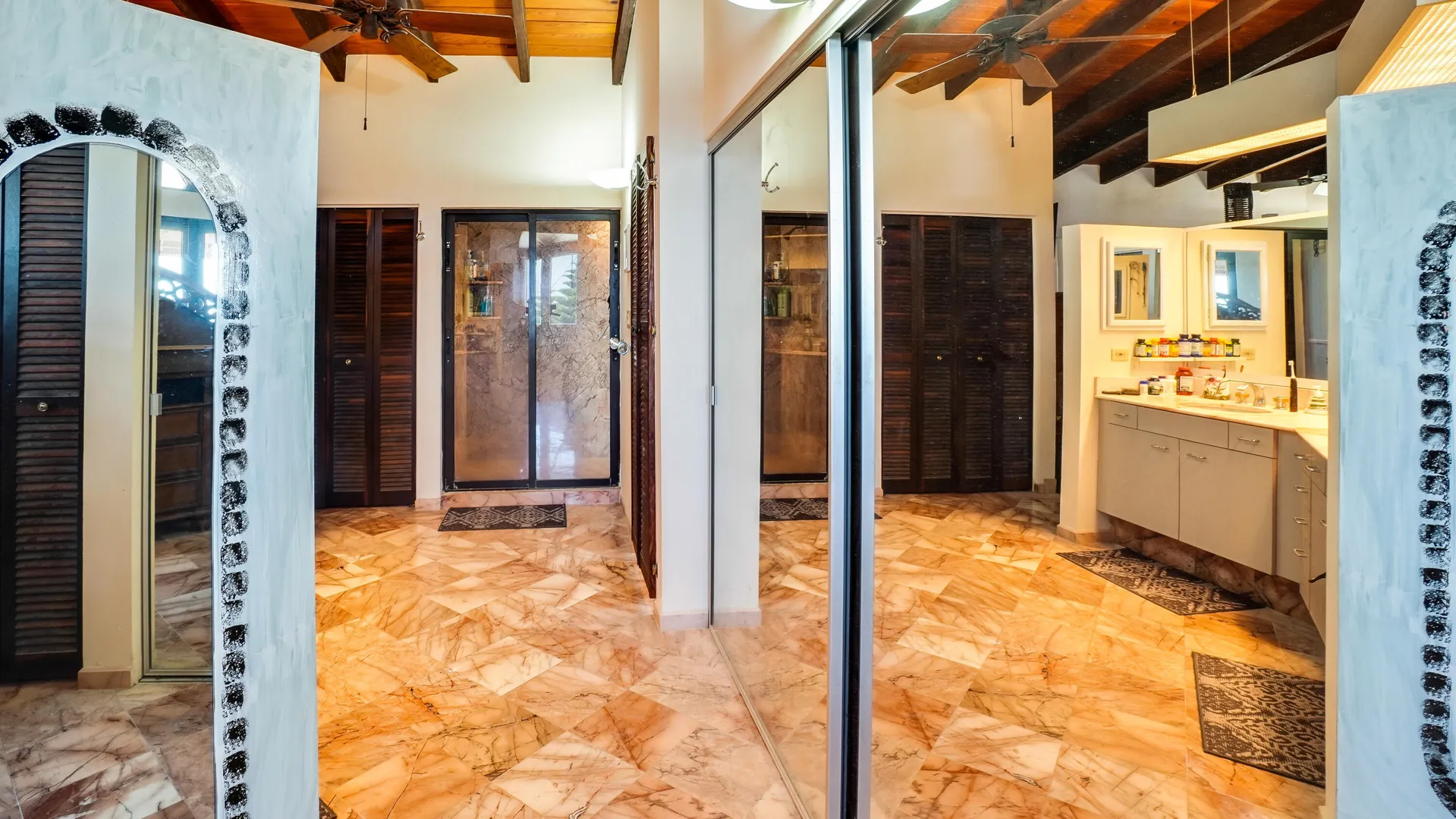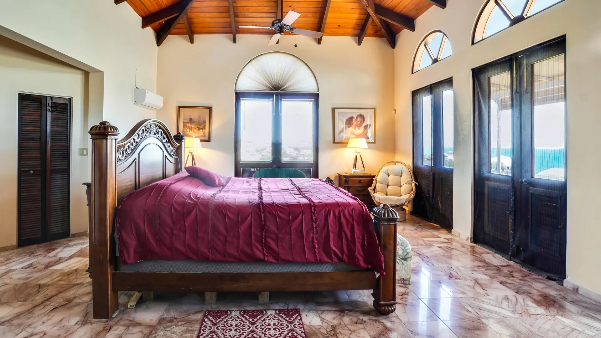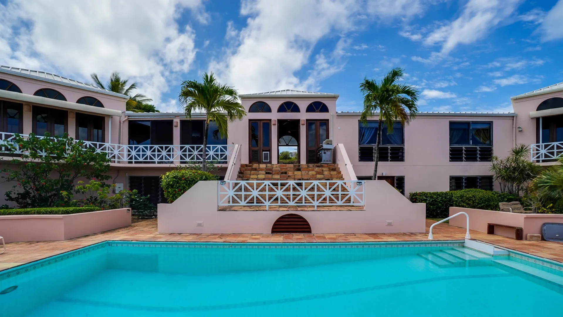 This magnificent home overlooking the Caribbean features cypress wood ceilings and 40 beautiful mahogany doors, and is perfect for entertaining! Four bedrooms (one currently used as an office) on the main level, and two en-suite bedrooms on the lower, pool level. Current owner rents each of lower bedrooms for $100 -$120/ night with eighty 5 star reviews and very few unoccupied nights. The kitchen has recently been remodeled, and solar and all new ACs have been added. The large pool with inviting adjacent shaded cabana has also been redone and converted to saline. It's a classic beauty ready for you to make it your own!