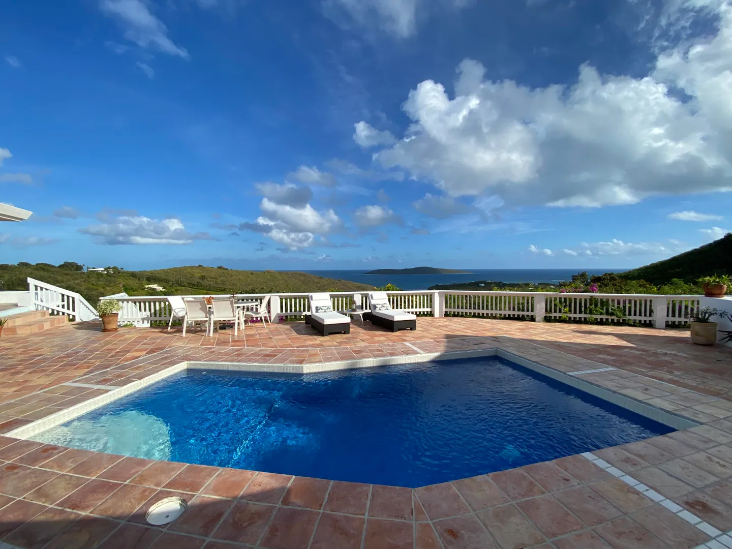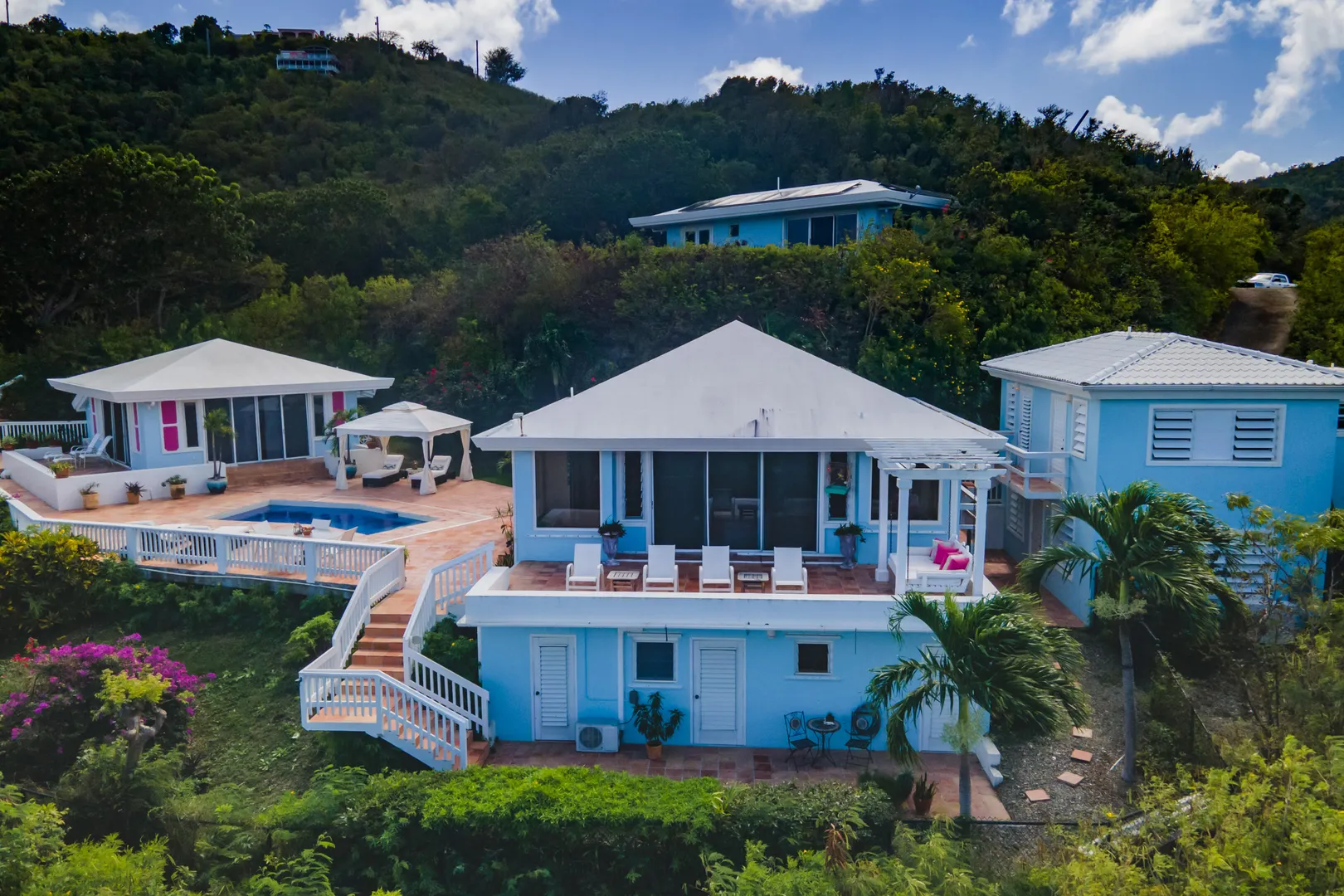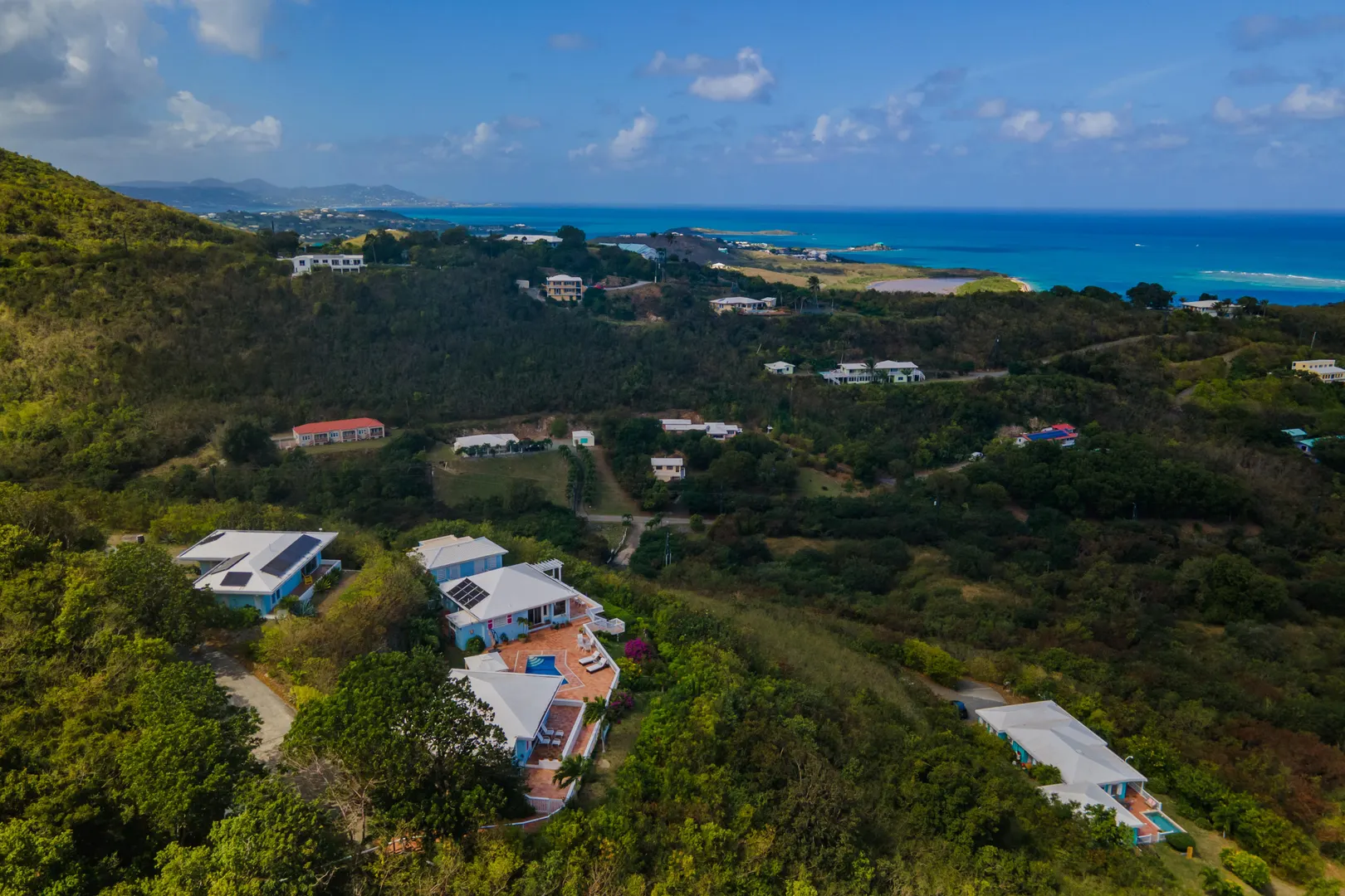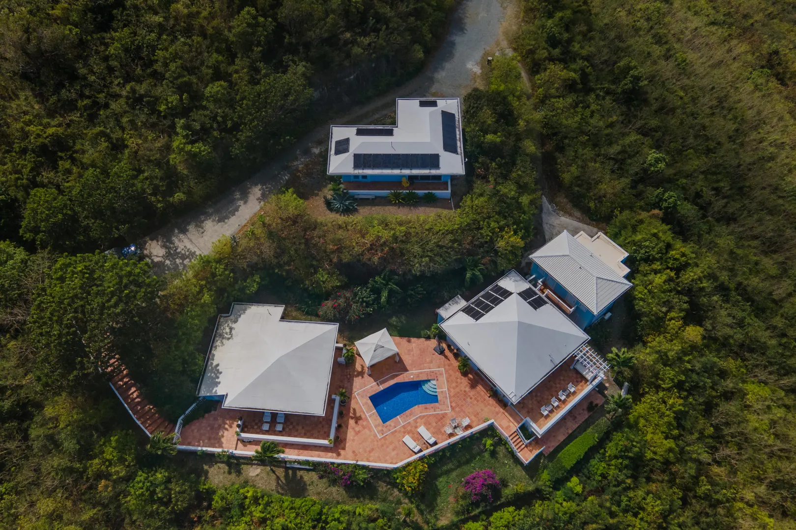Perfect for large family or vacation rental! 4 acre hillside estate comprising a total of 7-bedrooms & 7-baths! ''Serenity at Solitude'' is a West Indian style home which features three detached buildings & a spacious pool patio w/ sweeping views of Buck Island and beyond! Main BR in one building w/ en suite bath & bonus office or nursery w/full bath. Kitchen & LR across the pool patio from MBR, guest BR & laundry below. Two more guest suites & baths plus a den for your guests or kids classroom/playroom! Solar panels & net metering, automatic gate, plus a separate 2BR, 1BA guesthouse - this East End home has it all!