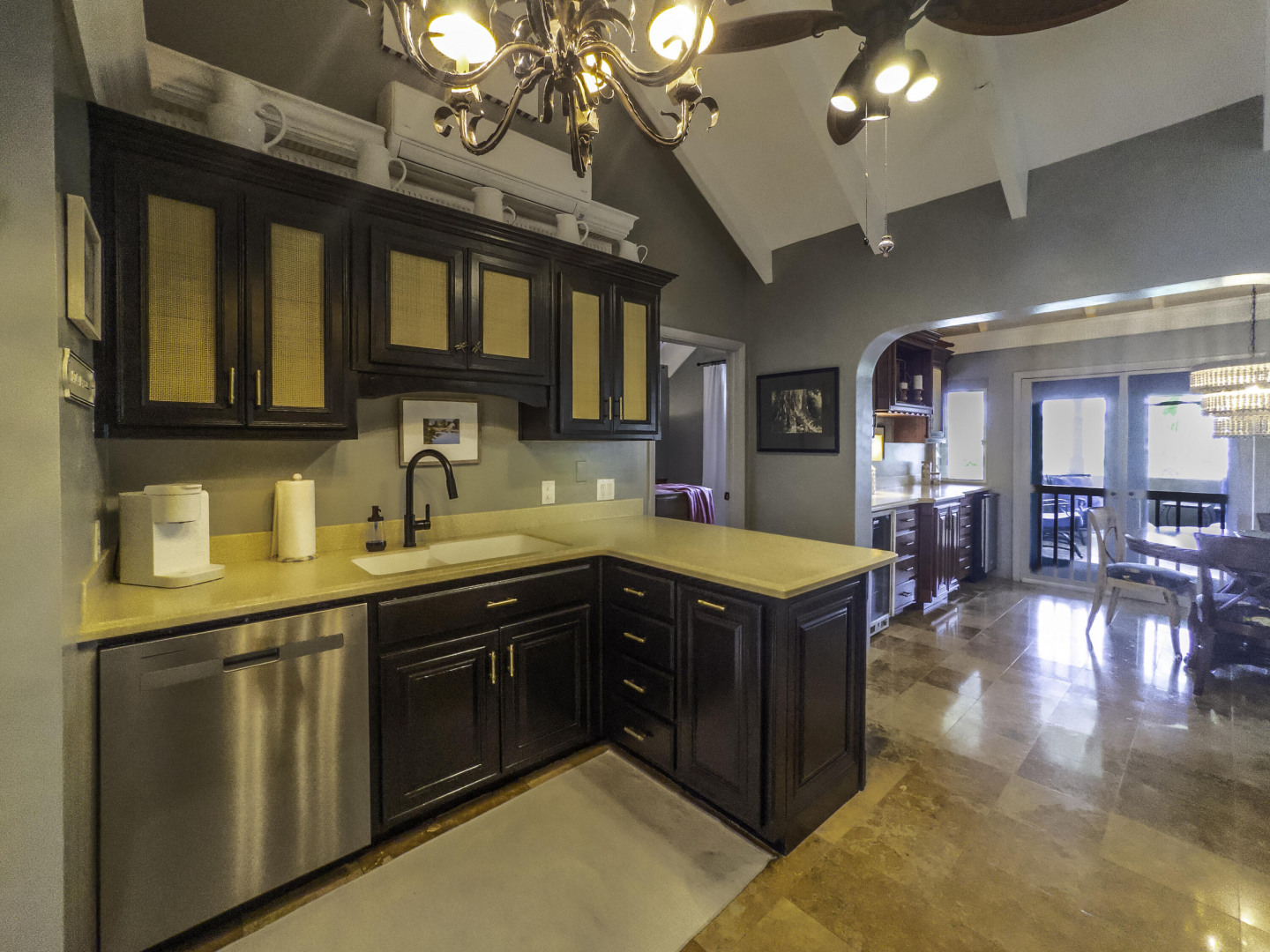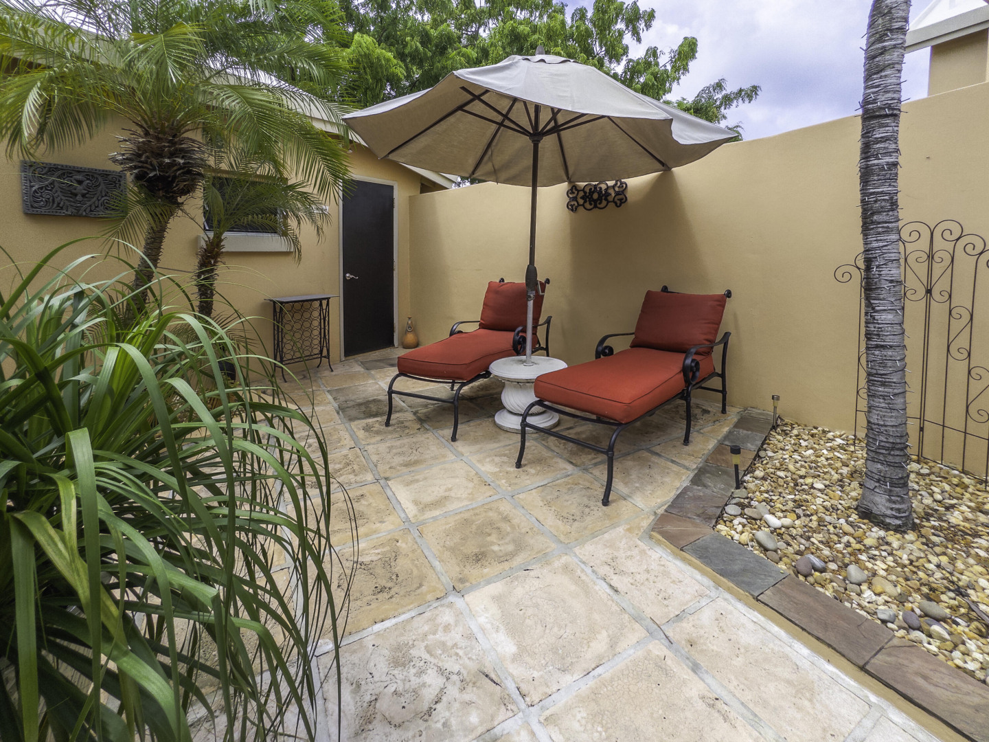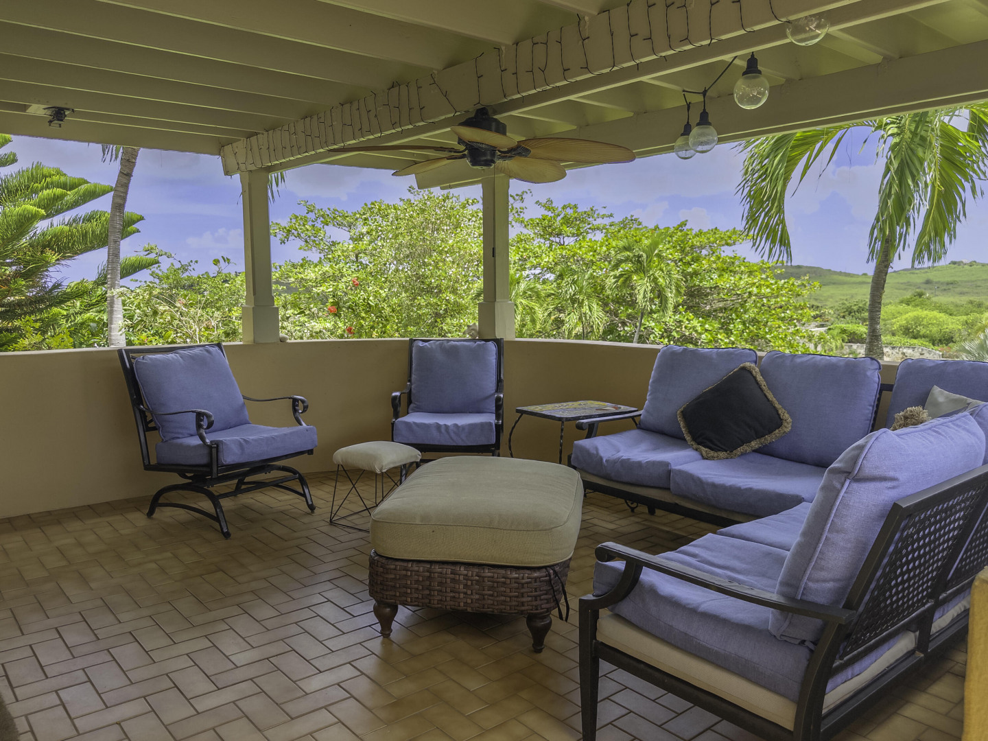 Extraordinary, single-level condo that merges the turnkey ease of condo ownership with the privacy and spaciousness of a stand-alone villa. This meticulously maintained and beautifully decorated residence features two full bedrooms, each served by its own private, en-suite bathroom and individual split AC units in every room. Elegant marble floor and crown molding with soffit lighting create a refined atmosphere. The custom kitchen with Corian countertops flows into a large, private, enclosed courtyard that truly expands your living area. A second covered patio overlooks the verdant hills and sparkling salt water pool. A UV water filtration system and 20KW diesel generator provide comfort and security.