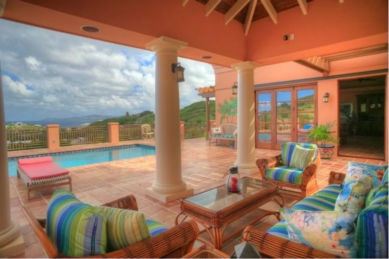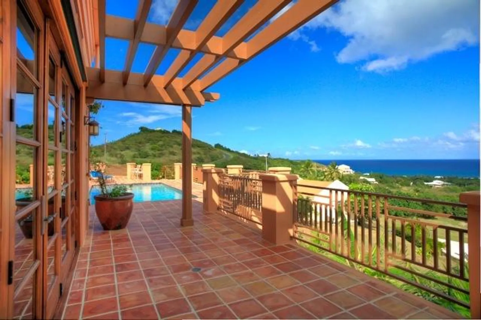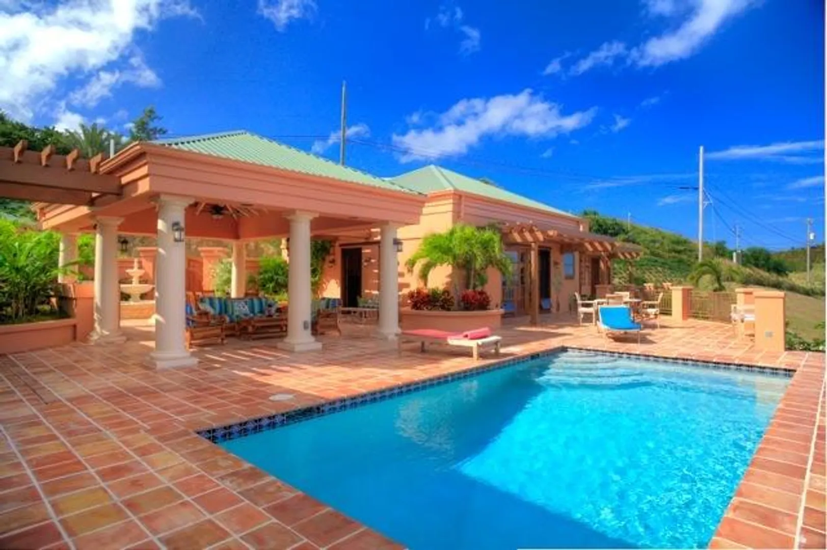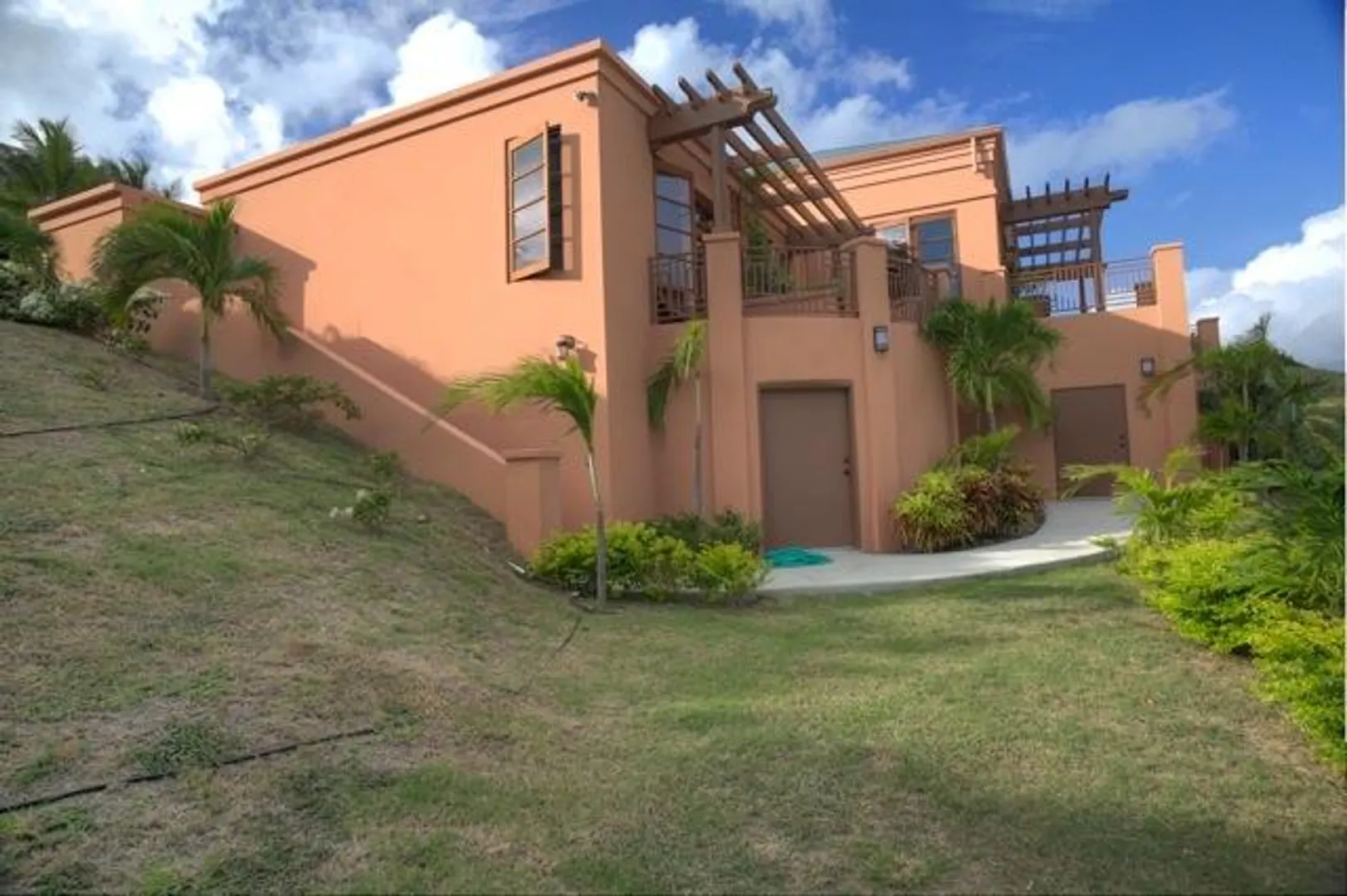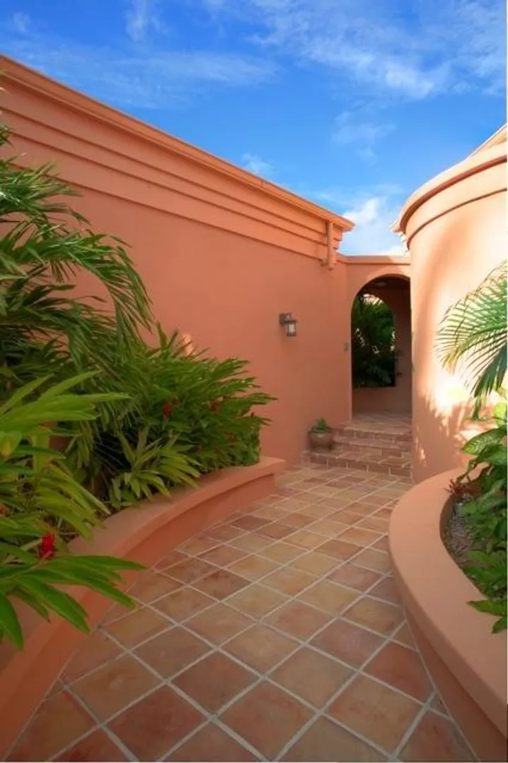 This home features an abundance of outdoor living space, & the home can easily be opened to create what feels like outdoor living space. You'll not find a nicer kitchen & great room area, & the master was thoughtfully designed to give each partner their own bathroom and closet space. Two offices, too, so each partner has a personal office. Two guest suites, & a garage. See supplement.  This magnificent 5 year old home was designed by Steve Myrvang, an AIA award-winning architect, to perfectly capture the tropical breezes and captivating view of the Caribbean Sea. The landscaping on this one acre plot is lush and easy to maintain, thanks to the graywater-fed drip irrigation and fertilizer injection system that waters and fertilizes nearly every plant every day.  Consisting of 3100 interior square-feet, the home has nearly the same amount of exterior space from which to enjoy the view of the deep blue sea and Buck Island by day, and the twinkling lights of Christiansted by night. The beautiful doors and windows are Central American Mahogany, built in Nicaragua, and feature hurricane-rated glass.  Several large openings, 9, 12 and 16 feet, respectively, maximize the views and trade winds. Conventional aluminum and polycarbonate hurricane panels further protect the entryways.   The central portion of the house is a covered outdoor pavilion that includes a living area, large dining table, grilling station, wet bar, and features a pristine saline pool.  A special changing room is on the lower level, where there is also an abundance of storage. The pool is automatically heated by roof-mounted solar panels and can be kept at the selected temperature via a solar controller. The master suite boasts his and her bathrooms, a walk in closet with built-ins, a large laundry room, a sewing room and an office. There's also a spacious outdoor shower (private, but open), plenty big enough for two to enjoy!    The main pod features a great room complete with a fabulous entertainment area, dining space, kitchen, huge pantry and powder room. The cabinets in the kitchen and all other built in cabinets throughout the house (and there are many) are custom-made African Mahogany. A large island surfaced with a single slab of Brazilian Jurassic Green granite, a full 30mm thick, provides ample space for cooking, eating, and entertaining.   A lovely pathway with lush tropical plantings leads from the outdoor pavilion to two guest suites, each with its own bath and gallery from which to enjoy the view. You'll see plenty of local artist Isabel Picard's work along the walkway to the guest wing.   Other features include a two-car garage and a 20Kw propane fueled Cummins-Onan Generator, which will run the entire house and is fully automated to start and stop upon electric service interruption and subsequent restoration.  Solar panels power the hot water systems.    This home is secure, energy-efficient, well designed and built, and tastefully decorated. It is located in one of the most desirable and convenient beach-front gated communities on the beautiful island of St Croix, in the US Virgin Islands.  It comes fully furnished and is a bargain at $1,600,000.
