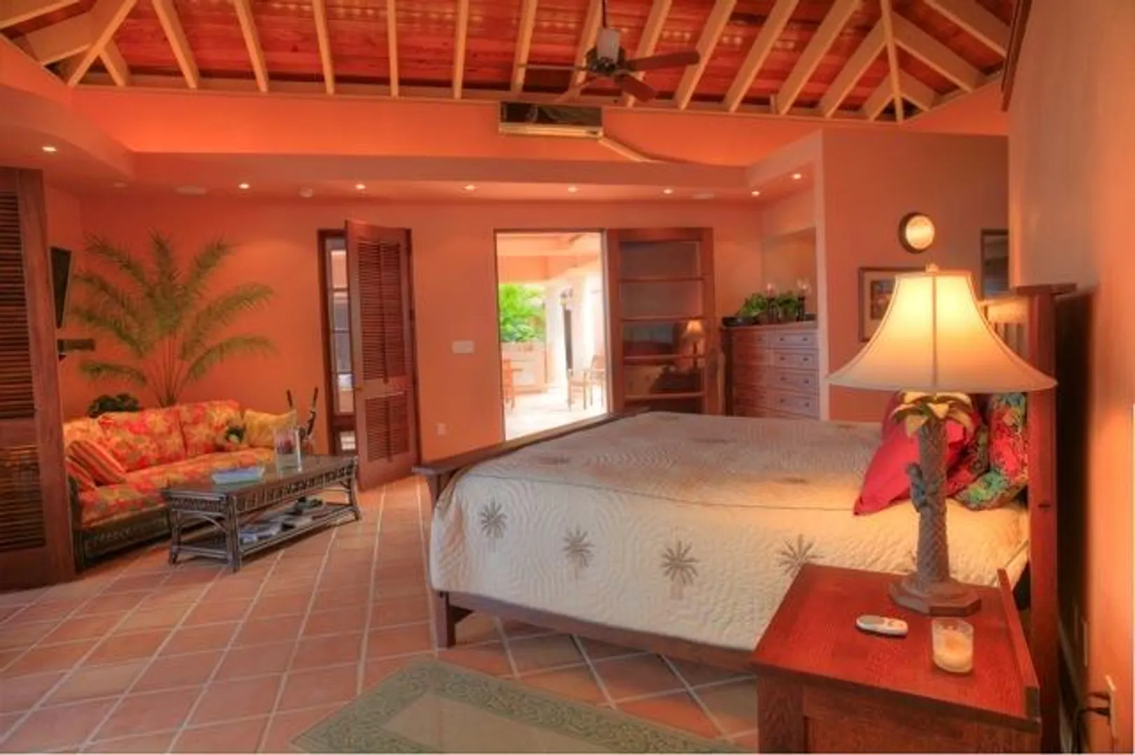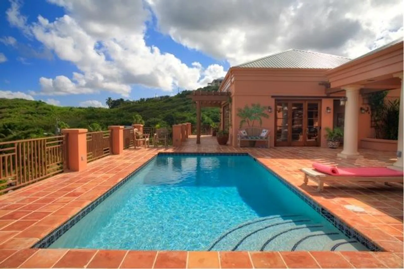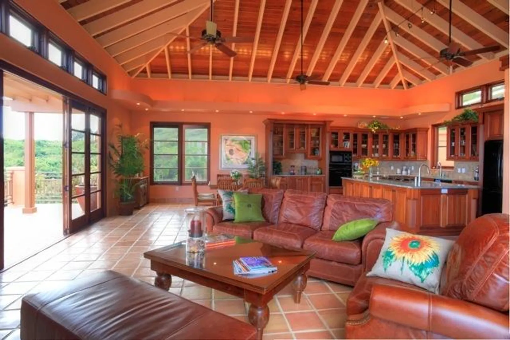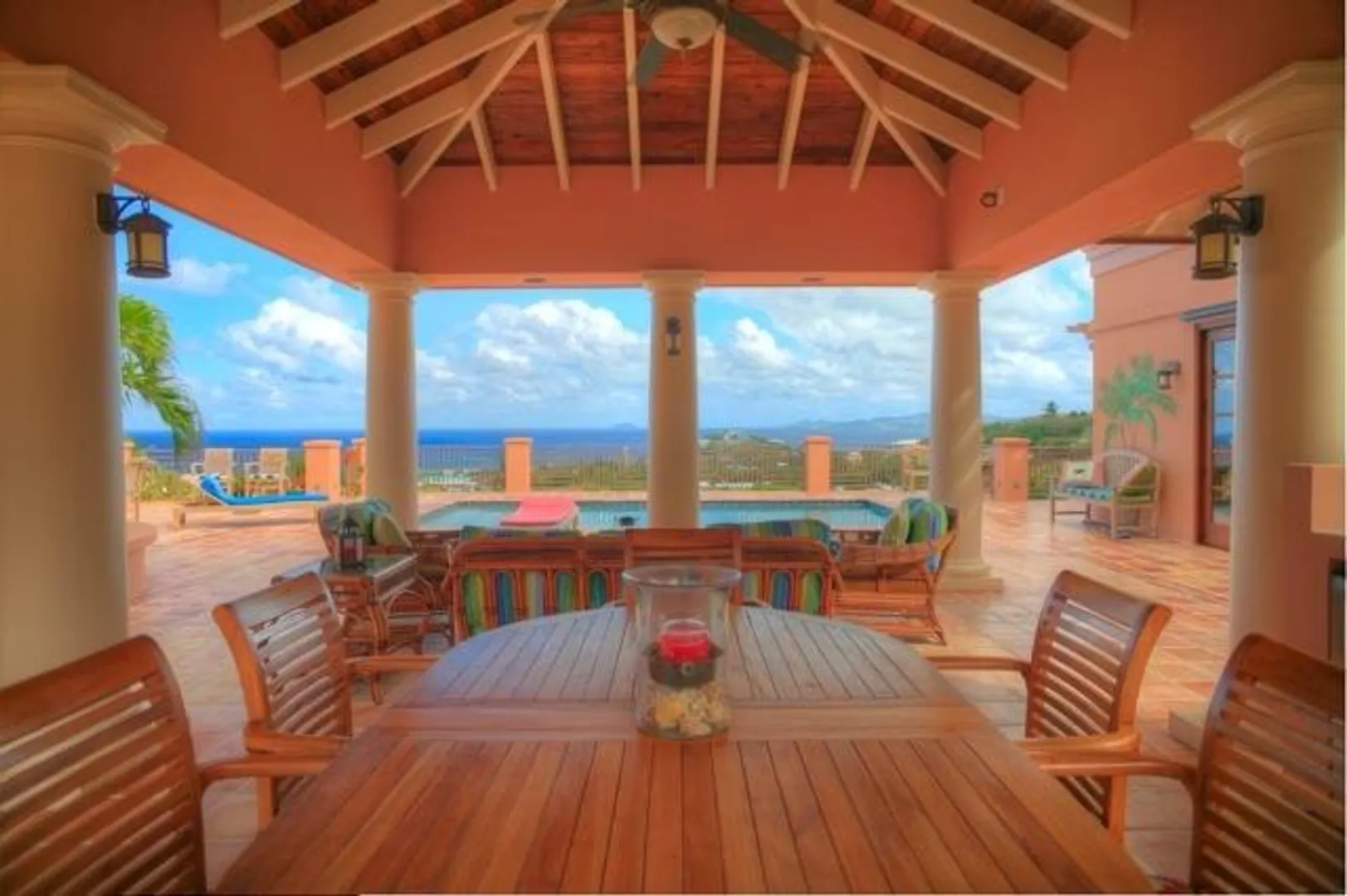 This home features an abundance of outdoor living space, & the home can easily be opened to create what feels like outdoor living space. You'll not find a nicer kitchen & great room area, & the master was thoughtfully designed to give each partner their own bathroom and closet space. Two offices, too, so each partner has a personal office. Two guest suites, & a garage. See supplement.  This magnificent 5 year old home was designed by Steve Myrvang, an AIA award-winning architect, to perfectly capture the tropical breezes and captivating view of the Caribbean Sea. The landscaping on this one acre plot is lush and easy to maintain, thanks to the graywater-fed drip irrigation and fertilizer injection system that waters and fertilizes nearly every plant every day.  Consisting of 3100 interior square-feet, the home has nearly the same amount of exterior space from which to enjoy the view of the deep blue sea and Buck Island by day, and the twinkling lights of Christiansted by night. The beautiful doors and windows are Central American Mahogany, built in Nicaragua, and feature hurricane-rated glass.  Several large openings, 9, 12 and 16 feet, respectively, maximize the views and trade winds. Conventional aluminum and polycarbonate hurricane panels further protect the entryways.   The central portion of the house is a covered outdoor pavilion that includes a living area, large dining table, grilling station, wet bar, and features a pristine saline pool.  A special changing room is on the lower level, where there is also an abundance of storage. The pool is automatically heated by roof-mounted solar panels and can be kept at the selected temperature via a solar controller. The master suite boasts his and her bathrooms, a walk in closet with built-ins, a large laundry room, a sewing room and an office. There's also a spacious outdoor shower (private, but open), plenty big enough for two to enjoy!    The main pod features a great room complete with a fabulous entertainment area, dining space, kitchen, huge pantry and powder room. The cabinets in the kitchen and all other built in cabinets throughout the house (and there are many) are custom-made African Mahogany. A large island surfaced with a single slab of Brazilian Jurassic Green granite, a full 30mm thick, provides ample space for cooking, eating, and entertaining.   A lovely pathway with lush tropical plantings leads from the outdoor pavilion to two guest suites, each with its own bath and gallery from which to enjoy the view. You'll see plenty of local artist Isabel Picard's work along the walkway to the guest wing.   Other features include a two-car garage and a 20Kw propane fueled Cummins-Onan Generator, which will run the entire house and is fully automated to start and stop upon electric service interruption and subsequent restoration.  Solar panels power the hot water systems.    This home is secure, energy-efficient, well designed and built, and tastefully decorated. It is located in one of the most desirable and convenient beach-front gated communities on the beautiful island of St Croix, in the US Virgin Islands.  It comes fully furnished and is a bargain at $1,600,000.