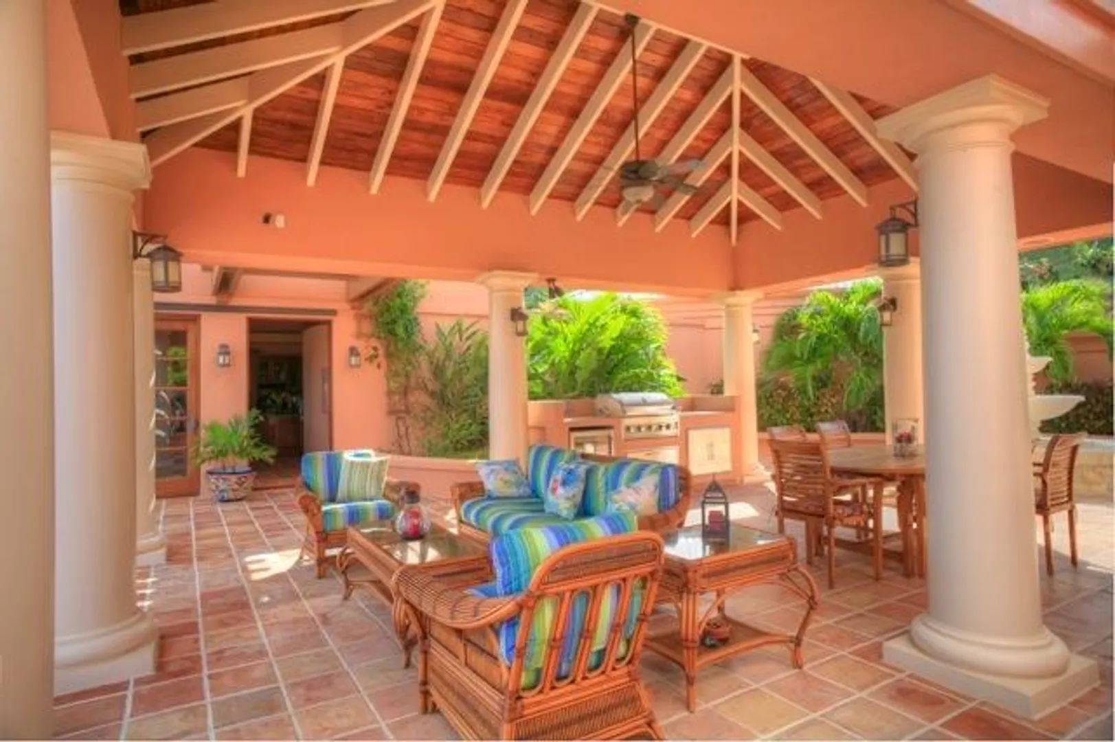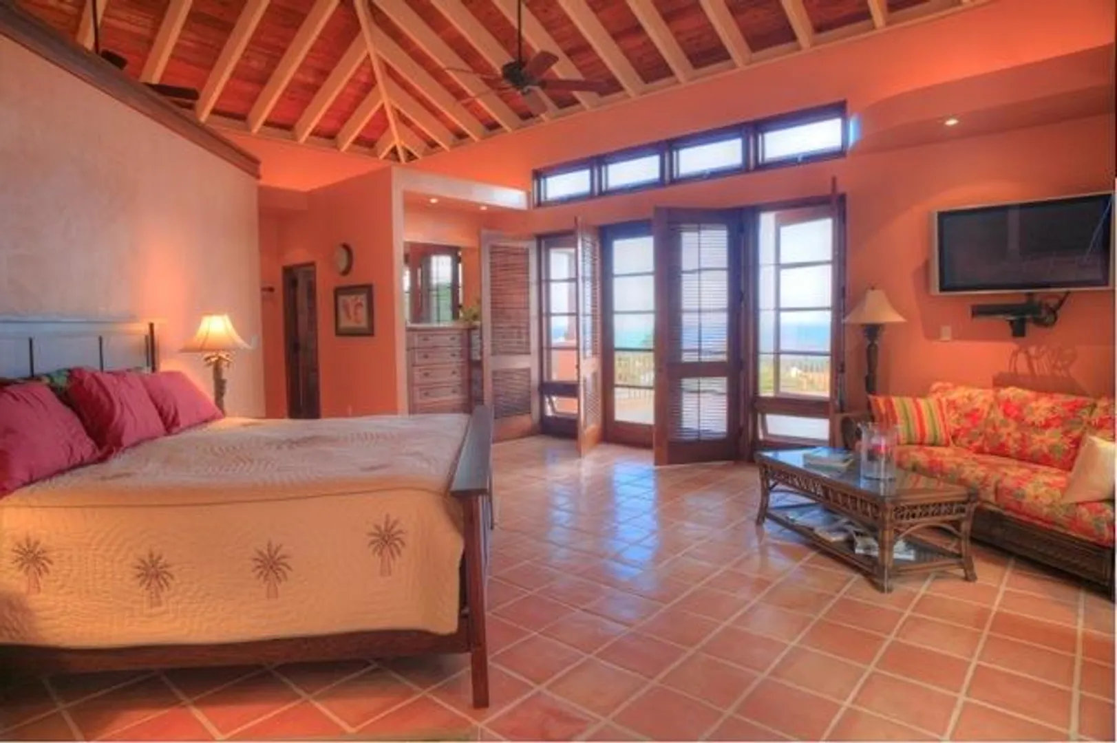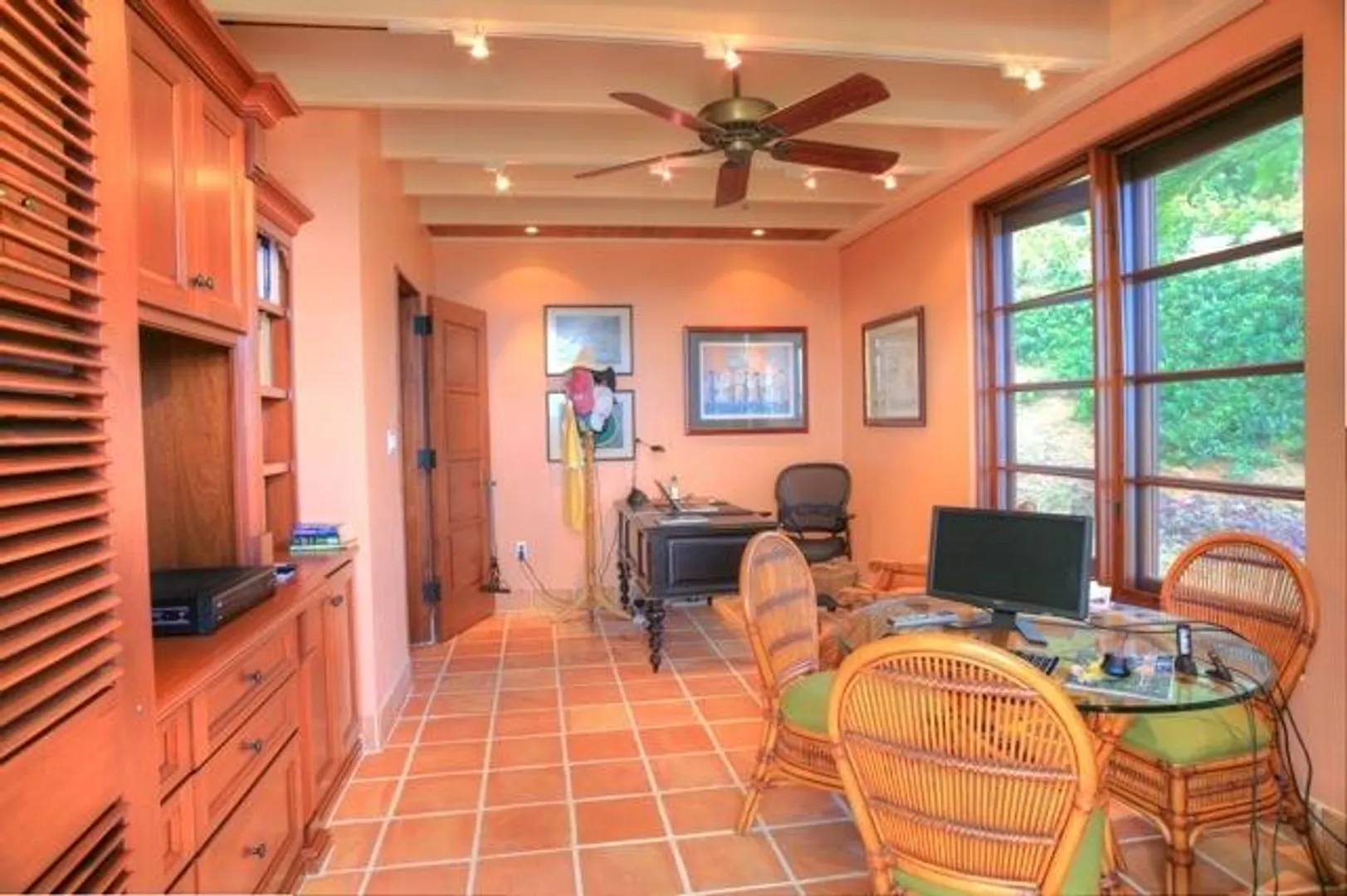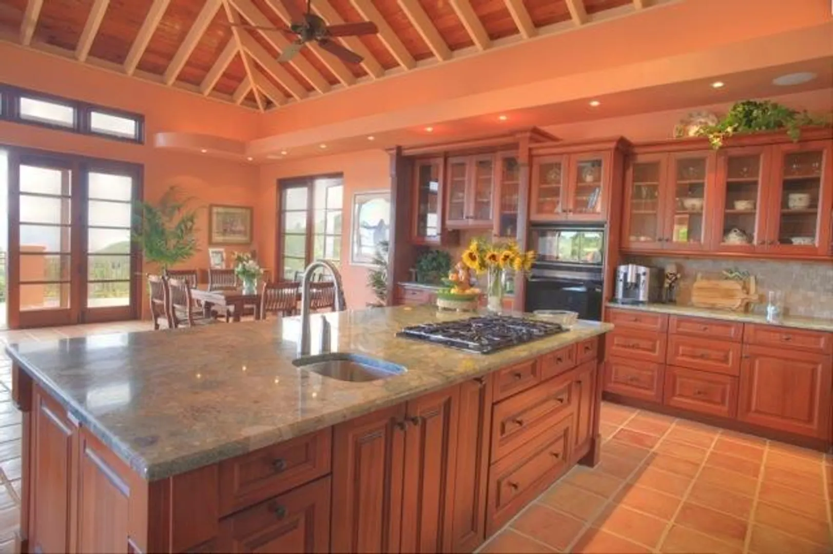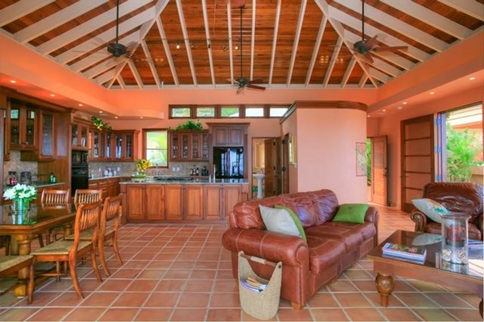 This home features an abundance of outdoor living space, & the home can easily be opened to create what feels like outdoor living space. You'll not find a nicer kitchen & great room area, & the master was thoughtfully designed to give each partner their own bathroom and closet space. Two offices, too, so each partner has a personal office. Two guest suites, & a garage. See supplement.  This magnificent 5 year old home was designed by Steve Myrvang, an AIA award-winning architect, to perfectly capture the tropical breezes and captivating view of the Caribbean Sea. The landscaping on this one acre plot is lush and easy to maintain, thanks to the graywater-fed drip irrigation and fertilizer injection system that waters and fertilizes nearly every plant every day.  Consisting of 3100 interior square-feet, the home has nearly the same amount of exterior space from which to enjoy the view of the deep blue sea and Buck Island by day, and the twinkling lights of Christiansted by night. The beautiful doors and windows are Central American Mahogany, built in Nicaragua, and feature hurricane-rated glass.  Several large openings, 9, 12 and 16 feet, respectively, maximize the views and trade winds. Conventional aluminum and polycarbonate hurricane panels further protect the entryways.   The central portion of the house is a covered outdoor pavilion that includes a living area, large dining table, grilling station, wet bar, and features a pristine saline pool.  A special changing room is on the lower level, where there is also an abundance of storage. The pool is automatically heated by roof-mounted solar panels and can be kept at the selected temperature via a solar controller. The master suite boasts his and her bathrooms, a walk in closet with built-ins, a large laundry room, a sewing room and an office. There's also a spacious outdoor shower (private, but open), plenty big enough for two to enjoy!    The main pod features a great room complete with a fabulous entertainment area, dining space, kitchen, huge pantry and powder room. The cabinets in the kitchen and all other built in cabinets throughout the house (and there are many) are custom-made African Mahogany. A large island surfaced with a single slab of Brazilian Jurassic Green granite, a full 30mm thick, provides ample space for cooking, eating, and entertaining.   A lovely pathway with lush tropical plantings leads from the outdoor pavilion to two guest suites, each with its own bath and gallery from which to enjoy the view. You'll see plenty of local artist Isabel Picard's work along the walkway to the guest wing.   Other features include a two-car garage and a 20Kw propane fueled Cummins-Onan Generator, which will run the entire house and is fully automated to start and stop upon electric service interruption and subsequent restoration.  Solar panels power the hot water systems.    This home is secure, energy-efficient, well designed and built, and tastefully decorated. It is located in one of the most desirable and convenient beach-front gated communities on the beautiful island of St Croix, in the US Virgin Islands.  It comes fully furnished and is a bargain at $1,600,000.