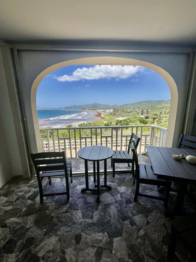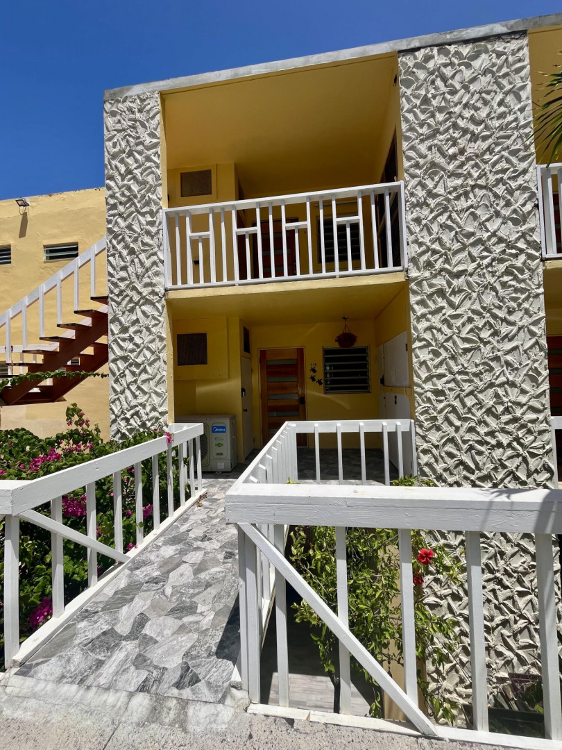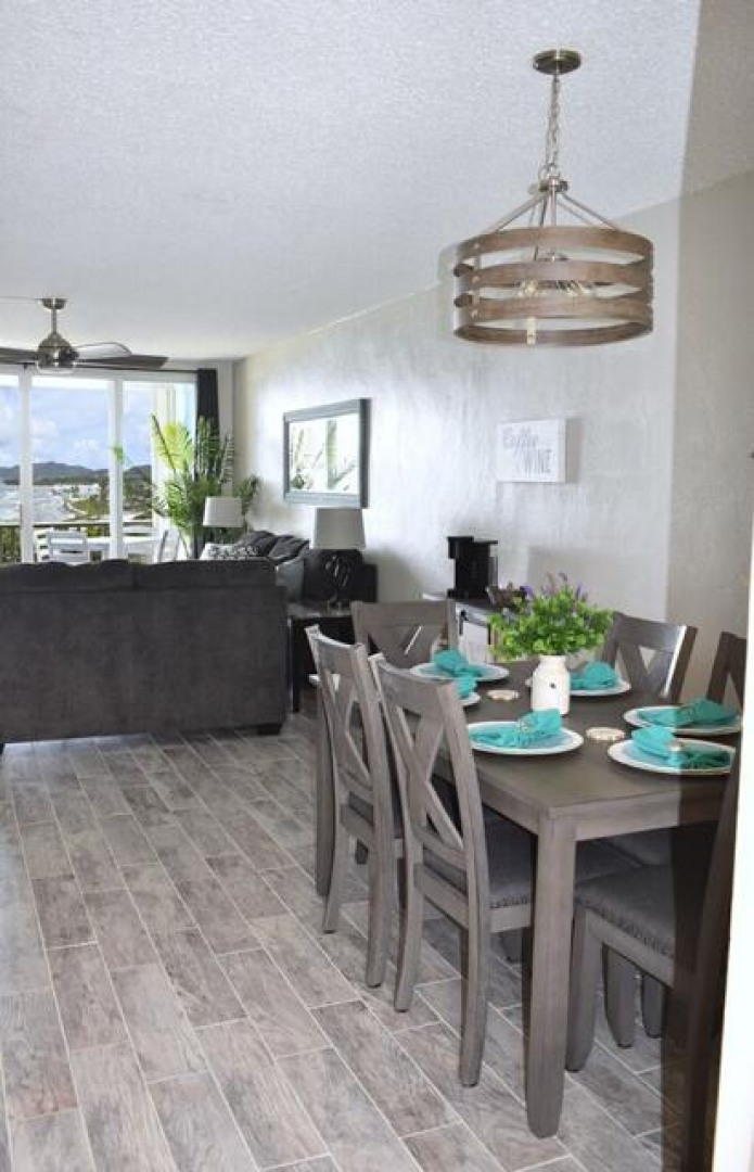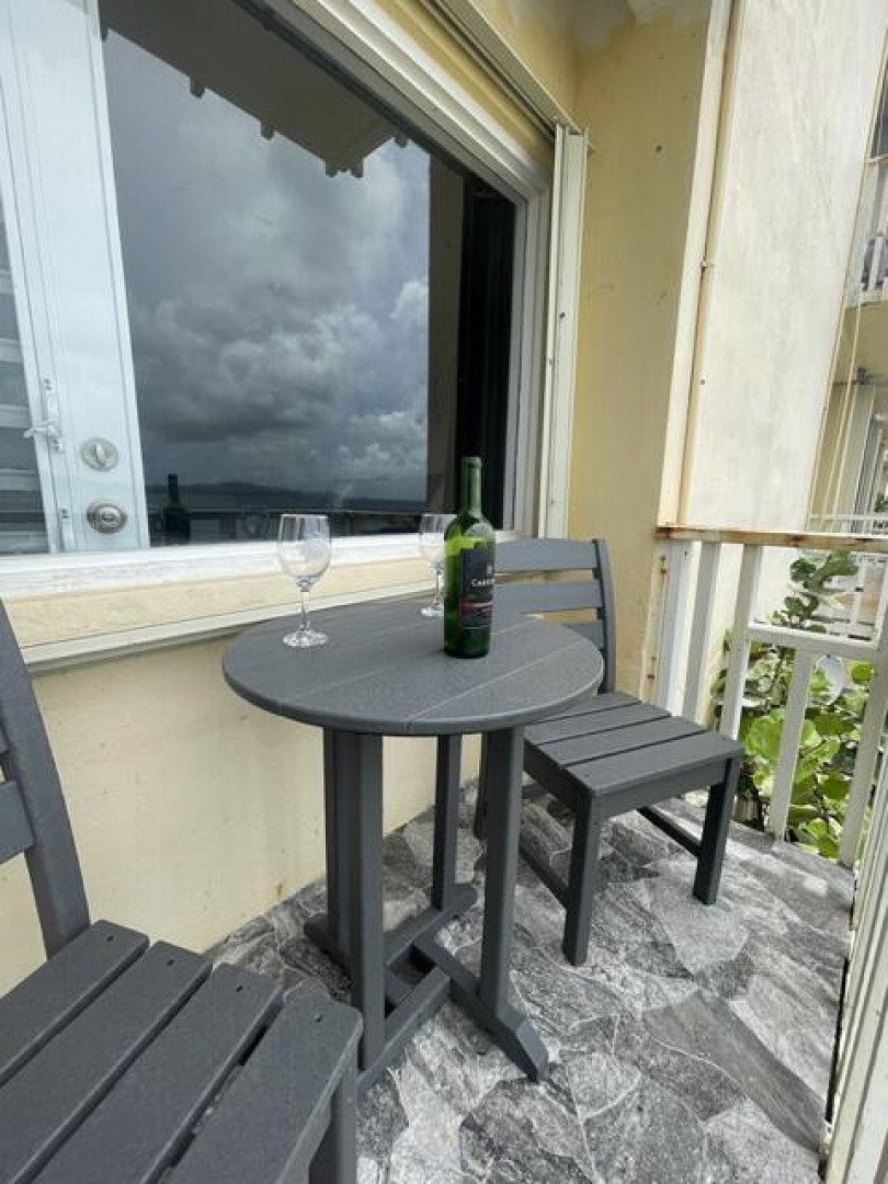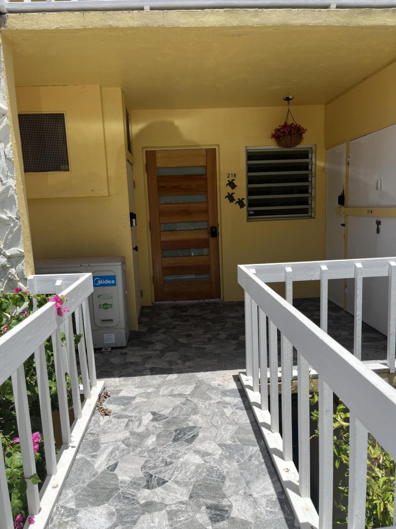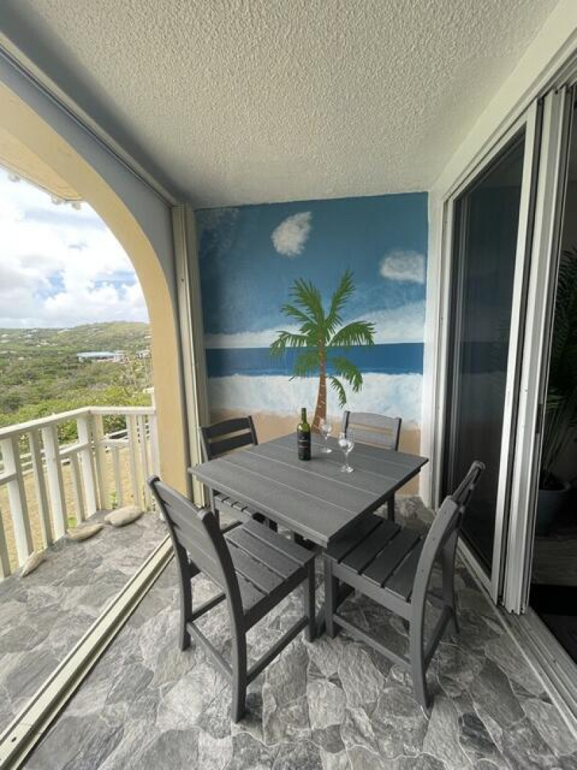 Fully furnished, immaculate, newly renovated, luxurious 2 bedroom condo located in a gated-pool community, offers the perfect blend of comfort, convenience & breathtaking ocean views. This successful VRBO rental could continue to produce income or serve as a perfect primary residence.Situated at street level, this condo provides easy access without any stairs. Upon entering, you'll be captivated by beautiful views from galley patio. Whether enjoying morning coffee or unwinding with a glass of wine, this serene setting is the perfect backdrop for relaxation. The condo features a fully equipped kitchen, with a sleek, modern design and updated appliances.2 comfortable bedrooms allow ample space to relax. The master offers breathtaking views of Buck Island from its picturesque windowwith a separate bedroom entrance. Enjoy the spaciousness and privacy of the newly renovated bathroom, along with a custom lit dressing room vanity and an additional sink.