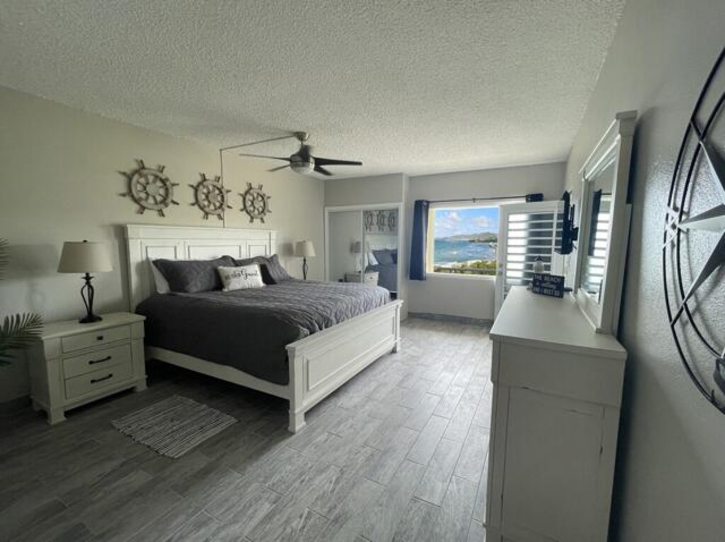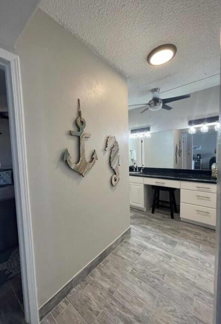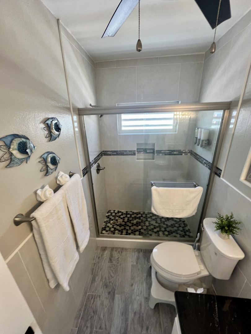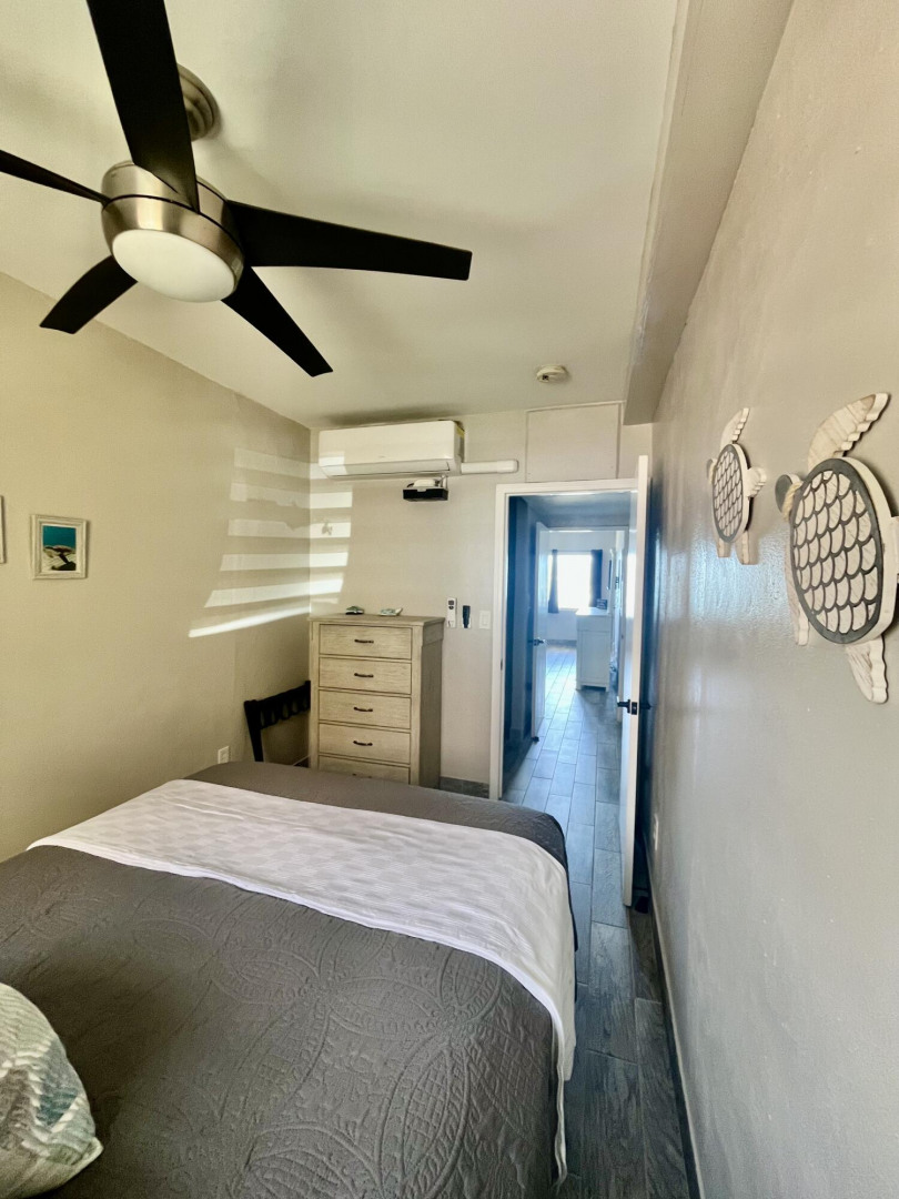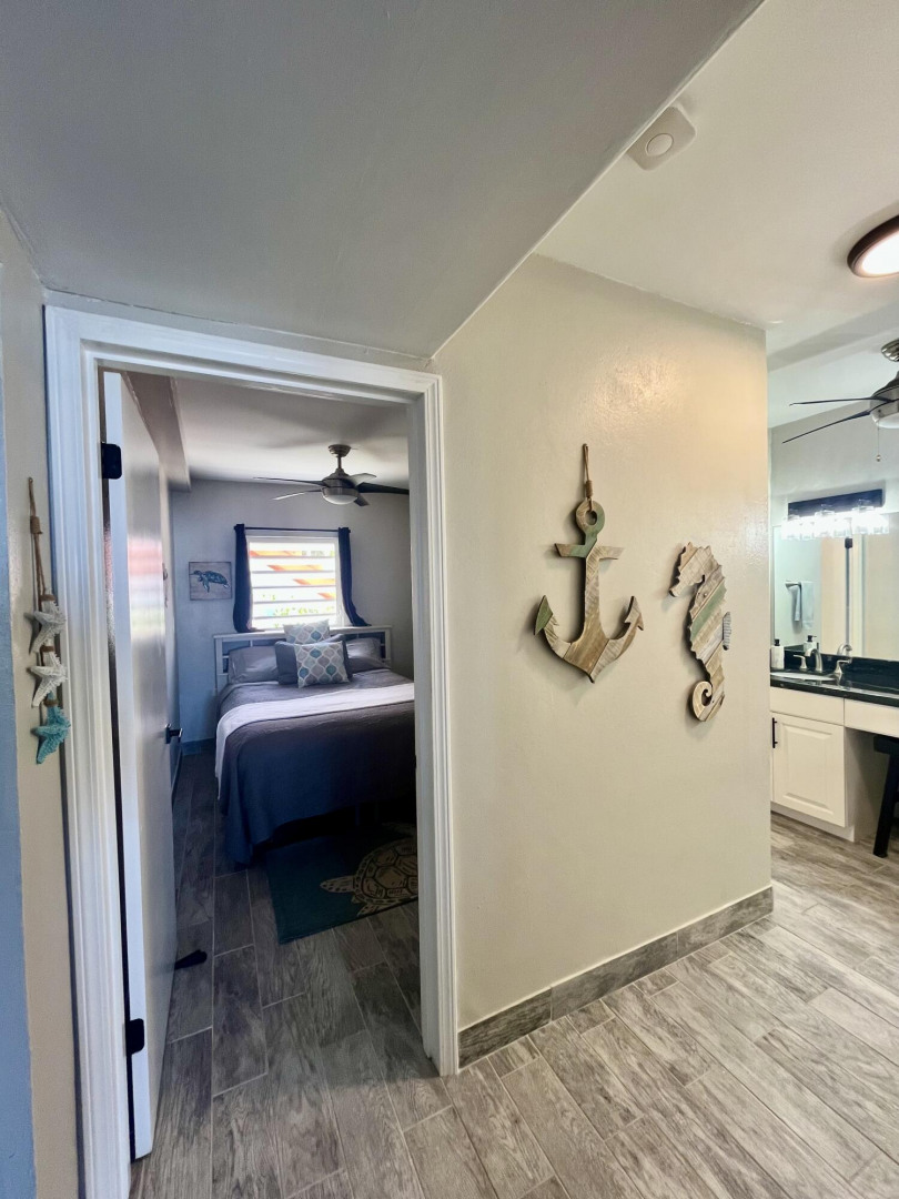Fully furnished, immaculate, newly renovated, luxurious 2 bedroom condo located in a gated-pool community, offers the perfect blend of comfort, convenience & breathtaking ocean views. This successful VRBO rental could continue to produce income or serve as a perfect primary residence.Situated at street level, this condo provides easy access without any stairs. Upon entering, you'll be captivated by beautiful views from galley patio. Whether enjoying morning coffee or unwinding with a glass of wine, this serene setting is the perfect backdrop for relaxation. The condo features a fully equipped kitchen, with a sleek, modern design and updated appliances.2 comfortable bedrooms allow ample space to relax. The master offers breathtaking views of Buck Island from its picturesque windowwith a separate bedroom entrance. Enjoy the spaciousness and privacy of the newly renovated bathroom, along with a custom lit dressing room vanity and an additional sink.