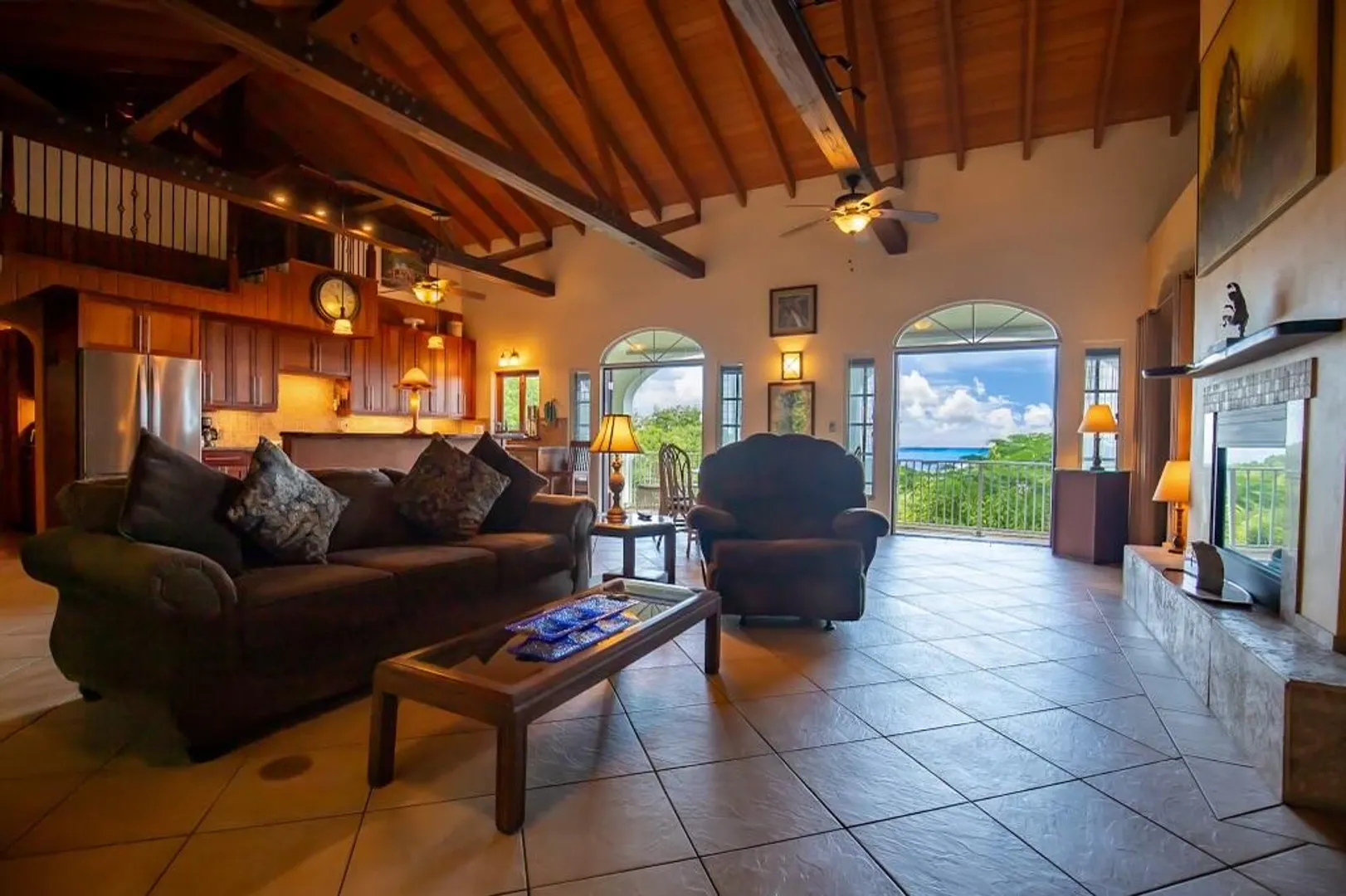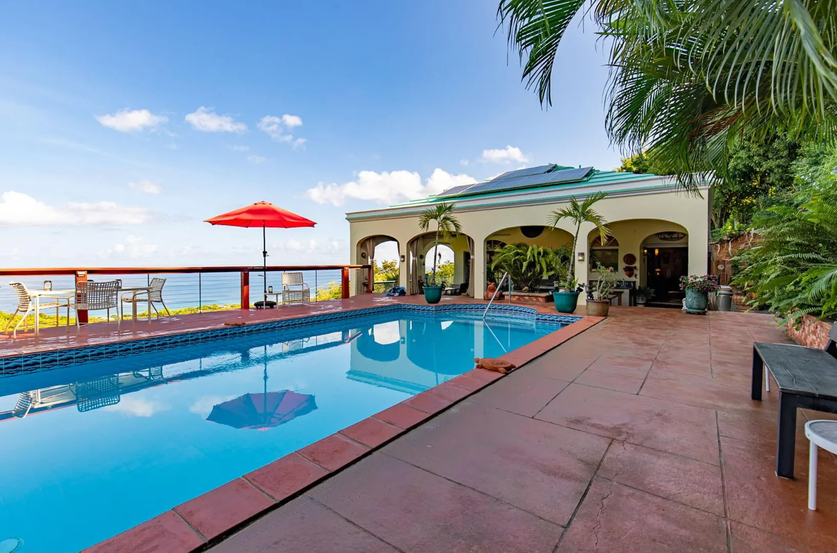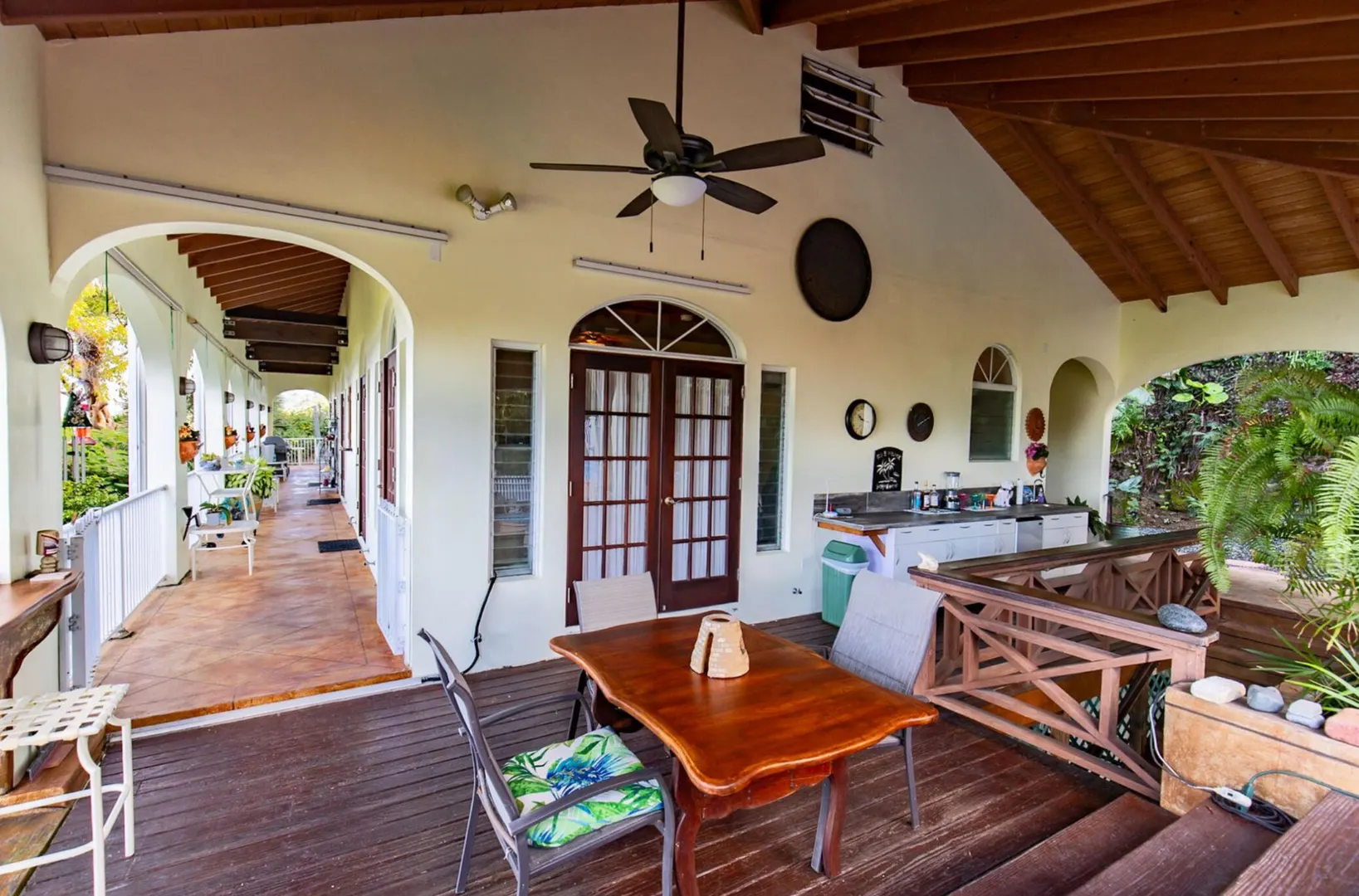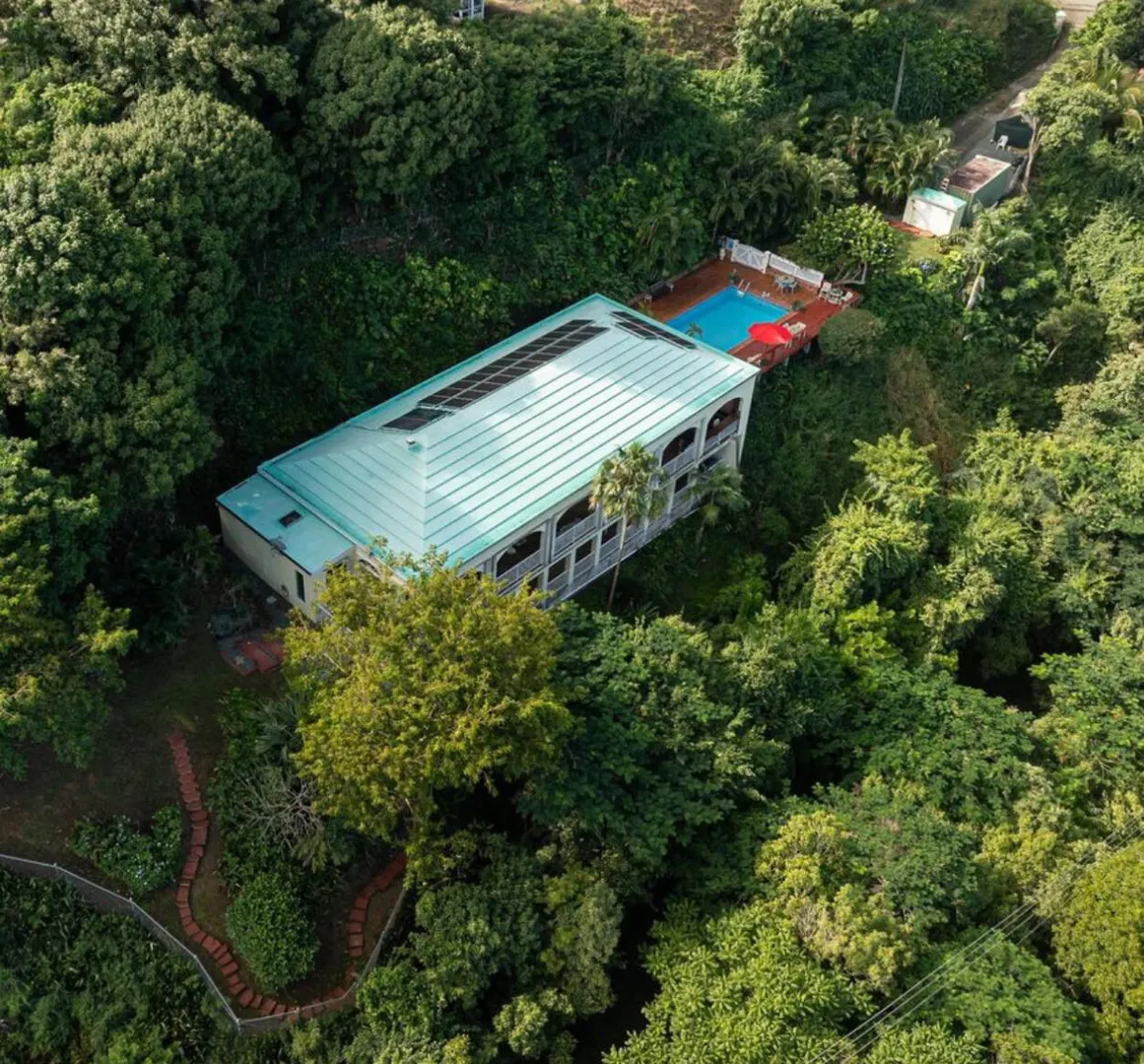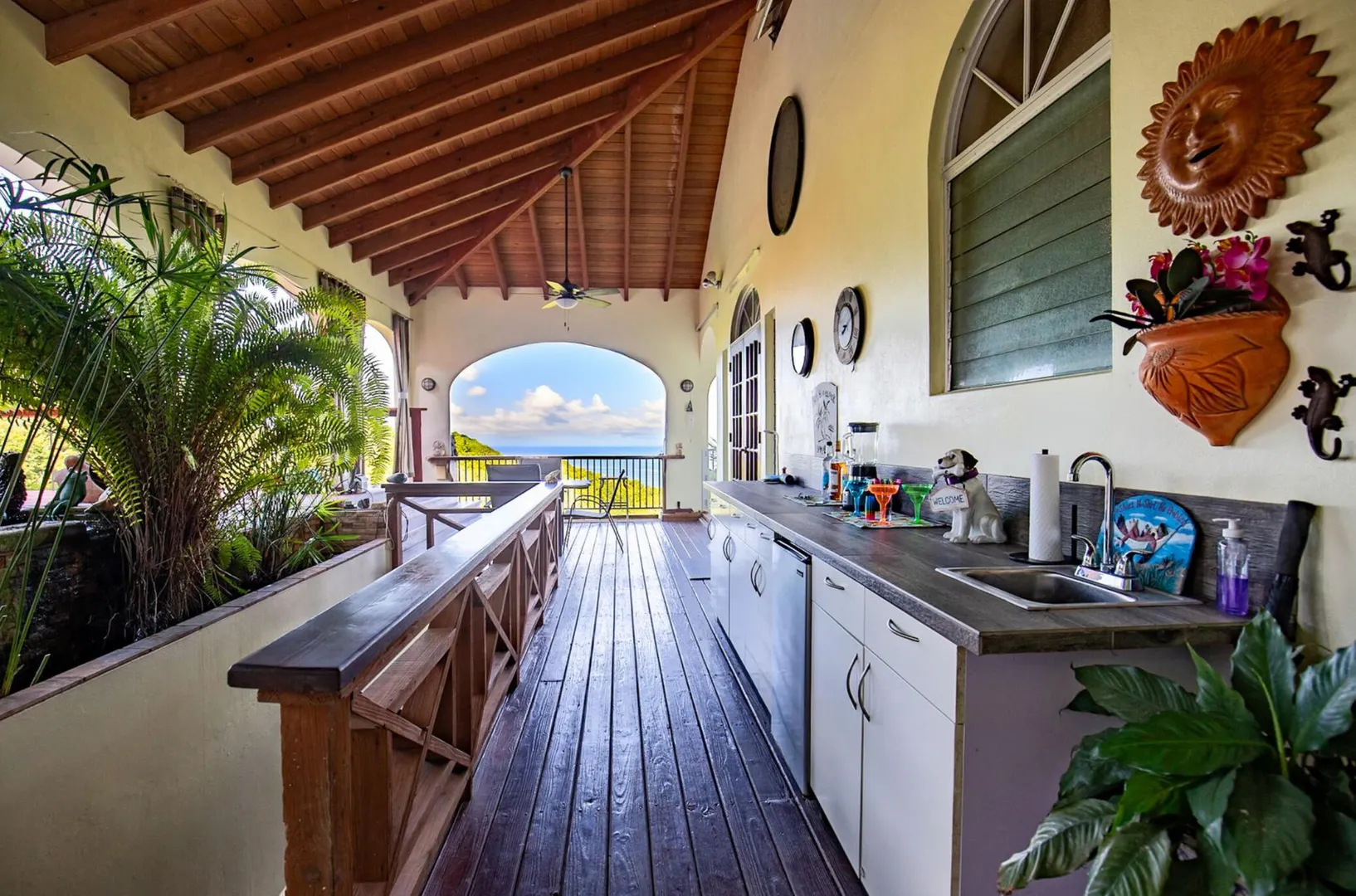 Experience island living at its finest in this poured-concrete 3-bedroom, 2-bathroom home featuring a spacious loft with striking cypress ceilings. The gourmet kitchen showcases Spanish Cedar custom cabinets by Mike Lustig, a mahogany bar, a new 36'' 5-burner gas range with convection, and a new dishwasher. Beautiful mahogany balusters add warmth and craftsmanship throughout. The main house is cooled by two large Mitsubishi split units, both under a 10-year warranty.The expansive 320 sq ft primary suite includes a walk-in closet, double vanity, double shower, skylight, custom tile work, and a luxurious 6-ft cast iron soaking tub. An outdoor shower adjacent to the main suite offers a secluded, spa-like experience.Enjoy seamless indoor-outdoor living with a wraparound deck and an observation deck overlooking the North Shore, offering panoramic views and cooling breezes. The 15x30 tiled saltwater pool features an auto chlorine generator, variable-speed pump, and a new Maytronics robot vacuum, surrounded by a stained concrete deck and an outdoor bar with sink and mini fridge, creating a private resort atmosphere.