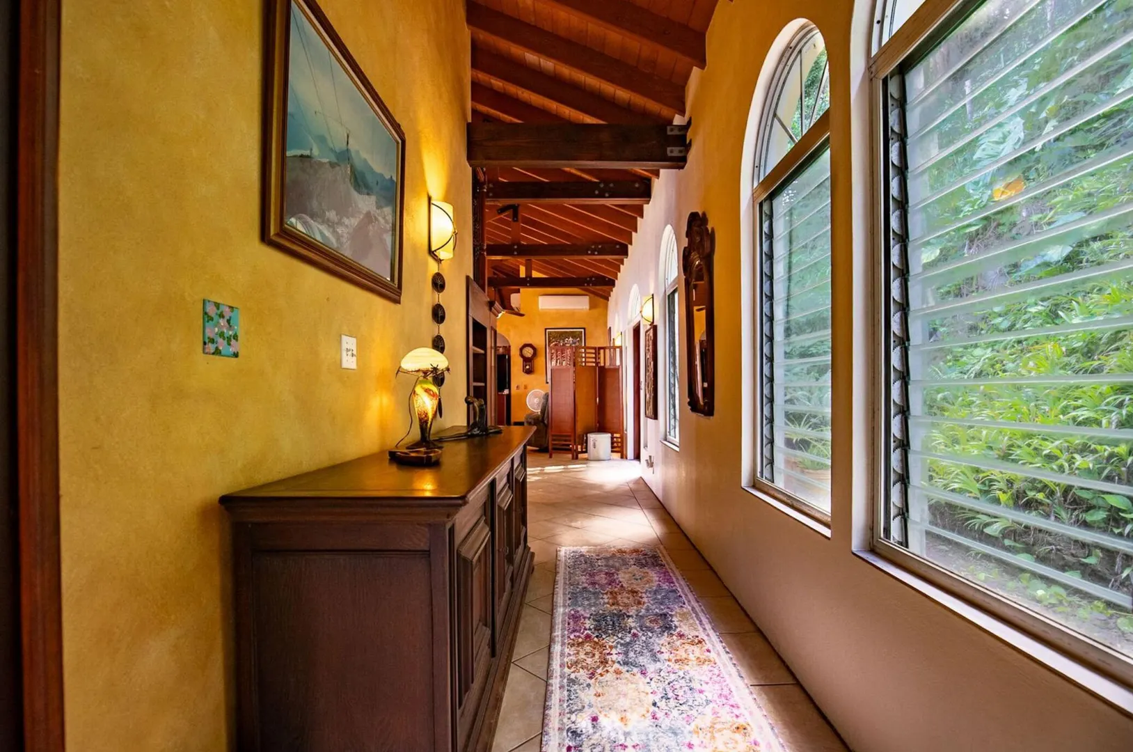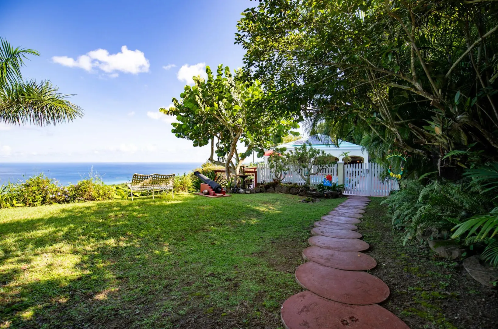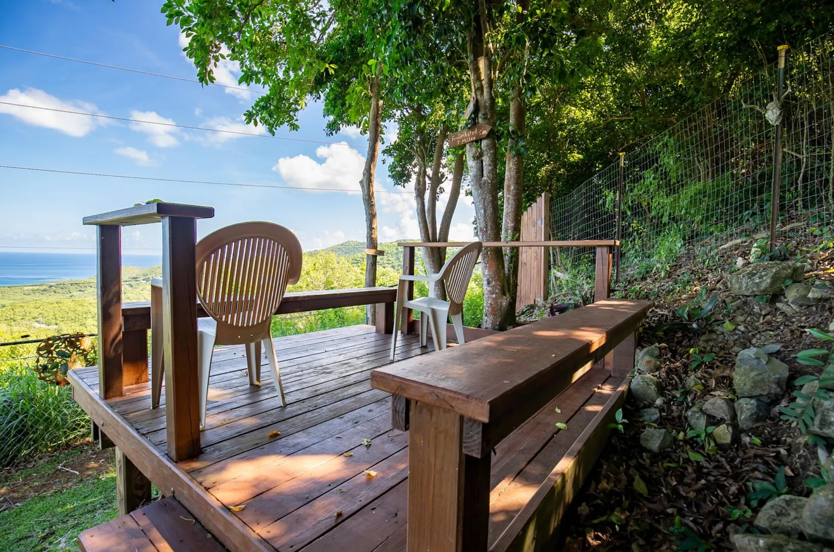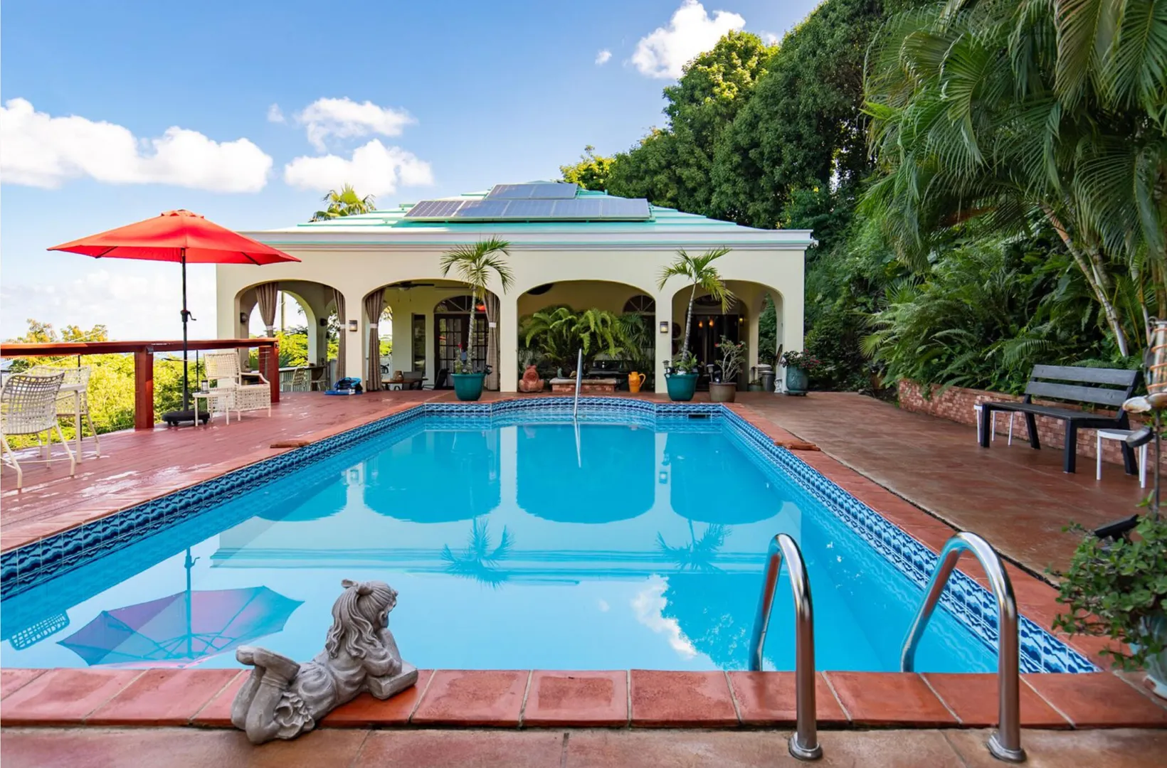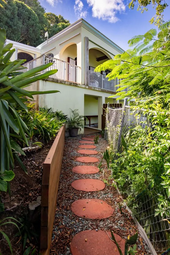 Experience island living at its finest in this poured-concrete 3-bedroom, 2-bathroom home featuring a spacious loft with striking cypress ceilings. The gourmet kitchen showcases Spanish Cedar custom cabinets by Mike Lustig, a mahogany bar, a new 36'' 5-burner gas range with convection, and a new dishwasher. Beautiful mahogany balusters add warmth and craftsmanship throughout. The main house is cooled by two large Mitsubishi split units, both under a 10-year warranty.The expansive 320 sq ft primary suite includes a walk-in closet, double vanity, double shower, skylight, custom tile work, and a luxurious 6-ft cast iron soaking tub. An outdoor shower adjacent to the main suite offers a secluded, spa-like experience.Enjoy seamless indoor-outdoor living with a wraparound deck and an observation deck overlooking the North Shore, offering panoramic views and cooling breezes. The 15x30 tiled saltwater pool features an auto chlorine generator, variable-speed pump, and a new Maytronics robot vacuum, surrounded by a stained concrete deck and an outdoor bar with sink and mini fridge, creating a private resort atmosphere.