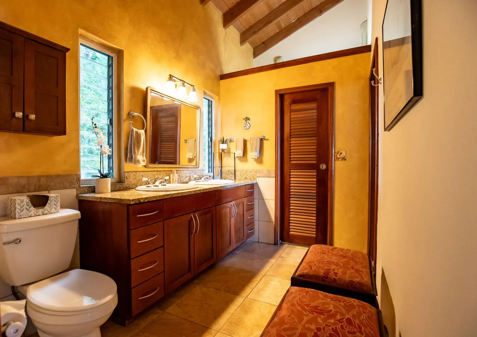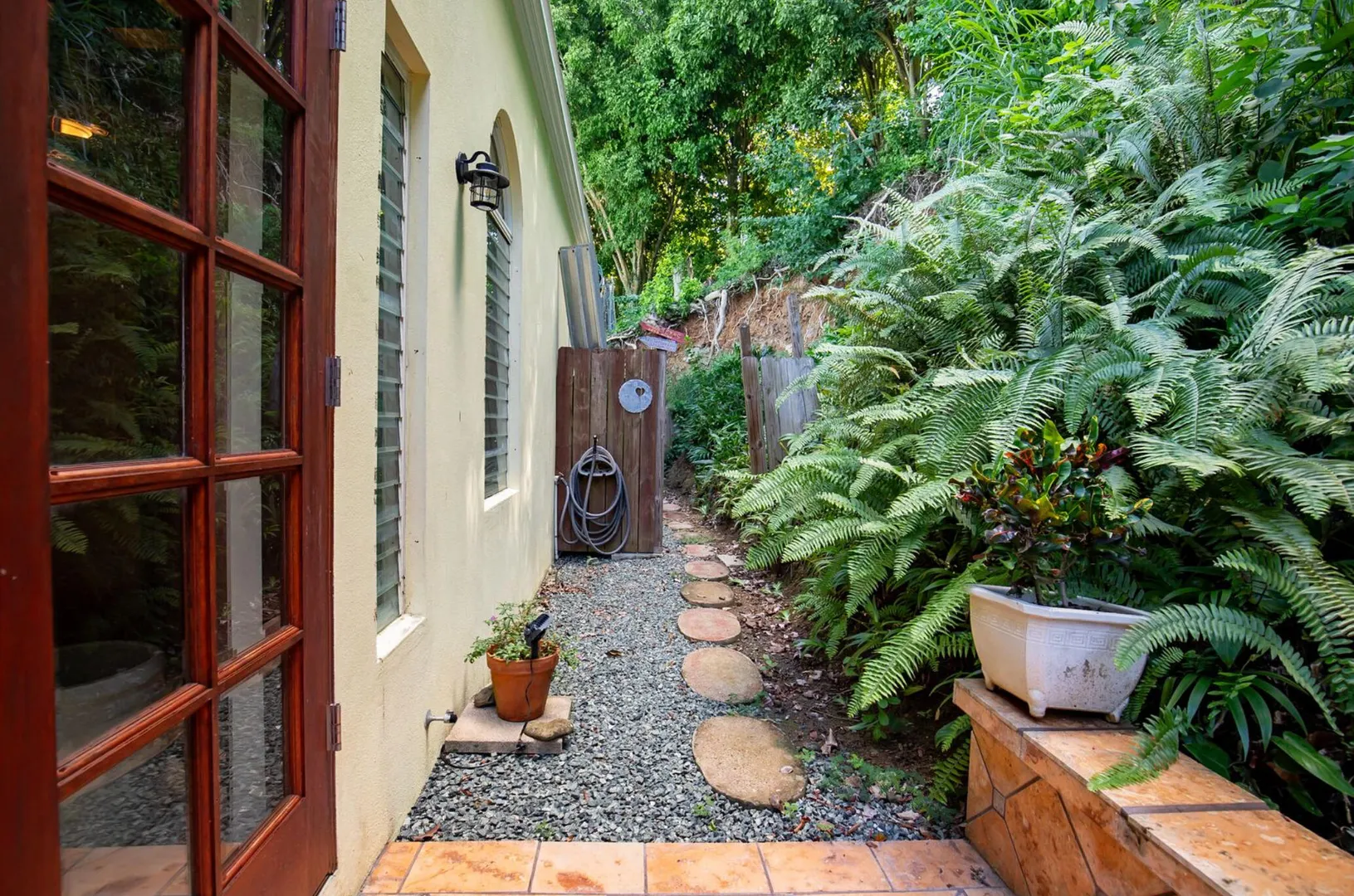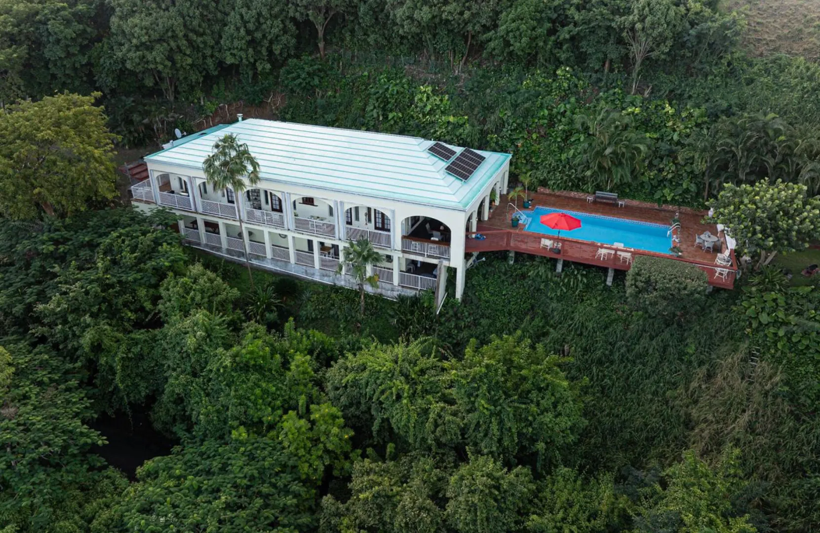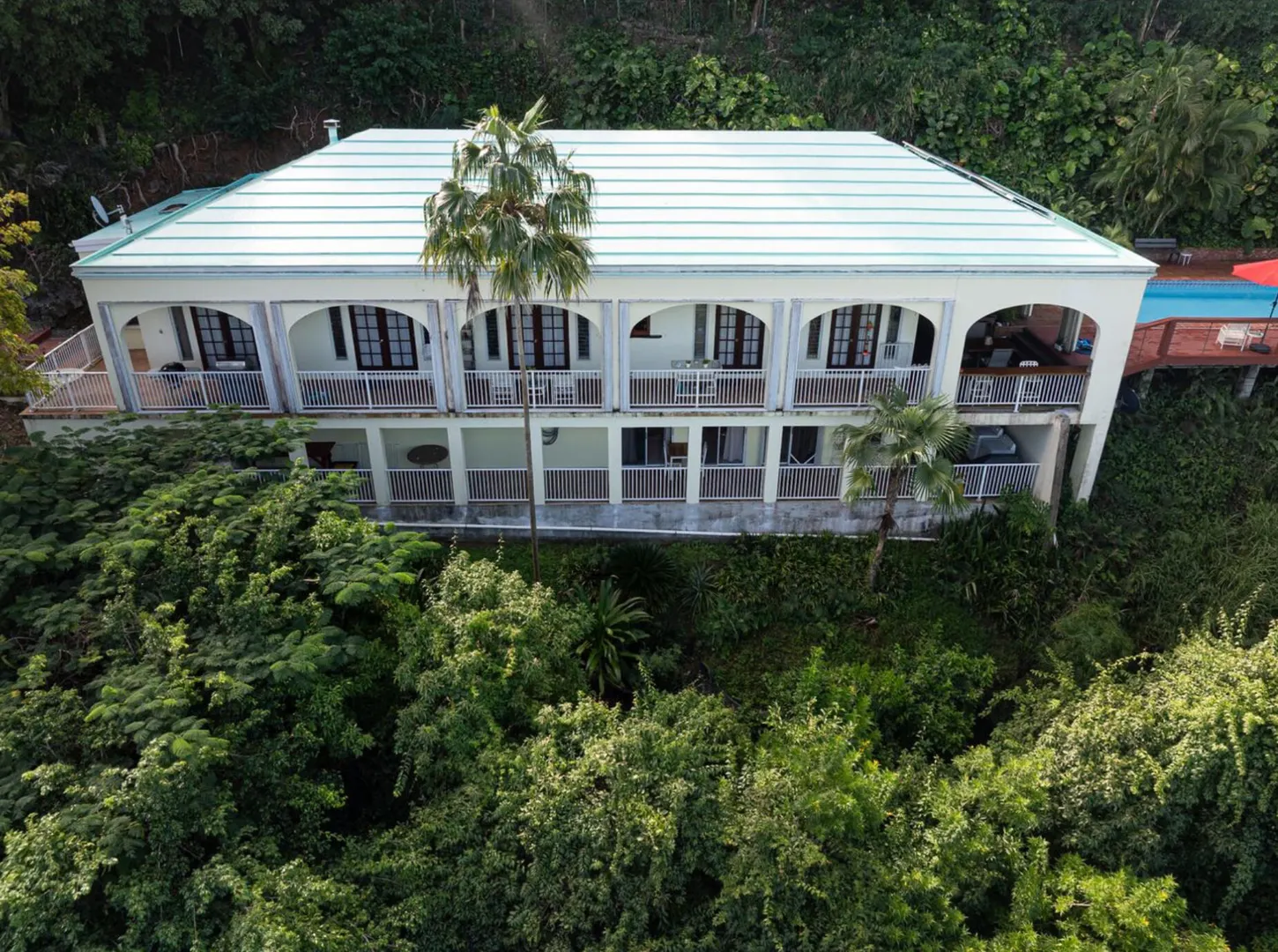 Experience island living at its finest in this poured-concrete 3-bedroom, 2-bathroom home featuring a spacious loft with striking cypress ceilings. The gourmet kitchen showcases Spanish Cedar custom cabinets by Mike Lustig, a mahogany bar, a new 36'' 5-burner gas range with convection, and a new dishwasher. Beautiful mahogany balusters add warmth and craftsmanship throughout. The main house is cooled by two large Mitsubishi split units, both under a 10-year warranty.The expansive 320 sq ft primary suite includes a walk-in closet, double vanity, double shower, skylight, custom tile work, and a luxurious 6-ft cast iron soaking tub. An outdoor shower adjacent to the main suite offers a secluded, spa-like experience.Enjoy seamless indoor-outdoor living with a wraparound deck and an observation deck overlooking the North Shore, offering panoramic views and cooling breezes. The 15x30 tiled saltwater pool features an auto chlorine generator, variable-speed pump, and a new Maytronics robot vacuum, surrounded by a stained concrete deck and an outdoor bar with sink and mini fridge, creating a private resort atmosphere.