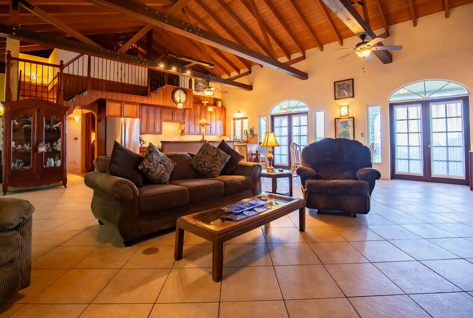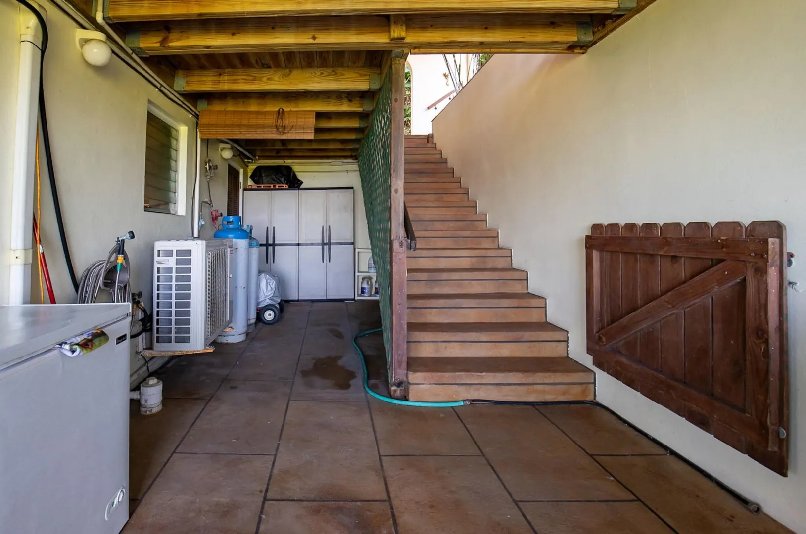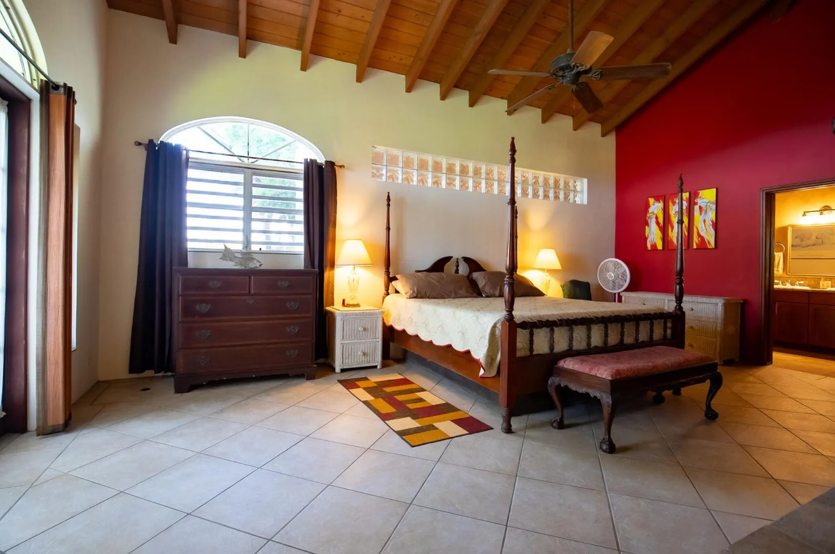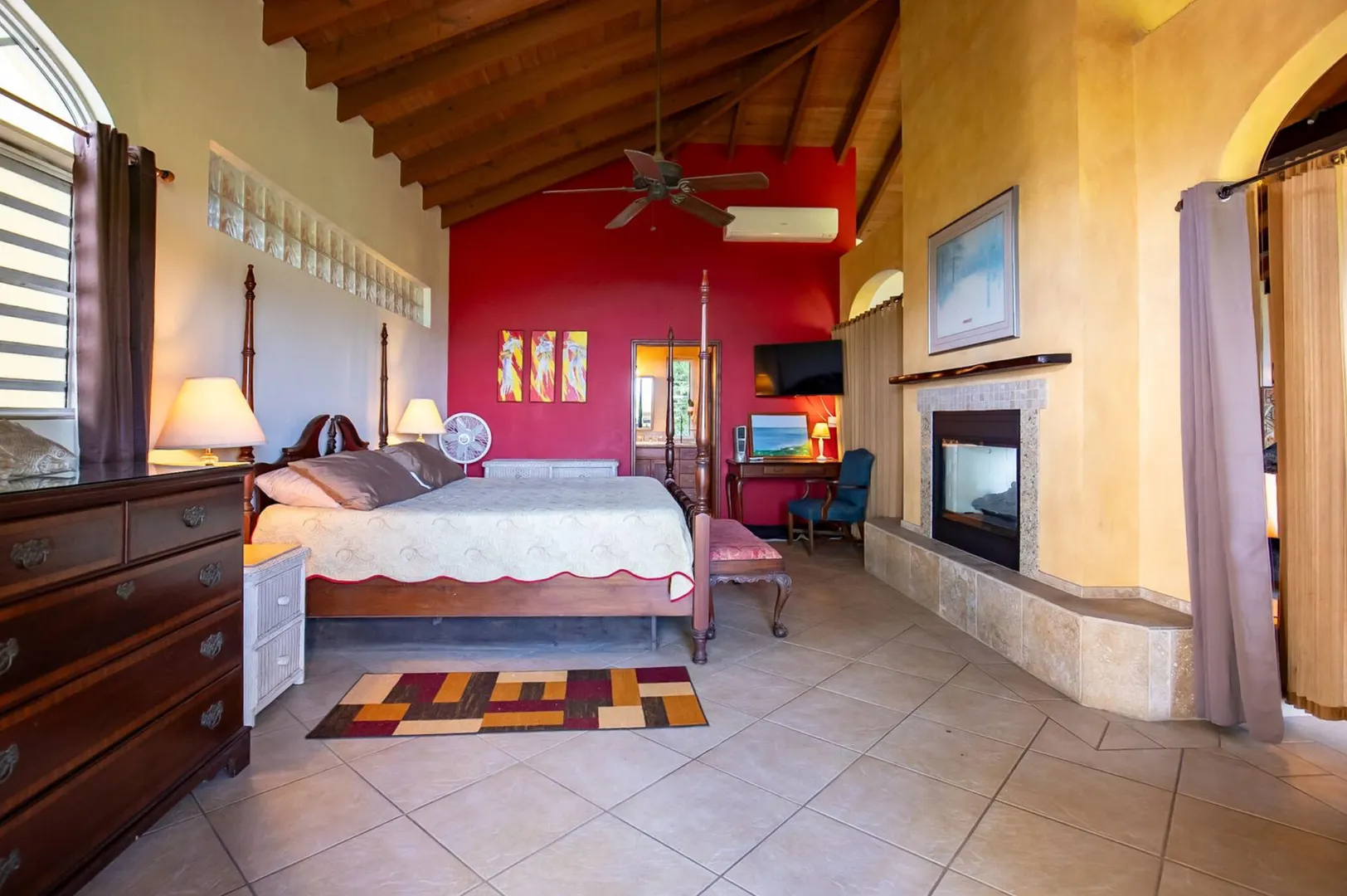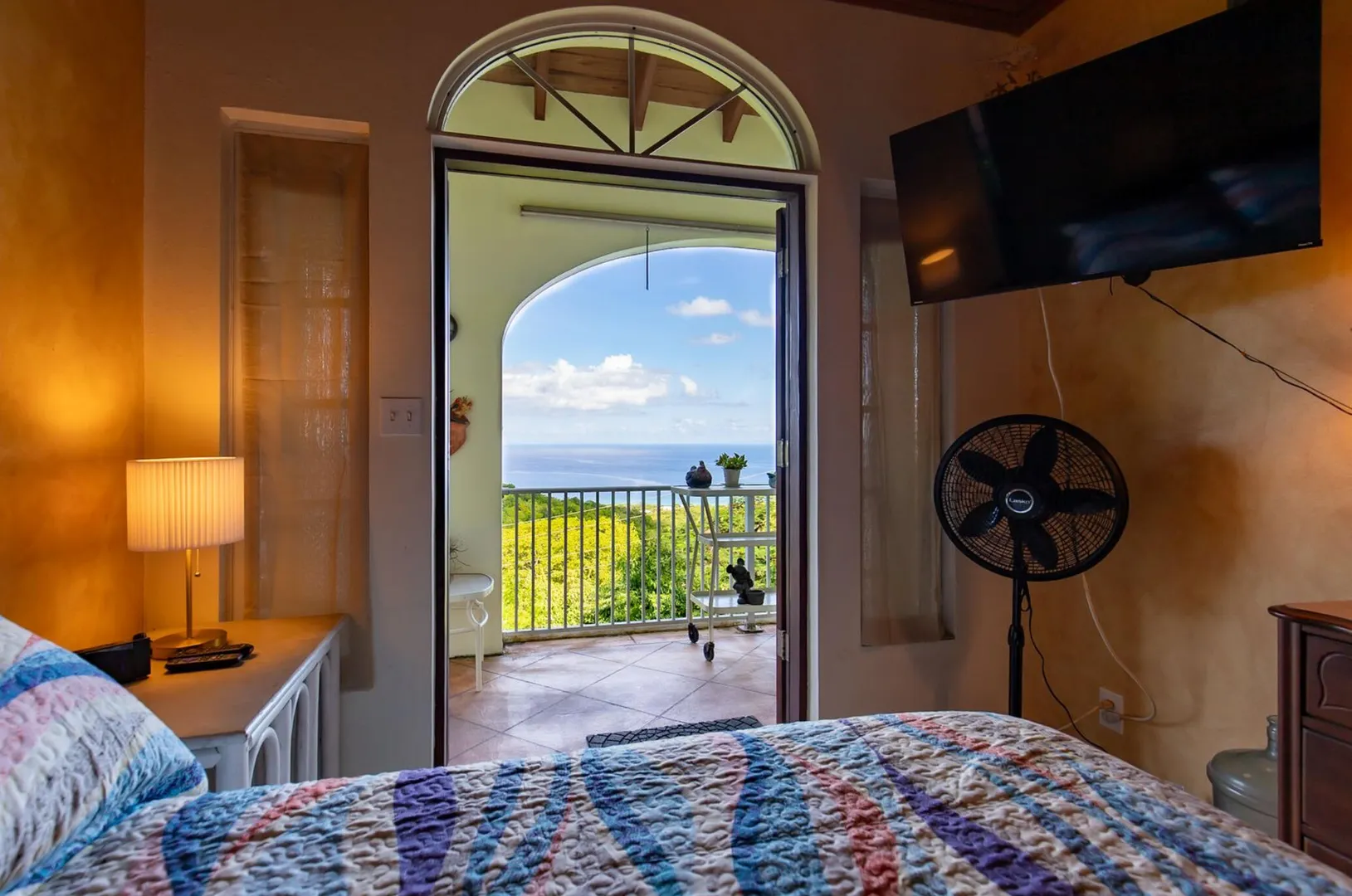 Experience island living at its finest in this poured-concrete 3-bedroom, 2-bathroom home featuring a spacious loft with striking cypress ceilings. The gourmet kitchen showcases Spanish Cedar custom cabinets by Mike Lustig, a mahogany bar, a new 36'' 5-burner gas range with convection, and a new dishwasher. Beautiful mahogany balusters add warmth and craftsmanship throughout. The main house is cooled by two large Mitsubishi split units, both under a 10-year warranty.The expansive 320 sq ft primary suite includes a walk-in closet, double vanity, double shower, skylight, custom tile work, and a luxurious 6-ft cast iron soaking tub. An outdoor shower adjacent to the main suite offers a secluded, spa-like experience.Enjoy seamless indoor-outdoor living with a wraparound deck and an observation deck overlooking the North Shore, offering panoramic views and cooling breezes. The 15x30 tiled saltwater pool features an auto chlorine generator, variable-speed pump, and a new Maytronics robot vacuum, surrounded by a stained concrete deck and an outdoor bar with sink and mini fridge, creating a private resort atmosphere.