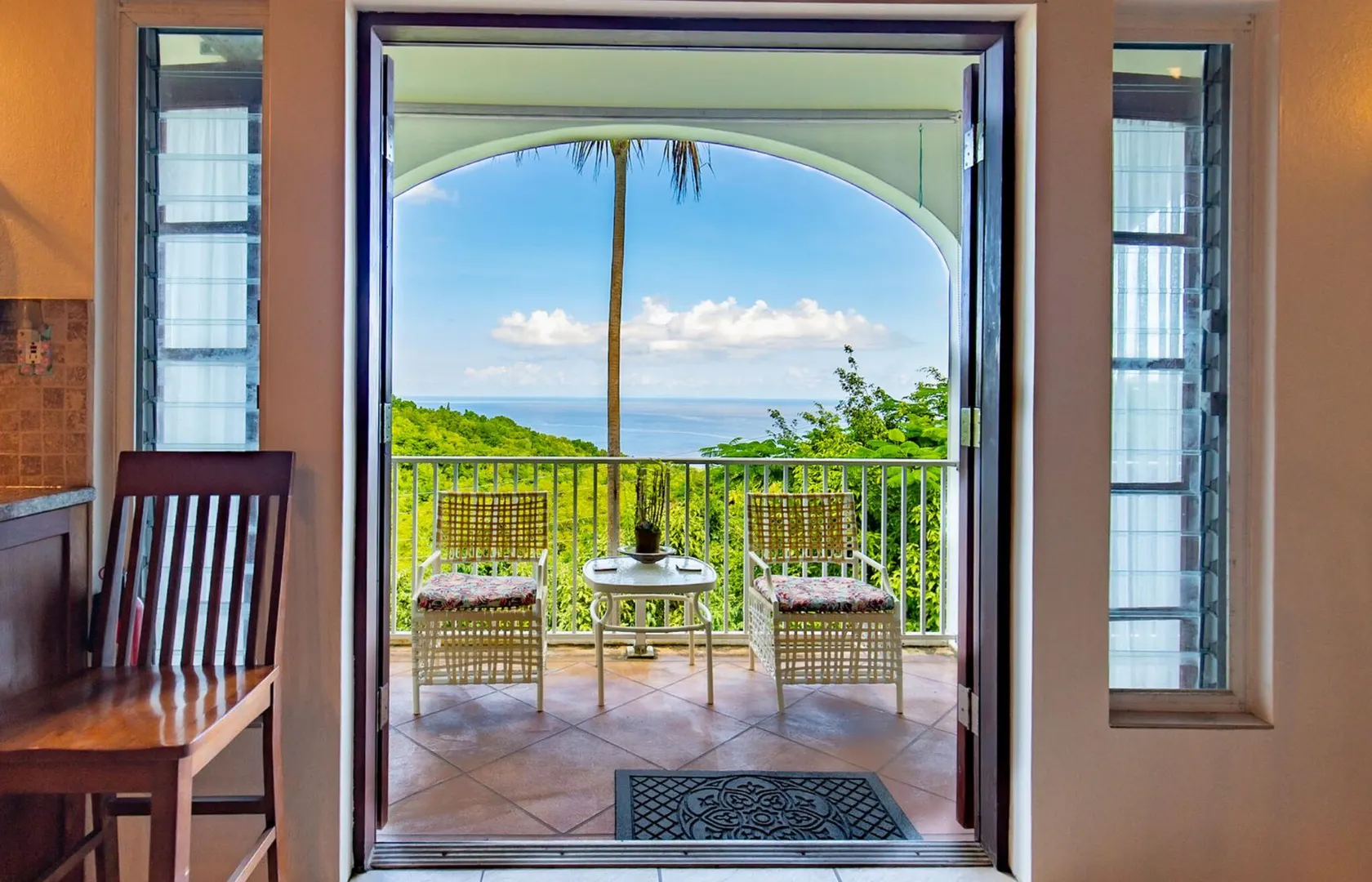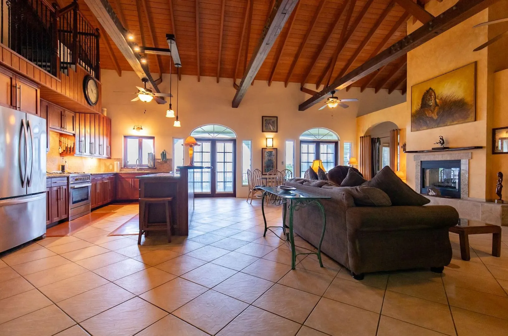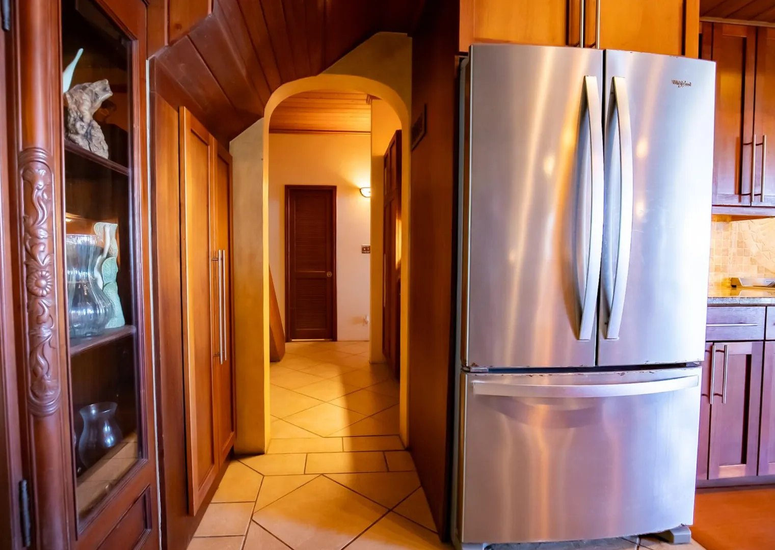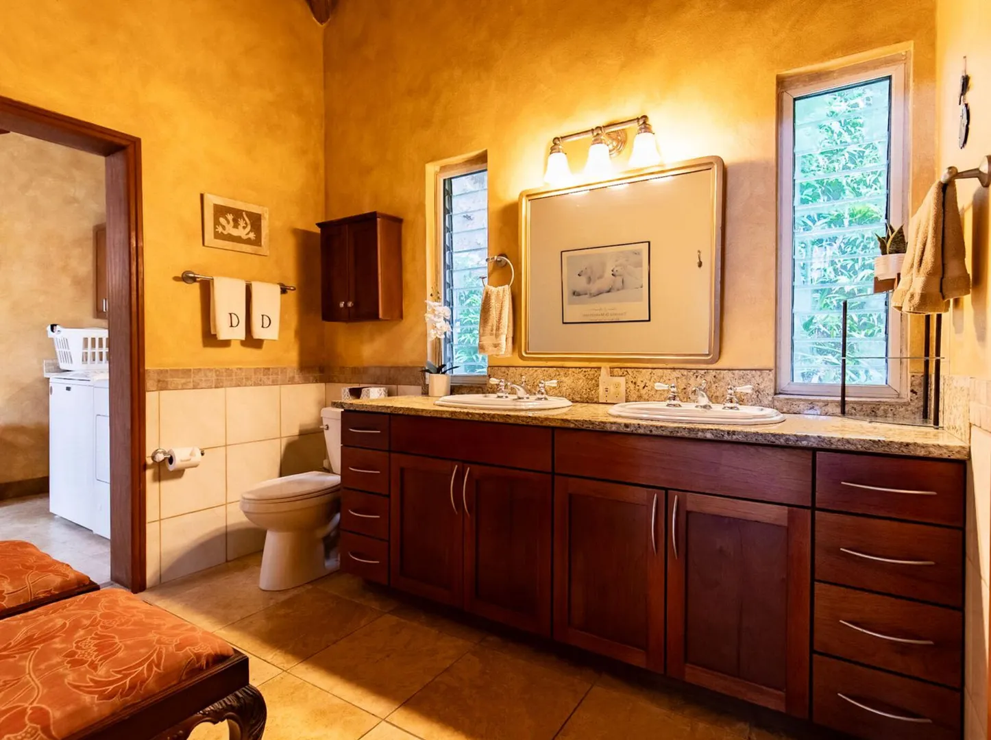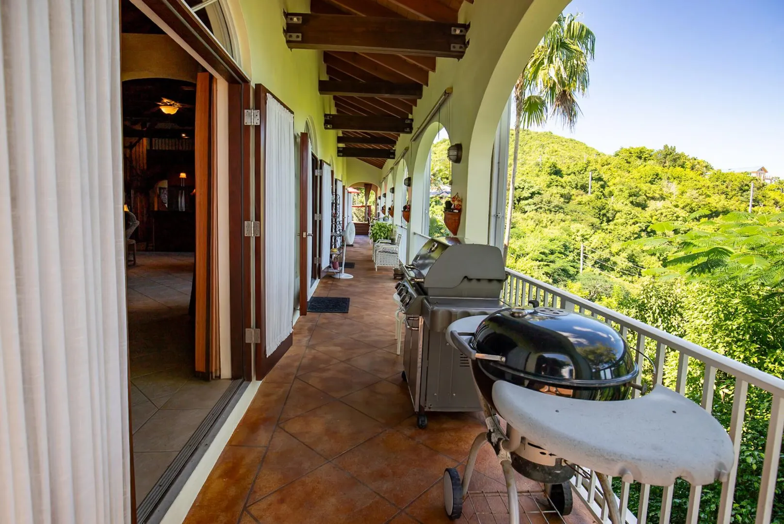 Experience island living at its finest in this poured-concrete 3-bedroom, 2-bathroom home featuring a spacious loft with striking cypress ceilings. The gourmet kitchen showcases Spanish Cedar custom cabinets by Mike Lustig, a mahogany bar, a new 36'' 5-burner gas range with convection, and a new dishwasher. Beautiful mahogany balusters add warmth and craftsmanship throughout. The main house is cooled by two large Mitsubishi split units, both under a 10-year warranty.The expansive 320 sq ft primary suite includes a walk-in closet, double vanity, double shower, skylight, custom tile work, and a luxurious 6-ft cast iron soaking tub. An outdoor shower adjacent to the main suite offers a secluded, spa-like experience.Enjoy seamless indoor-outdoor living with a wraparound deck and an observation deck overlooking the North Shore, offering panoramic views and cooling breezes. The 15x30 tiled saltwater pool features an auto chlorine generator, variable-speed pump, and a new Maytronics robot vacuum, surrounded by a stained concrete deck and an outdoor bar with sink and mini fridge, creating a private resort atmosphere.