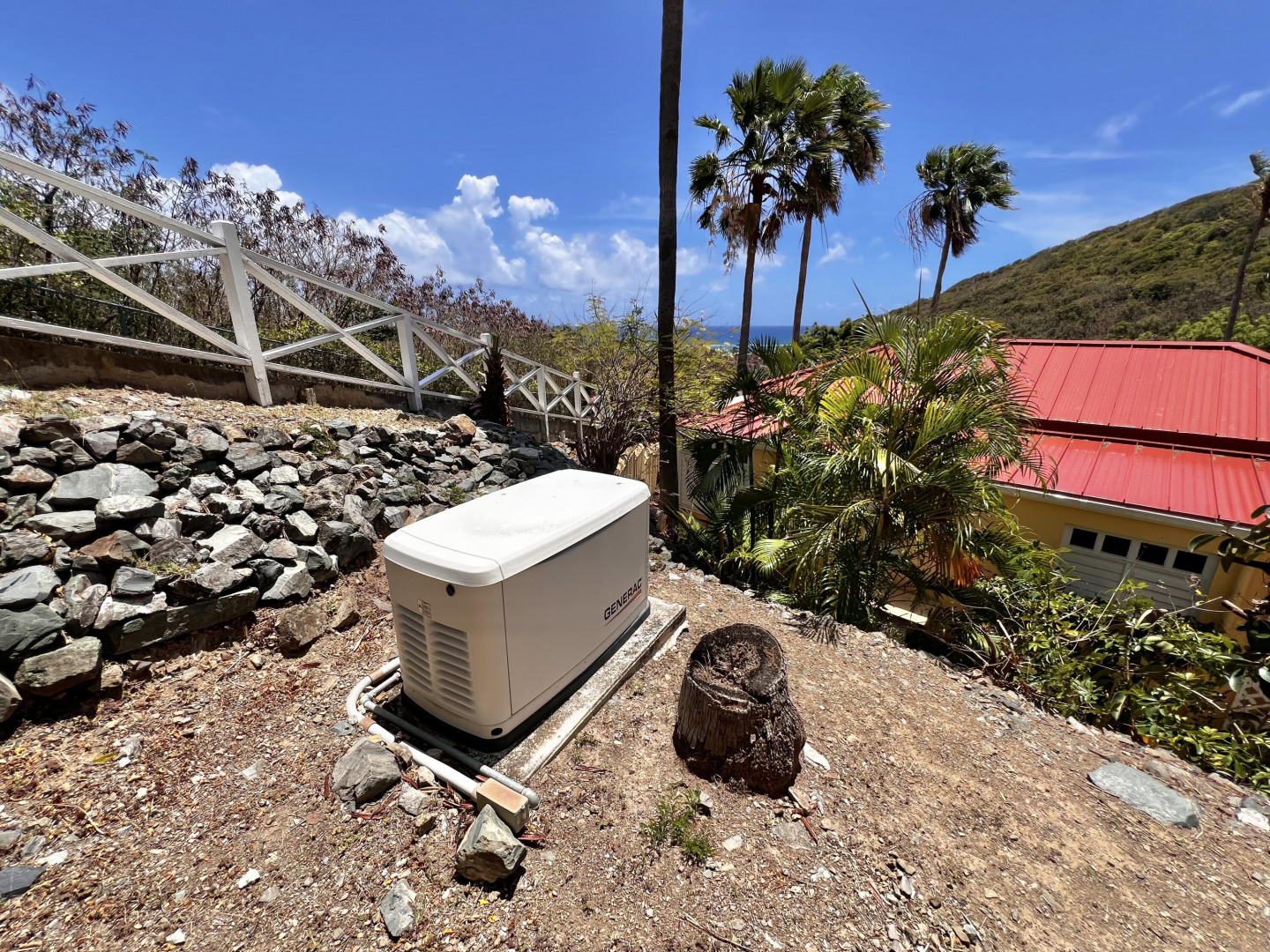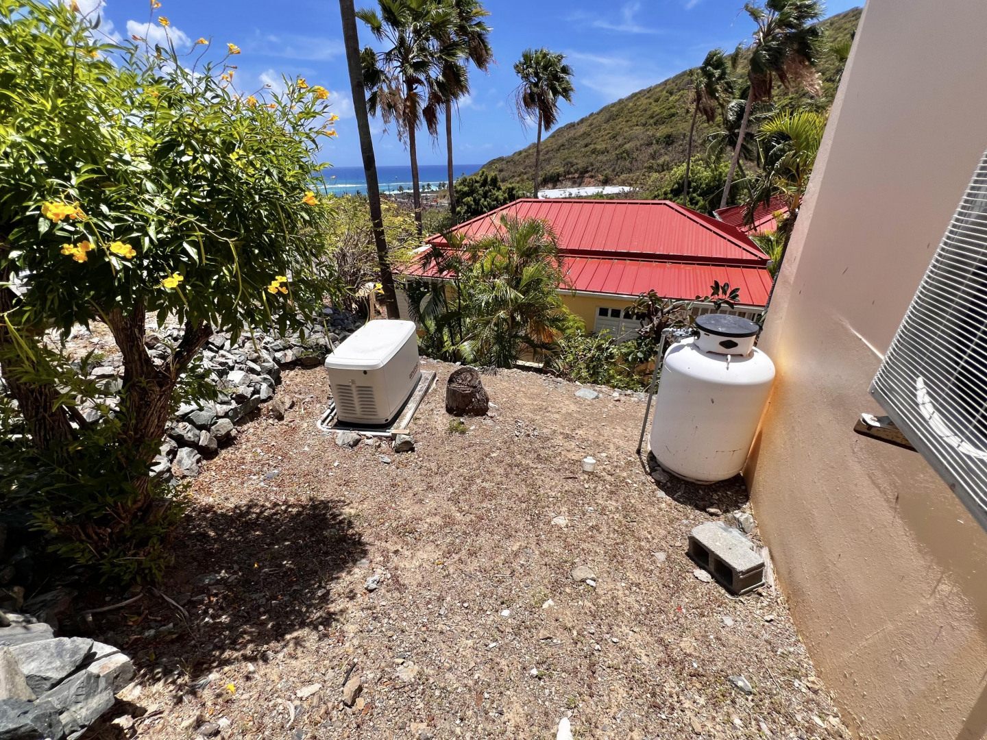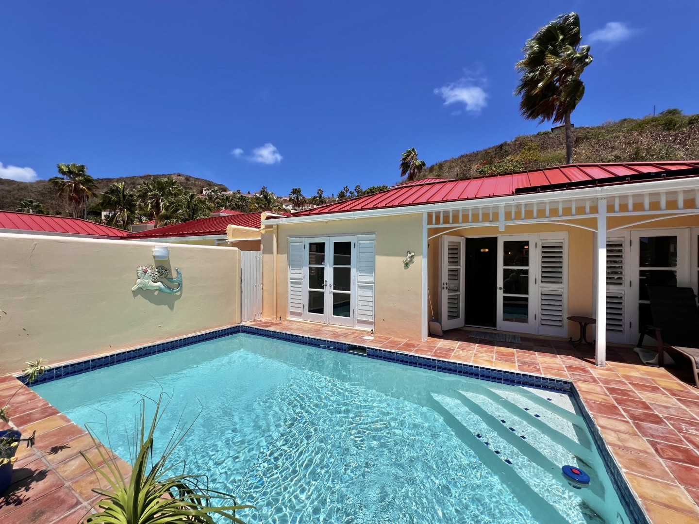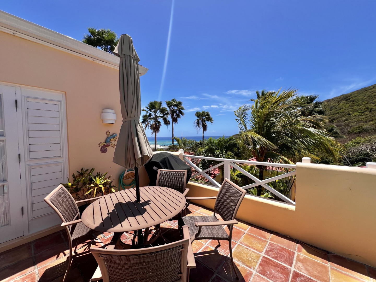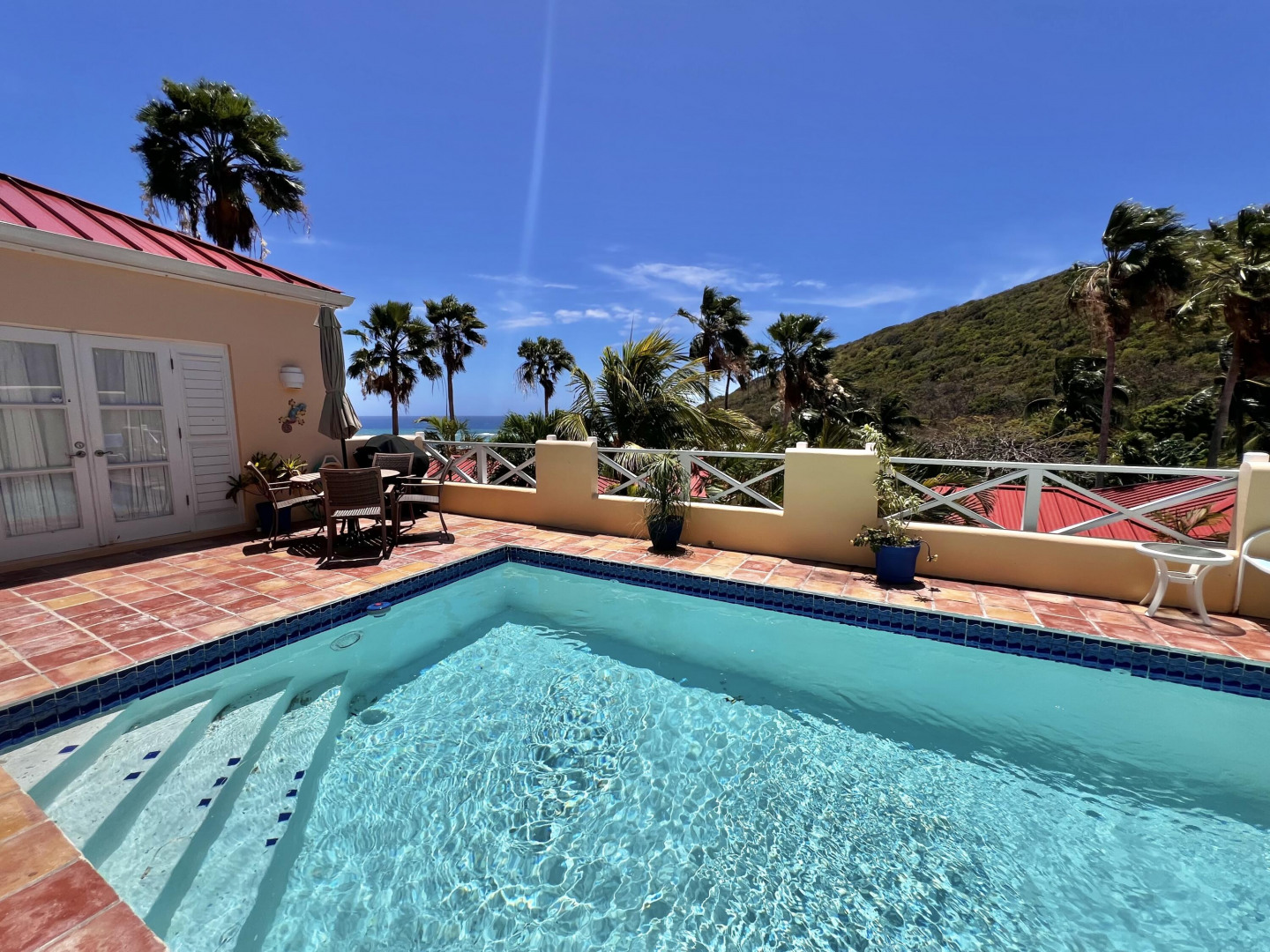 This premier end-unit villa with private pool & generator offers the ultimate in privacy, accessibility, and breathtaking scenery including Caribbean Sea views. With no stairs to navigate inside or out - this 2-BR, 2-Bath retreat is designed for effortless island living. Many thoughtful upgrades include an automatic 11KW Generac generator (only a few units in complex are allowed to have them), solar pool pump, new split AC units in each room, whole house PURA ABUV-8 ultraviolet light water filtration system, built in storage below pool deck, and upgrades to the kitchen including top quality countertops with rich blue tiles as the back splash, and new appliances. This location is ideal for anyone wanting privacy, and no one looking down on their pool, sea views from the pool deck and easywalking access to the tennis courts and the path to the Divi Resort, Casino and Beach. While many units have direct sunlight in the afternoon, making it too hot to enjoy the pool deck, this villa enjoys shade 4 PM on - the perfect time to sit outside to enjoy a cocktail and start up the grill.