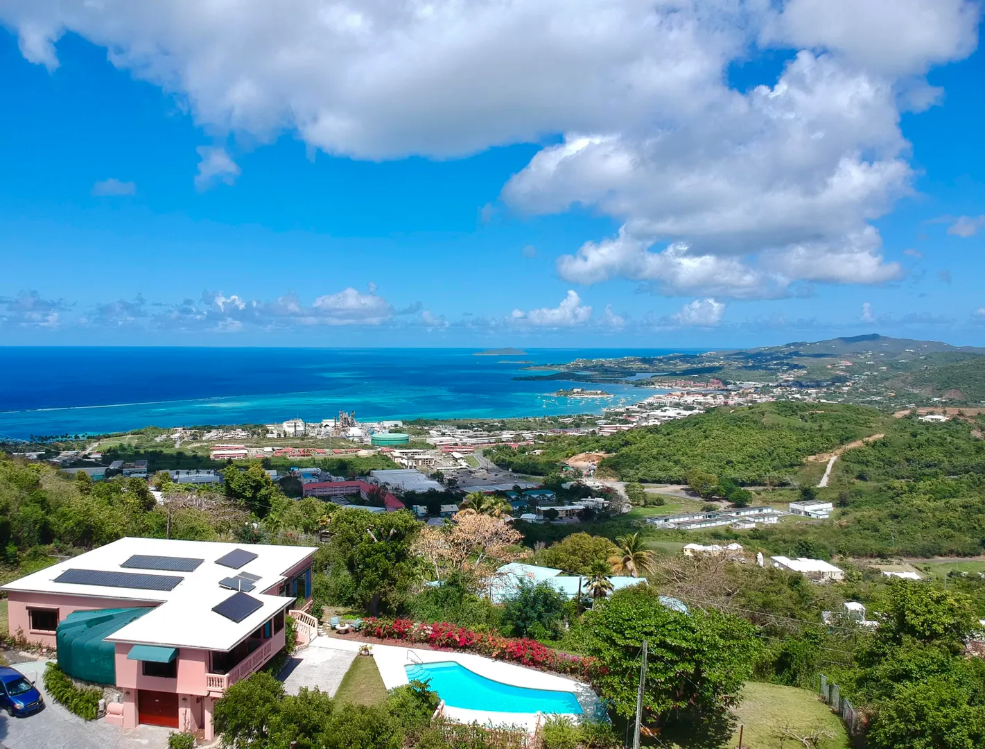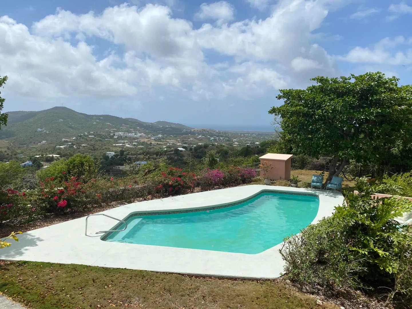 Elegant & Classy Stately home never before offered. Newly refurbished pool, perfect for swimming those early evening laps. Freshly painted pool apron all the better for the gathering of friends and family (when we are back doing that) or romantic interludes under the stars. Dual shore views from Christiansted harbor to south shore provide views for all times of the day or night. Separate air conditioned master bedroom ensuite with large bath with a Caribbean Sea view. Guest Bedrooms each have their own half bath wth a Jack 'n Jill shared walk-in ceramic tiled shower. Net metering means no electric (WAPA) bills, only credits. Quality finishes throughout, mahogany doors and windows, marble and ceramic tile floors, hurricane shutters all round plus some new impact glass.Custom made office with space saving features with mahogany bar built by local craftsman, Mark Mandon. Screened back porch perfect for your special plants, herbs and orchids. So many recent upgrades: March 2020 Exterior Completely Repainted January 2020 New 3.8kw Net Metering with 13 solar panels with battery invertor system AT&T booster system and router on solar along with water pump, refrigerator, fans, kitchen lights & outlets and about 75% of all electric. Solar Hot Water System 2019 New Refrigerator 2019 Six New Roll Down Shutters Installed 2019 Septic Tank pumped (rarely necessary, last time was 30 years ago) Fall 2018 Cisterns cleaned, repaired and re-coated Fall 2018 Pool totally redone by Aqua Tek. re-coated, new drain installed to meet code, new pool pump, new surface, new water line ceramic tile Extra built Roof and Ceilings, Cypress Tongue and Groove Ceilings under 1.5" thick treated plywood. Roof re-coated about 3 years ago. Rare One Car Garage Owner Financing May be Considered Some Furniture excluded and all personal items to be excluded. Inventory to be provided