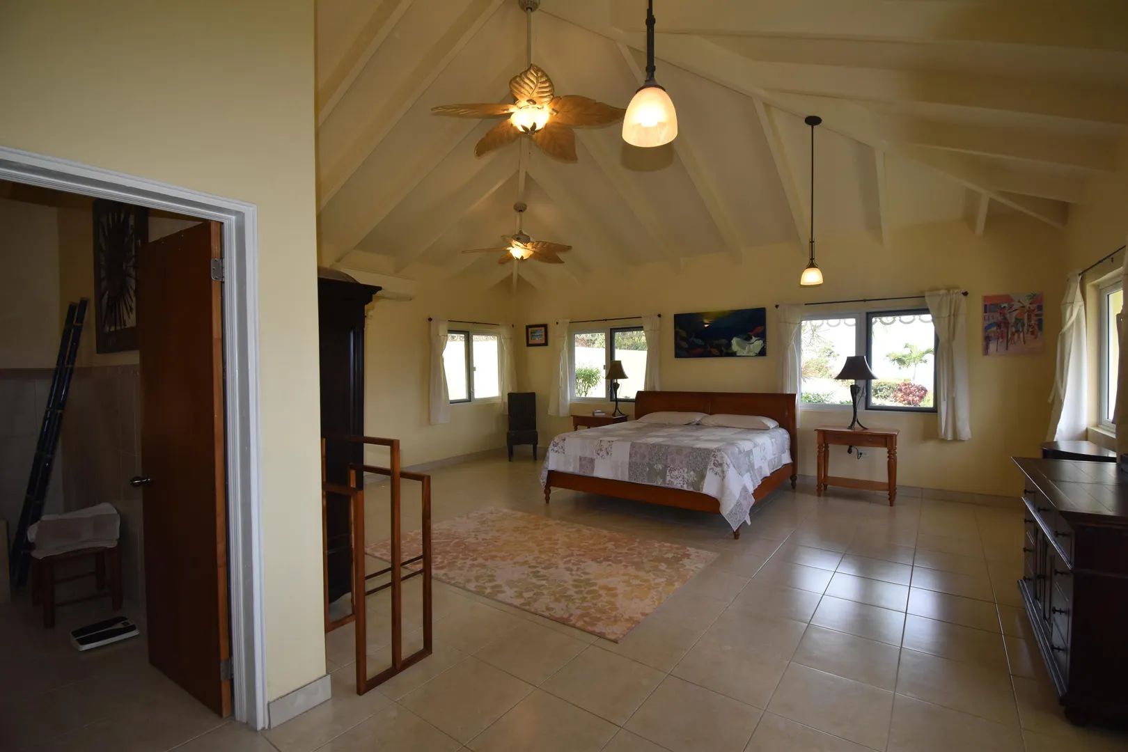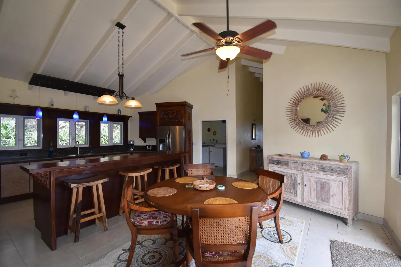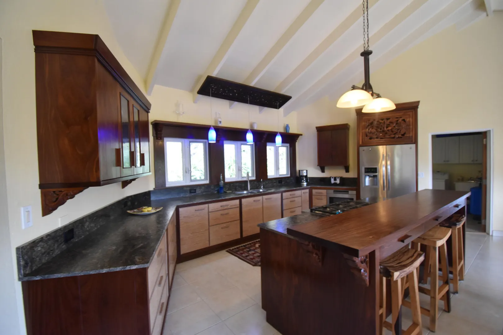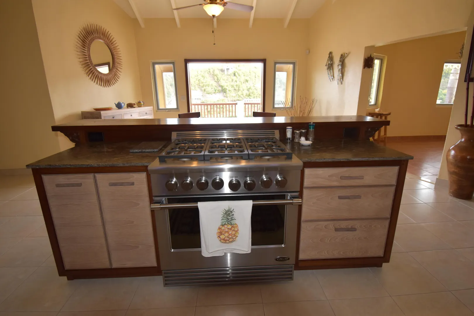New SOLAR! Exquisite interior design with fabulous custom kitchen and gorgeous views make this home one of a kind. Every detail in this home has been addressed with high quality fixtures and workmanship. Custom mahogany doors open to the tasteful cut coral deck overlooking a beautiful valley and a West facing sea view with unbelievable sunsets. The kitchen is a work of art with custom teak cabinets and mahogany island handmade by a famed local artist, decorative wood carvings from Indonesia, leather-finish granite counters, professional-grade gas range, in-drawer microwave, and large stainless steel French door refrigerator. The fabulous master suite boasts a spacious bedroom overlooking the sea, a large bath with glassed shower, Jacuzzi tub and double vessel vanity, and 2 walk-in closetClosets are maximized with John Louis Home shelving. Vaulted ceilings throughout add an open spacious feeling. To the East of the kitchen is a formal dining room, currently used as a den, but would also make a wonderful Study. Beyond that is a large living room. At the far East end of the house are two bedrooms separated by a beautiful full bath with a very large glassed shower. Off the kitchen is a large laundry/utility room with a rear entry door, and pump and pressure tank for the two Cisterns totaling approximately 15,000 gallons. Cisterns were recoated this year. Additional details include: Windows are hurricane-rated glass protected by beautiful custom made awnings that convert into storm shutters. The mahogany deck entrance doors and the windows on each side are protected by metal storm shutters. Deck is 40 X 12 cut coral stone, surrounded by low maintenance composite railing. Sidewalks are cut coral stone. Nicely landscaped with many palms and fruit trees including mango, carambola, avocado, banana, and coconut. Retaining walls, Solar hot water, 3 Split A/C Units, 8 Ceiling Fans, Washer, Dryer, Alarm system, Internet, Dish/Cable TV, Off-street parking, Entrance Gate. Construction: Concrete, Concrete Block, ICF Block, Wood. Galvanized roof and gutters less than 5 years old covers entire house. Cummins 13K generator is auto start with a 250-gallon propane tank. Kitchen Appliances: DCS Professional 36 inch 6-burner gas range, Sharp Drawer Microwave, Kenmore refrigerator. Flooring: Ceramic Tile, Sewer: Septic On a clear day, you can see Puerto Rico and Vieques! Close to beautiful west end beaches including Sandy Point and many dive sites. Too many details to list. You must see this property to appreciate it!
