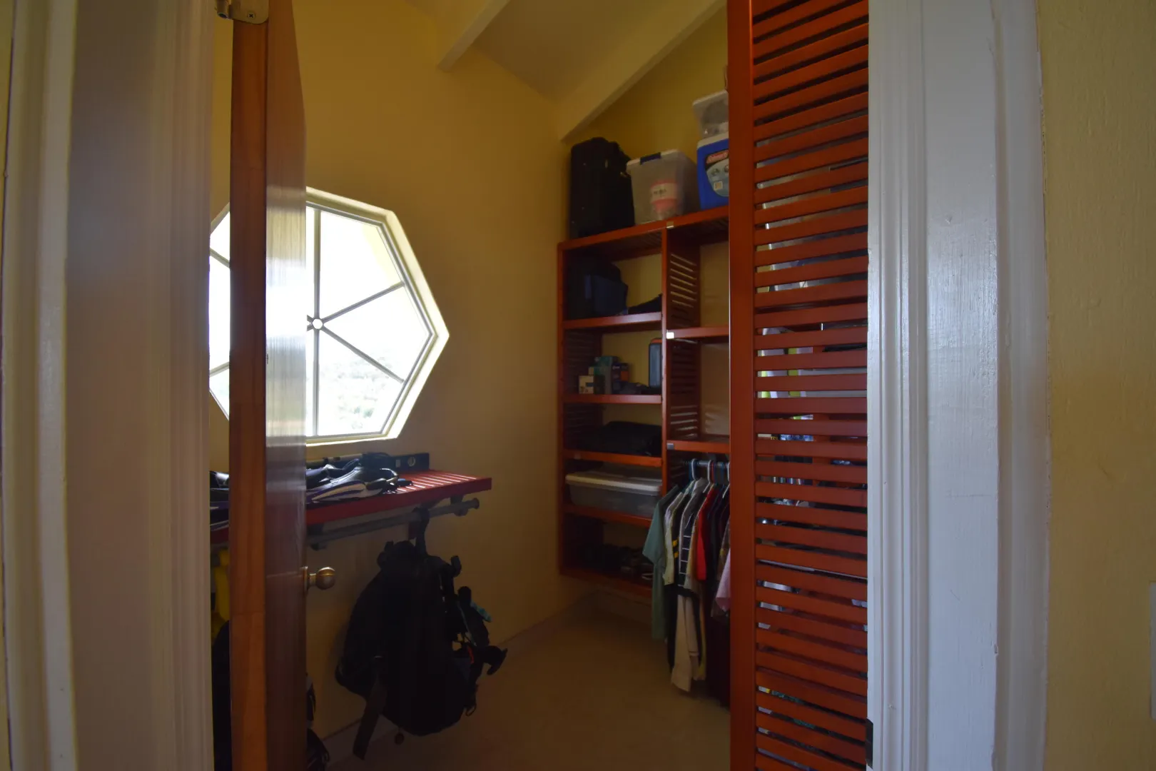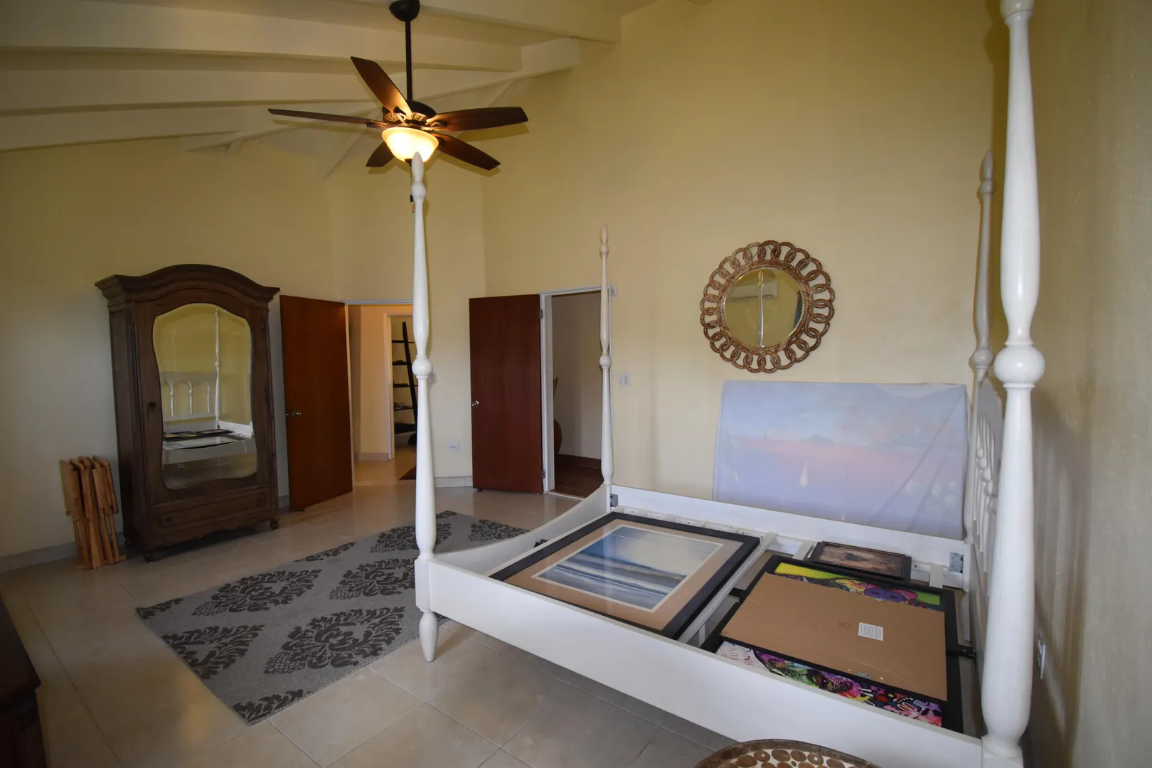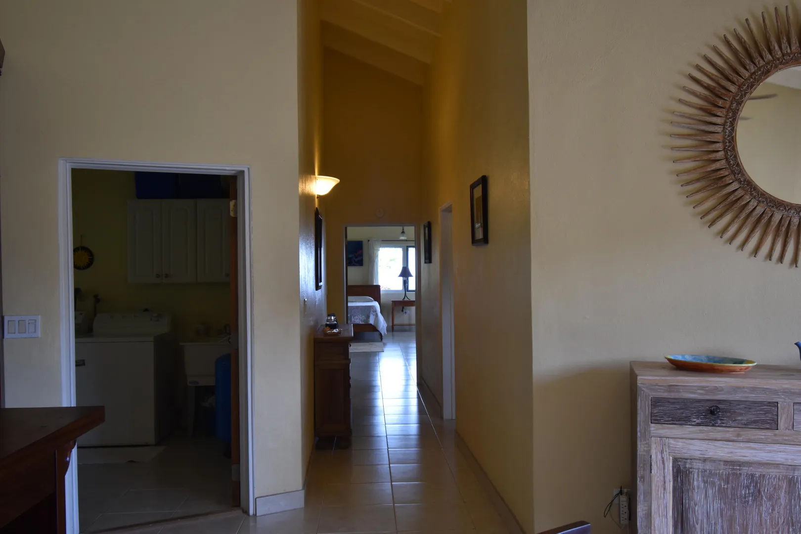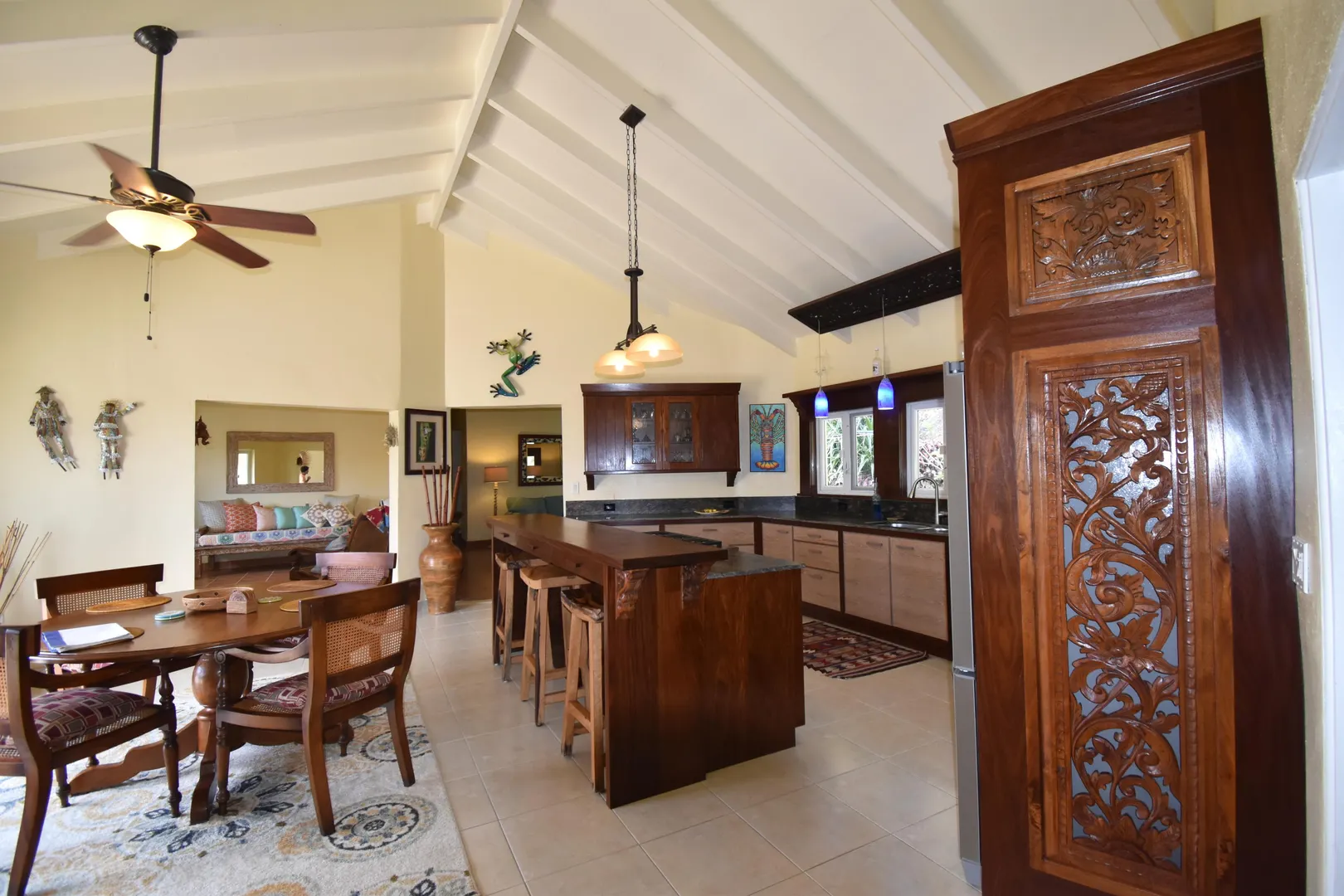 New SOLAR! Exquisite interior design with fabulous custom kitchen and gorgeous views make this home one of a kind. Every detail in this home has been addressed with high quality fixtures and workmanship. Custom mahogany doors open to the tasteful cut coral deck overlooking a beautiful valley and a West facing sea view with unbelievable sunsets. The kitchen is a work of art with custom teak cabinets and mahogany island handmade by a famed local artist, decorative wood carvings from Indonesia, leather-finish granite counters, professional-grade gas range, in-drawer microwave, and large stainless steel French door refrigerator. The fabulous master suite boasts a spacious bedroom overlooking the sea, a large bath with glassed shower, Jacuzzi tub and double vessel vanity, and 2 walk-in closetClosets are maximized with John Louis Home shelving. Vaulted ceilings throughout add an open spacious feeling. To the East of the kitchen is a formal dining room, currently used as a den, but would also make a wonderful Study. Beyond that is a large living room. At the far East end of the house are two bedrooms separated by a beautiful full bath with a very large glassed shower. Off the kitchen is a large laundry/utility room with a rear entry door, and pump and pressure tank for the two Cisterns totaling approximately 15,000 gallons. Cisterns were recoated this year. Additional details include: Windows are hurricane-rated glass protected by beautiful custom made awnings that convert into storm shutters. The mahogany deck entrance doors and the windows on each side are protected by metal storm shutters. Deck is 40 X 12 cut coral stone, surrounded by low maintenance composite railing. Sidewalks are cut coral stone. Nicely landscaped with many palms and fruit trees including mango, carambola, avocado, banana, and coconut. Retaining walls, Solar hot water, 3 Split A/C Units, 8 Ceiling Fans, Washer, Dryer, Alarm system, Internet, Dish/Cable TV, Off-street parking, Entrance Gate. Construction: Concrete, Concrete Block, ICF Block, Wood. Galvanized roof and gutters less than 5 years old covers entire house. Cummins 13K generator is auto start with a 250-gallon propane tank. Kitchen Appliances: DCS Professional 36 inch 6-burner gas range, Sharp Drawer Microwave, Kenmore refrigerator. Flooring: Ceramic Tile, Sewer: Septic On a clear day, you can see Puerto Rico and Vieques! Close to beautiful west end beaches including Sandy Point and many dive sites. Too many details to list. You must see this property to appreciate it!