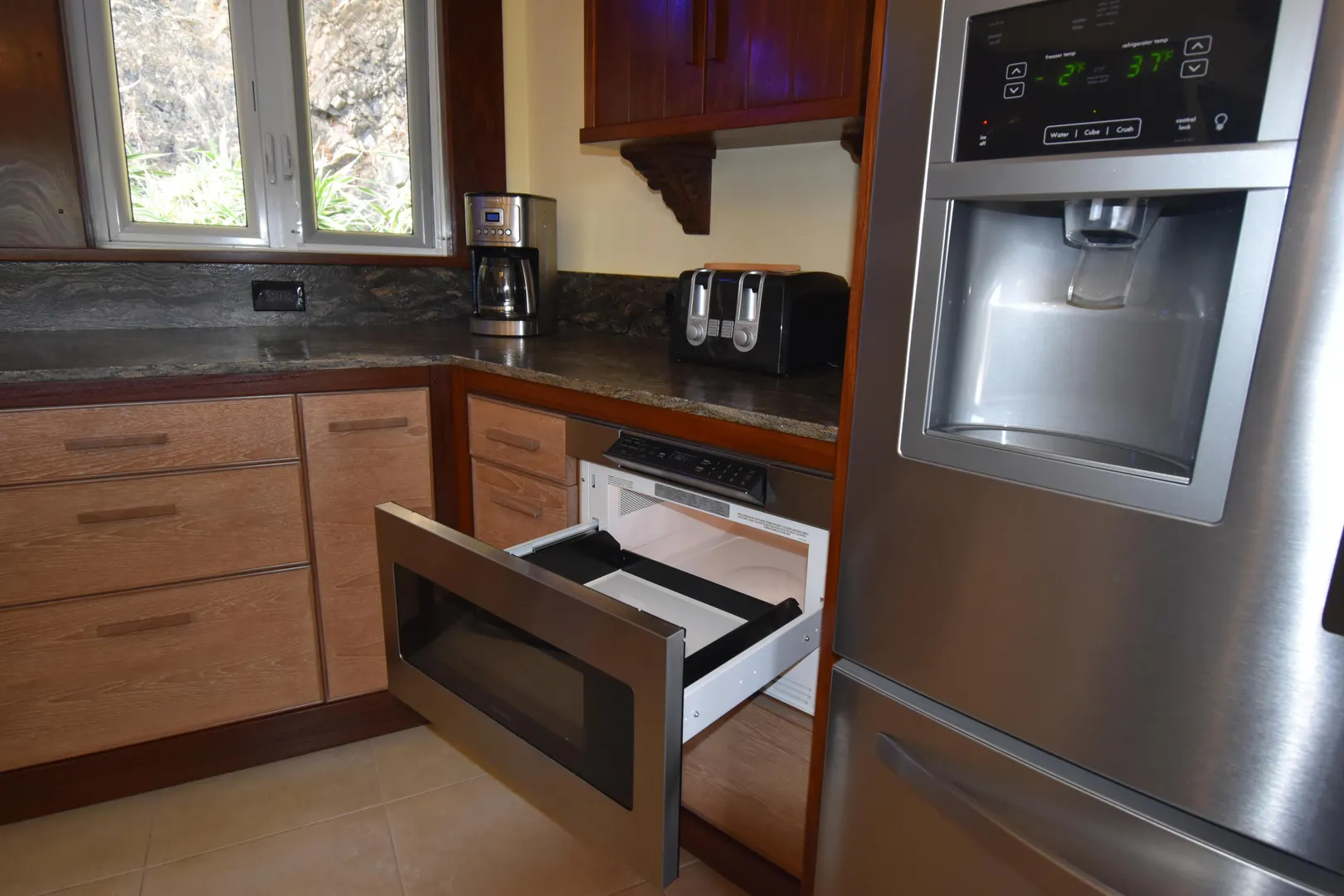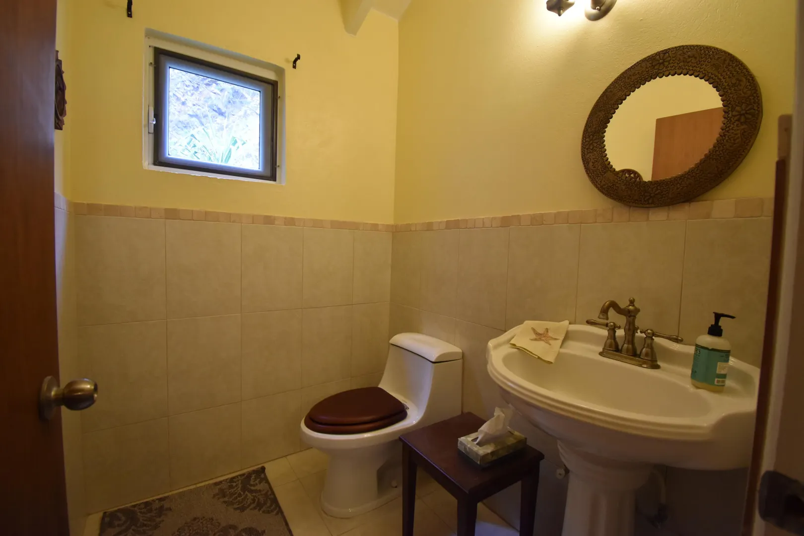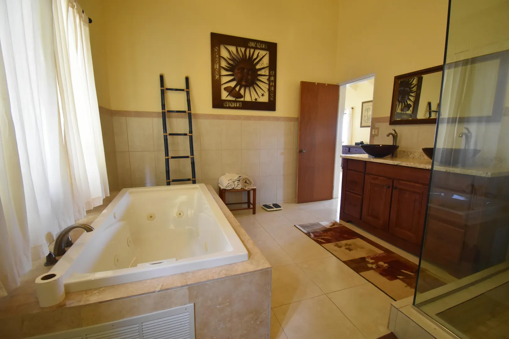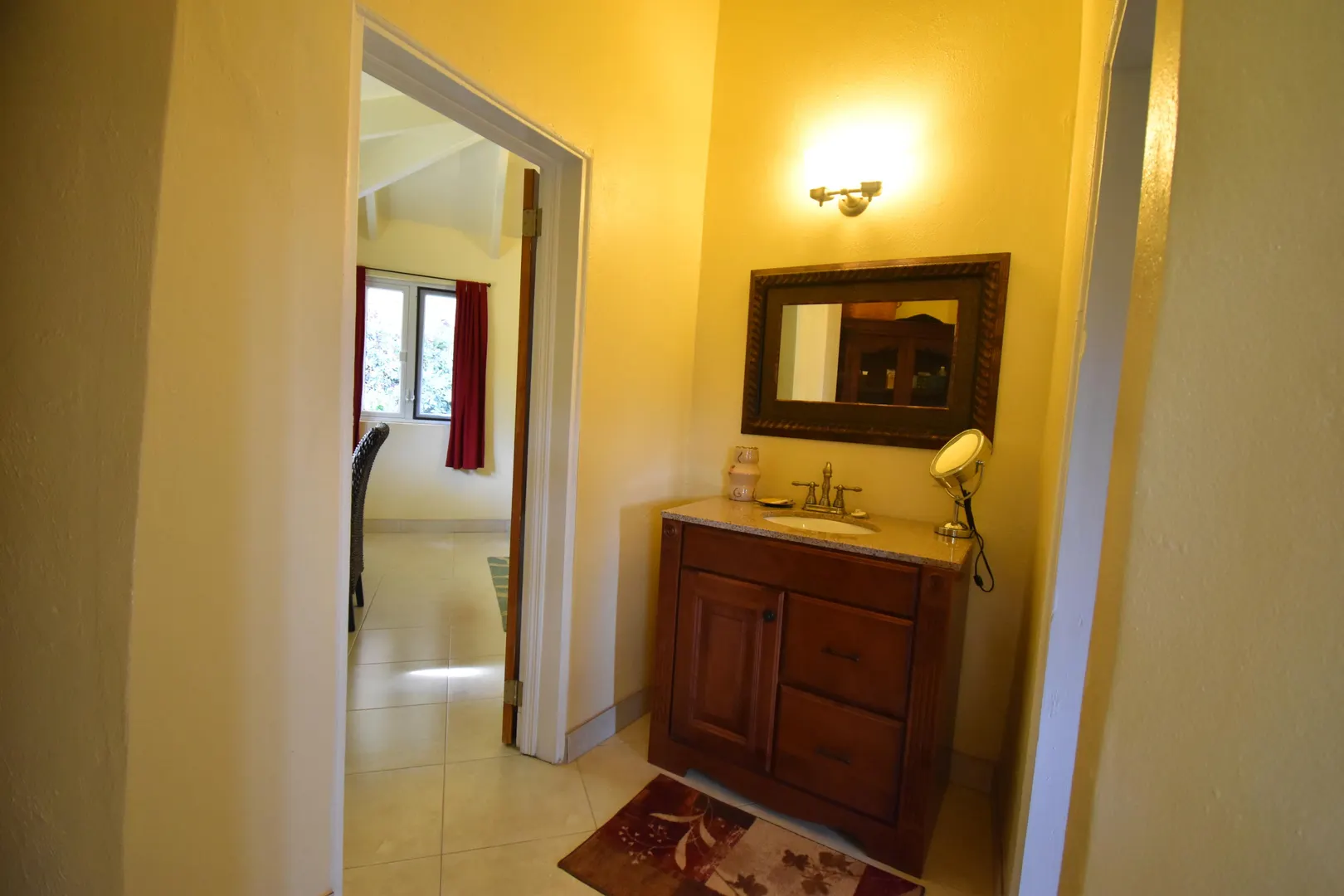 New SOLAR! Exquisite interior design with fabulous custom kitchen and gorgeous views make this home one of a kind. Every detail in this home has been addressed with high quality fixtures and workmanship. Custom mahogany doors open to the tasteful cut coral deck overlooking a beautiful valley and a West facing sea view with unbelievable sunsets. The kitchen is a work of art with custom teak cabinets and mahogany island handmade by a famed local artist, decorative wood carvings from Indonesia, leather-finish granite counters, professional-grade gas range, in-drawer microwave, and large stainless steel French door refrigerator. The fabulous master suite boasts a spacious bedroom overlooking the sea, a large bath with glassed shower, Jacuzzi tub and double vessel vanity, and 2 walk-in closetClosets are maximized with John Louis Home shelving. Vaulted ceilings throughout add an open spacious feeling. To the East of the kitchen is a formal dining room, currently used as a den, but would also make a wonderful Study. Beyond that is a large living room. At the far East end of the house are two bedrooms separated by a beautiful full bath with a very large glassed shower. Off the kitchen is a large laundry/utility room with a rear entry door, and pump and pressure tank for the two Cisterns totaling approximately 15,000 gallons. Cisterns were recoated this year. Additional details include: Windows are hurricane-rated glass protected by beautiful custom made awnings that convert into storm shutters. The mahogany deck entrance doors and the windows on each side are protected by metal storm shutters. Deck is 40 X 12 cut coral stone, surrounded by low maintenance composite railing. Sidewalks are cut coral stone. Nicely landscaped with many palms and fruit trees including mango, carambola, avocado, banana, and coconut. Retaining walls, Solar hot water, 3 Split A/C Units, 8 Ceiling Fans, Washer, Dryer, Alarm system, Internet, Dish/Cable TV, Off-street parking, Entrance Gate. Construction: Concrete, Concrete Block, ICF Block, Wood. Galvanized roof and gutters less than 5 years old covers entire house. Cummins 13K generator is auto start with a 250-gallon propane tank. Kitchen Appliances: DCS Professional 36 inch 6-burner gas range, Sharp Drawer Microwave, Kenmore refrigerator. Flooring: Ceramic Tile, Sewer: Septic On a clear day, you can see Puerto Rico and Vieques! Close to beautiful west end beaches including Sandy Point and many dive sites. Too many details to list. You must see this property to appreciate it!
