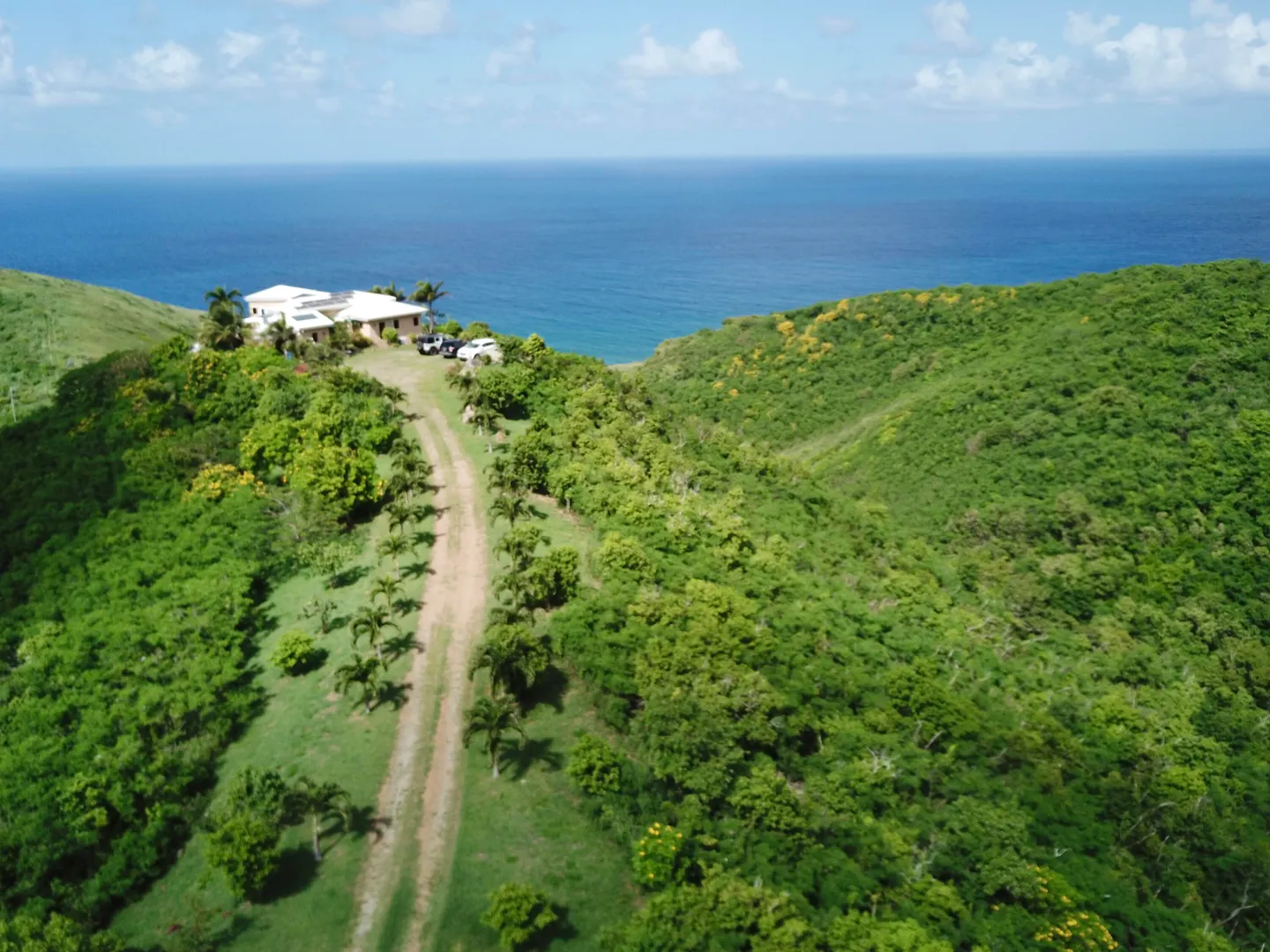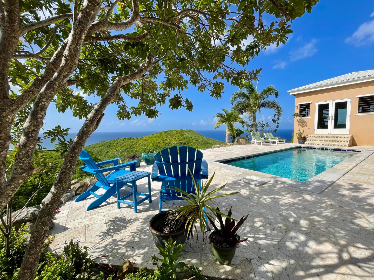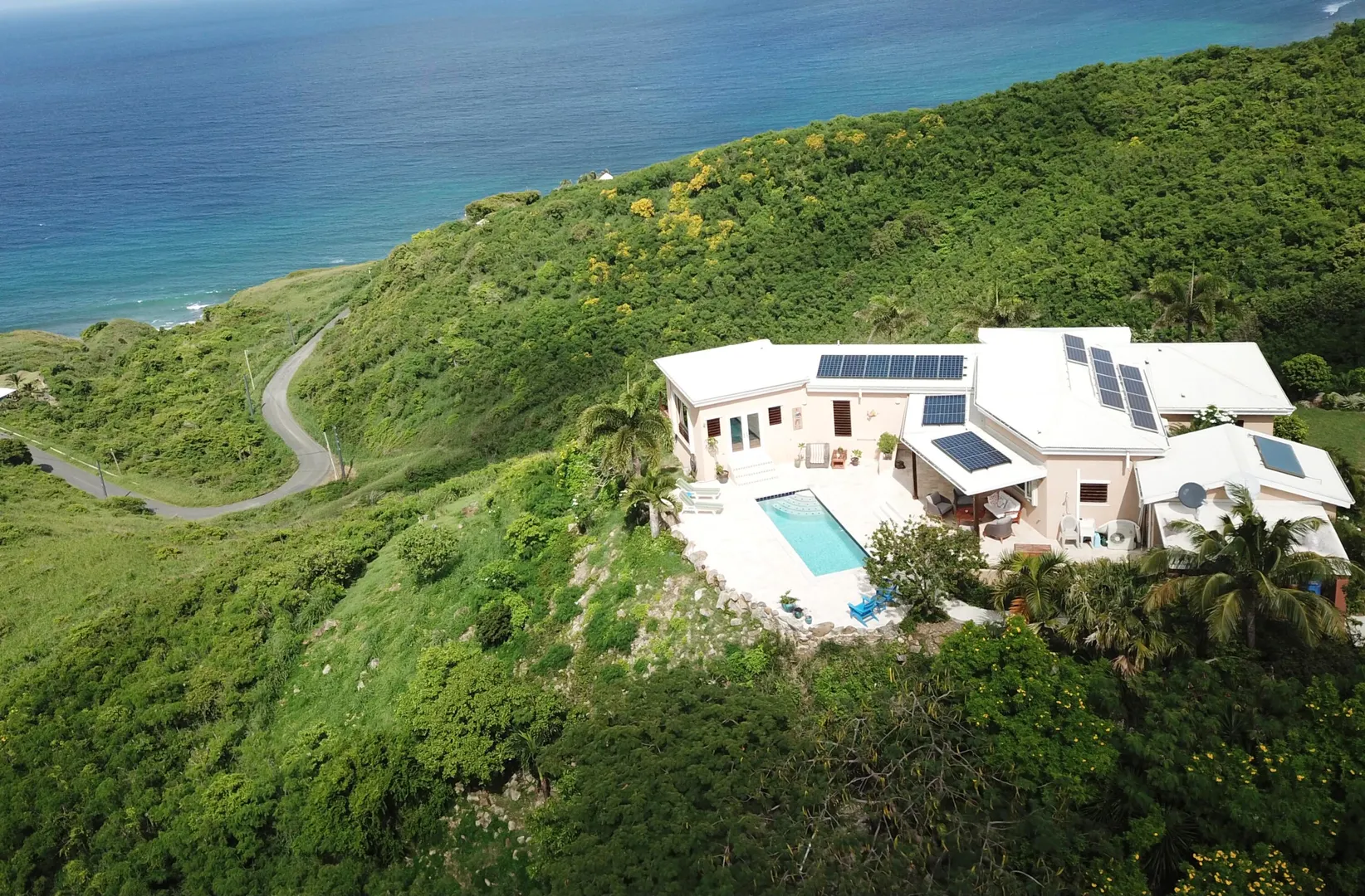 Nestled on over 4 hilltop acres, this North shore Island estate offers spectacular bird's-eye views of the Caribbean Sea and green rolling hills. The property boasts solar panels with batteries and net metering, a custom Mahogany chefs kitchen w/ granite countertops, custom 500 bottle wine room, open living space and large picture windows to enhance those north shore views. The gorgeous pool is surrounded tropical landscaping and an expansive travertine tile deck. The house features 3 bedrooms, 2.5 baths, all with lots of natural light, amazing views and direct access to pool from Master suite. All French doors have impact glass. This beautiful home is the perfect place to relax or entertain while enjoying the panoramic views. On a clear day you'll see St. Thomas, St. John and the BVI's