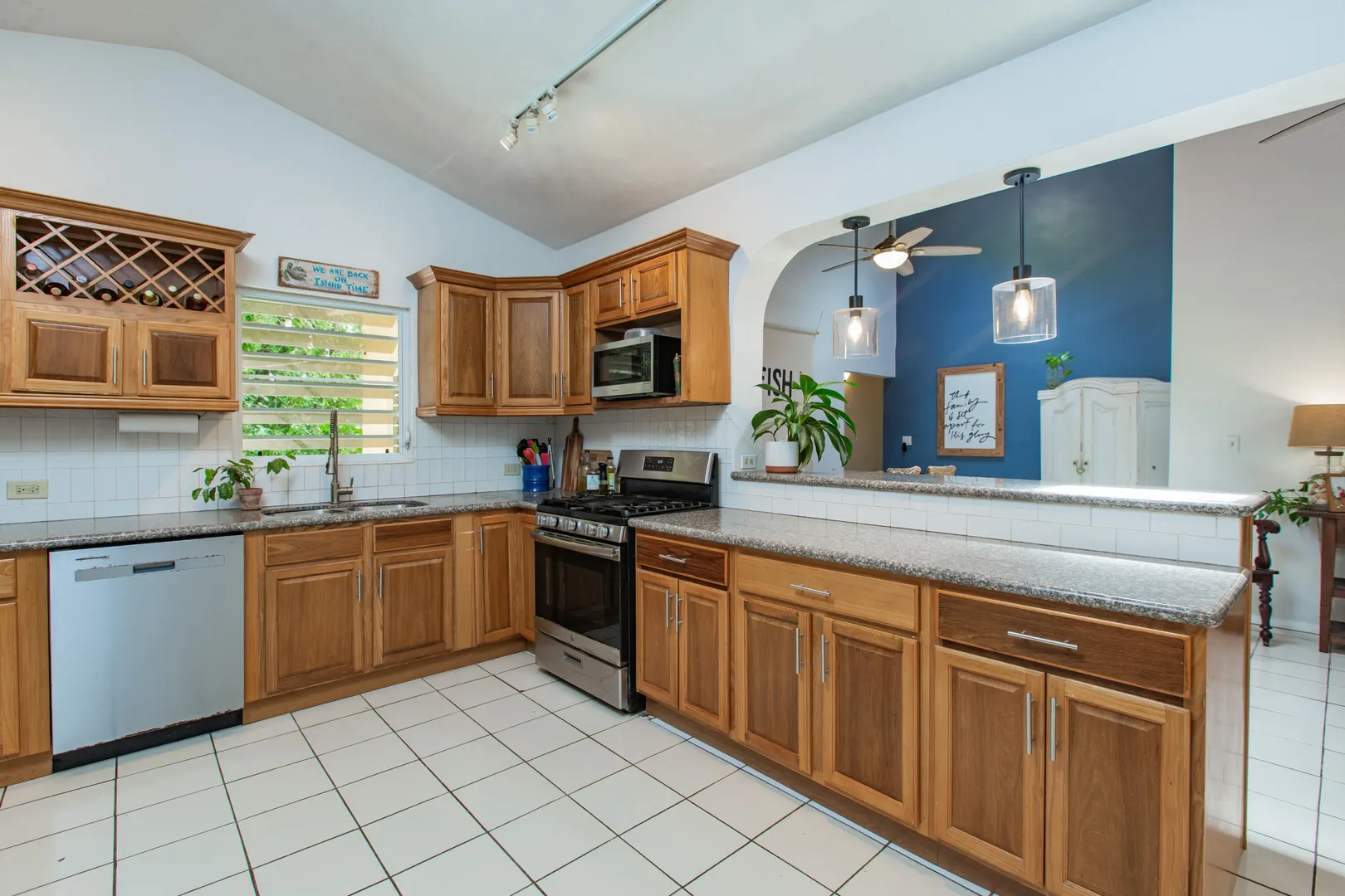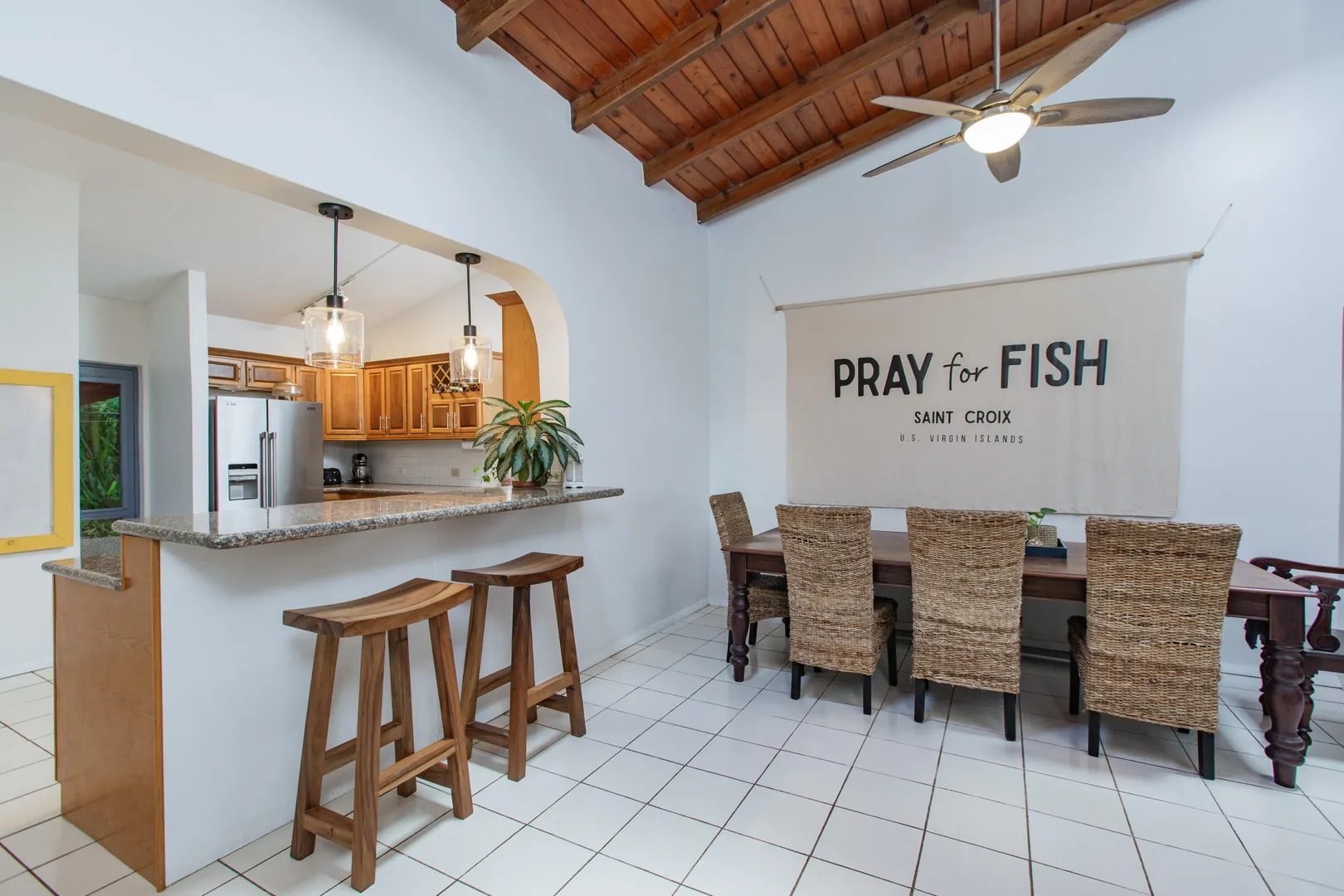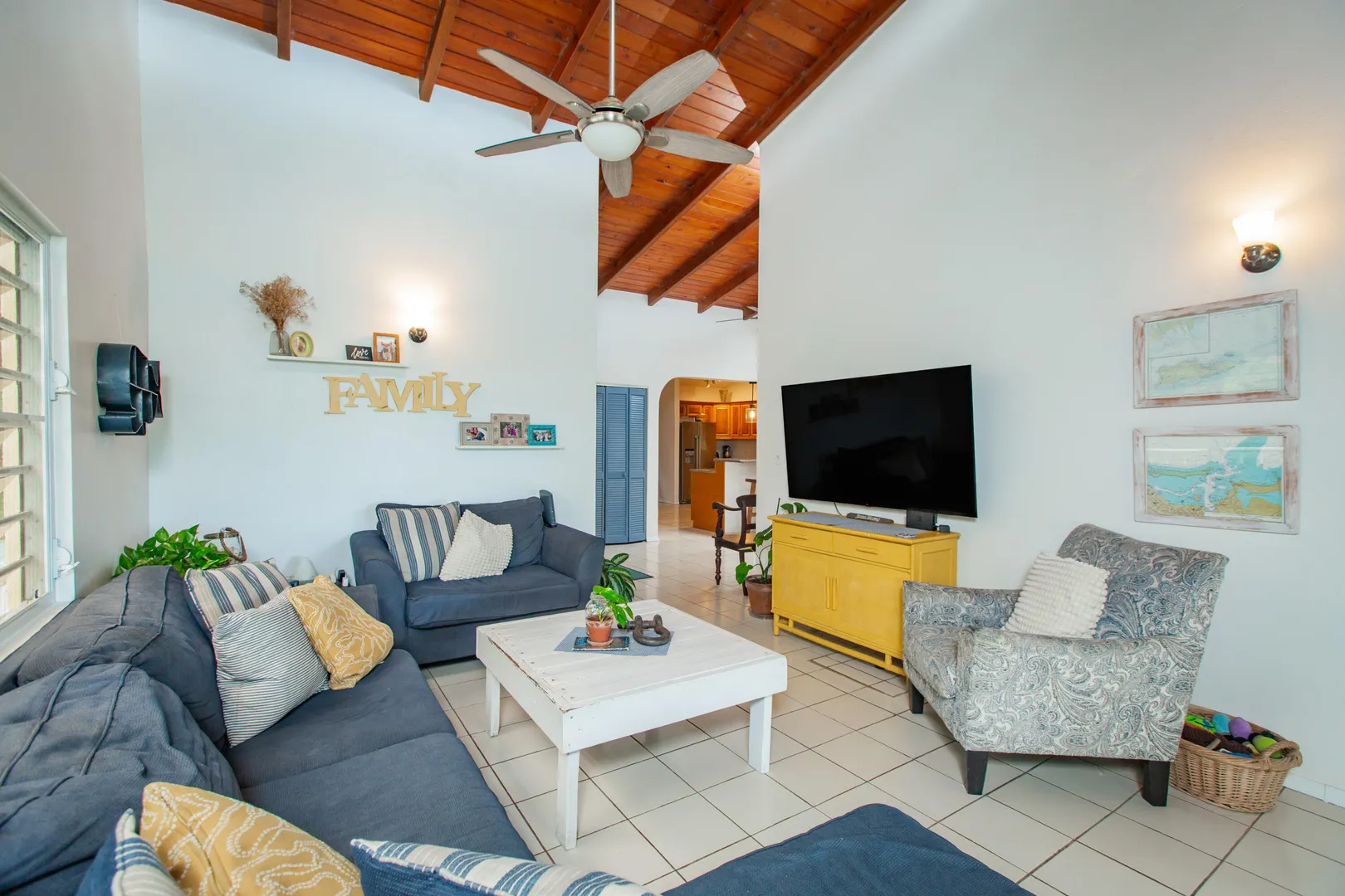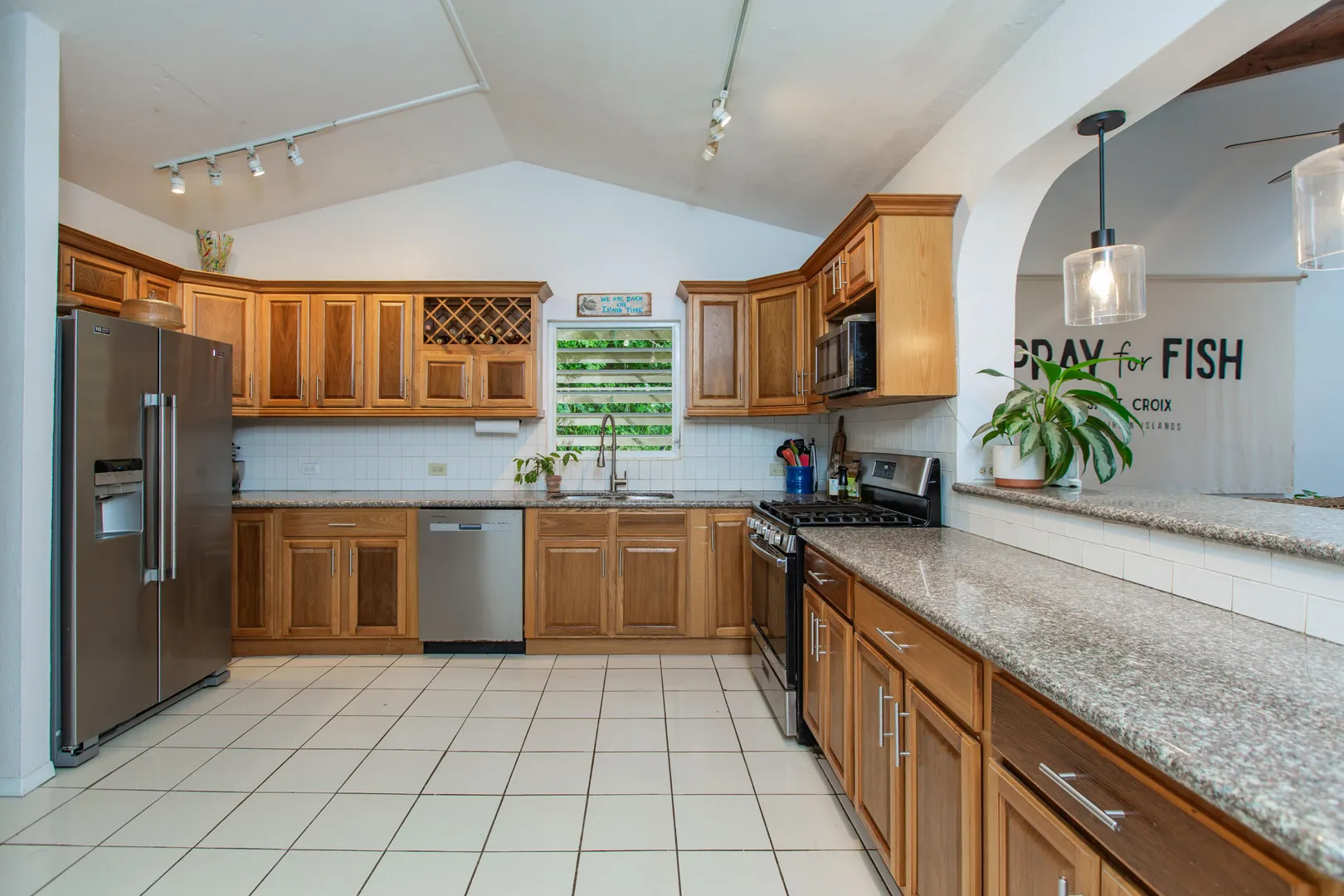 This mid-island oasis truly embodies island life! Tucked away in the hills of La Grande Princess you will find a beautifully updated 3 bedroom 2 bathroom concrete home with an adorable apartment below- nearly 2700 square feet of interior living space! Perfect for a family or make this a wonderful investment property. Gated and fenced, the home offers privacy with lush landscaping and conveniently located to nearby beaches and shopping. Beautiful vaulted ceilings and lovely natural light greet you as you enter. This spacious home is well appointed with AC in all bedrooms, updated appliances, whole house filtration and gorgeous bathroom updates. Most furnishings will convey. Updated sliders and windows can also be found.The kitchen features granite countertops, stainless appliances, plenty of space for entertaining, a large pantry and laundry room.