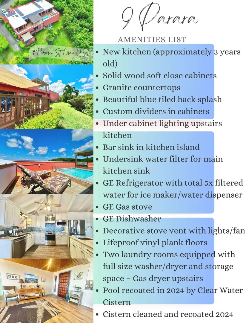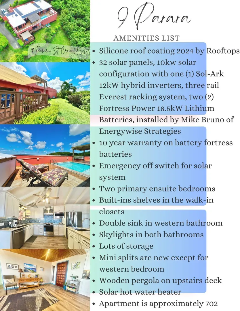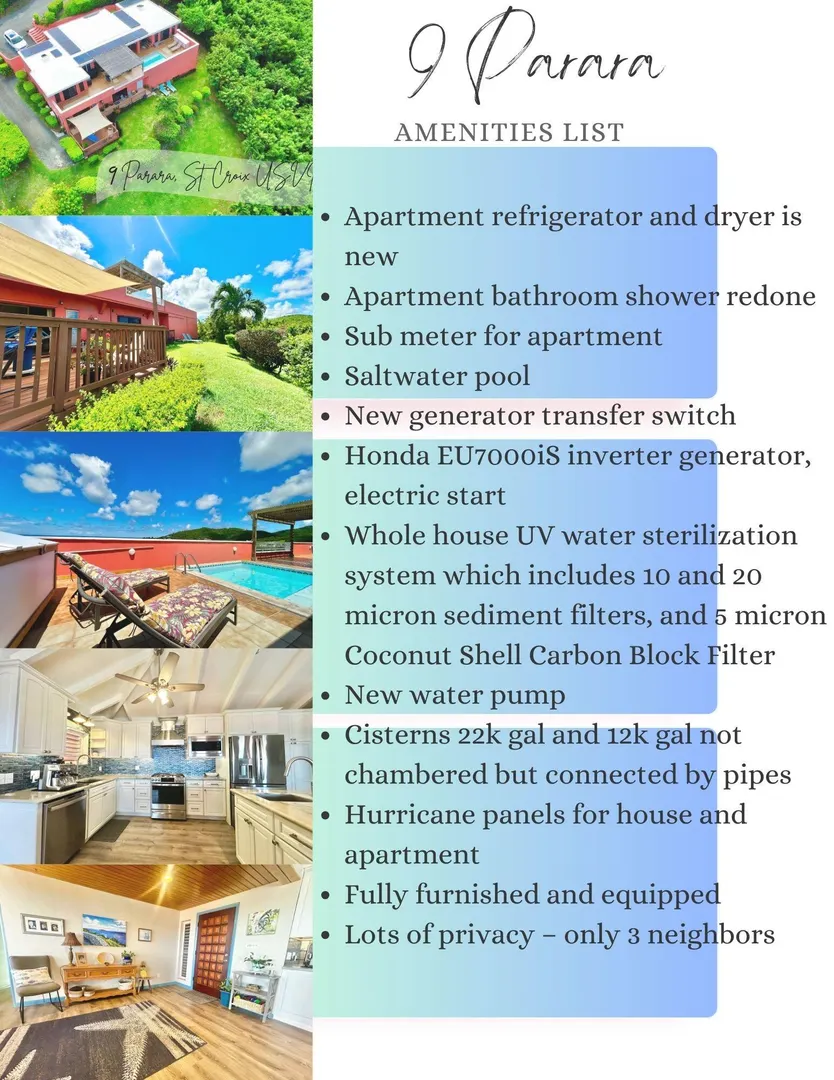 Show Stopper! Sparkling Gem. Immaculate, Pristine & Private. This is your dream villa. Matching 2 bedroom, 2 bath ensuite bedrooms, overlooking the panoramic views of Green Cay and the memorizing Caribbean Sea. Dreamy new kitchen with center isle, granite solid surface counter top and SS appliances. So many bells and whistles, solar, AC, dipping pool, magazine worthy exterior seating, generator, shutters, storage galore. Adorable apartment with its own private, shaded deck. and parking. Move in ready. Fully furnished and equipped. See amenities list in Supplement Remarks.9 Parara Amenities