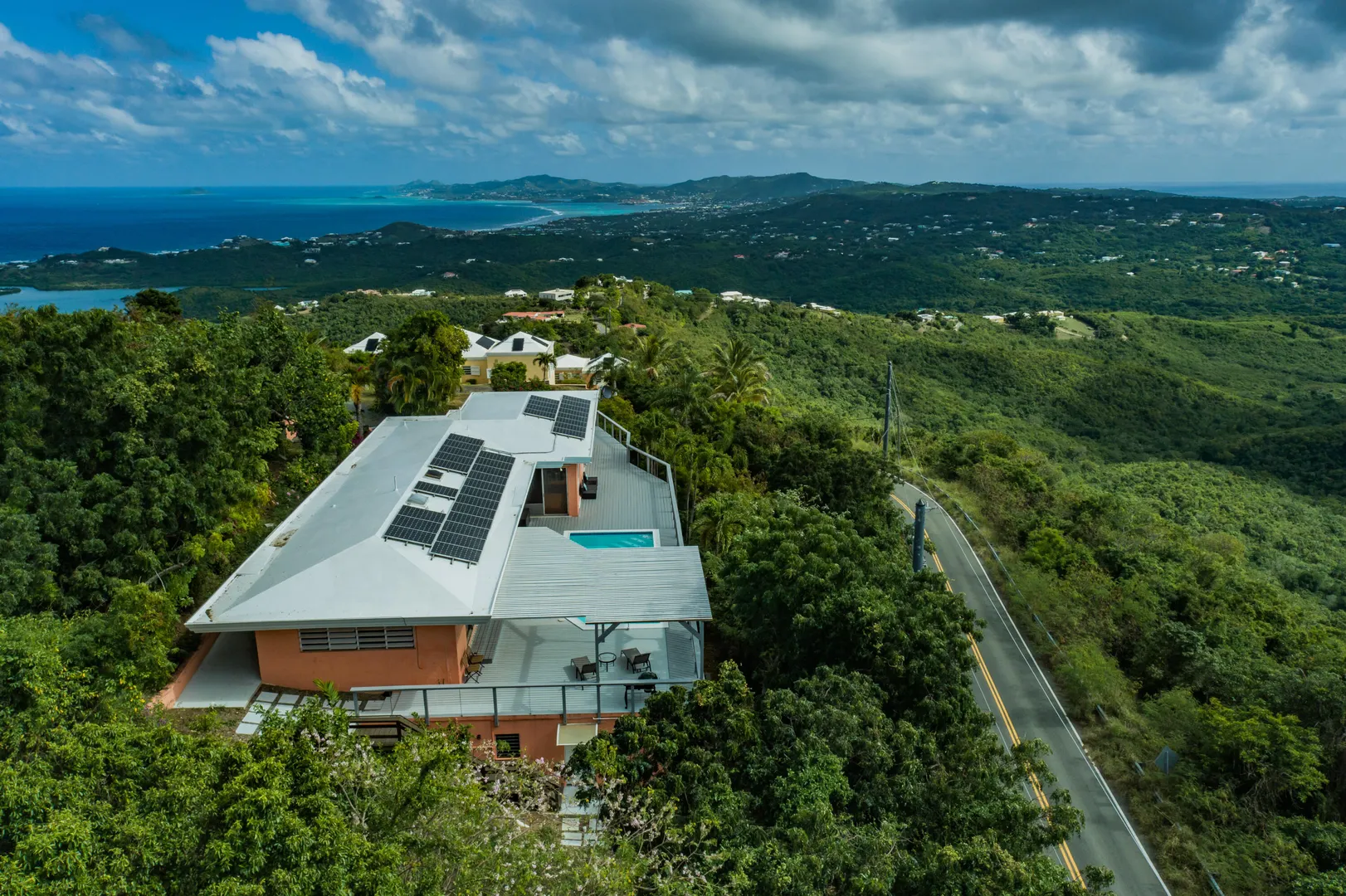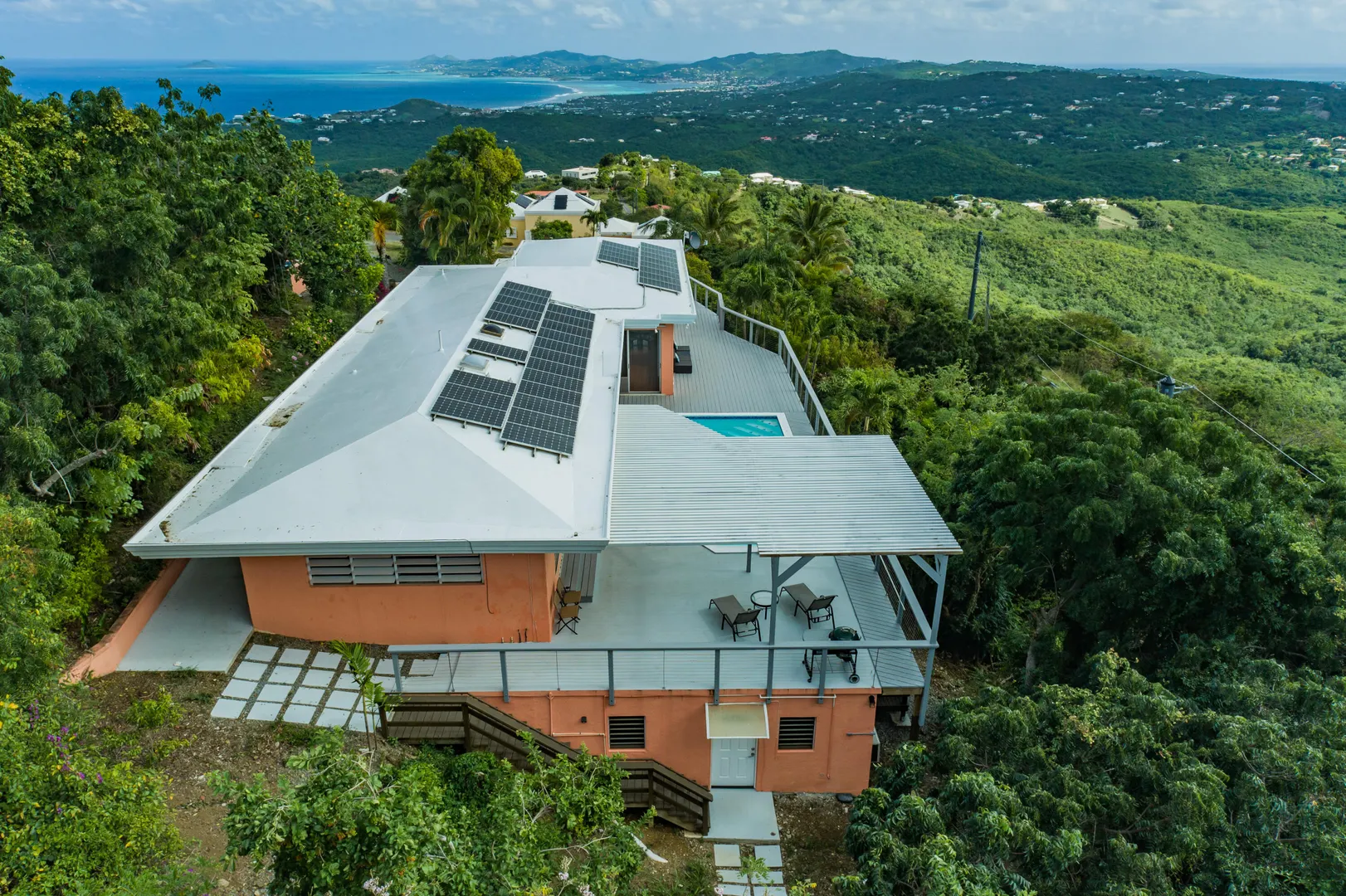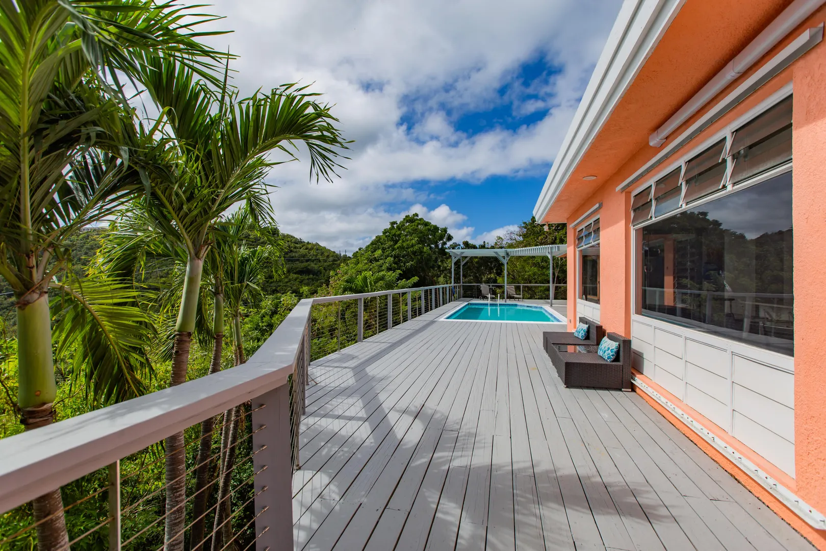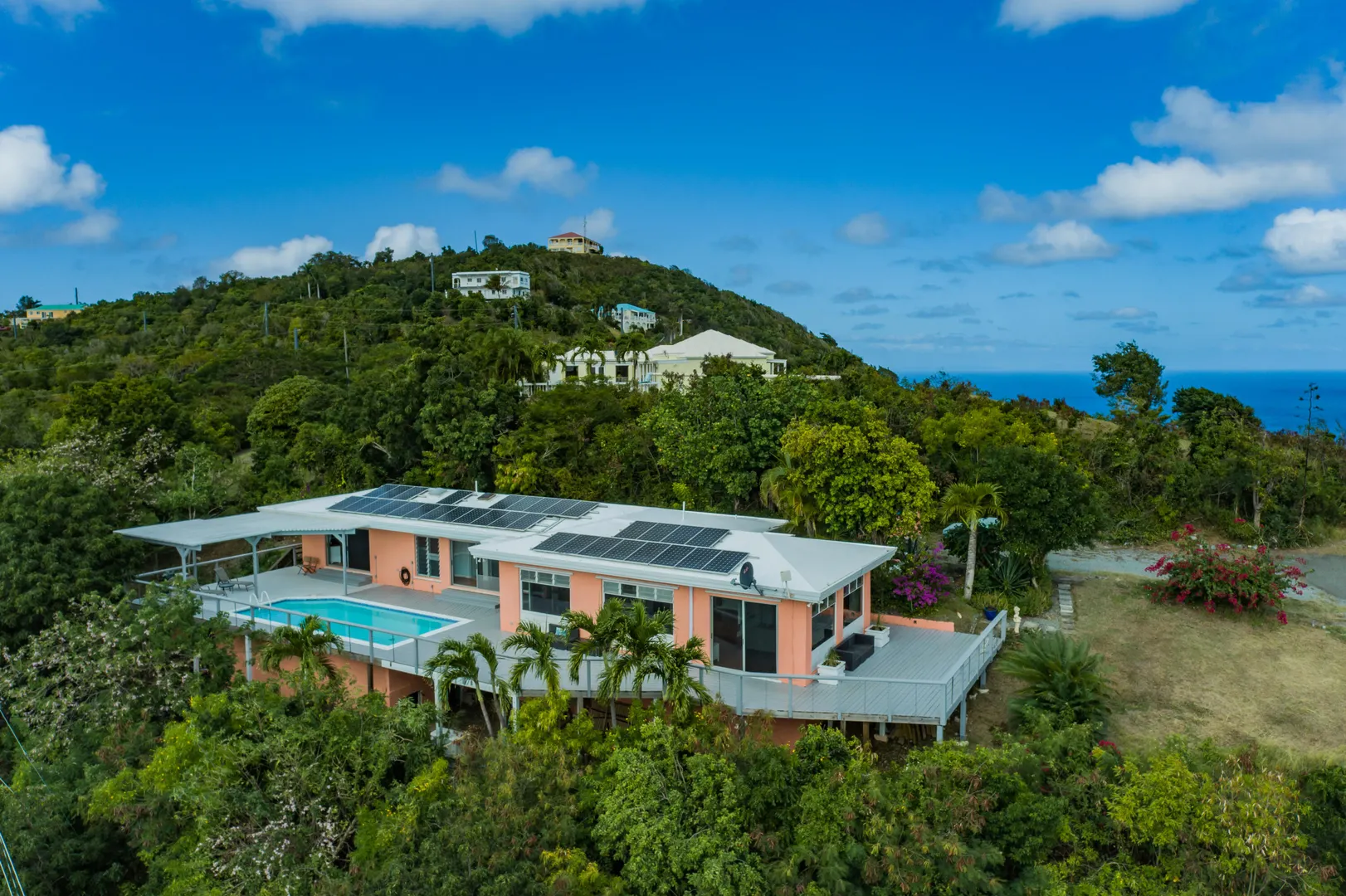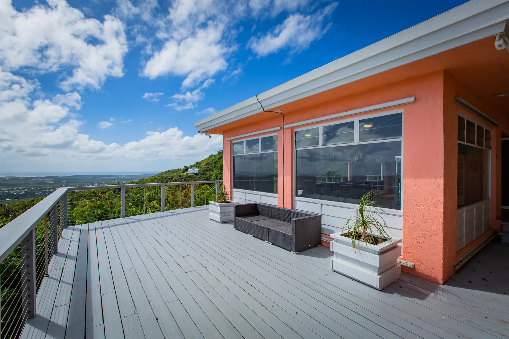 Spectacular views to the east & south from this custom built 3-bedroom, 3-bath plus studio apartment, hilltop home located on the Northshore. This amazing property meticulously maintained by owners also features updated kitchen, pool, re-painted wrap-around pool deck, remodeled studio apartment located below (perfect for guests or vacation rental), net-metering w/ 8KW solar system, back-up generator, large picture windows for those amazing views, vaulted ceilings and tile floors. Extra storage located beneath pool deck. Located minutes away from Salt River & Cane Bay areas for dining, beaching & watersports.