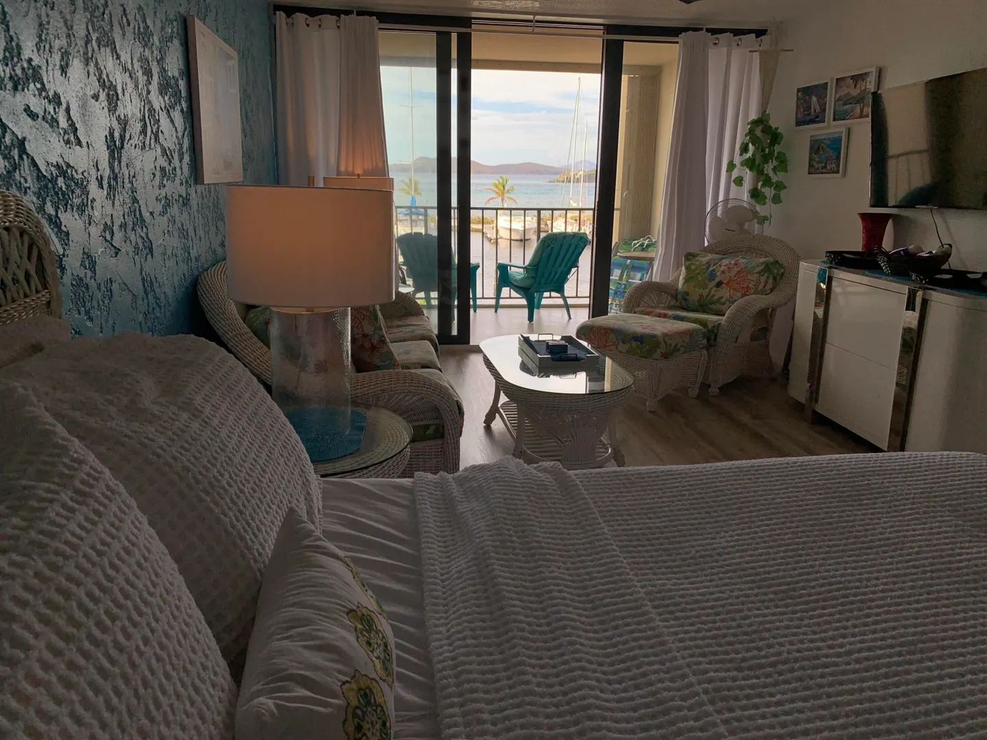 This newly renovated studio in the most desirable building at Sapphire Hill Village offers you the pleasure of watching the boats in the marina, on display outside your porch, with the ocean waves in the distance. Lay in bed to the music of the ocean from Pillsbury Sound. New tankless hot water heater and 18K BTU AC. Beautifully renovated bathroom, shaker kitchen cabinets, new flooring, new sliders, and all within steps of a pool and a restaurant. Gated security. Red Hook restaurants and conveniences just minutes down the road.