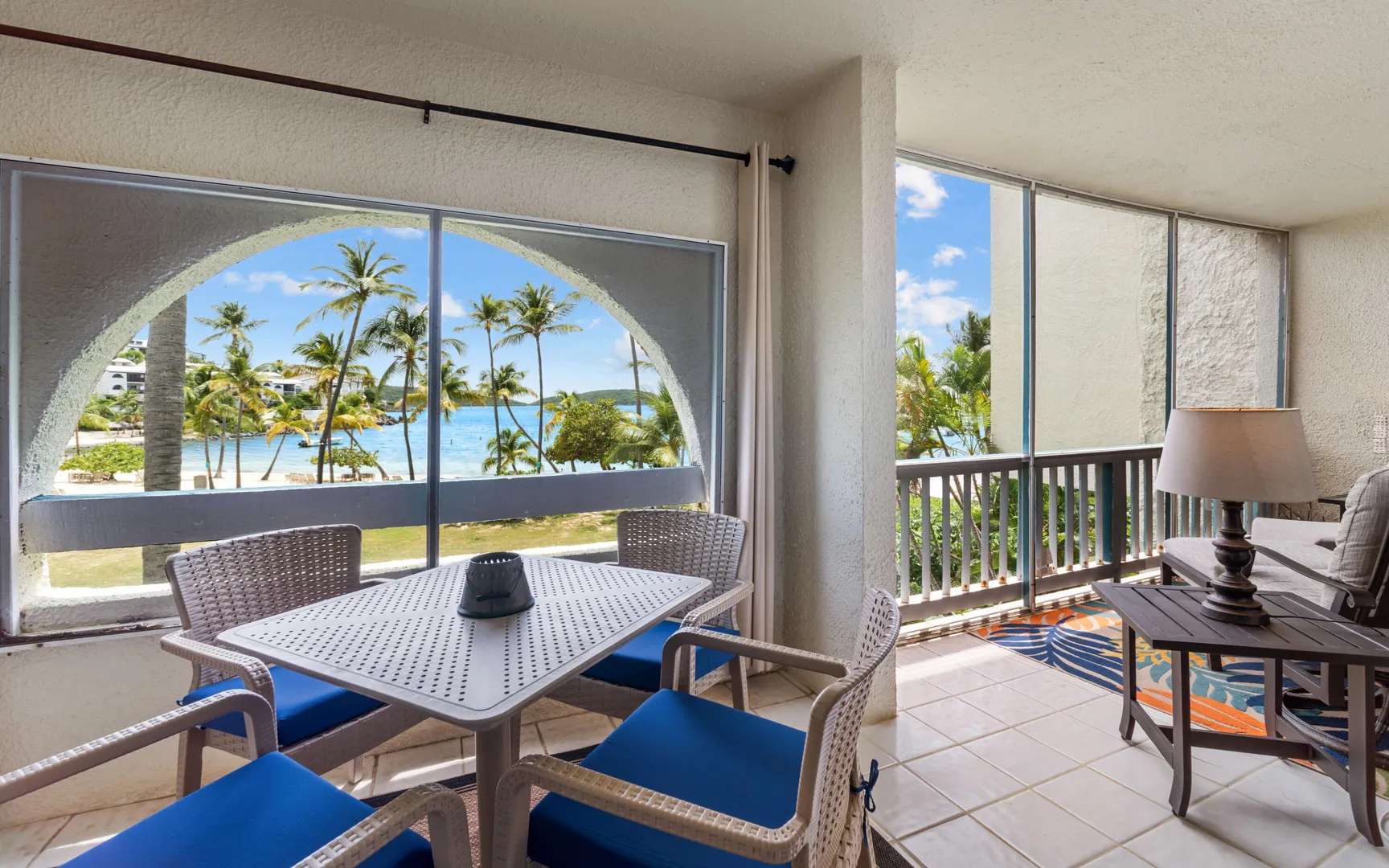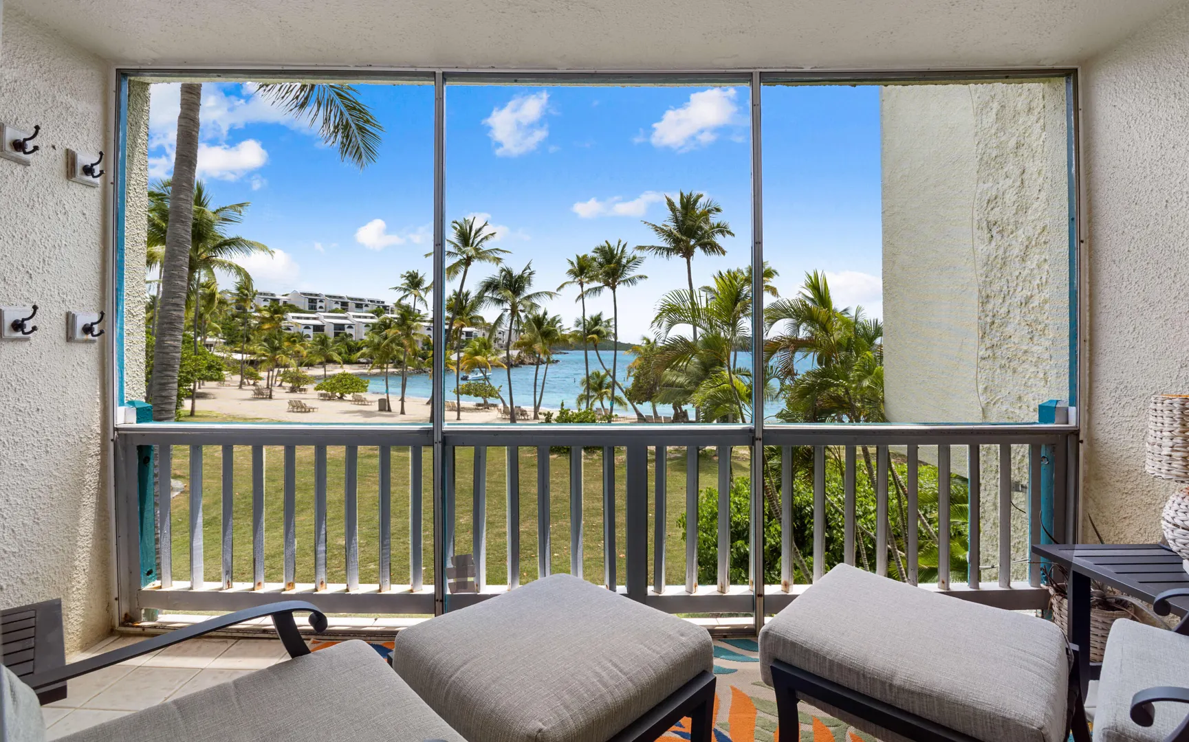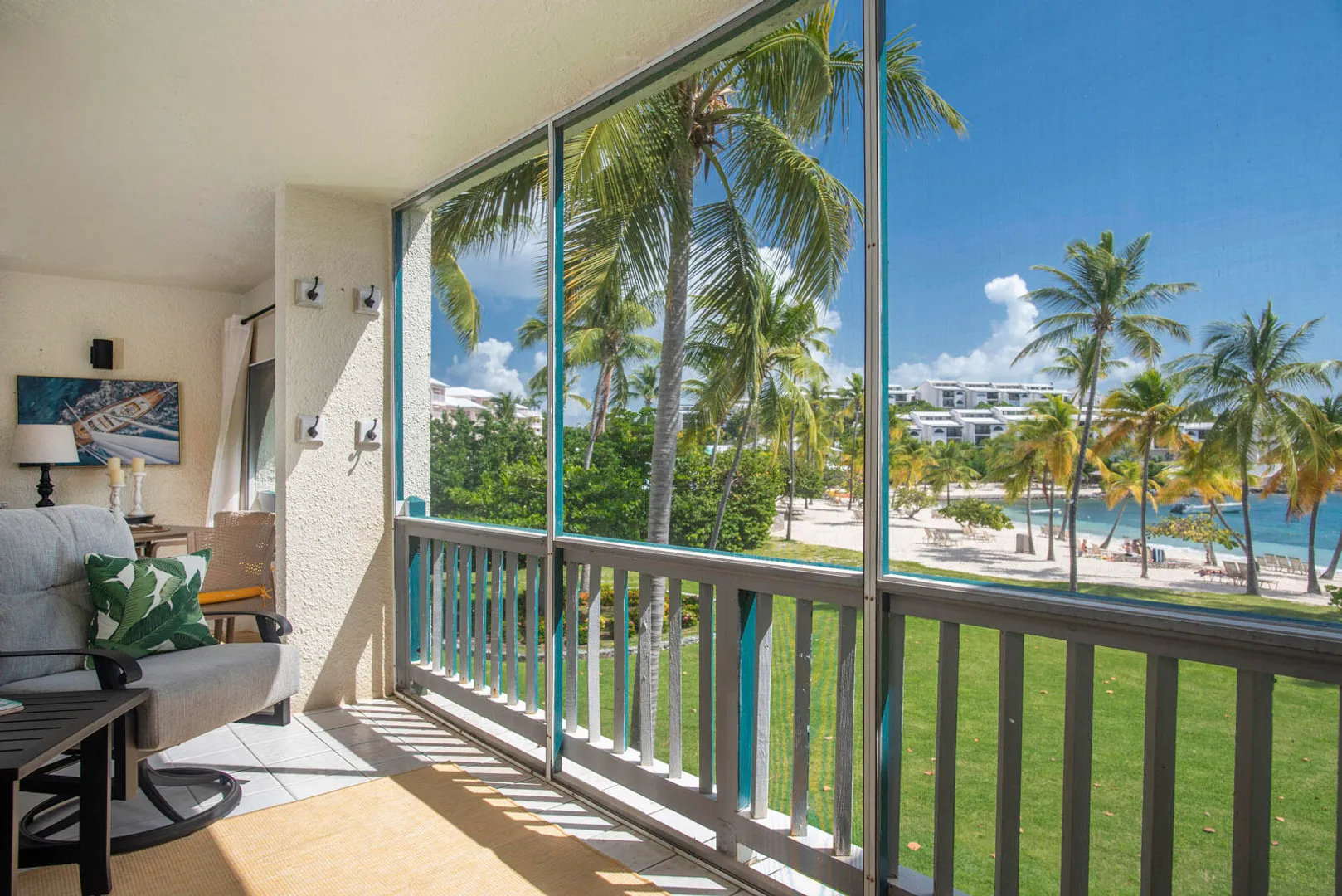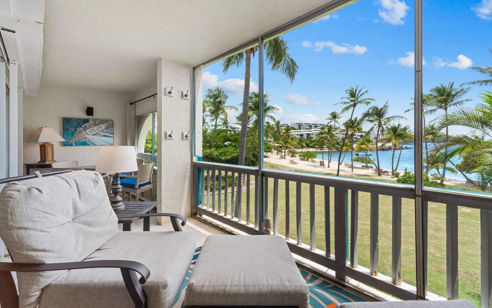 A RARE FIND! 2 BR 2 Bath elegantly furnished BEACHFRONT condominium- Cowpet Bay West! One of the BEST locations in the complex! A private sidewalk just steps off the front balcony lead directly to the white sandy beach & ocean! Upon entry - open layout with OCEAN VIEWS & BREEZES1 Full size kitchen, Dining & living room expand to a screened veranda - has afternoon shade & sounds of ocean waves! Updates 2023 - en-suite baths, expanded walk-in closet, new Trane A/C, 3 mini splits & electrical upgrade for high capacity tankless water heater. Sea side BR has unobstructed ocean views with sliding doors to the veranda. Ideal East End location close to the Ritz Carlton, Easy access to pool/hot tub (membership) 2 restaurants - beachhut excursions. PERFECT RENTAL or your own Island Retreat!