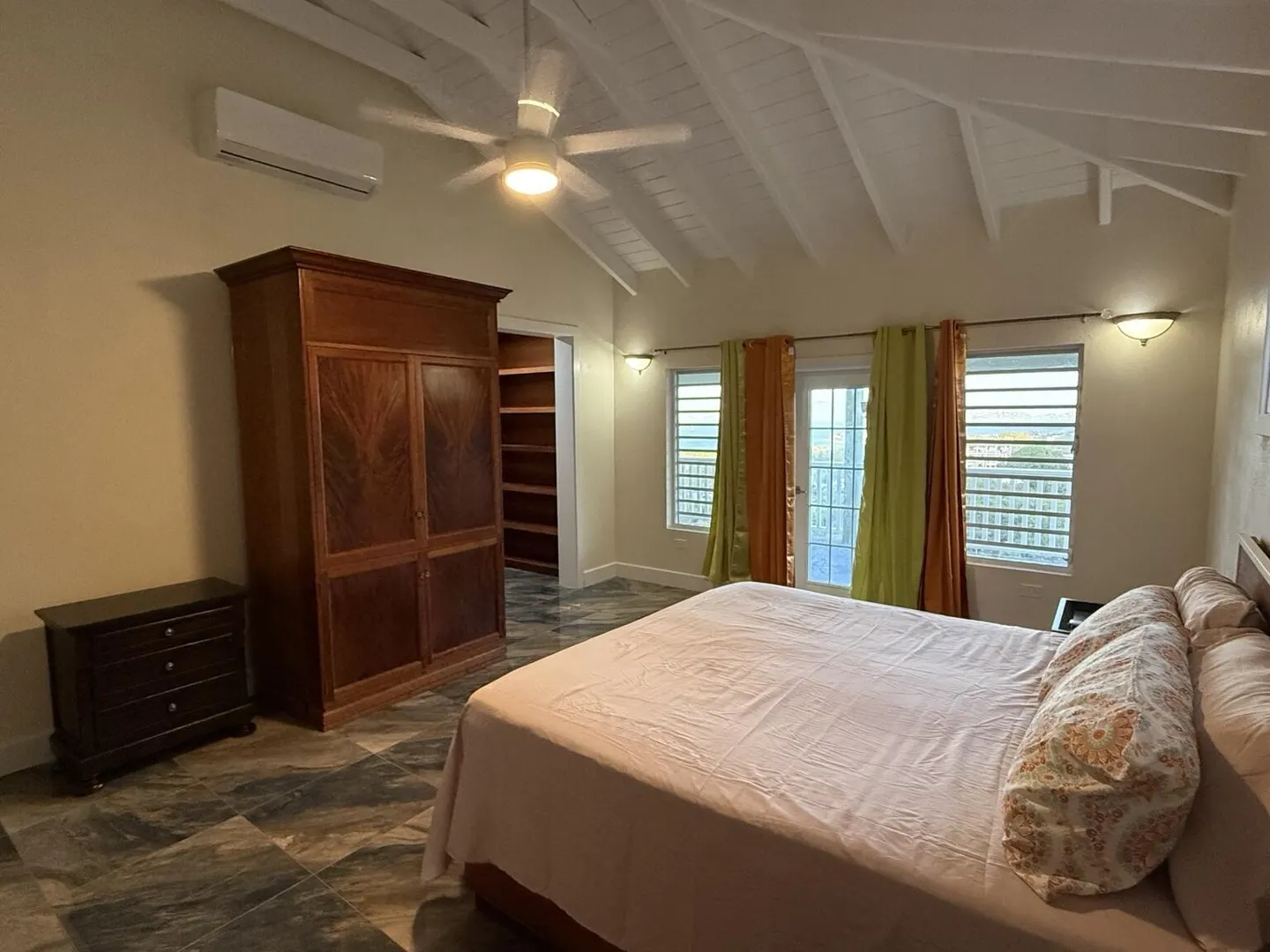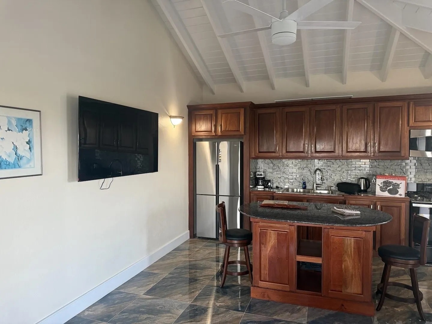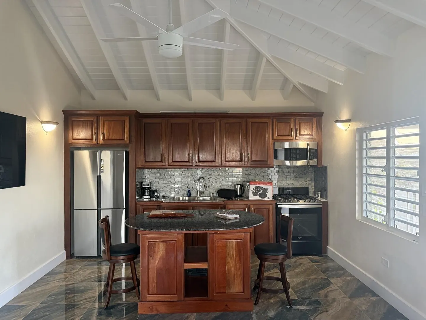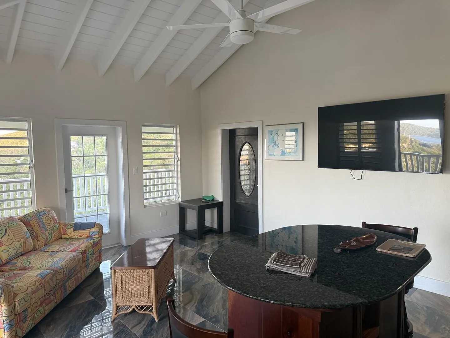 Enjoy island living in this well-designed home with great views, including a clear look over to St. John. The open layout features high vaulted ceilings, exposed beams, and large tile flooring that keeps the space cool and clean. The kitchen is finished with solid wood cabinets, granite countertops, stainless steel appliances, and a large island that works well for everyday use. The bedroom is oversized with plenty of room along with generous closet space throughout. The bathroom has been nicely updated with full tile and a walk-in shower for a modern feel. Outside, the large covered porch and gallery give you the perfect spot to catch the breeze, relax, and take in the surrounding hills and water views. Washer and Dry to be added.