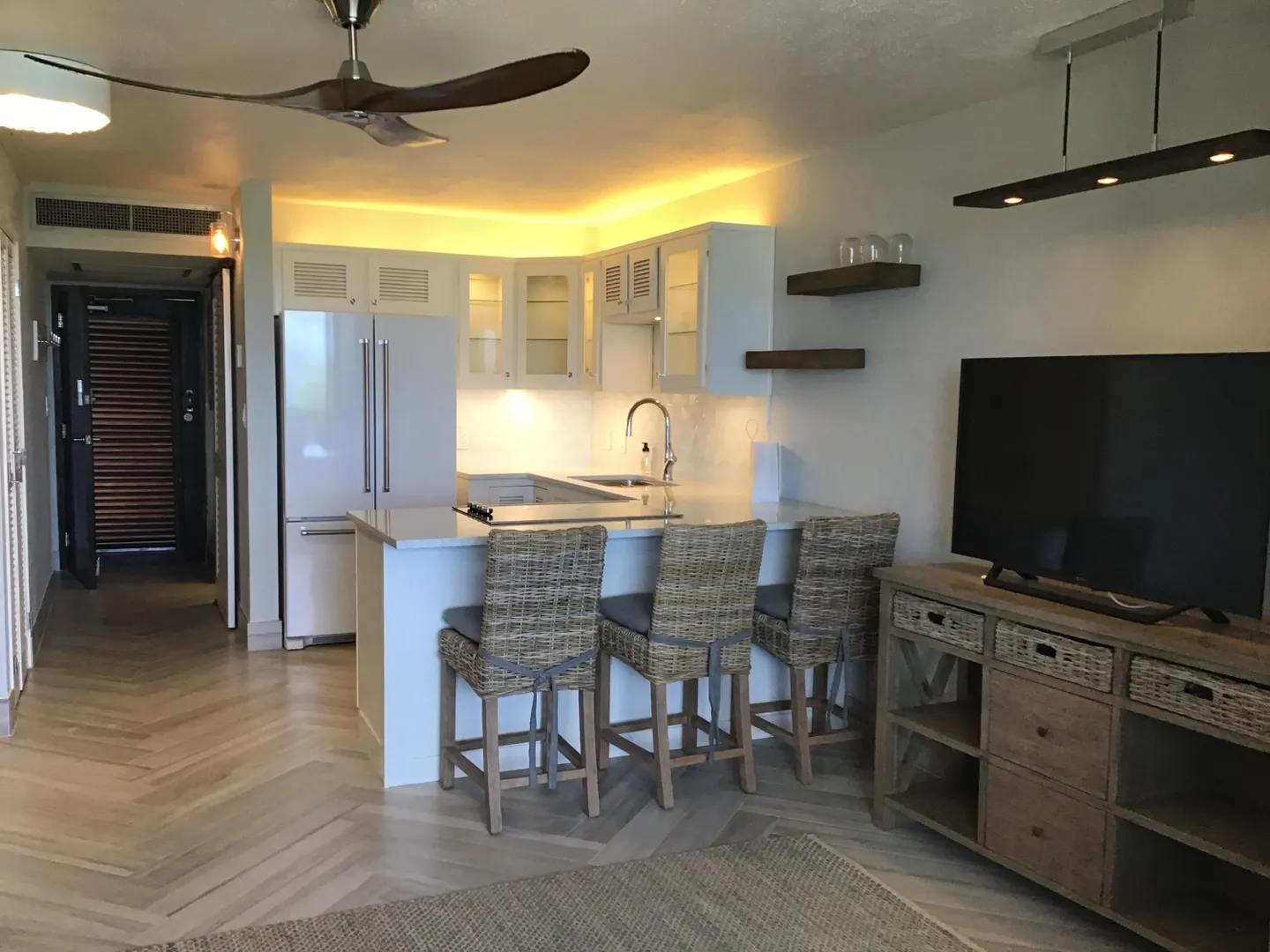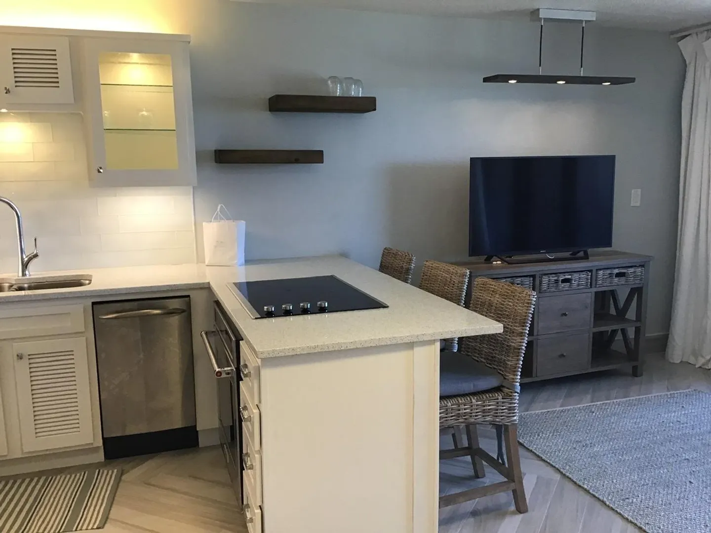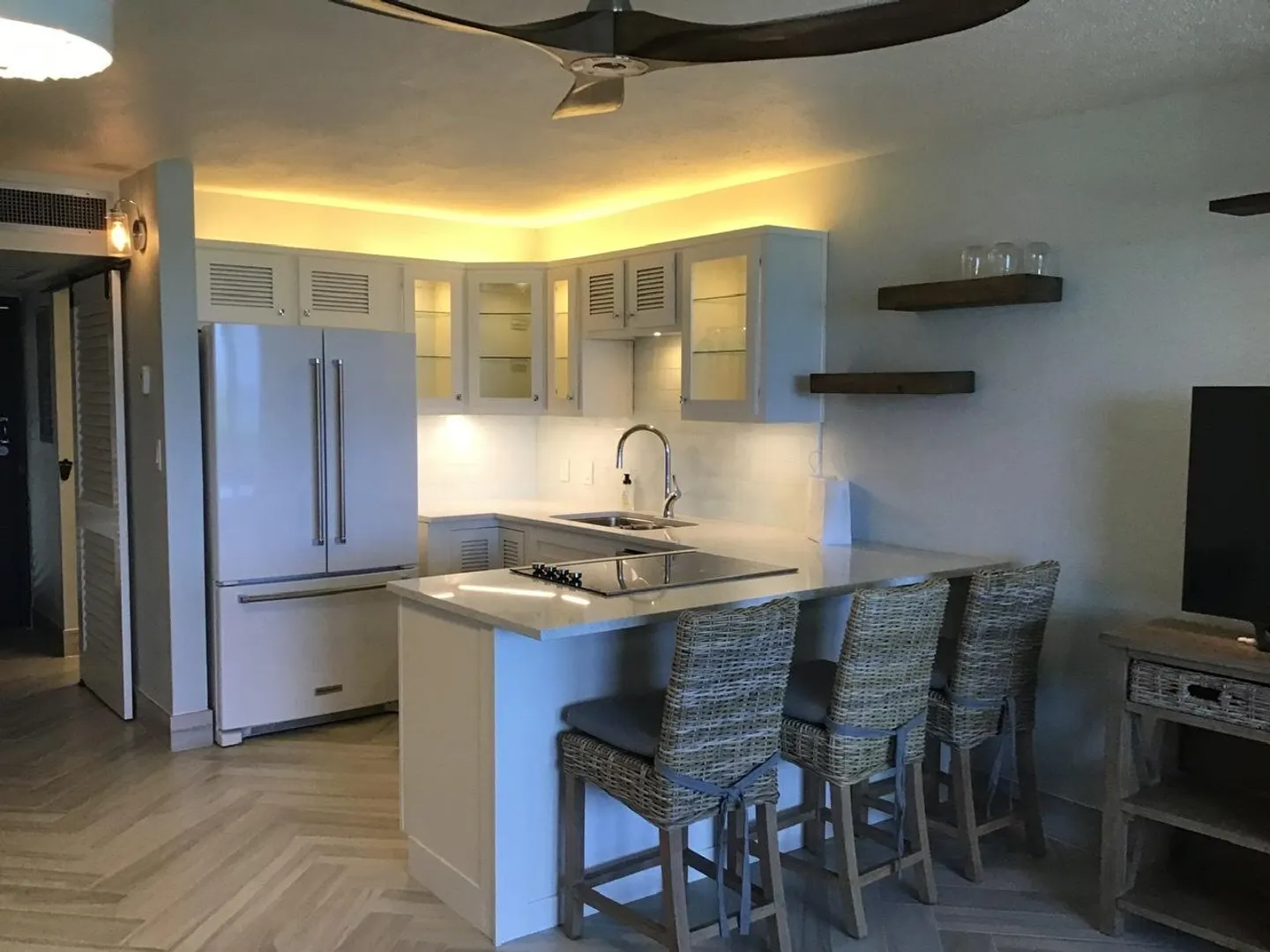 WALK OUT YOUR DOOR ONTO THE WHITE SANDS of SAPPHIRE BEACH RESORTThis completely remodeled 2-story Condo-Villa in building A is a custom remodel and comes completely furnished. Designed to comfortably sleep 6. It is one of very few units that has a washer/dryer, dishwasher and full size oven and cooktop. The kitchen features an island with seating for 3, custom cabinetry with louvered doors, Cambria countertops, Kitchenaid appliances, under cabinet lighting, interior cabinet lighting and uplighting above cabinets. Enjoy dinning alfresco on the covered balcony. Flooring throughout is a light gray tile set in a beautiful herringbone pattern. The master en suite offers a custom glass shower with marble & glass tile, a king bed and sleeper sofa. Private covered Balcony off the Master.