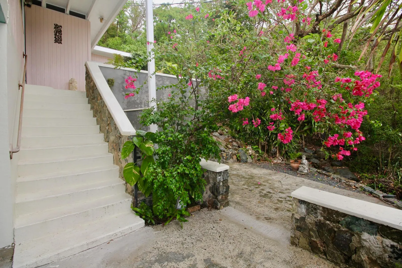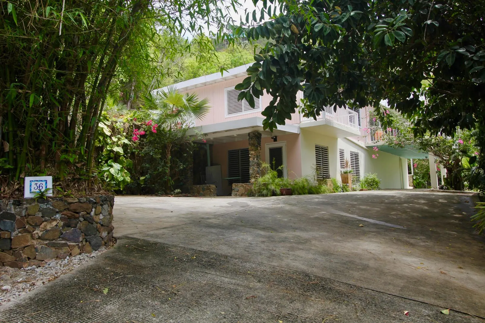 Lovely island home in lush tropical setting affords privacy while convenient to Nisky Center, UVI, airport, town, shopping and restaurants. Two bedroom/two bathroom upstairs with large covered gallery with harbor views, rear garden patios, stone terraces, kitchen has SS appliances, prep sink and custom Ashe Wood cabinetry, work/storage room, large carport. Plus a one bed one bath apartment for extra income. This very comfortable home is sure to please and offered at a very affordable price.