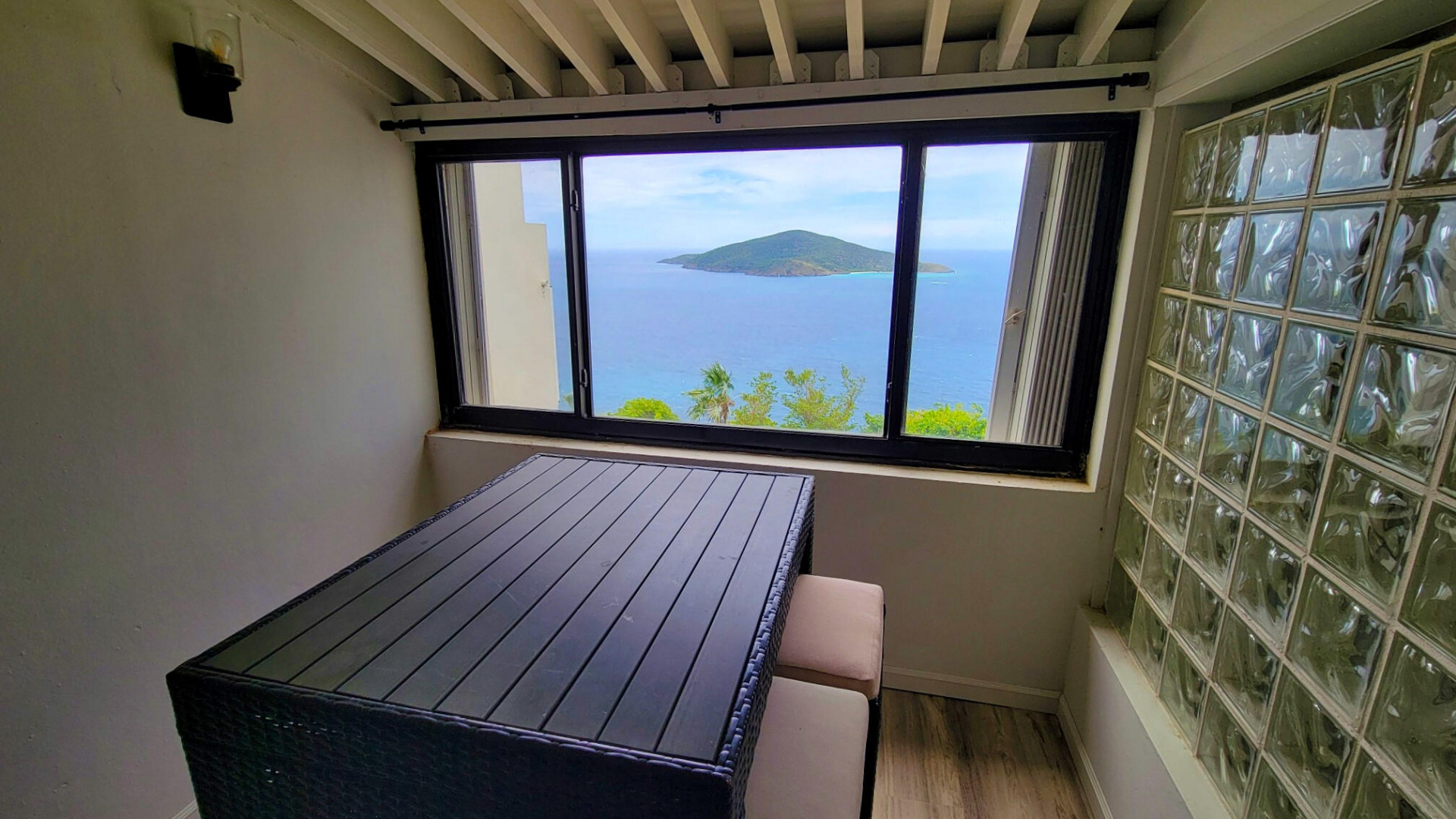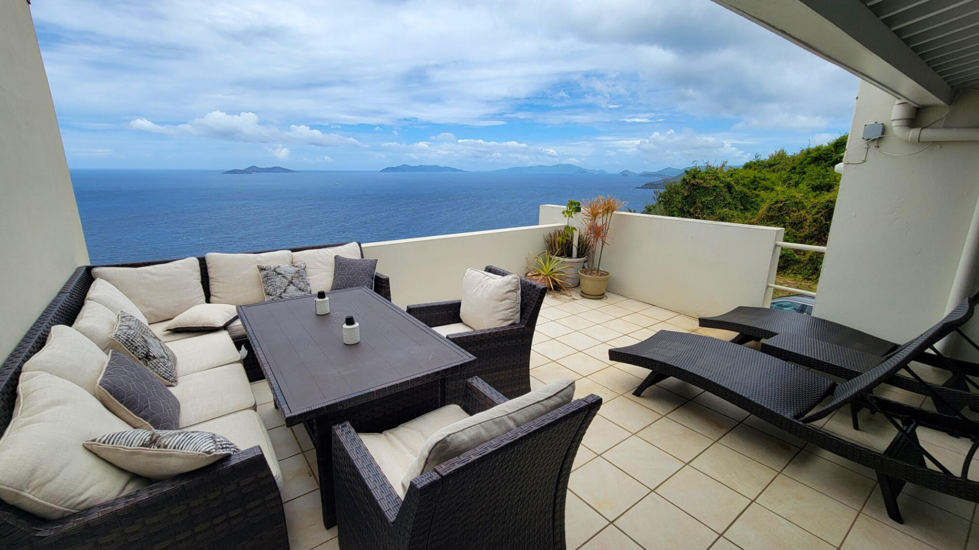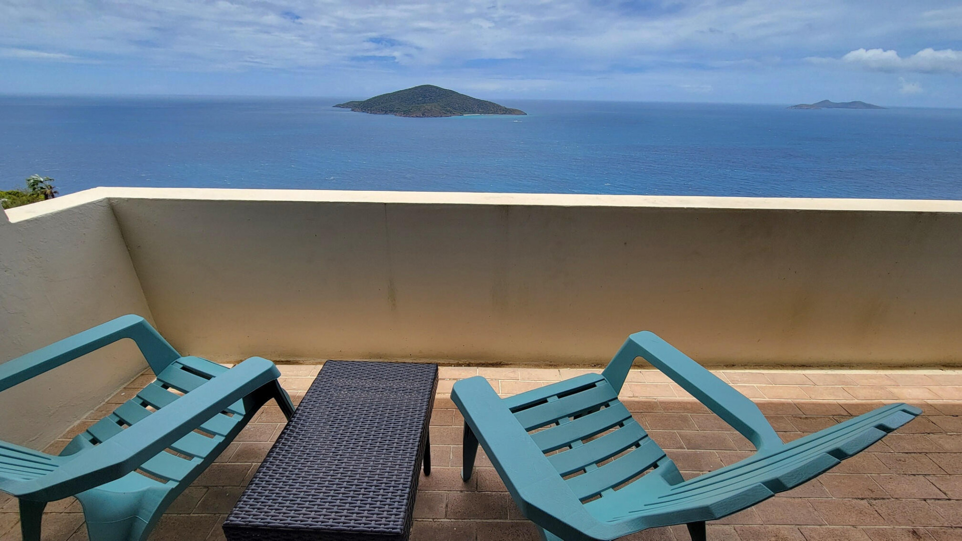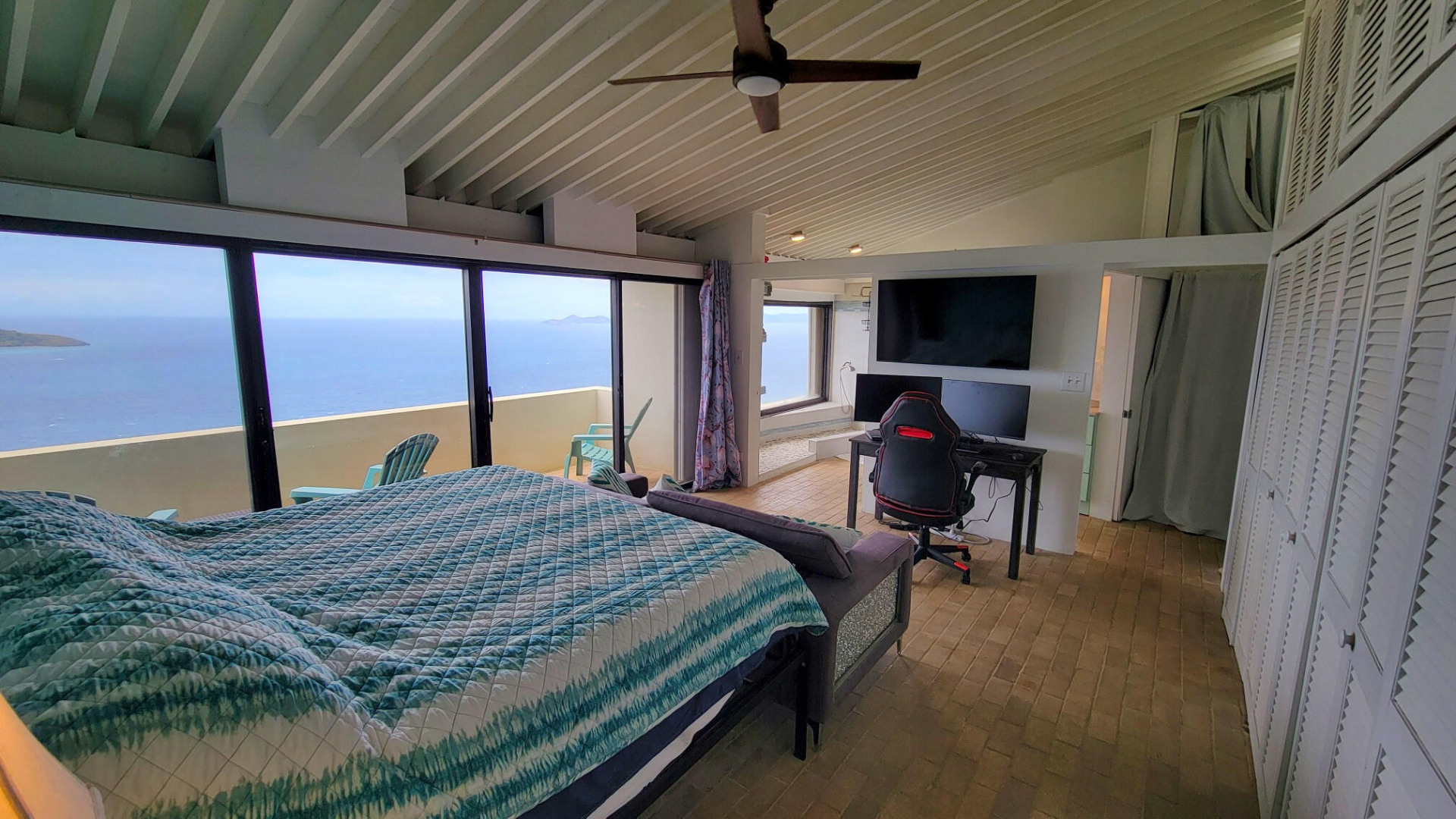 Discover the beauty of the Caribbean in this private top-floor unit at the end of a quiet cul-de-sac. Enjoy breathtaking Atlantic Ocean and down-island views from every room, vaulted ceilings, and a highly sought-after splayed floor plan designed to capture the easterly breeze. Open living and dining areas lead to a spacious patio - perfect for alfresco meals and winding down at the end of the day. The master suite features its own balcony, while the bumped out second bedroom offers extra space. This condo has a GENERATOR and covered parking in a gated community. Minutes from world-renowned Magens Bay Beach.