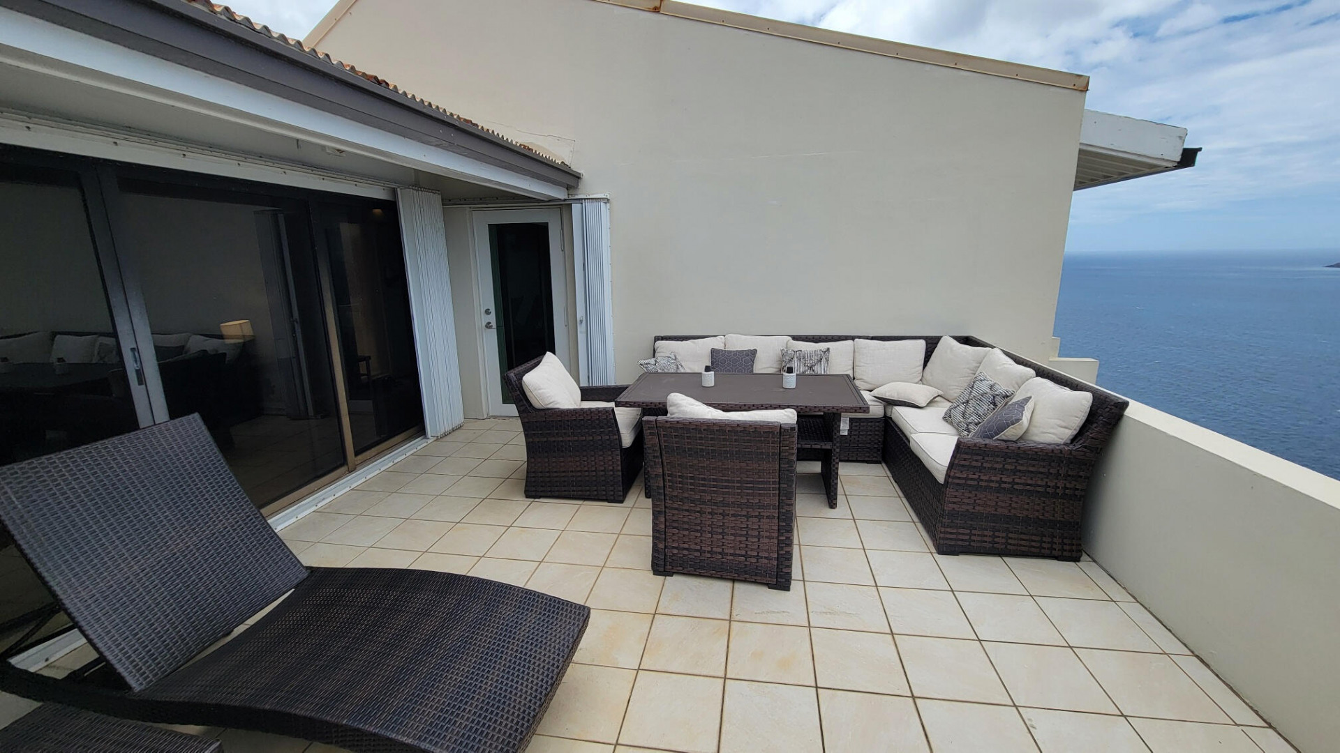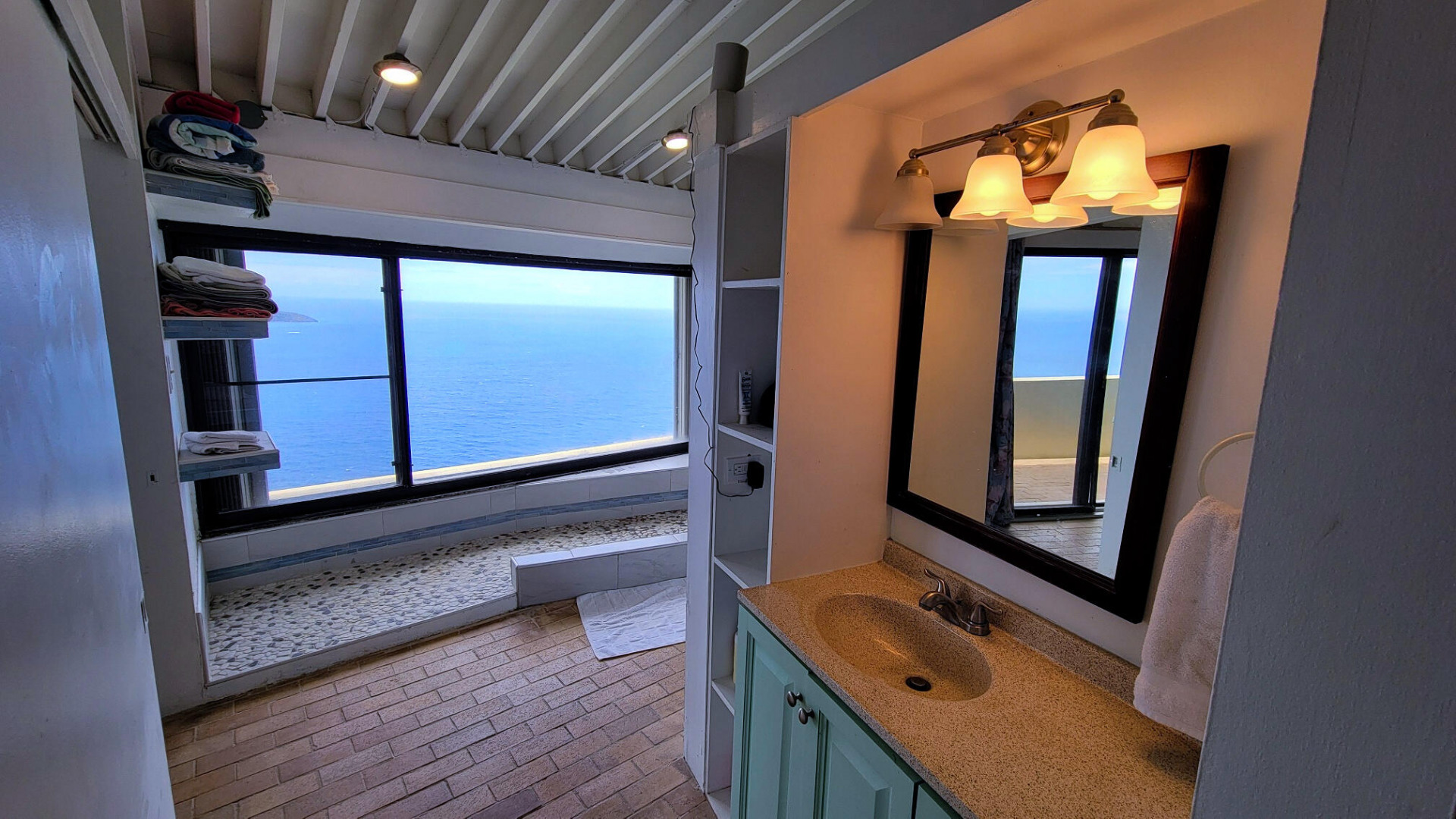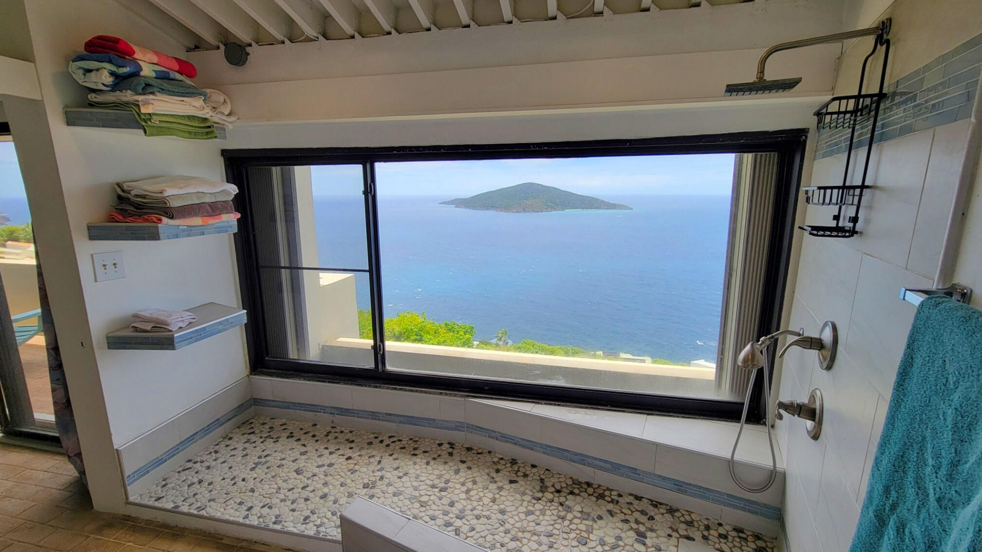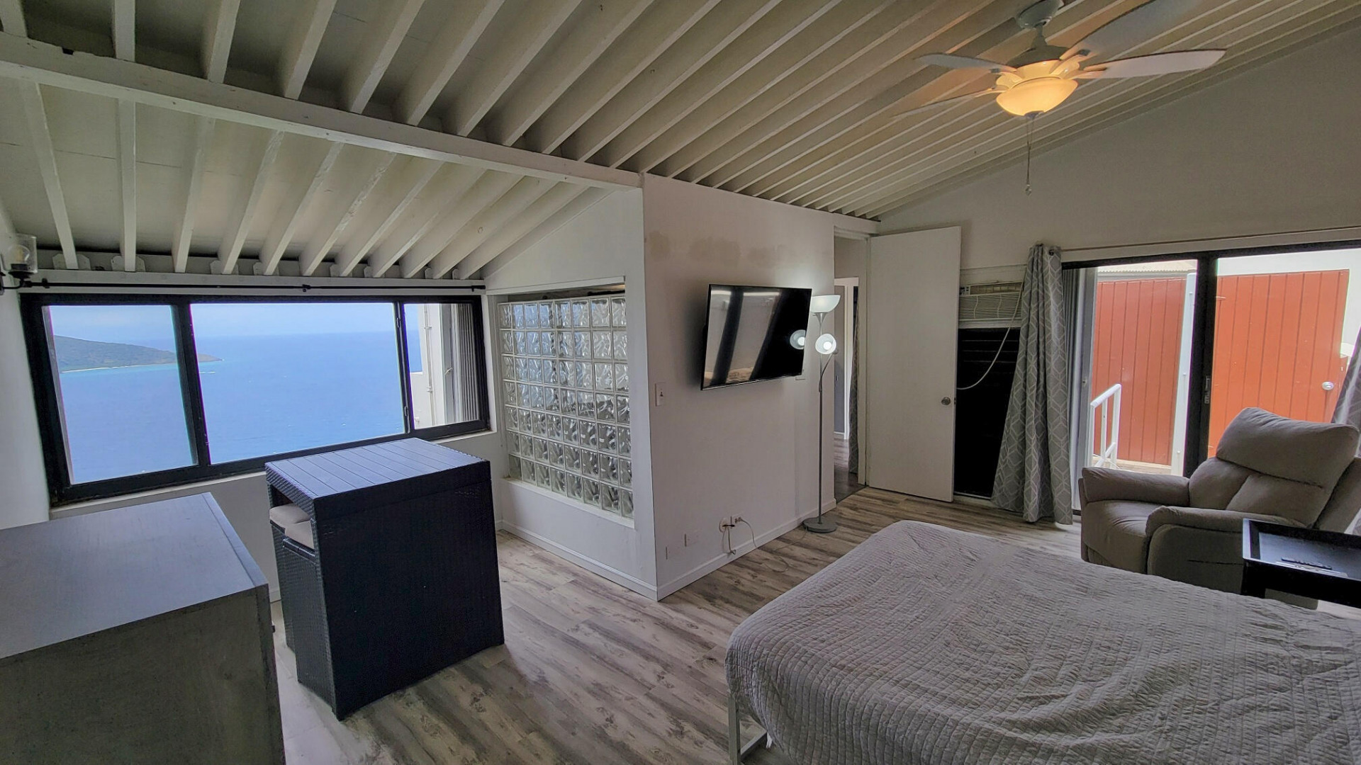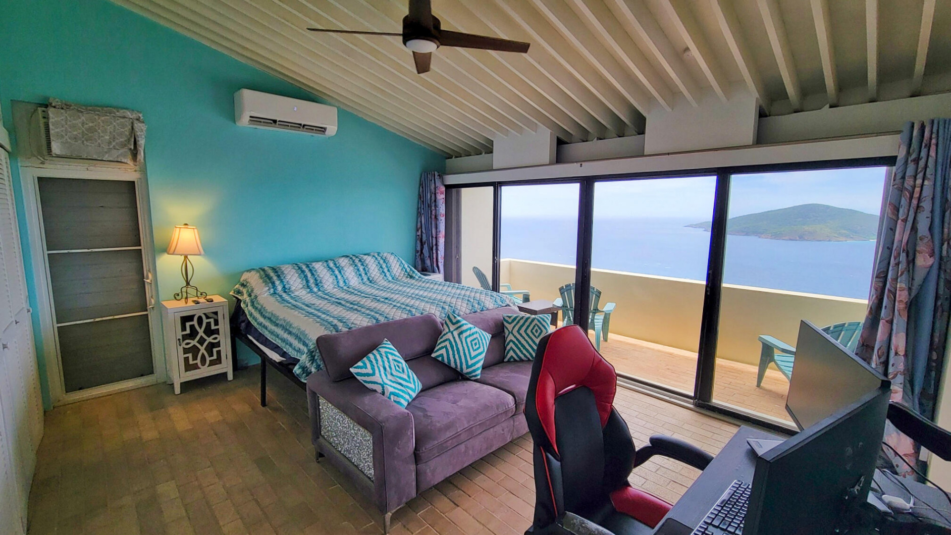 Discover the beauty of the Caribbean in this private top-floor unit at the end of a quiet cul-de-sac. Enjoy breathtaking Atlantic Ocean and down-island views from every room, vaulted ceilings, and a highly sought-after splayed floor plan designed to capture the easterly breeze. Open living and dining areas lead to a spacious patio - perfect for alfresco meals and winding down at the end of the day. The master suite features its own balcony, while the bumped out second bedroom offers extra space. This condo has a GENERATOR and covered parking in a gated community. Minutes from world-renowned Magens Bay Beach.