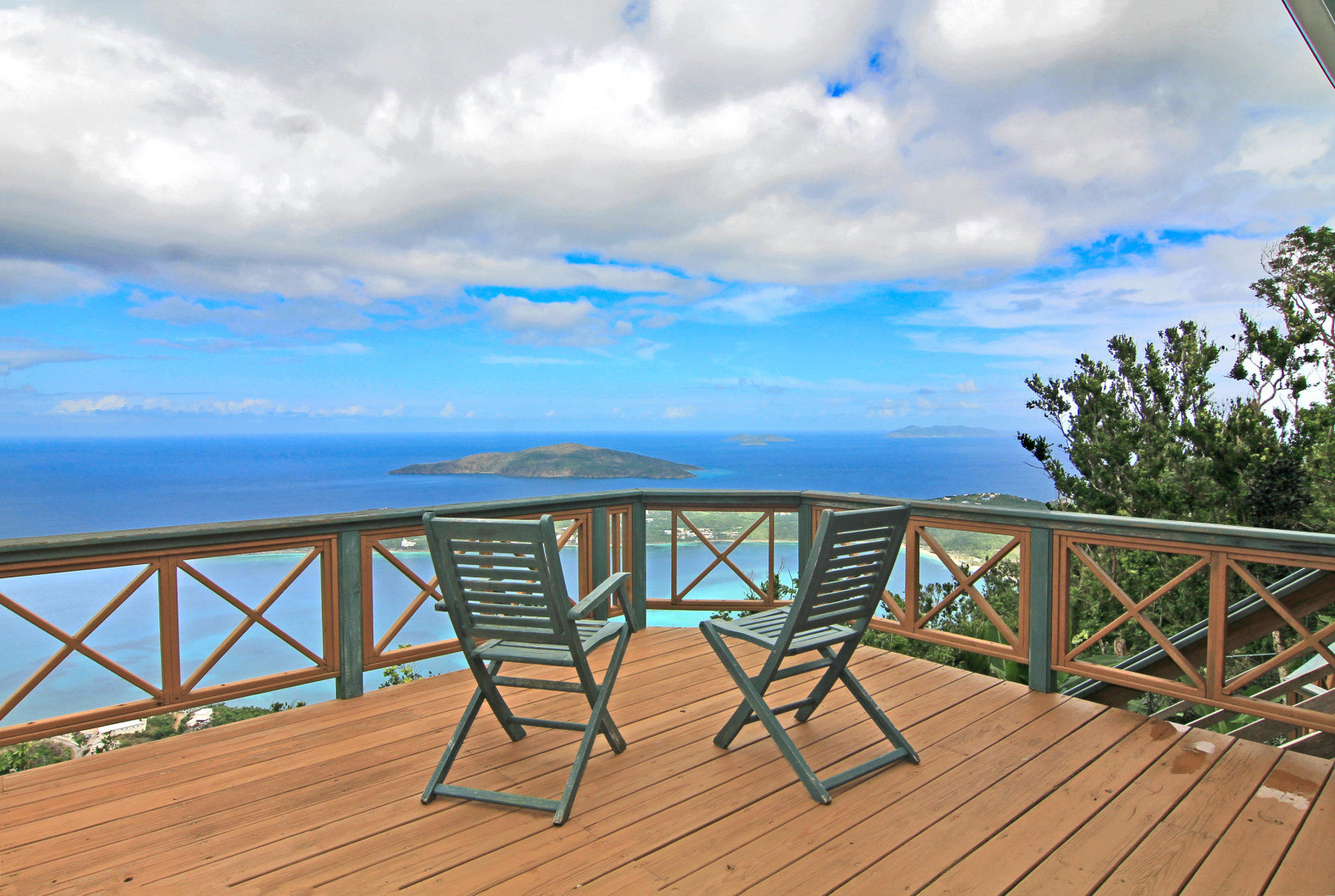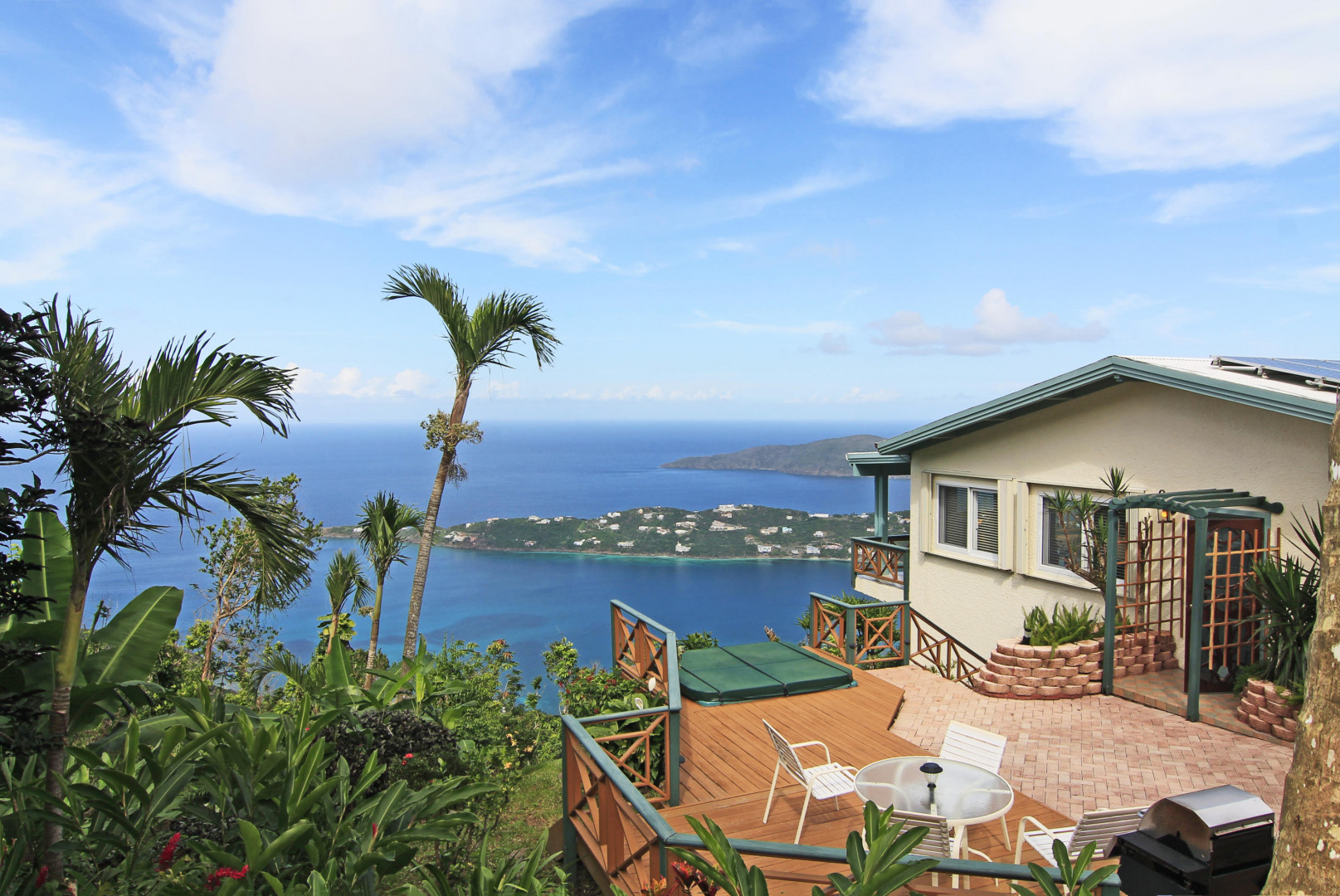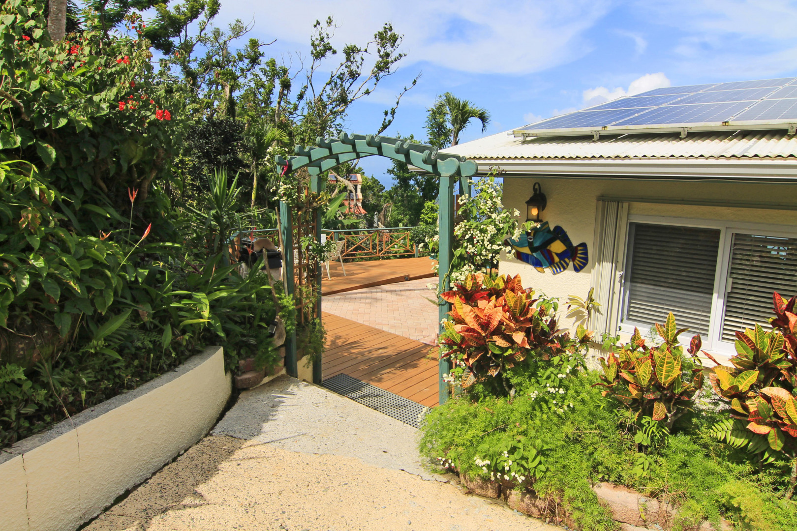 Pristine and well constructed, this masonry single level home was undamaged by Irmaria. Enjoying great center island location, it boasts stunning Magens Bay and Down island views from most rooms and cool covered decks. A gardener's dream, it is nestled in a spectacular lush and manicured tropical garden setting, including a range of fruit trees and pineapples. It abuts Fairchild park assuring unique privacy, and a rare tranquil ambience. The family friendly 3BR layout is bright and airy, beautifully detailed, evidenced by the custom German manufactured sliding doors. A spacious, equally pristine apartment is below. Solar array reduces WAPA. Fenced grounds for dogs, a separate storage shed and a 60 KW auto generator in dedicated housing, round out this exceptional offering.