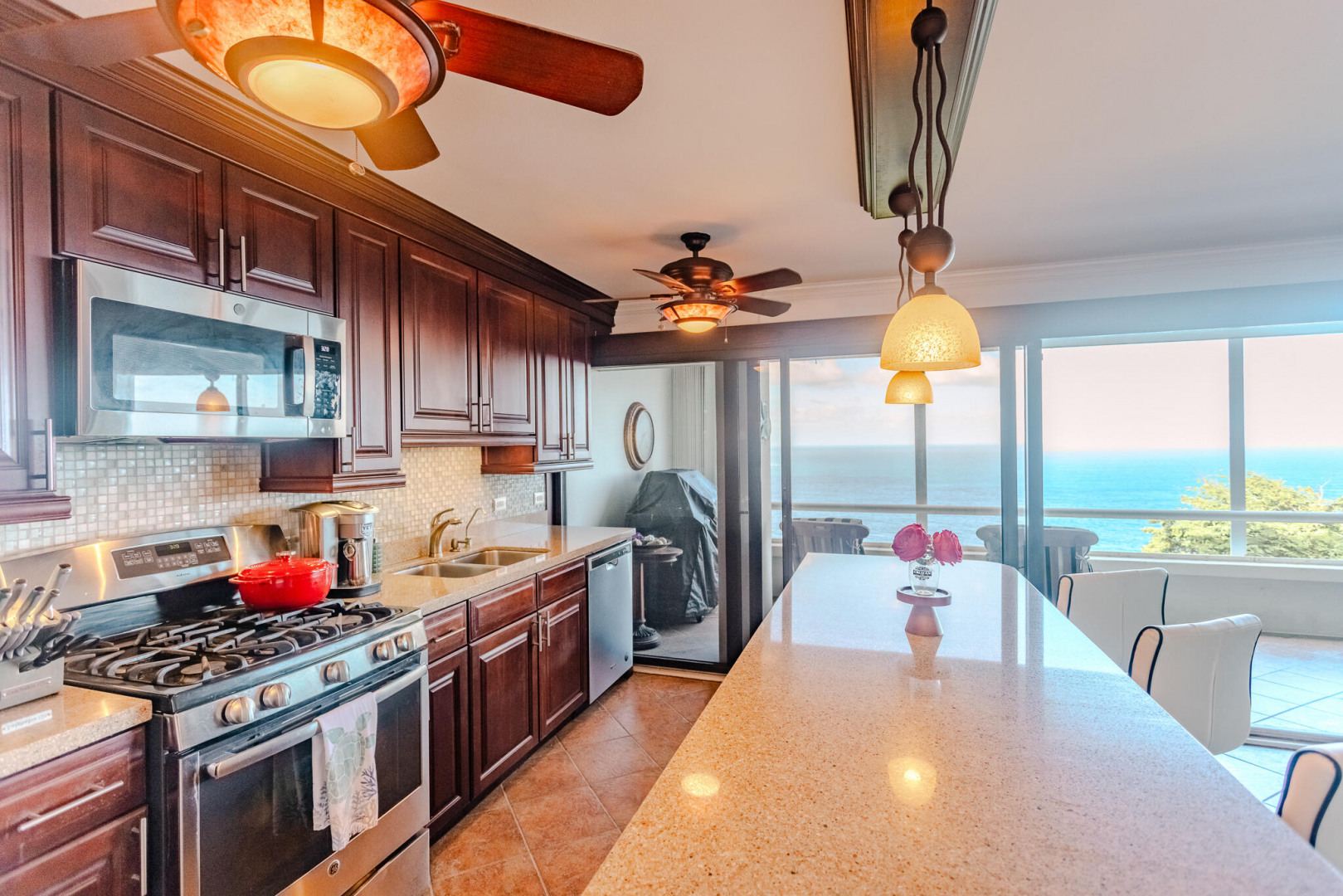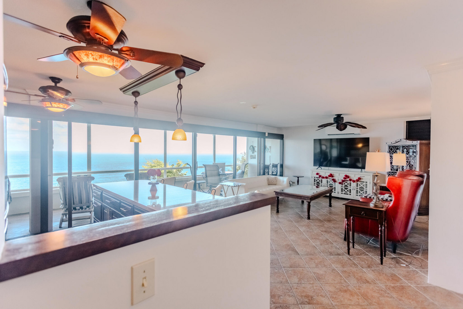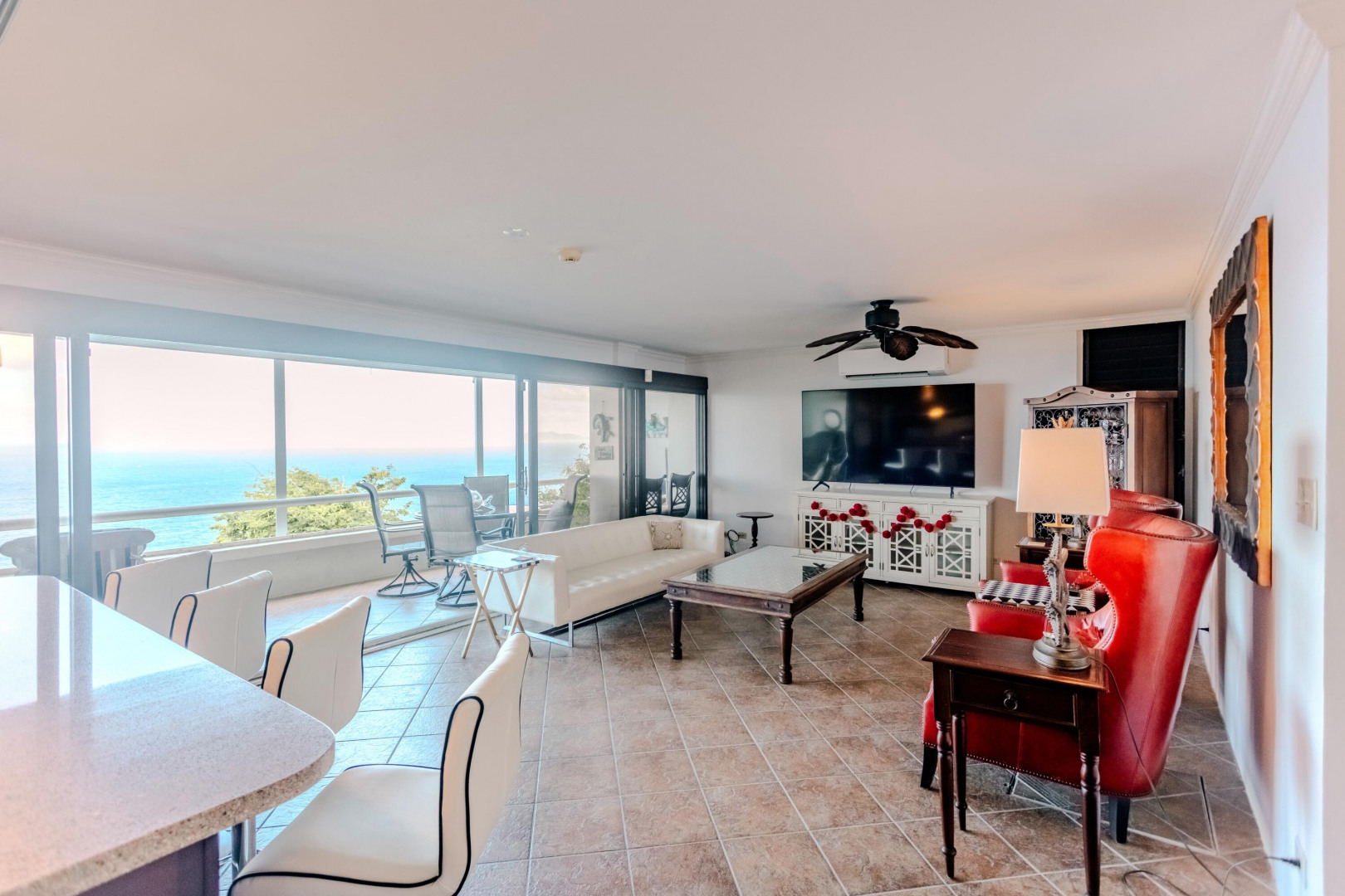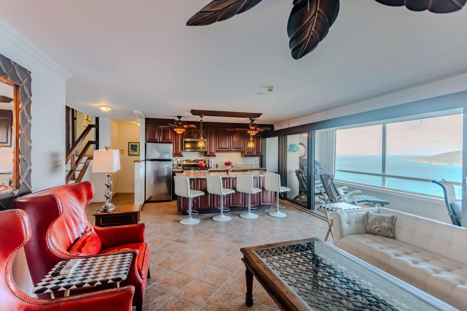 Welcome to this beautifully furnished and appointed 2-bedroom condo in the sought-after gated community of Mahogany Run. With a split level floor plan, step into a remodeled kitchen with stainless steel appliances & granite counters. The enlarged master bedroom has generous closet space and & ocean views leading to a bathroom featuring an travertine tiled shower. With stunning panoramic ocean views from the large main deck, spanning from Hans Lollick to the British Virgin Islands, this is one of the prime locations on the property ideal for either a full time home or vacation rental.The second bedroom can be accessed through a separate entrance, providing flexibility of use.Mahogany Run offers a large pool, garbage pickup & UV water filters. This unit has a generator.