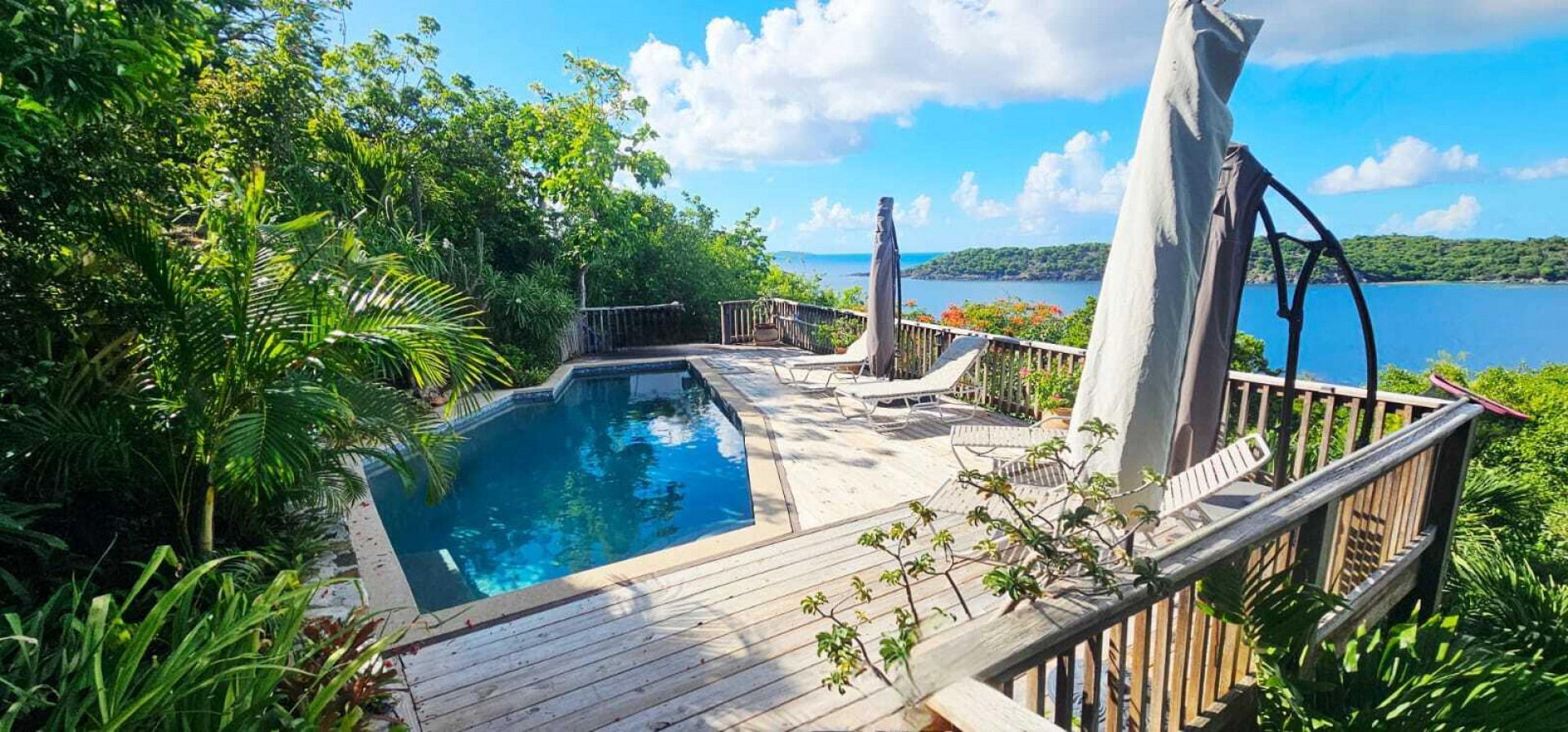 Set on three lush waterfront acres with direct sea access and refreshing trade winds, this classic West Indian home combines timeless stonework with modern comfort. Flexible in design, it can be a two-bedroom, two-bath retreat or a one-bedroom, one-bath plus large studio. Expansive terraces, a private pool, and manicured grounds create the perfect island escape. With two R1 lots, there's also potential for future expansion. Features include solar power, a 20 kW generator, storm-rated windows and shutters, reinforced roof, 42K gallon cistern, and ADT security. Private, breezy, and self-sustaining--ideal for tranquil Caribbean living with room to grow.