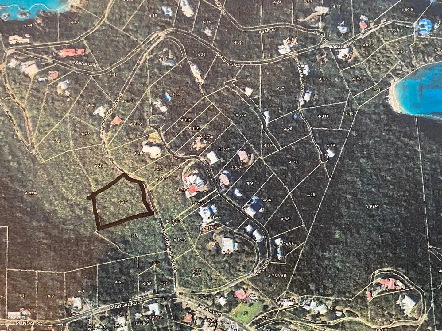 Paved Road frontage with sweeping views of Tutu Bay, Mandahl and Atlantic. Very good central location. Bound posts have been set.