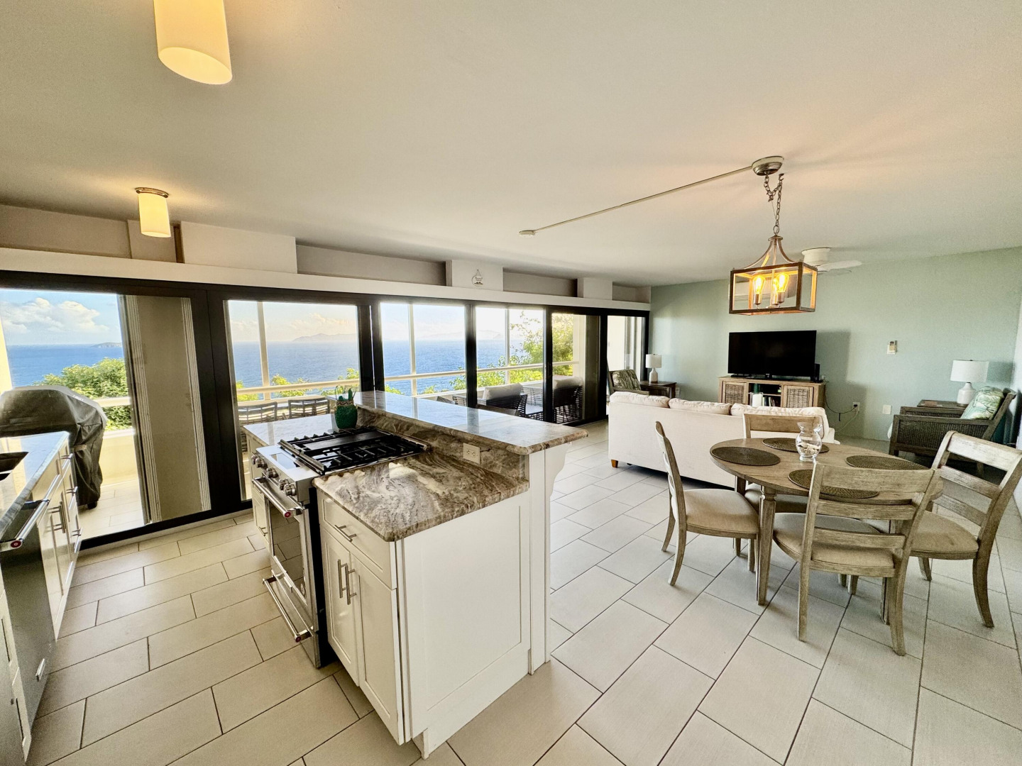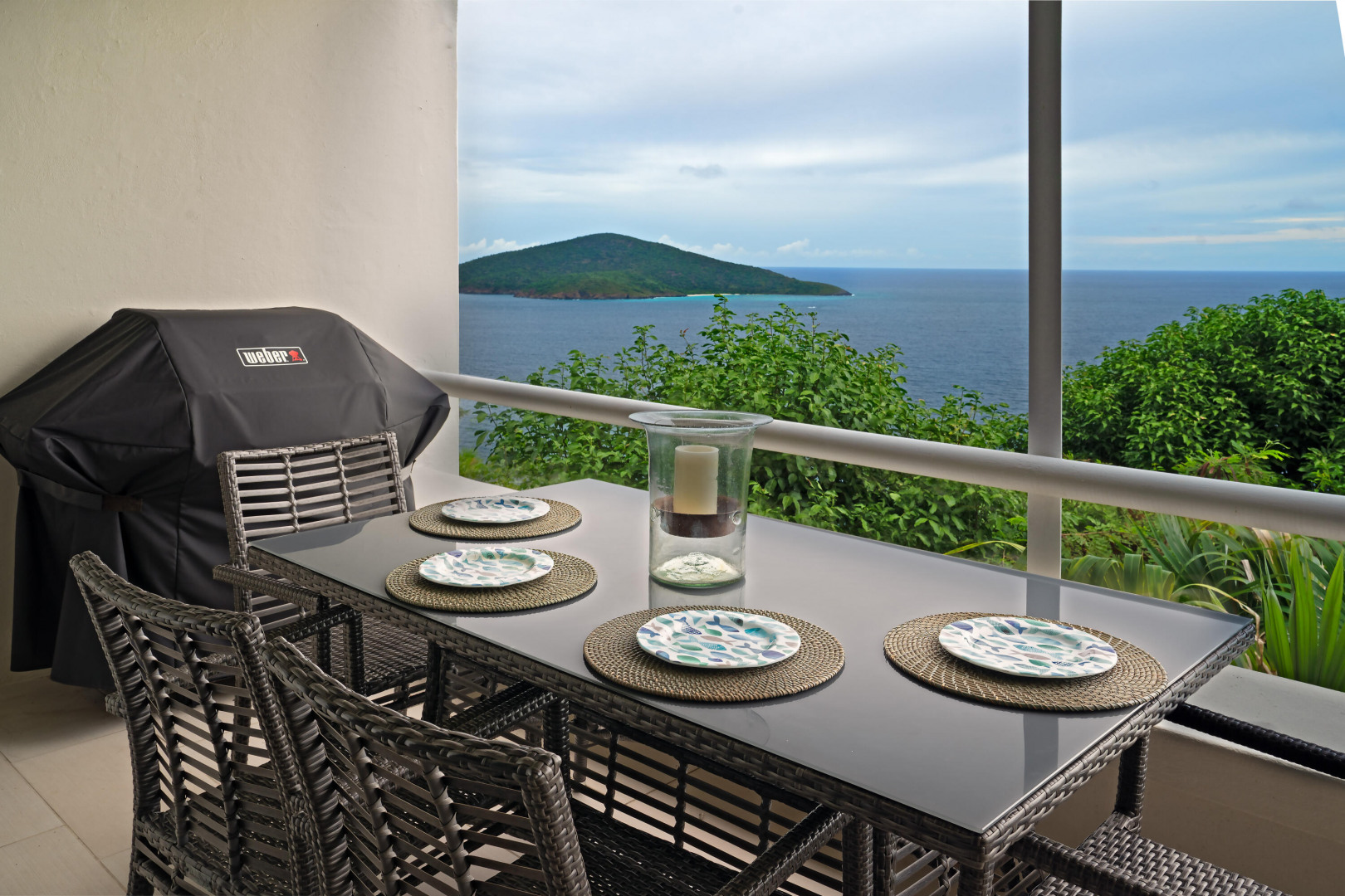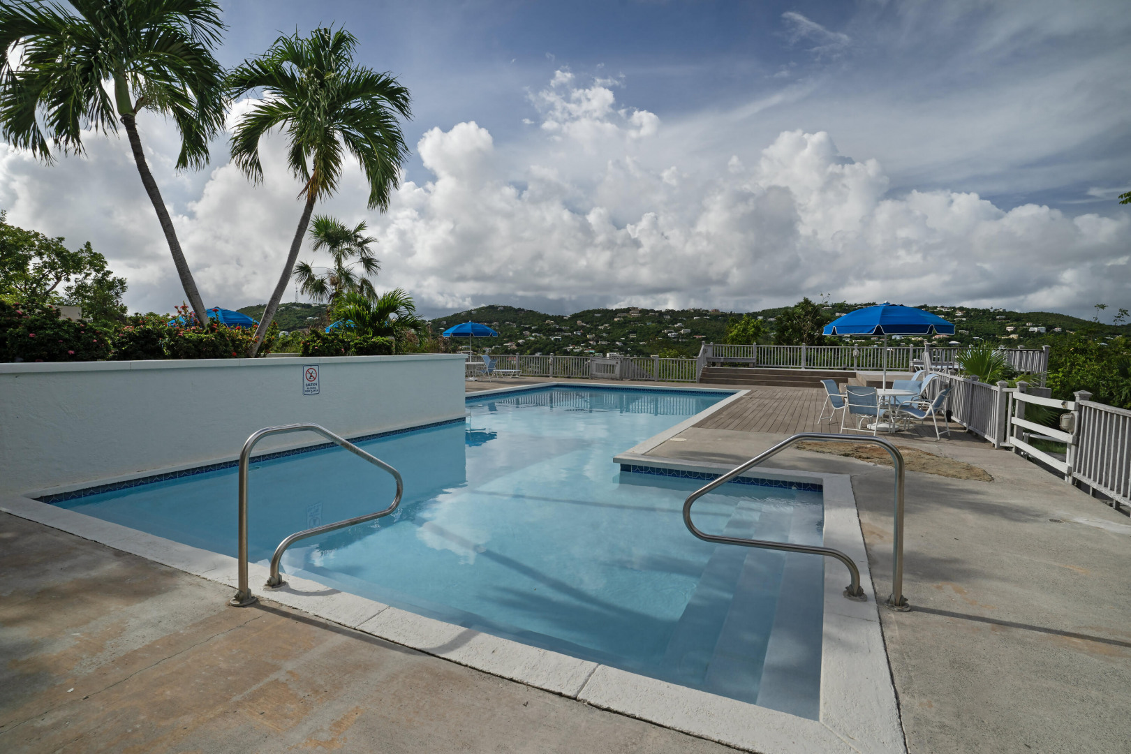 This one bedroom, dreamy island retreat is a must see. Remodeled in 2018, this condo is decorated in the colors of the sea, sky and sand with a decidedly coastal aesthetic. But its key feature is a captivating view like few others. On an island known for spectacular views this condo offers an unobstructed and much sought after down island view including all of the islands and cays dotting the ocean between St Thomas and the BVI to the north. The condo floor plan is incredibly livable, offering a private and spacious outdoor living area of just under 300 sq ft of deck, perfect for lounging and dining and generous closet space for extended stays or as a residence. With its end of street location, there is convenient parking at the top of the stairs. The community is gated and justa short 5 minute drive to the incomparable Magens Bay and a 15 minute drive to Charlotte Amalie.