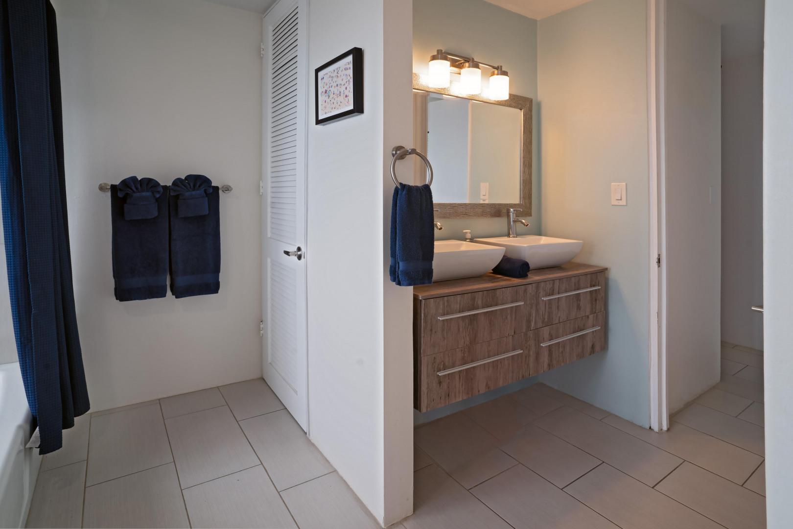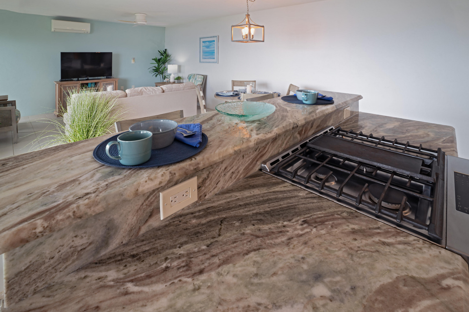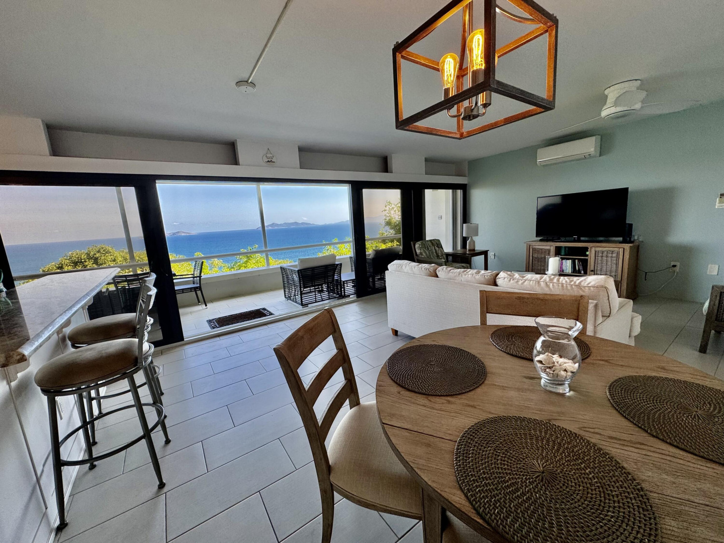This one bedroom, dreamy island retreat is a must see. Remodeled in 2018, this condo is decorated in the colors of the sea, sky and sand with a decidedly coastal aesthetic. But its key feature is a captivating view like few others. On an island known for spectacular views this condo offers an unobstructed and much sought after down island view including all of the islands and cays dotting the ocean between St Thomas and the BVI to the north. The condo floor plan is incredibly livable, offering a private and spacious outdoor living area of just under 300 sq ft of deck, perfect for lounging and dining and generous closet space for extended stays or as a residence. With its end of street location, there is convenient parking at the top of the stairs. The community is gated and justa short 5 minute drive to the incomparable Magens Bay and a 15 minute drive to Charlotte Amalie.