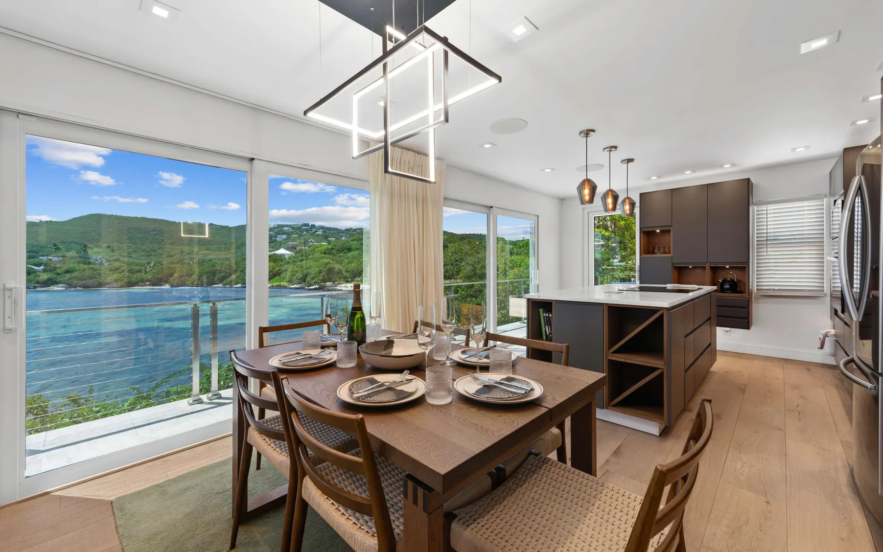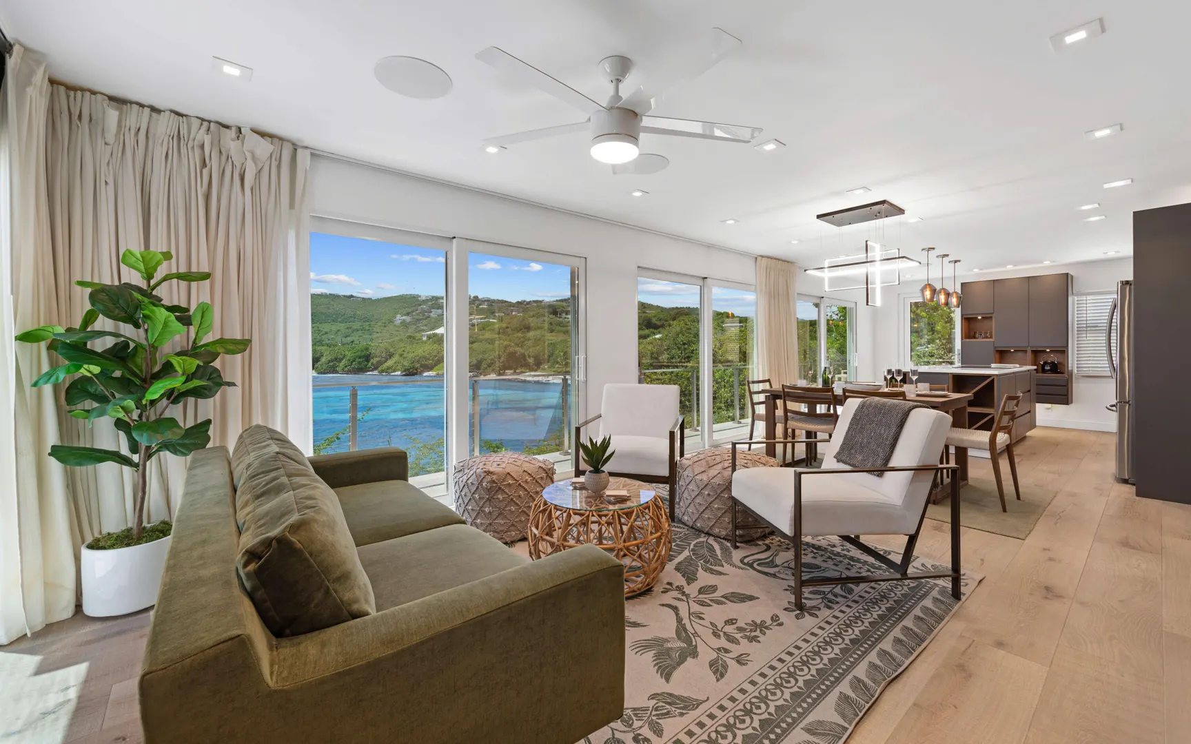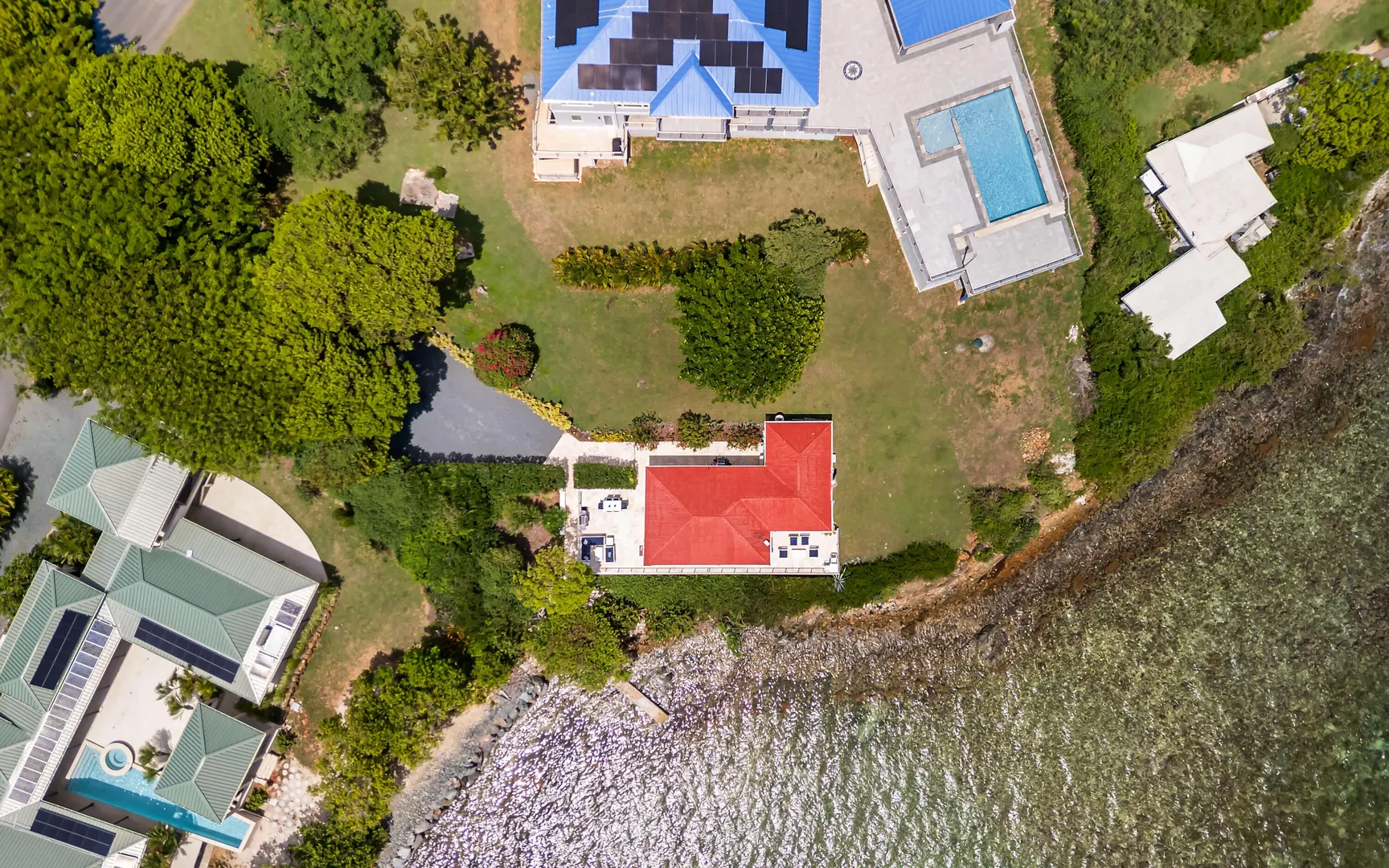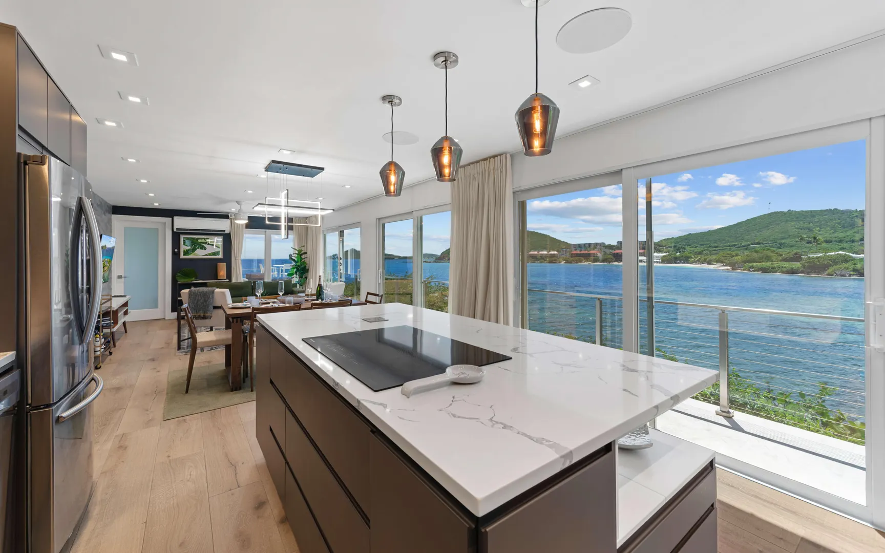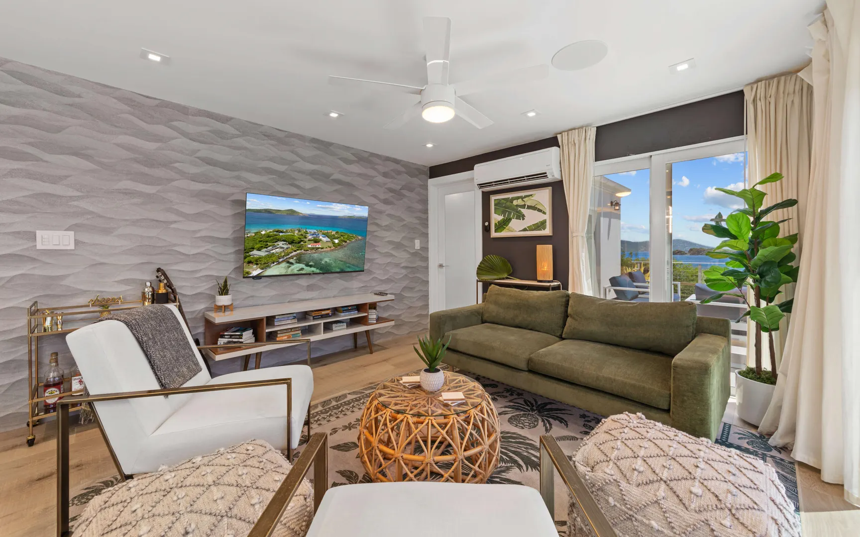 Welcome to Sunswept Cove, an iconic Caribbean retreat where luxury, history, and waterfront living converge. Once part of Fleetwood Mac's St. Thomas estate, this iconic three-bedroom sanctuary, known as the Fleetwood Mac Cottage, has been meticulously transformed into a sophisticated waterfront escape of timeless luxury and contemporary design.Located on a private 0.51-acre lot at prestigious Pelican Point, the property boasts 140 feet of direct water frontage with panoramic views spanning Pelican Beach, Sapphire Beach, St. John, and the surrounding Cays. Just steps from Pelican Beach and minutes to Sapphire Beach, this gated property offers seclusion while being moments from Red Hook's dining, shopping, and ferry to St. John and the BVI.Completely renovated from top to bottom, the interior features floor-to-ceiling glass doors that open wide to the sea, filling the home with light and coastal breezes. Each of the three bedrooms offers a king bed, modern finishes, and access to a terrace. The primary suite includes a spa-inspired bath with dual vanities, rainfall shower, and private laundry. The sleek gourmet kitchen is fitted with top-tier appliances including induction cooktop, oven, microwave, air fryer, dishwasher, and multiple coffee systems, perfect for easy entertaining.