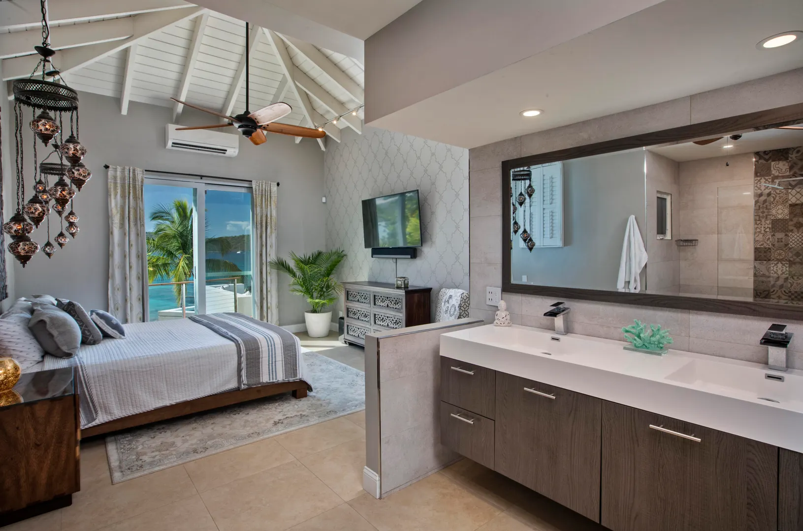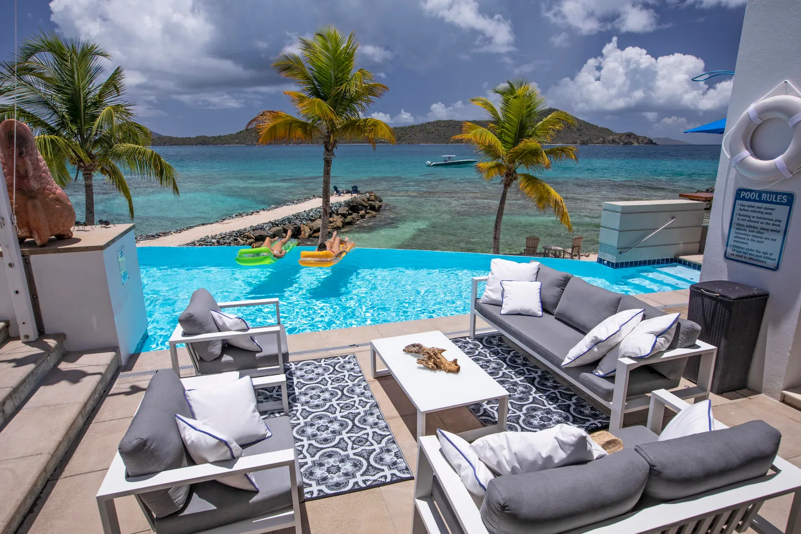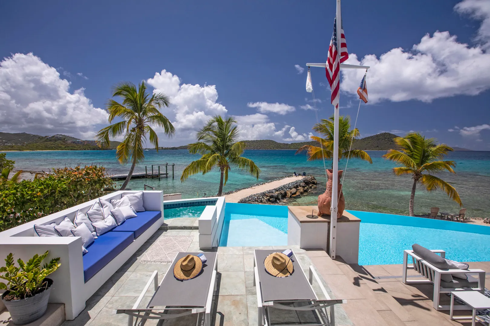 One Beach Road. Let your worries drift away in this modern beachfront paradise. Launch your kayaks or go for a snorkel from the beach, then watch the boats go by from your infinity-edge pool. This luxurious four-bedroom 4 1/2 bath Villa with a separate studio apartment has been recently remodeled. This Villa checks every box; beach with a jetty, pool, hot tub, meditation room, observation deck, propane firebox, garage, workshop, two laundry rooms, a generator, shutters, alarm system with cameras. This turn-key beachfront retreat is currently being used as a vacation rental and is perfect for entertaining or weddings. Be sure to check out the additional .78 acre flat lot across the street that's for sale as a separate purchase MLS#20-1323