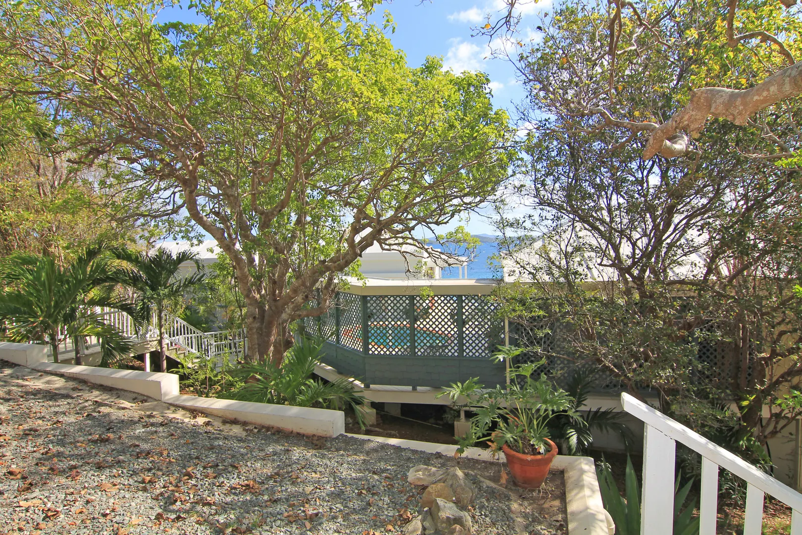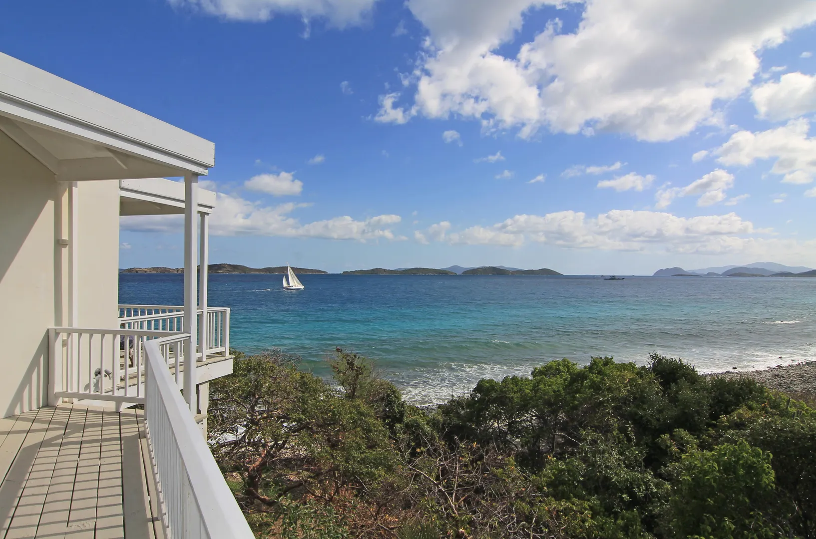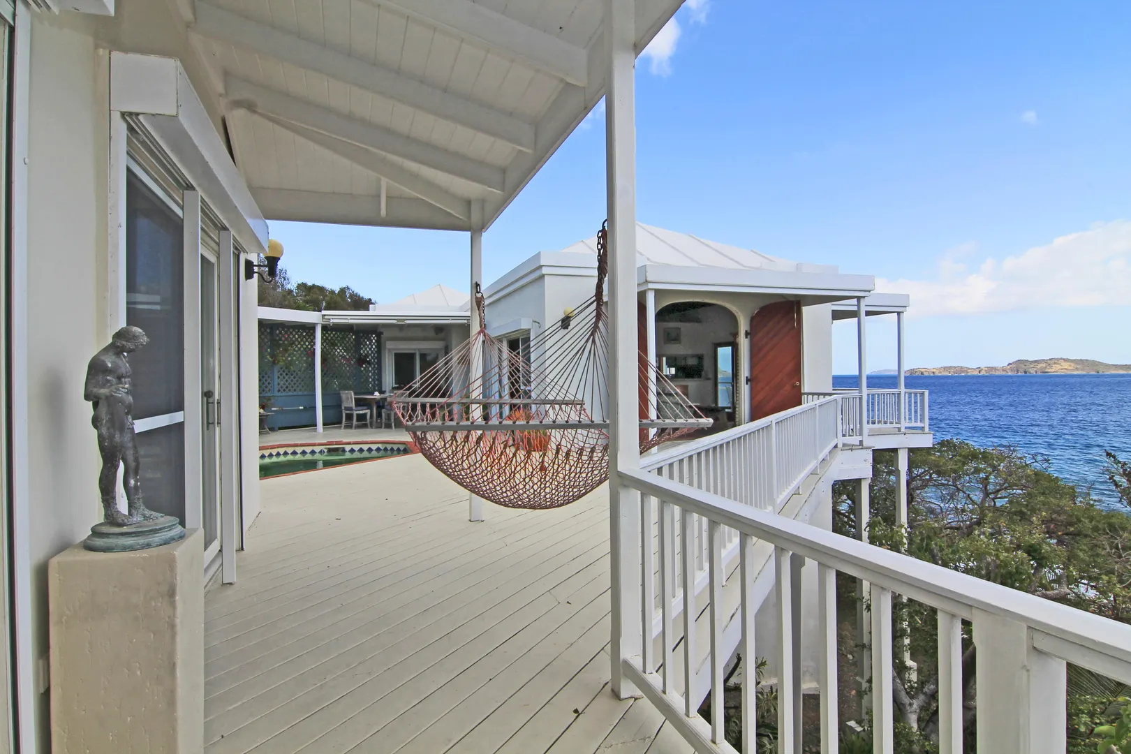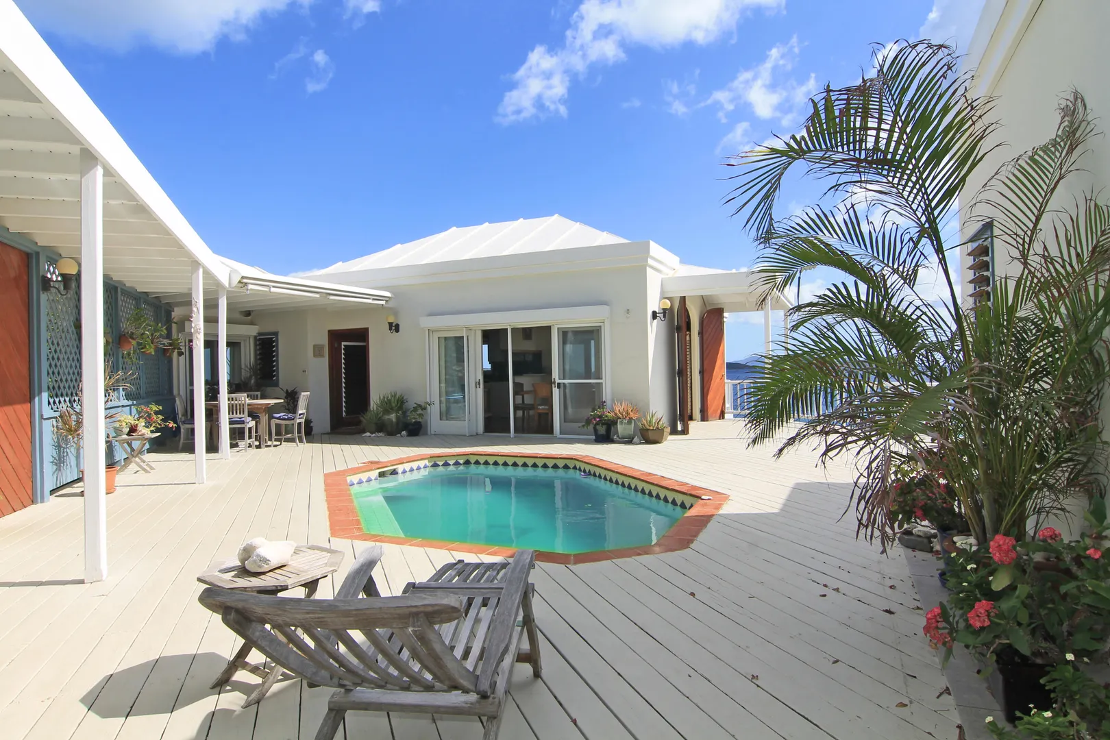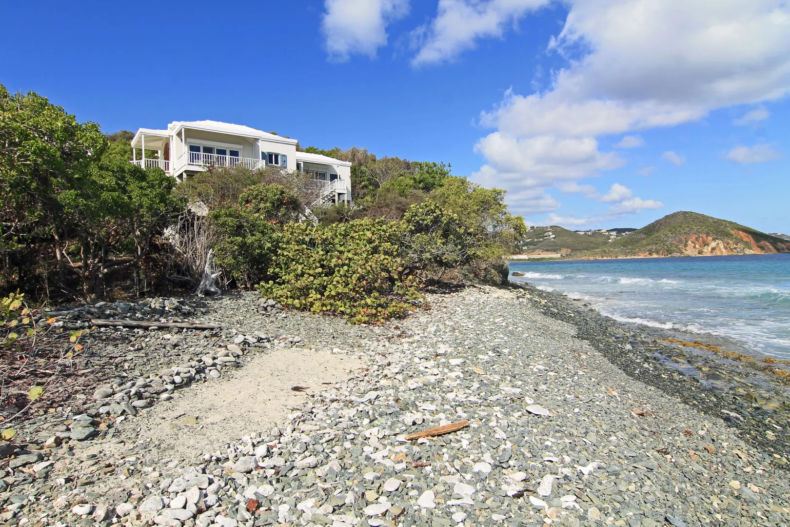 Camelot Villa-Private waterfront (beachcombers) lot with coral beach.Doug White designed home. Camelot has a fabulous gated entry onto a large deck (and pool), which separates the 2 bdrm (guest) pavilion from main house and master suite.Views of the nearby small Cays, British Virgins, St John, and boats that ply the waters of Pillsbury Sound.Large deck to enjoy sun,shade & breeze+ 1 bdrm apt down
