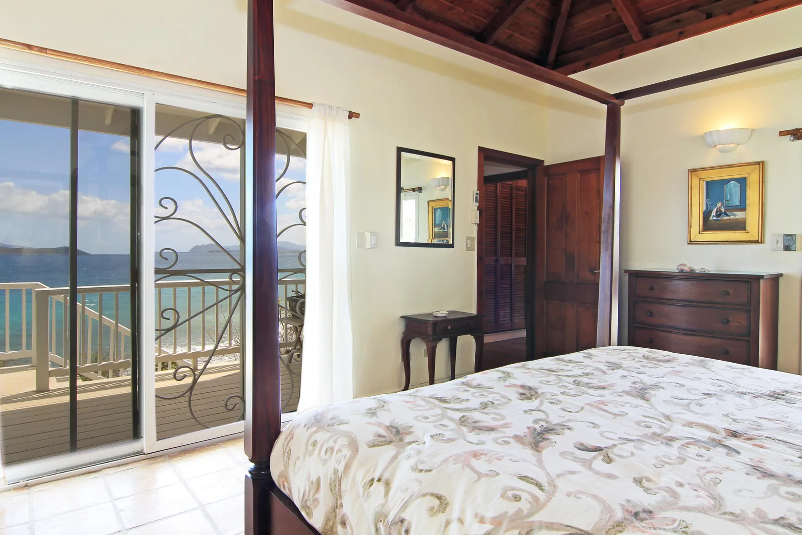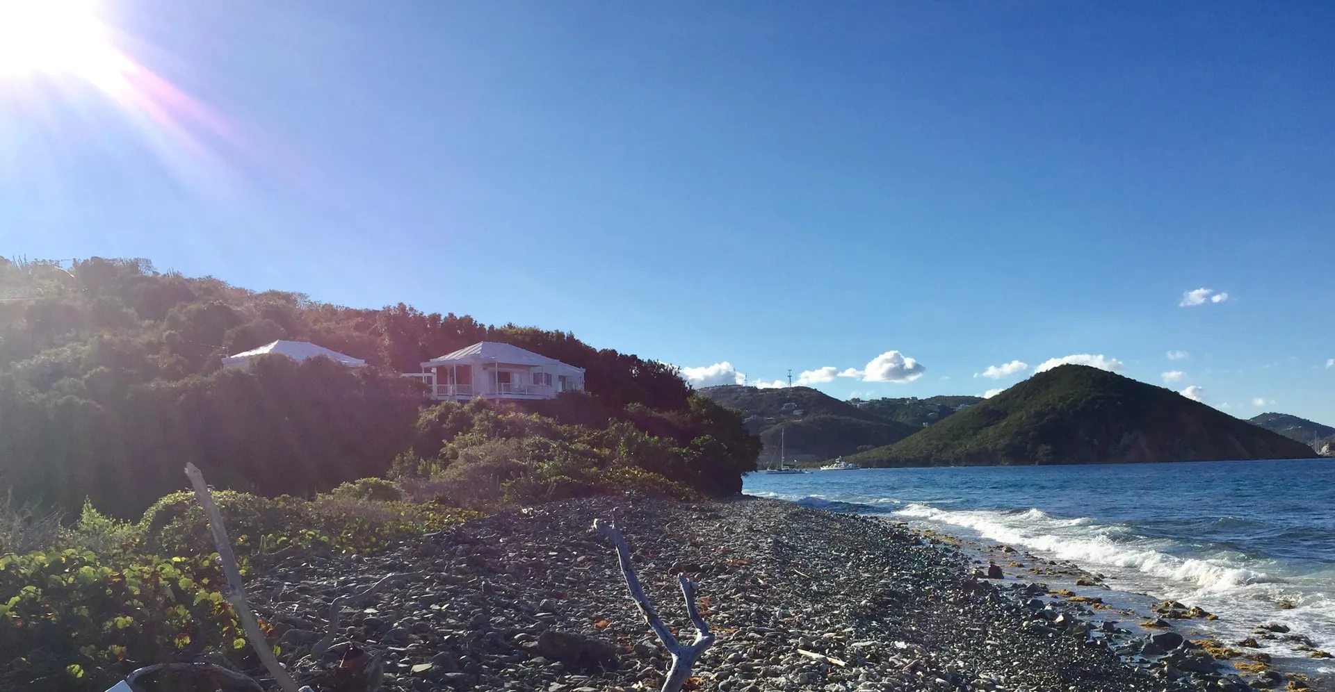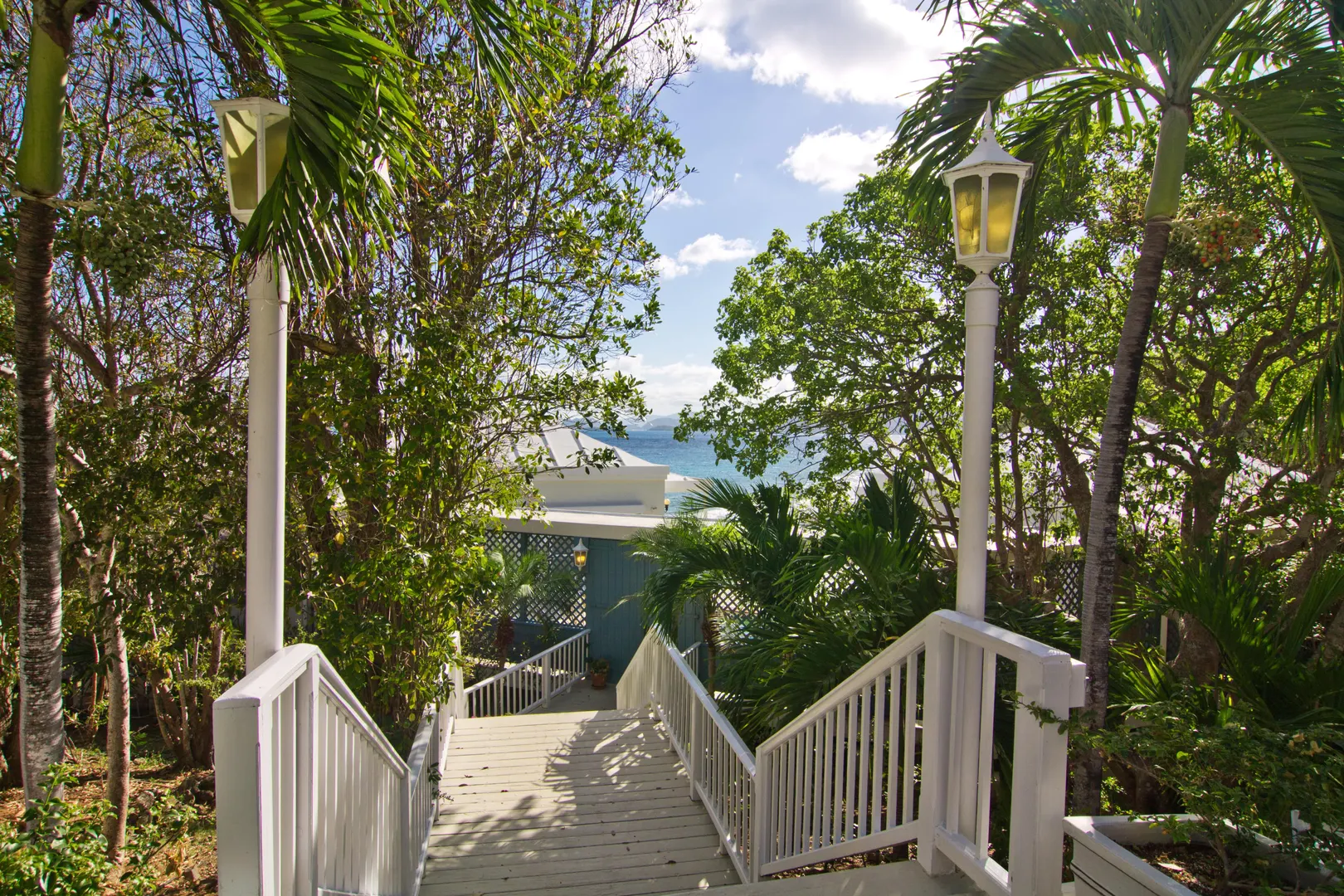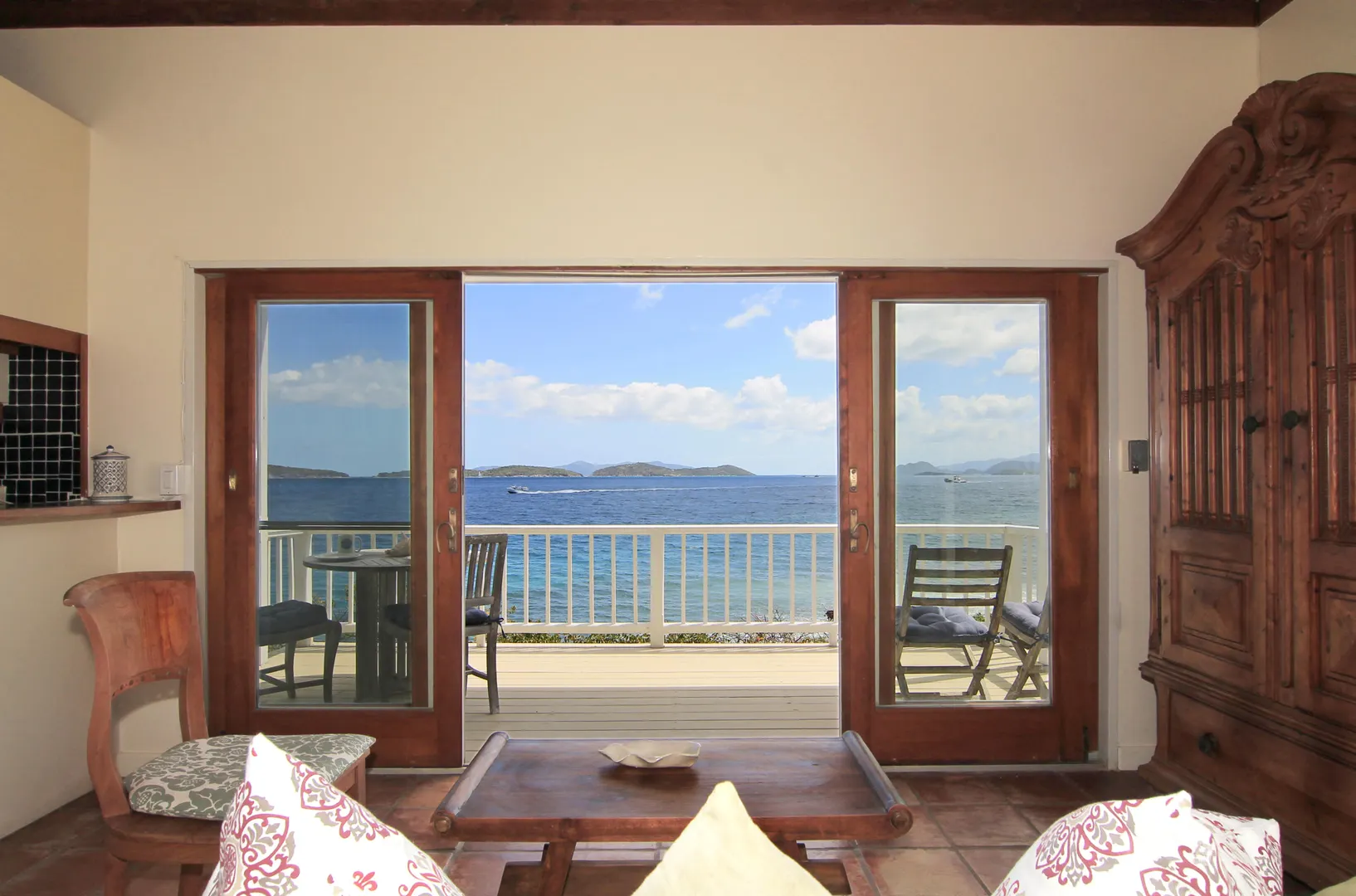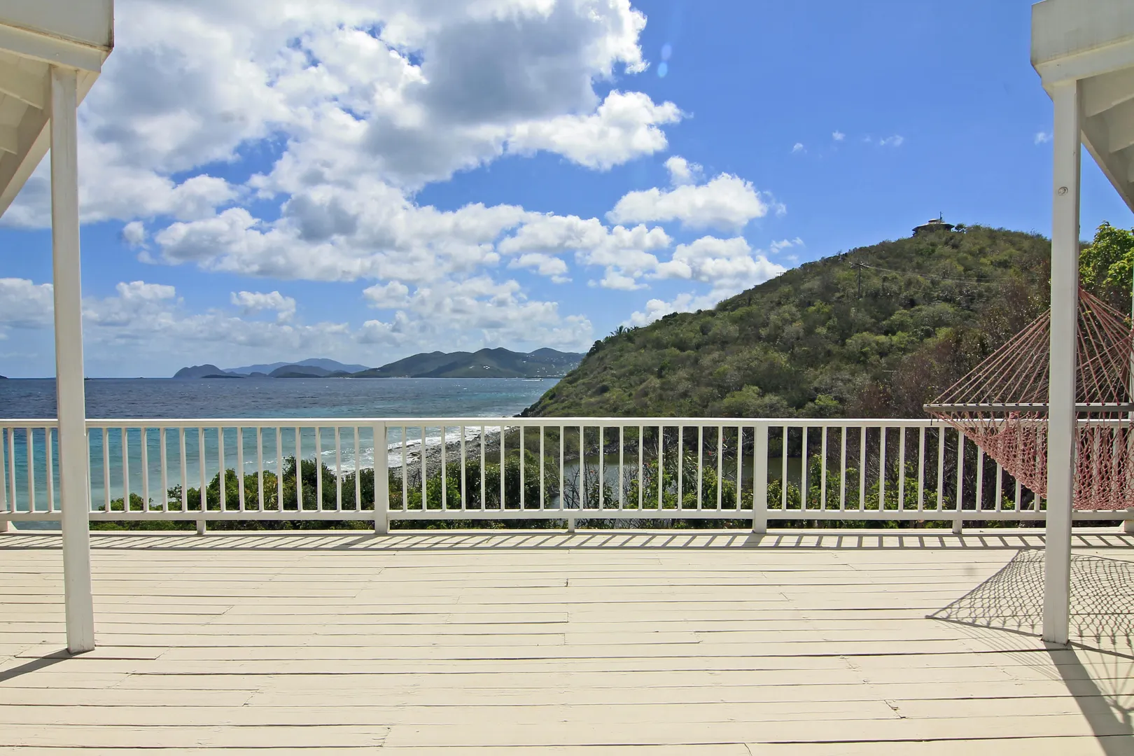 Camelot Villa-Private waterfront (beachcombers) lot with coral beach.Doug White designed home. Camelot has a fabulous gated entry onto a large deck (and pool), which separates the 2 bdrm (guest) pavilion from main house and master suite.Views of the nearby small Cays, British Virgins, St John, and boats that ply the waters of Pillsbury Sound.Large deck to enjoy sun,shade & breeze+ 1 bdrm apt down