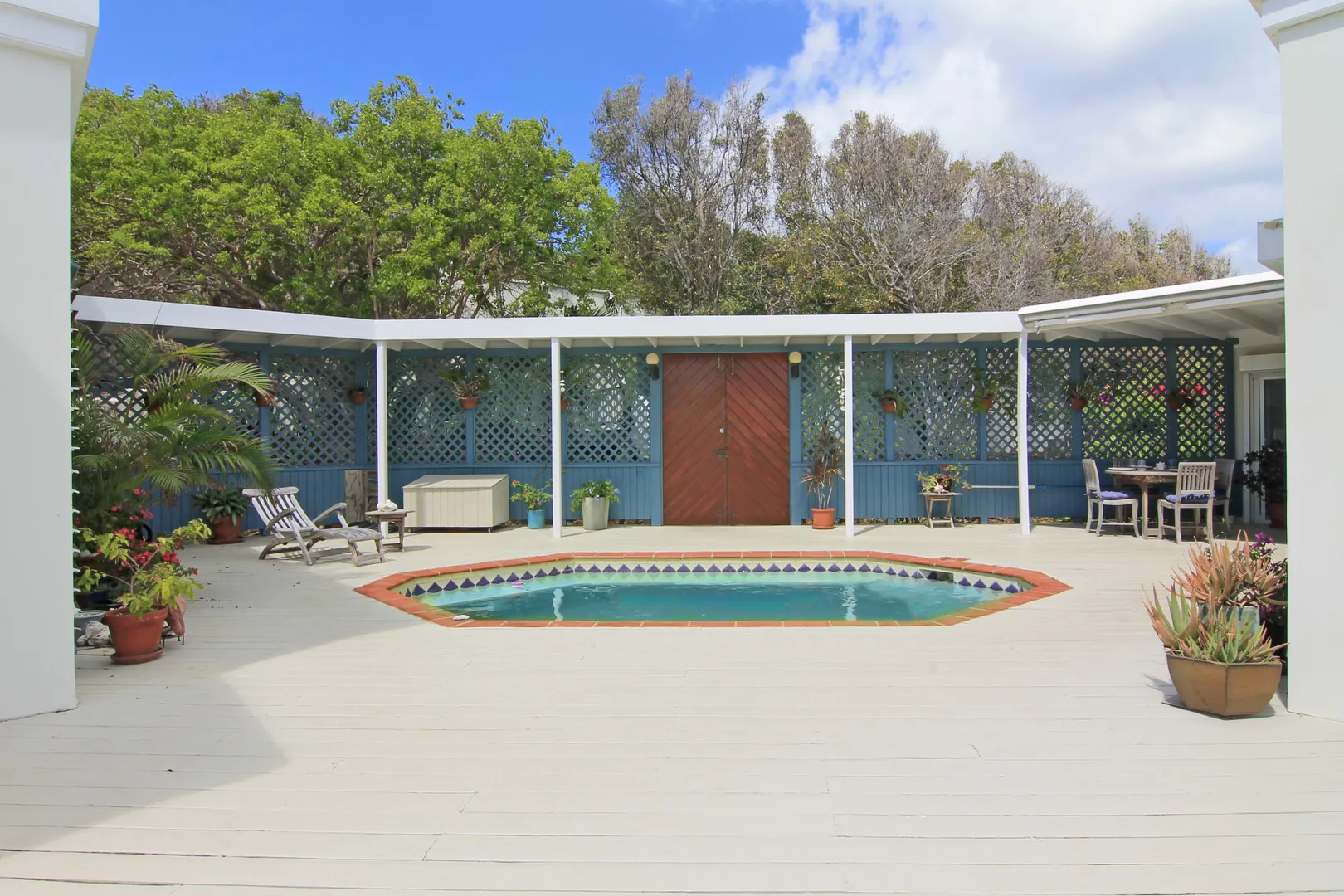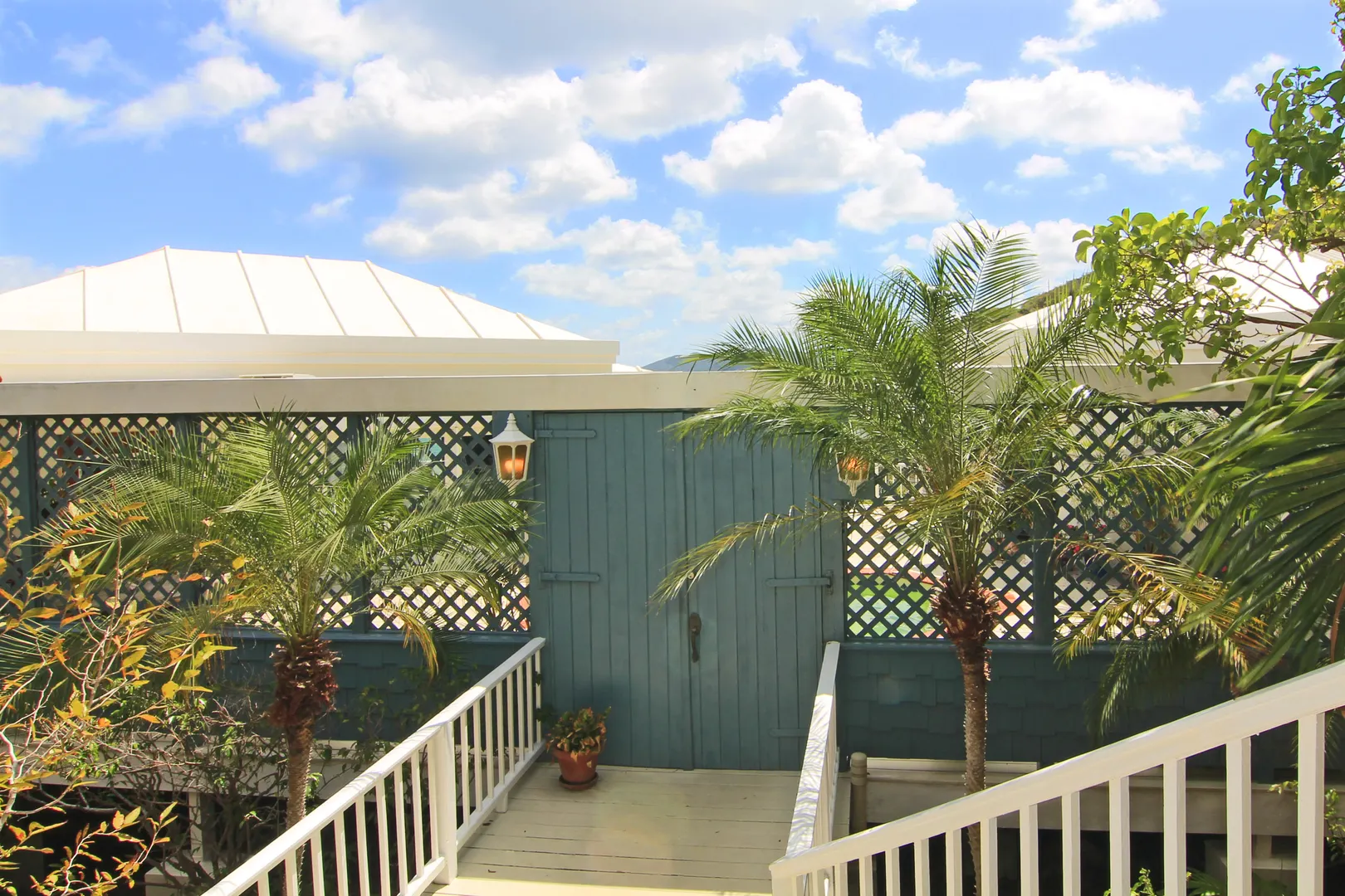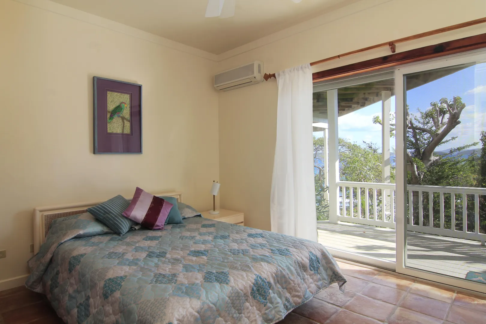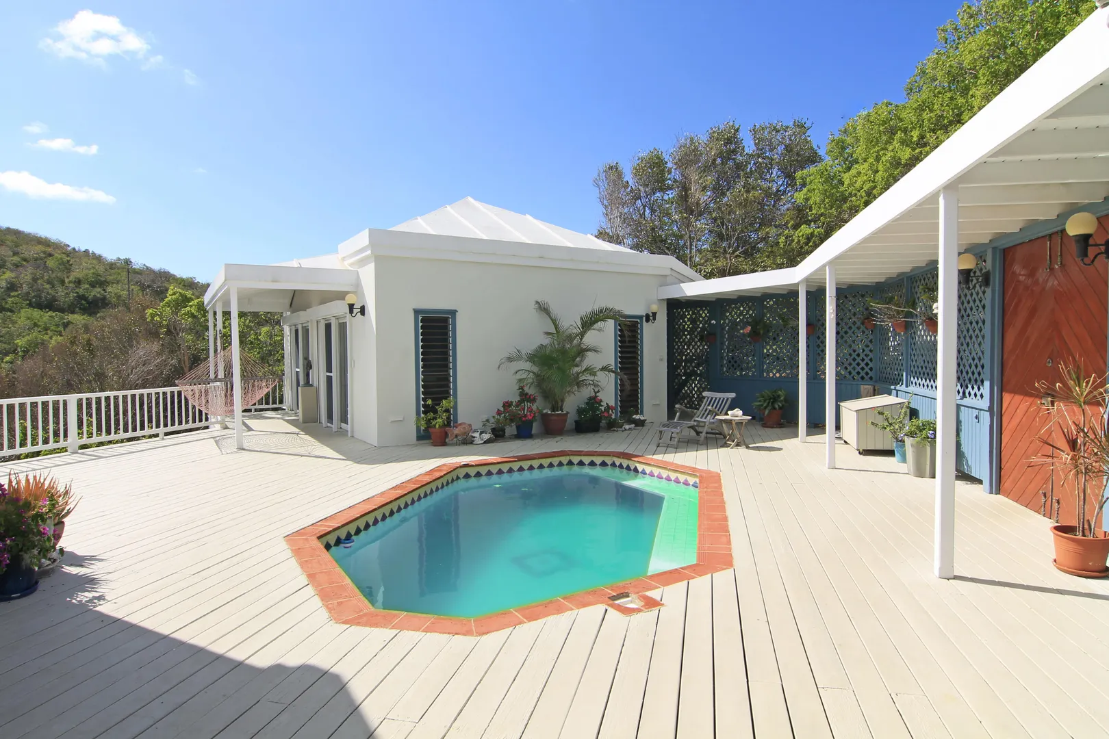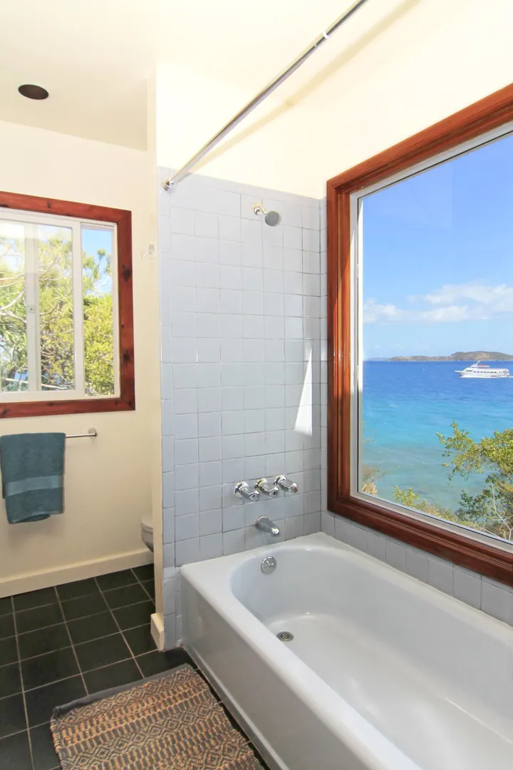 Camelot Villa-Private waterfront (beachcombers) lot with coral beach.Doug White designed home. Camelot has a fabulous gated entry onto a large deck (and pool), which separates the 2 bdrm (guest) pavilion from main house and master suite.Views of the nearby small Cays, British Virgins, St John, and boats that ply the waters of Pillsbury Sound.Large deck to enjoy sun,shade & breeze+ 1 bdrm apt down