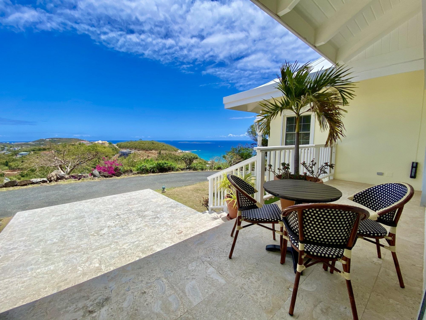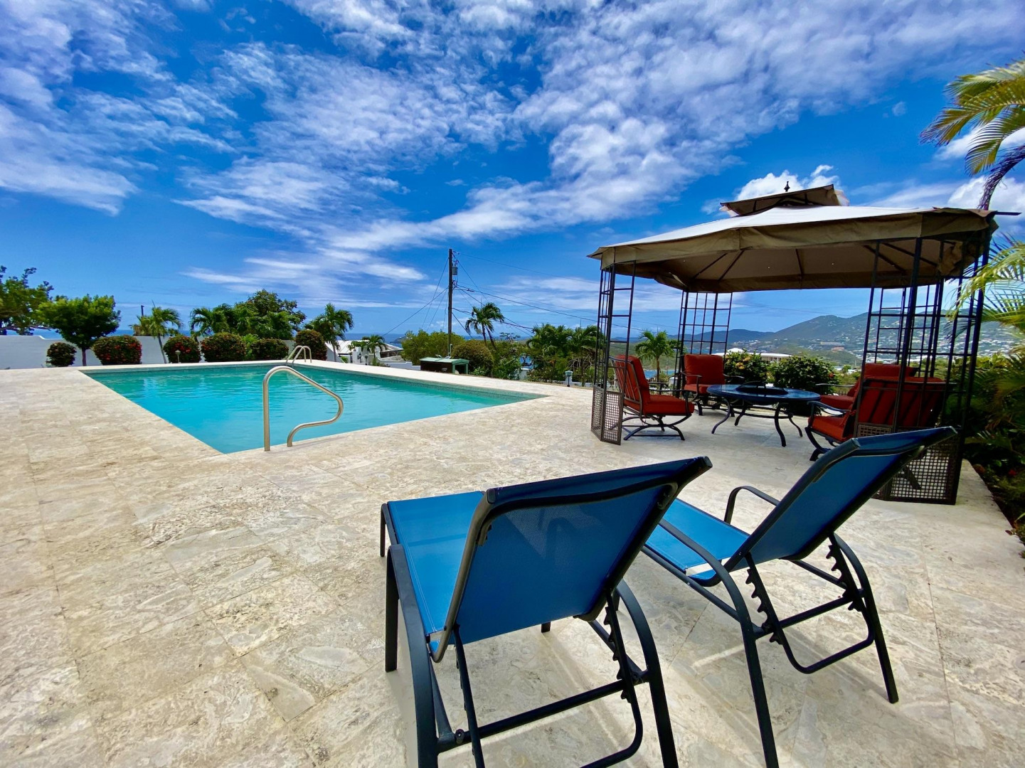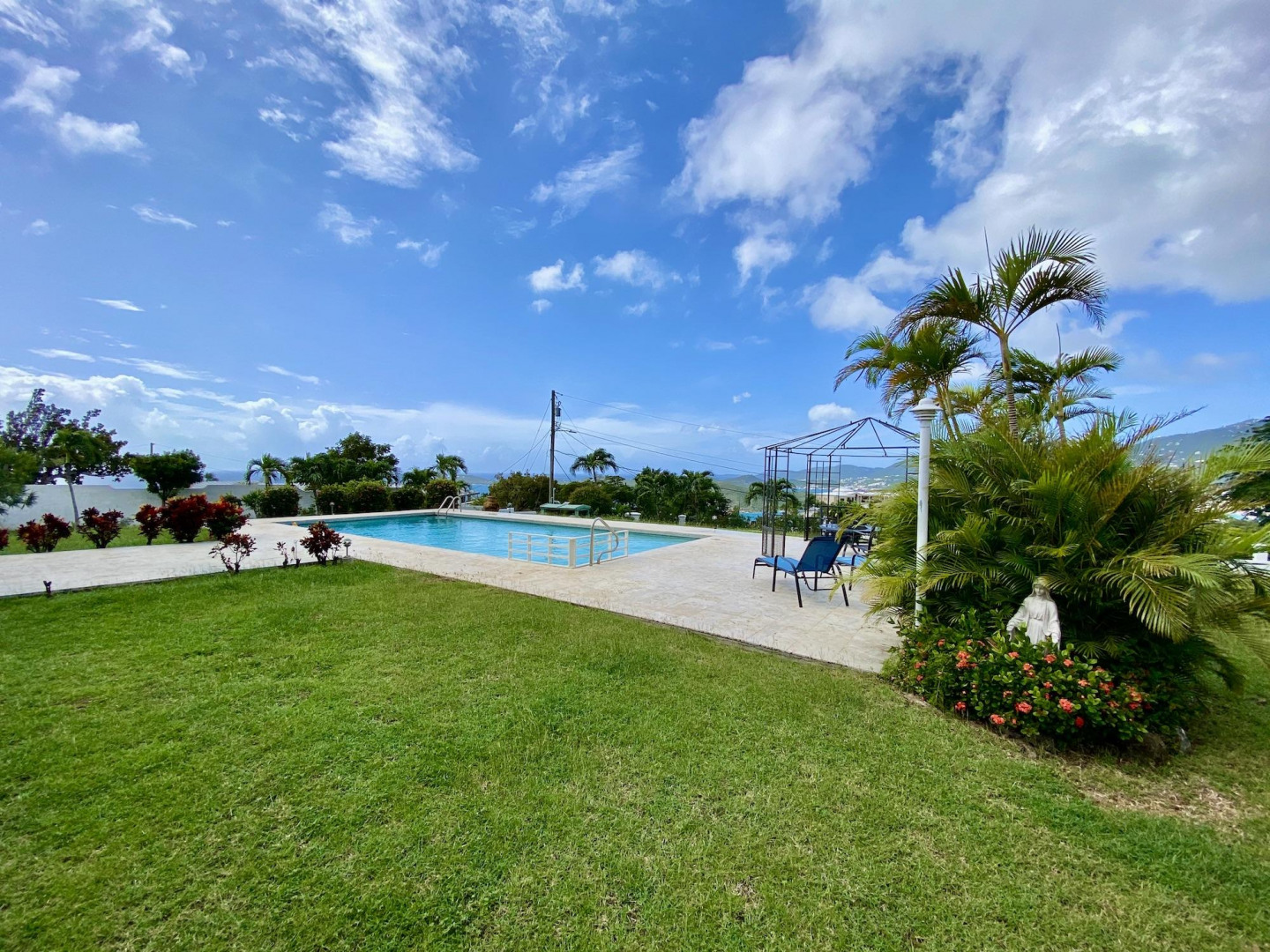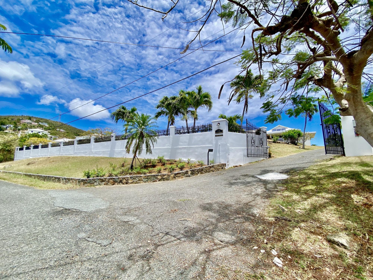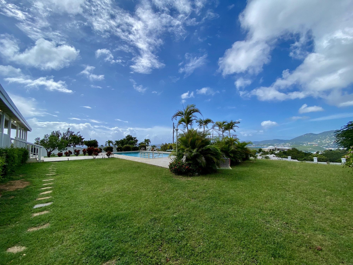 This home in prestigious Bakkero offers sophistication, charm and spectacular ocean views reaching across Charlotte Amalie to St. Croix, Culebra and Vieques. A poured concrete structure - fully shuttered - NO damage occurred during Irmaria or Dorian. Enjoy life without WAPA bills courtesy of solar, TESLA and a huge auto generator. Gated, fenced and situated on more than one acre of flat land, this home is ideal home for indoor/outdoor entertainment, with onsite parking for up to 15 vehicles. The elegant great room flows seamlessly onto an expansive, coral-tiled porch, down to a large pool - perfect for laps. There are 3 spacious en-suite bedrooms in the main residence; and a separate building features a renovated studio and a 2/1.5 apartment whose combined monthly income is $3,300.