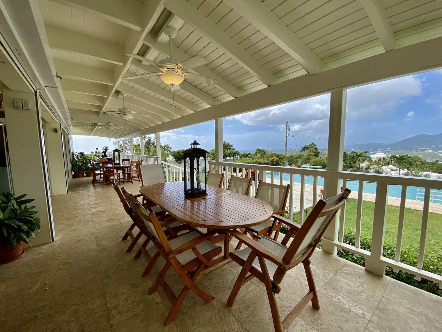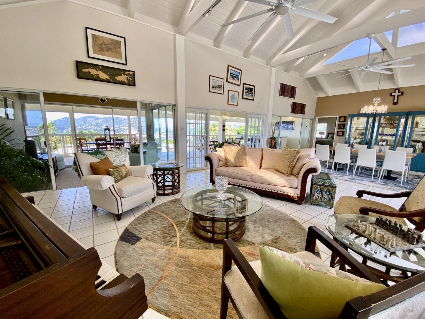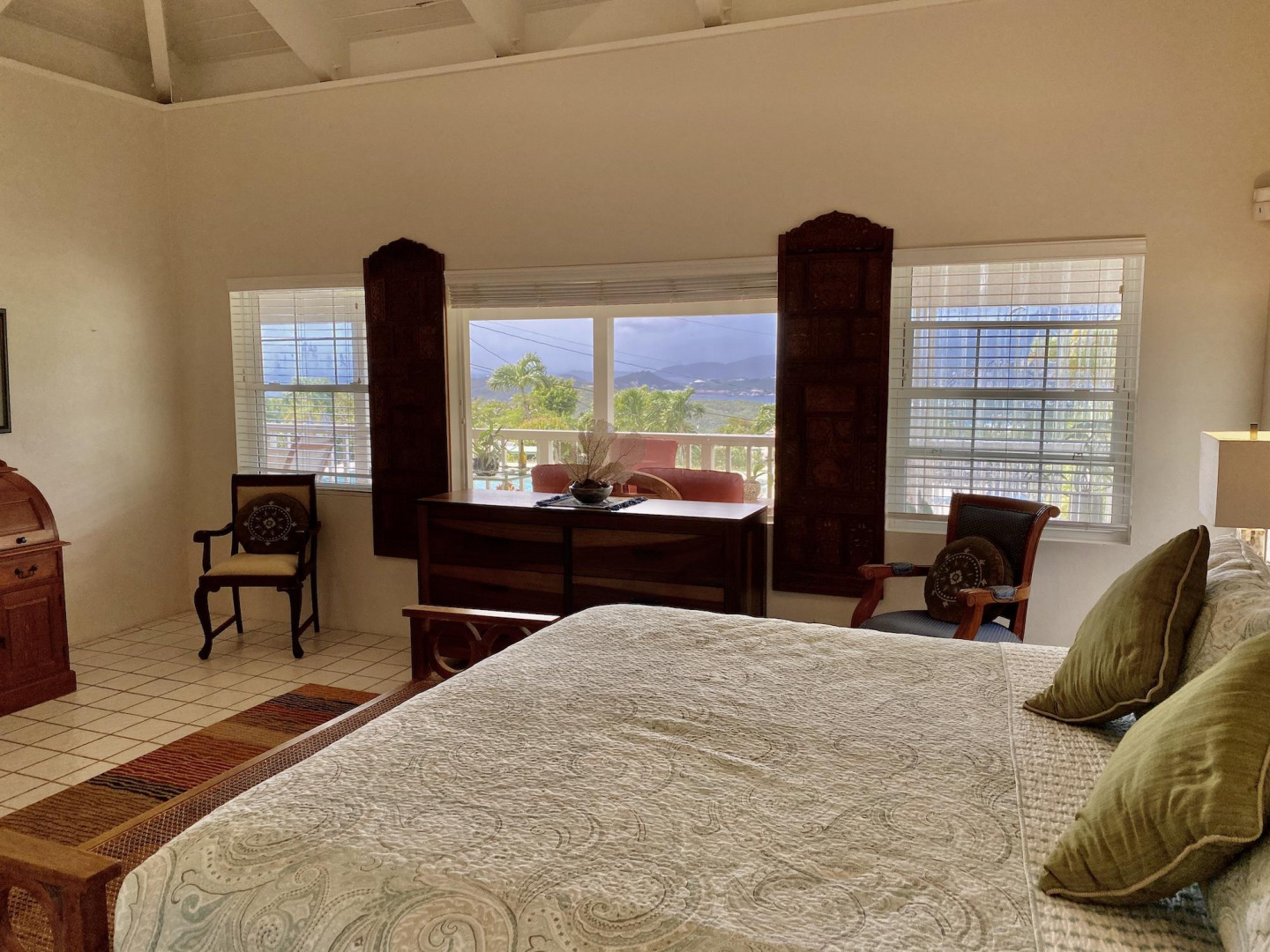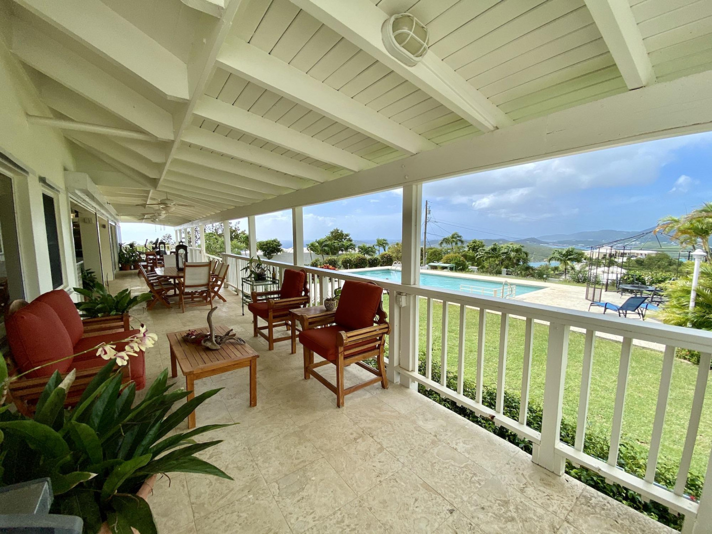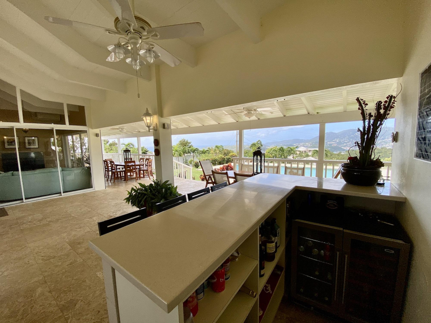 This home in prestigious Bakkero offers sophistication, charm and spectacular ocean views reaching across Charlotte Amalie to St. Croix, Culebra and Vieques. A poured concrete structure - fully shuttered - NO damage occurred during Irmaria or Dorian. Enjoy life without WAPA bills courtesy of solar, TESLA and a huge auto generator. Gated, fenced and situated on more than one acre of flat land, this home is ideal home for indoor/outdoor entertainment, with onsite parking for up to 15 vehicles. The elegant great room flows seamlessly onto an expansive, coral-tiled porch, down to a large pool - perfect for laps. There are 3 spacious en-suite bedrooms in the main residence; and a separate building features a renovated studio and a 2/1.5 apartment whose combined monthly income is $3,300.